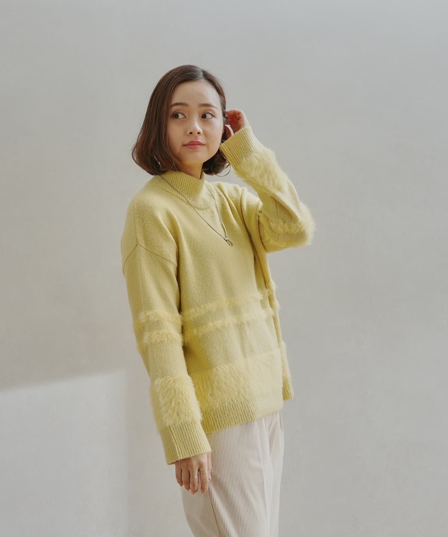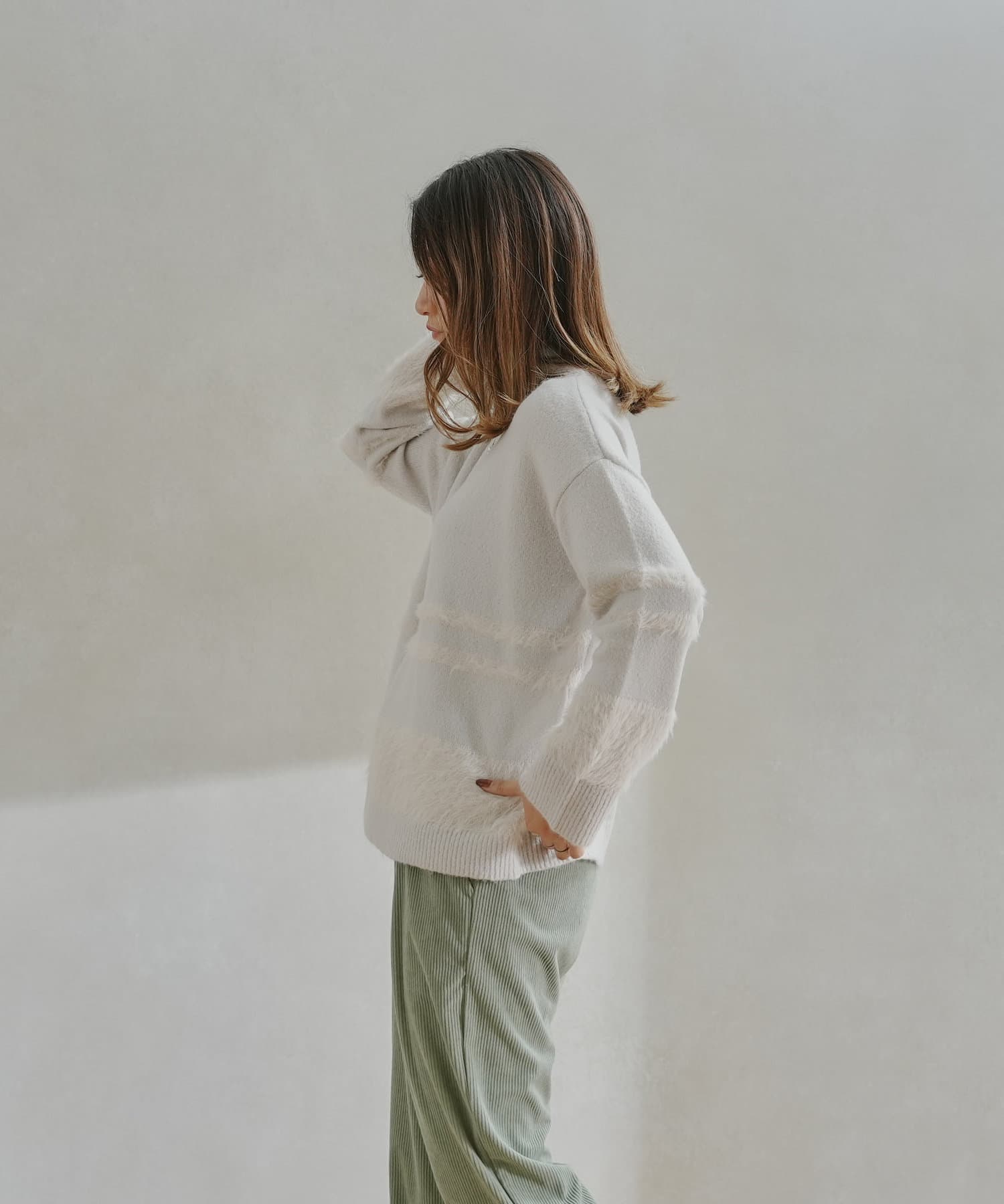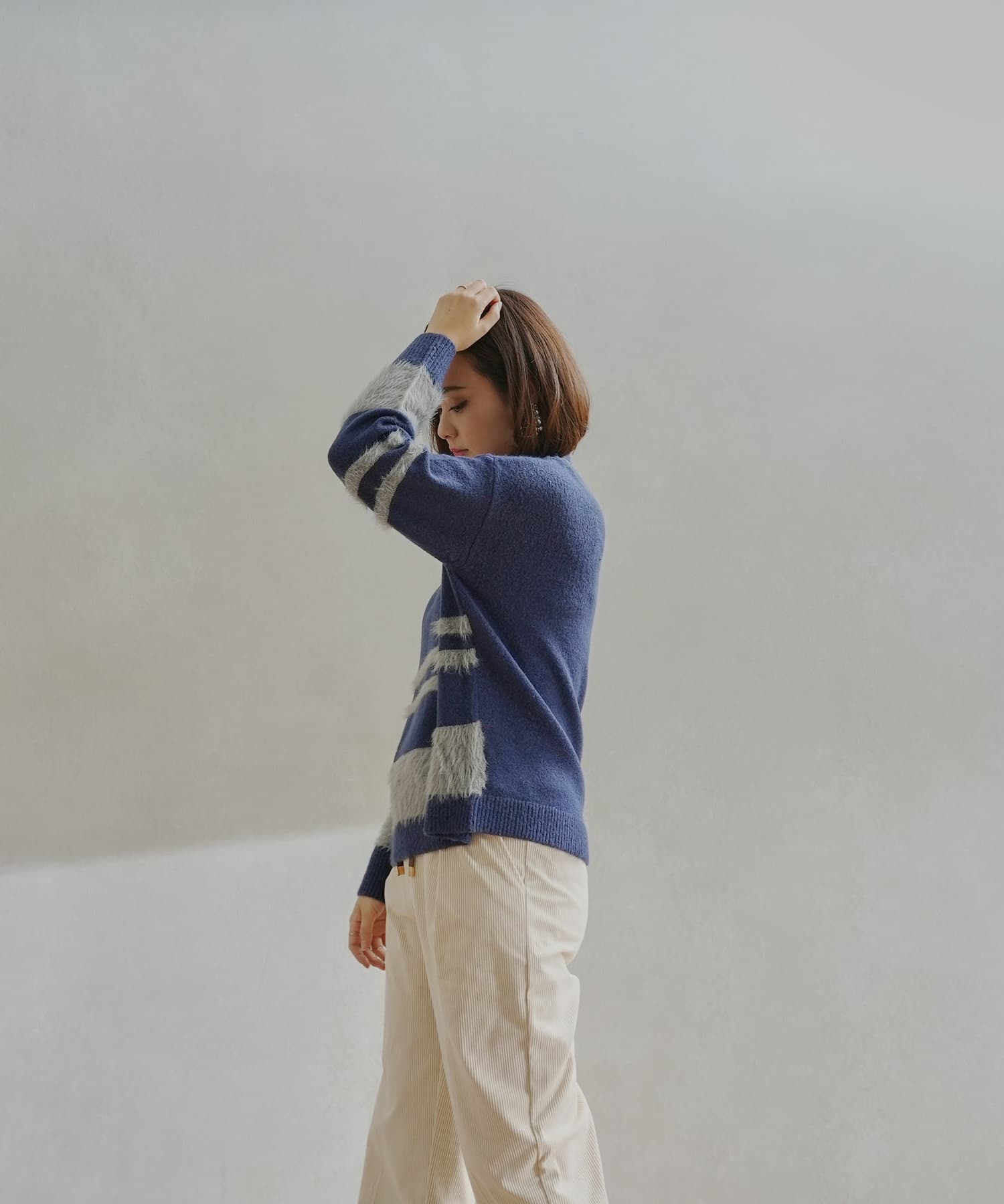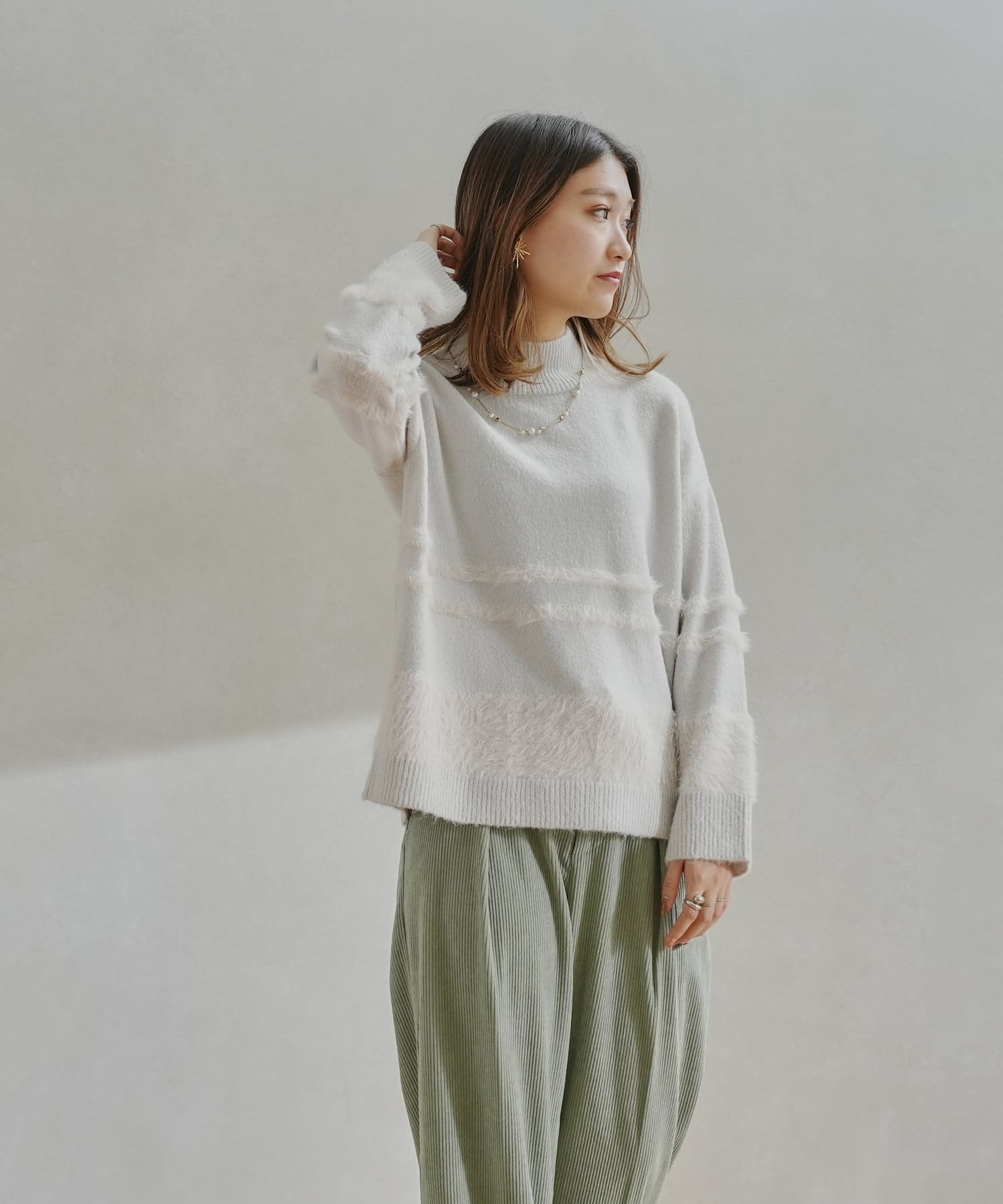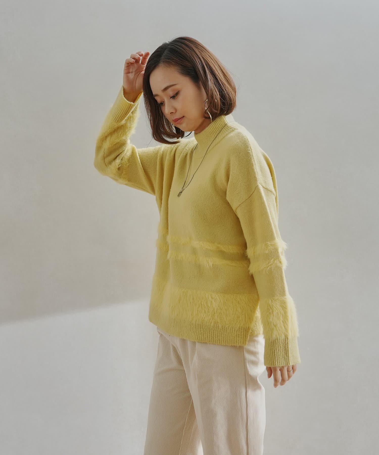 ・部分使いのラインのシャギーニットがボーダー見えしてコーディネートのアクセントを