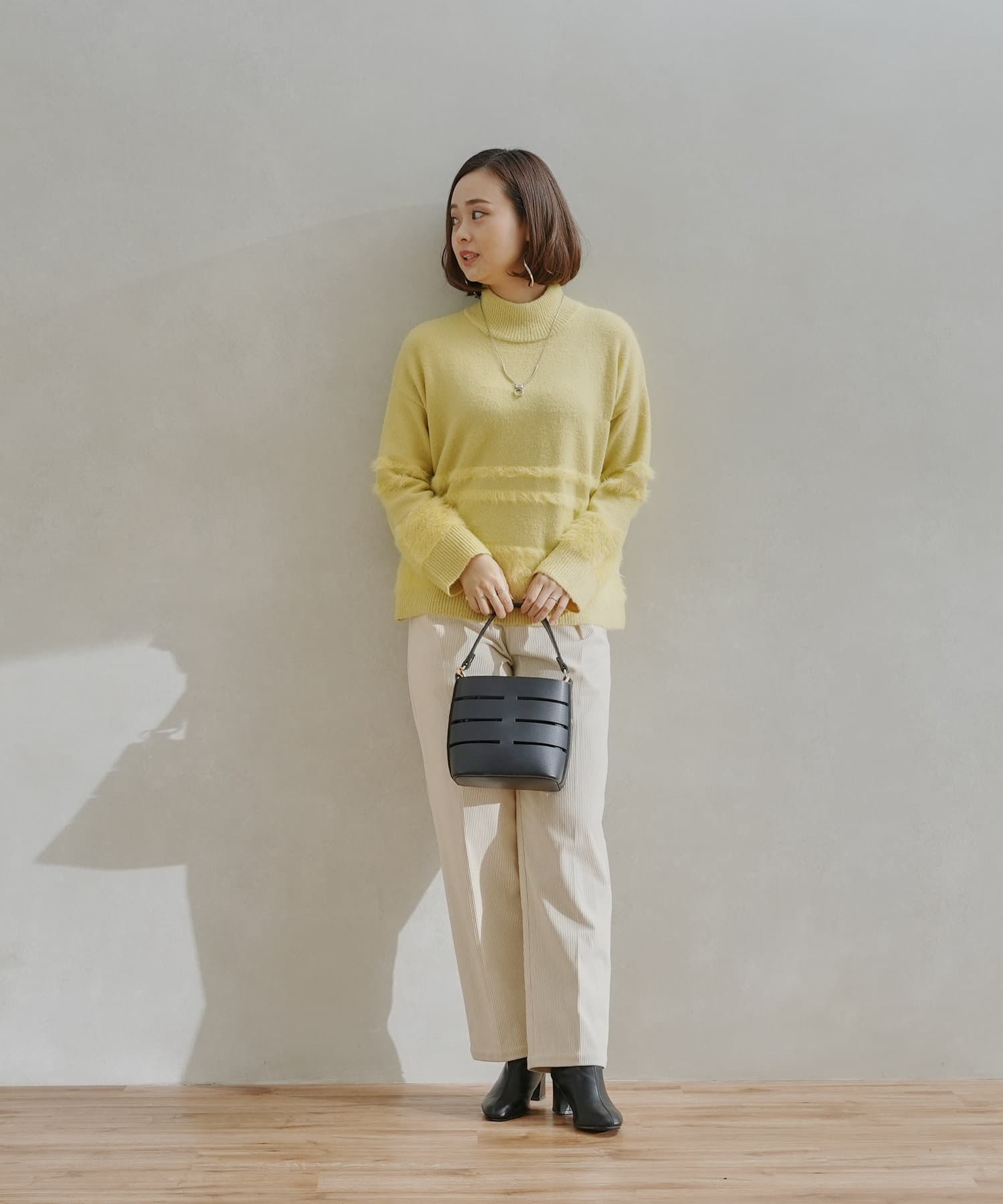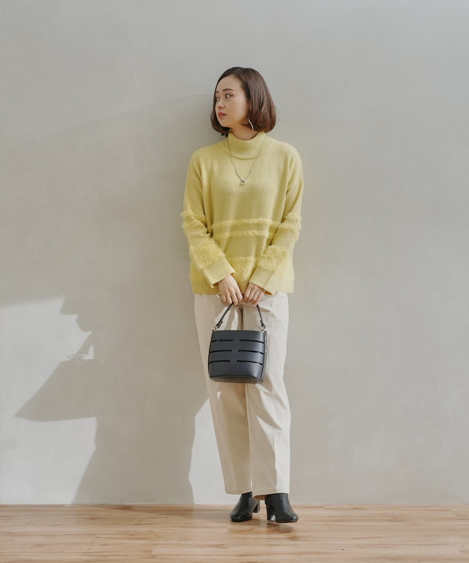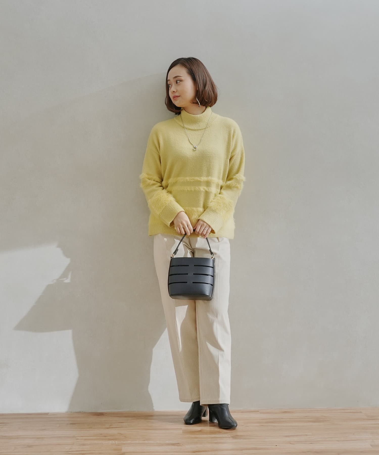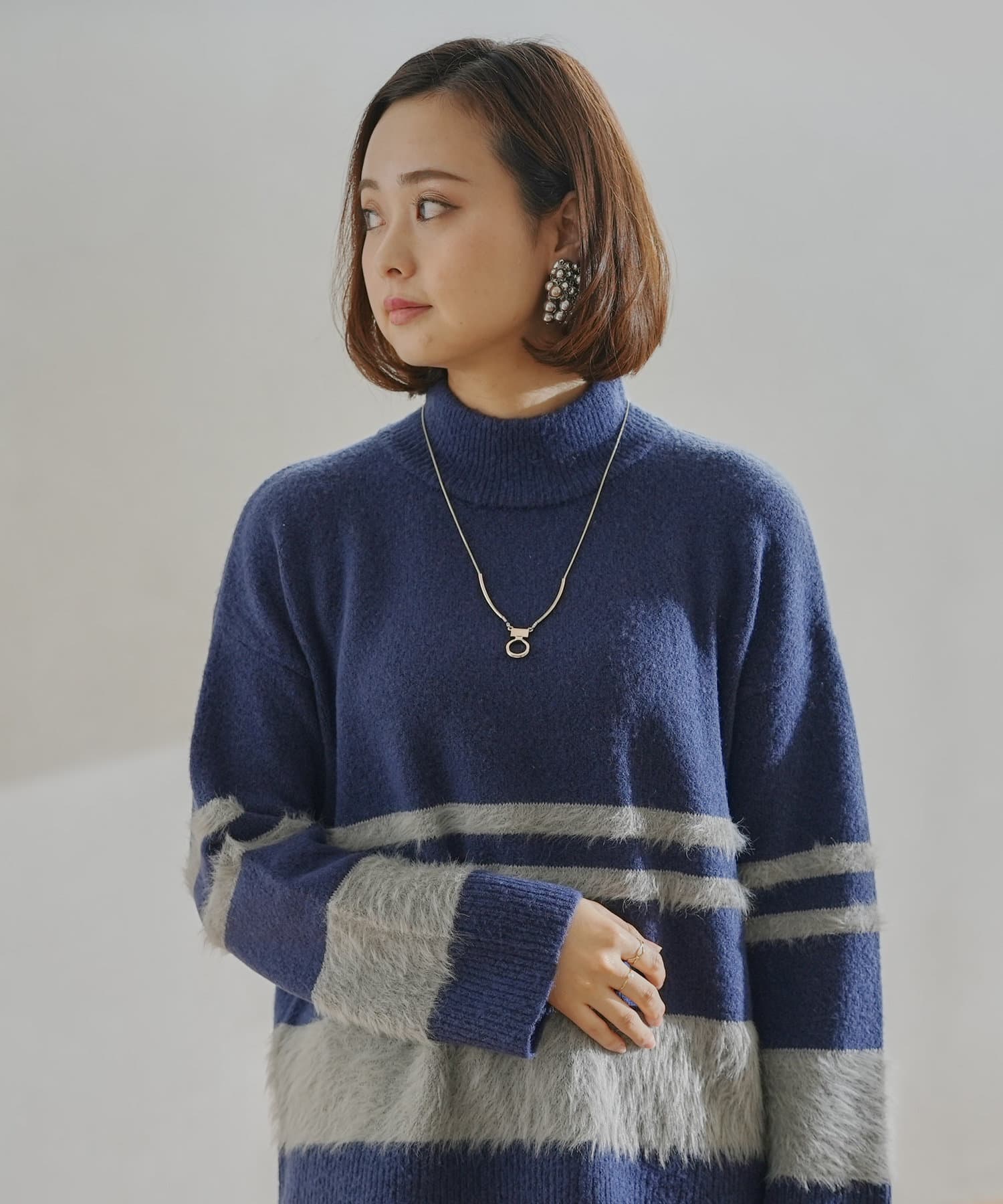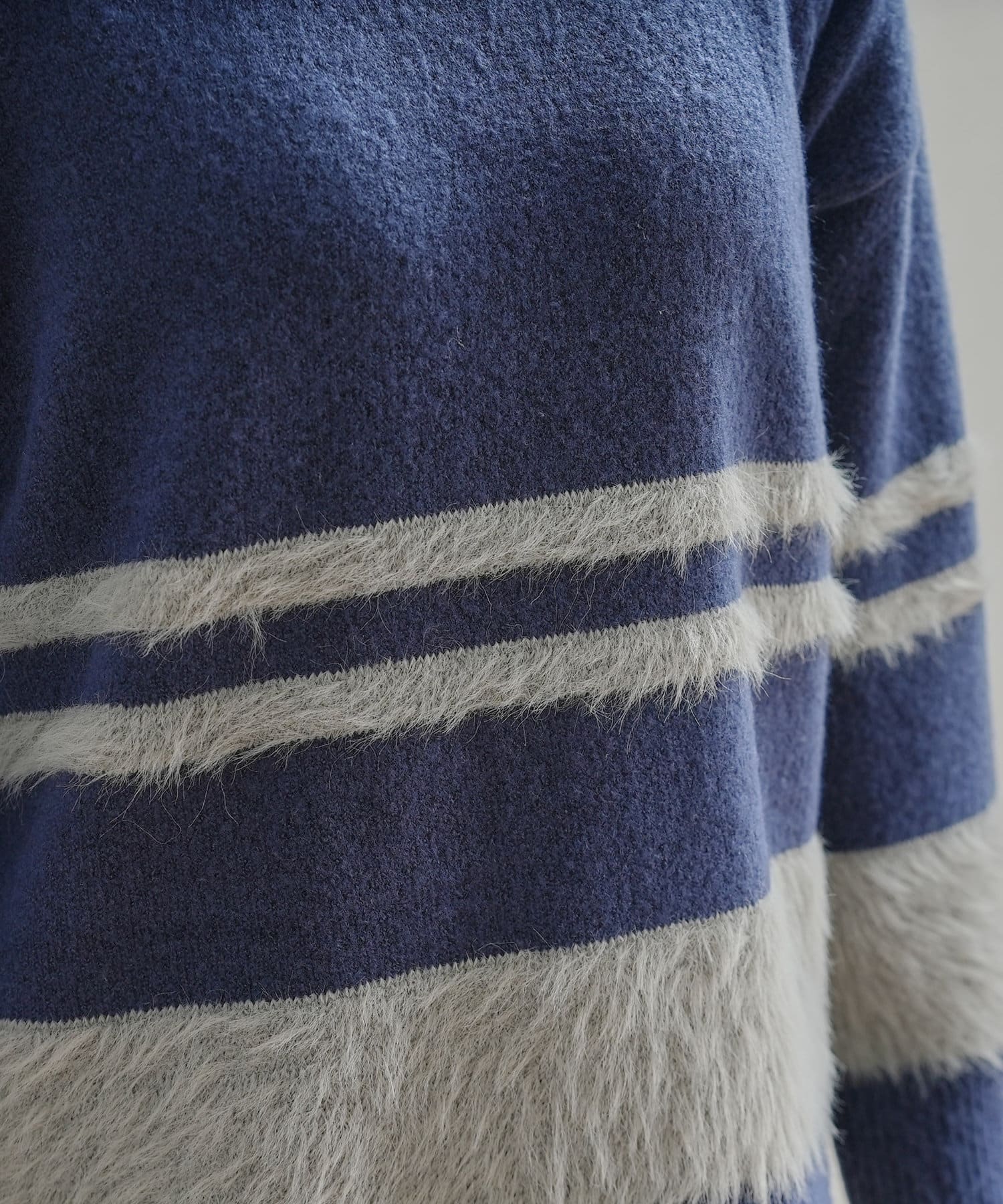 ・部分使いのラインのシャギーニットがボーダー見えしてコーディネートのアクセントを