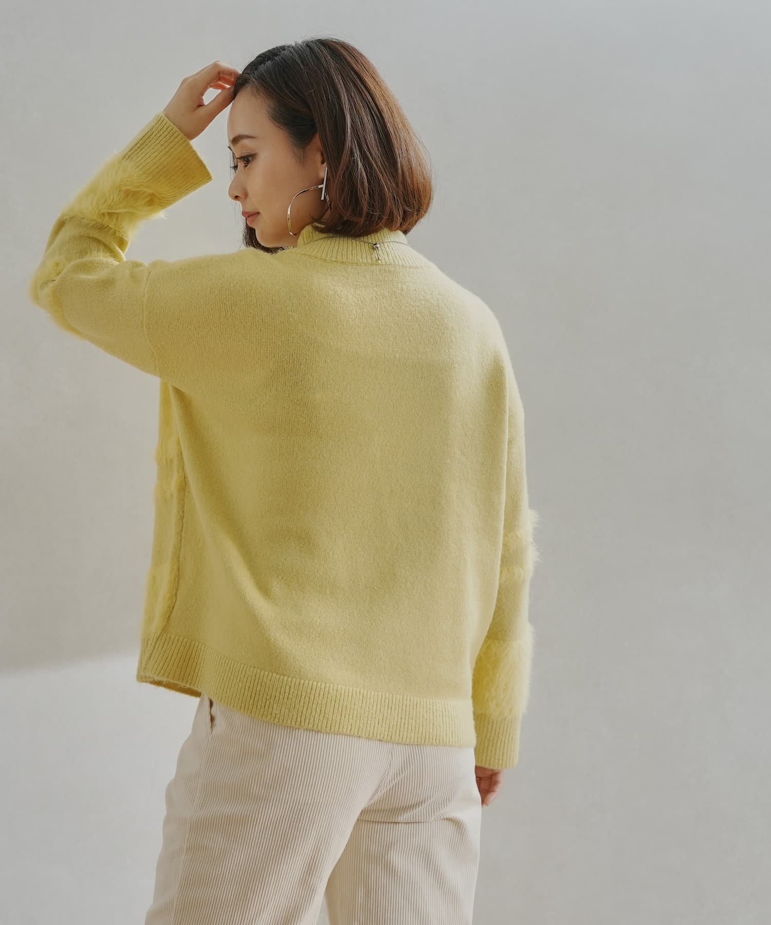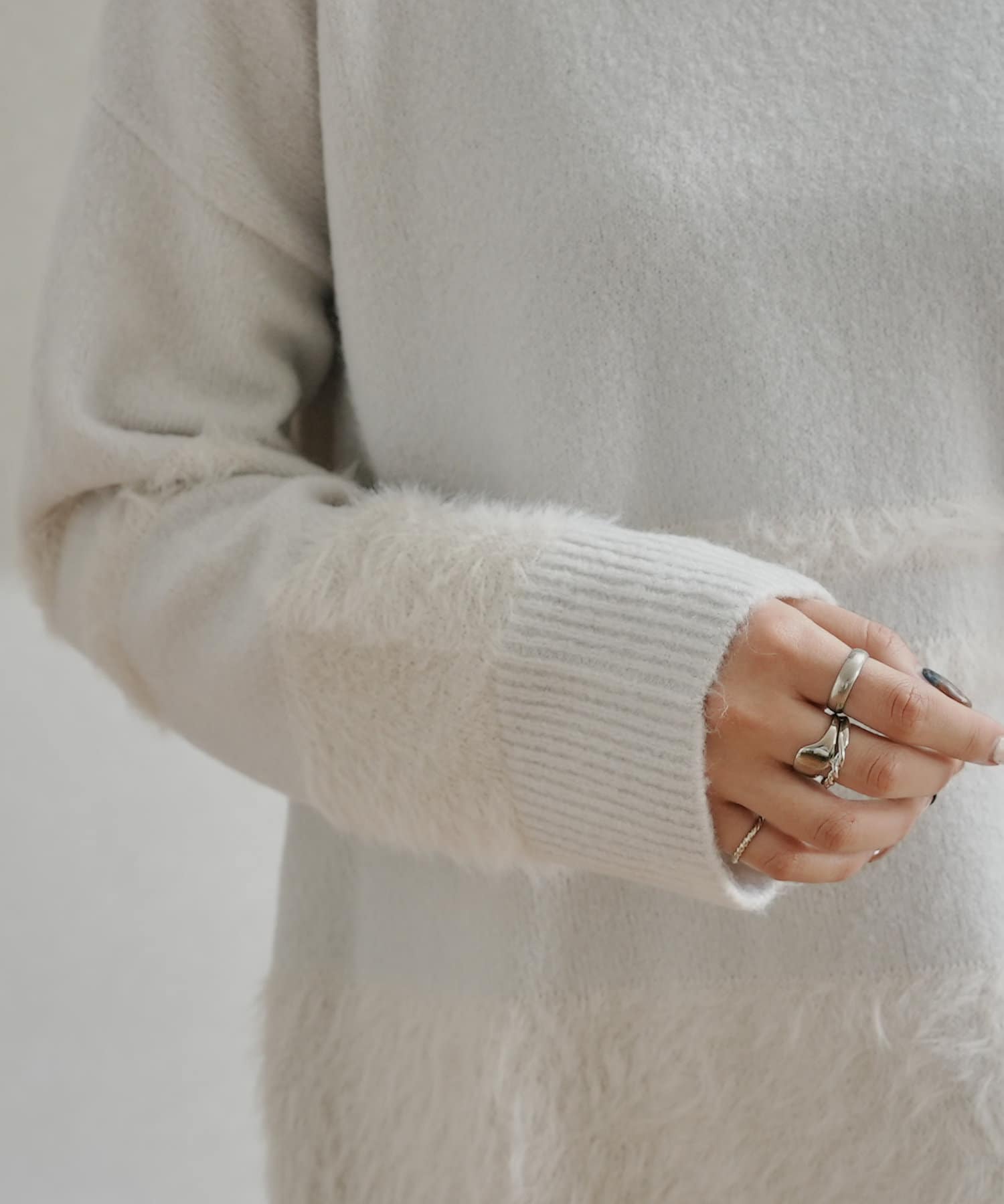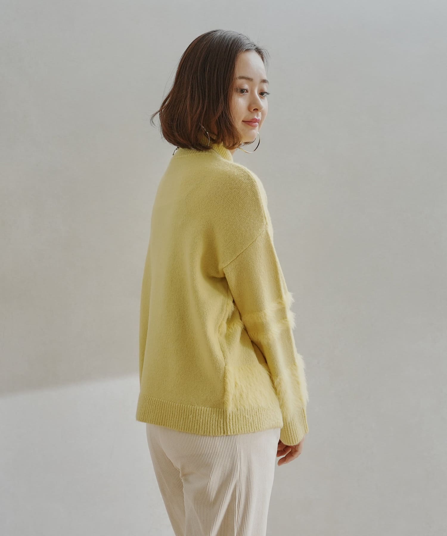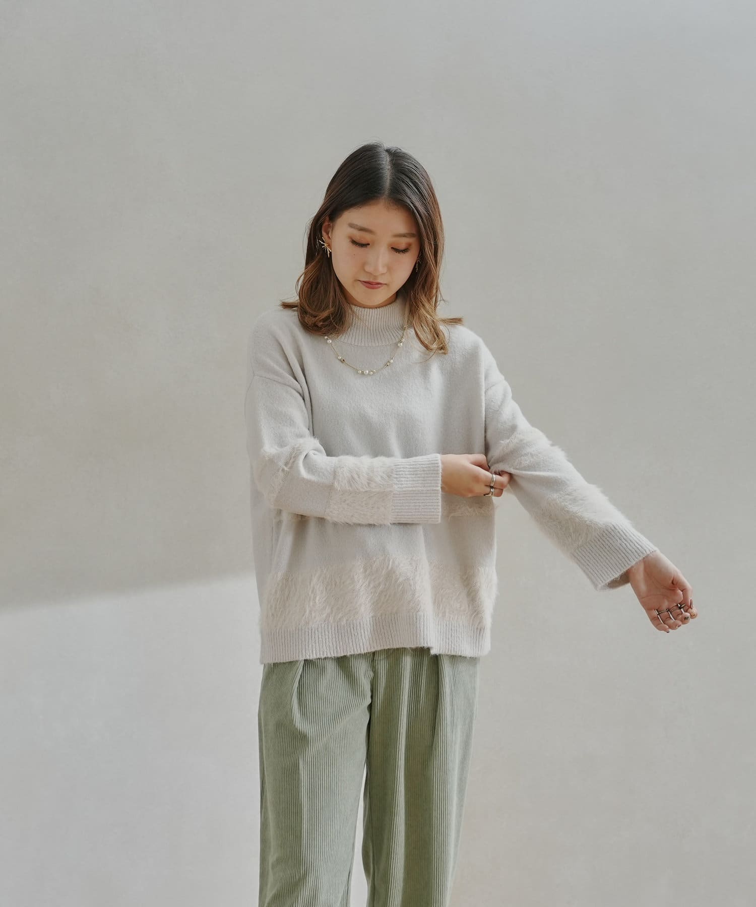 着膨れ感の出ない部分使いのシャギーニットが程よいオトナフェミニンさを演出