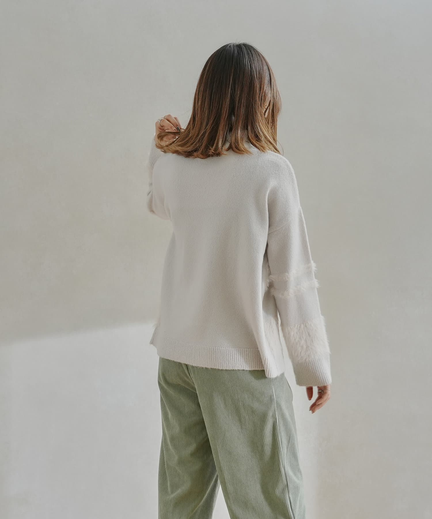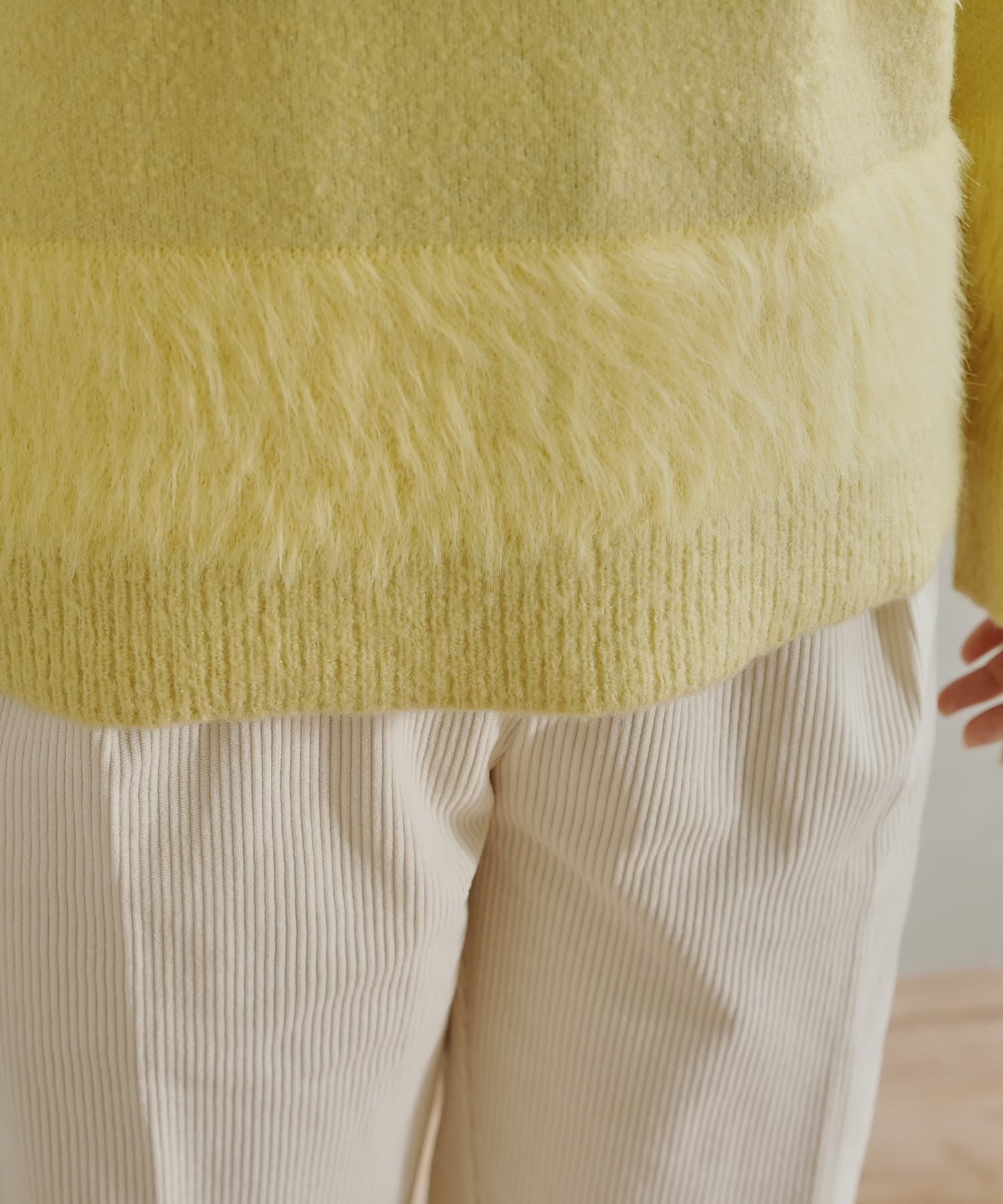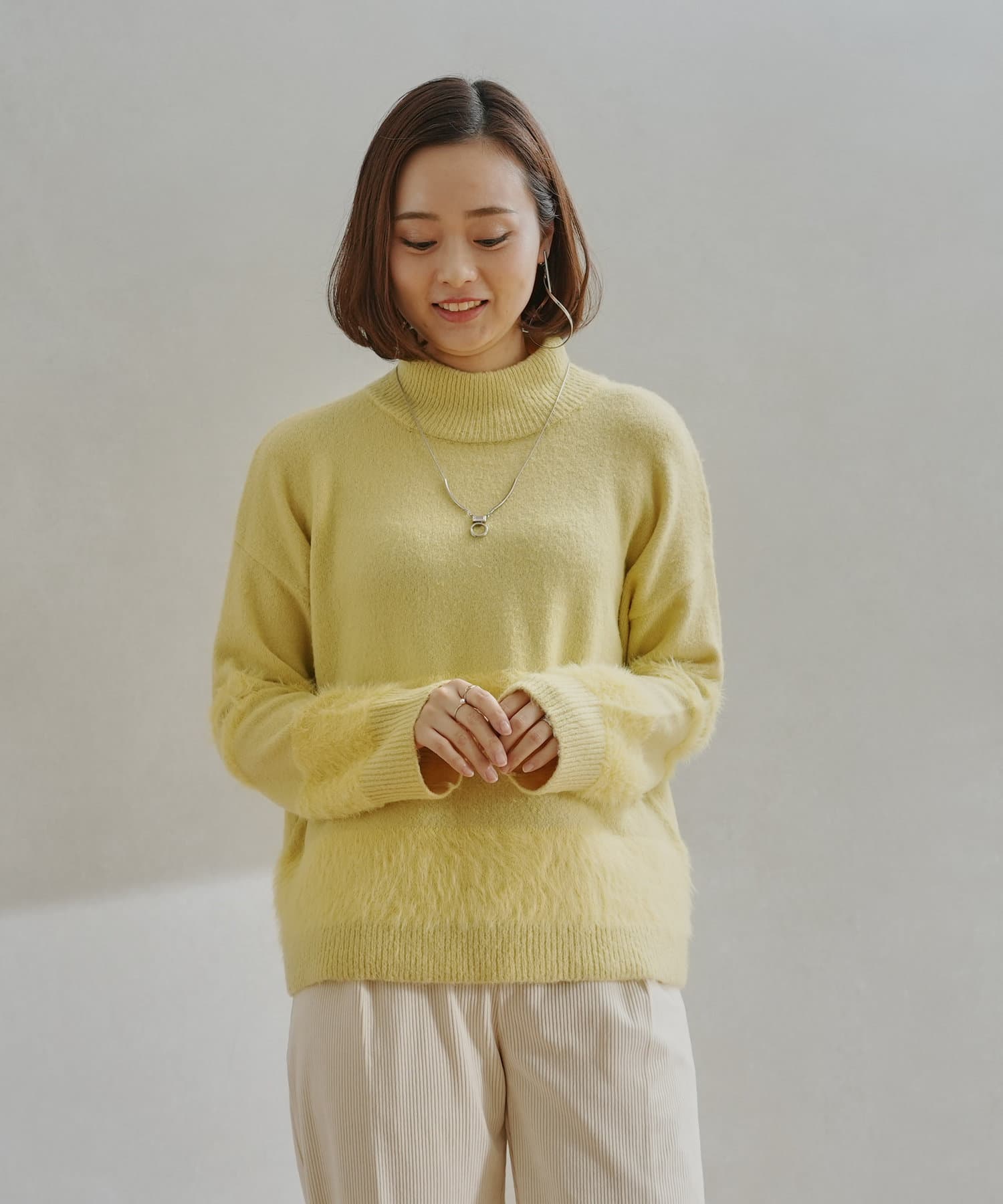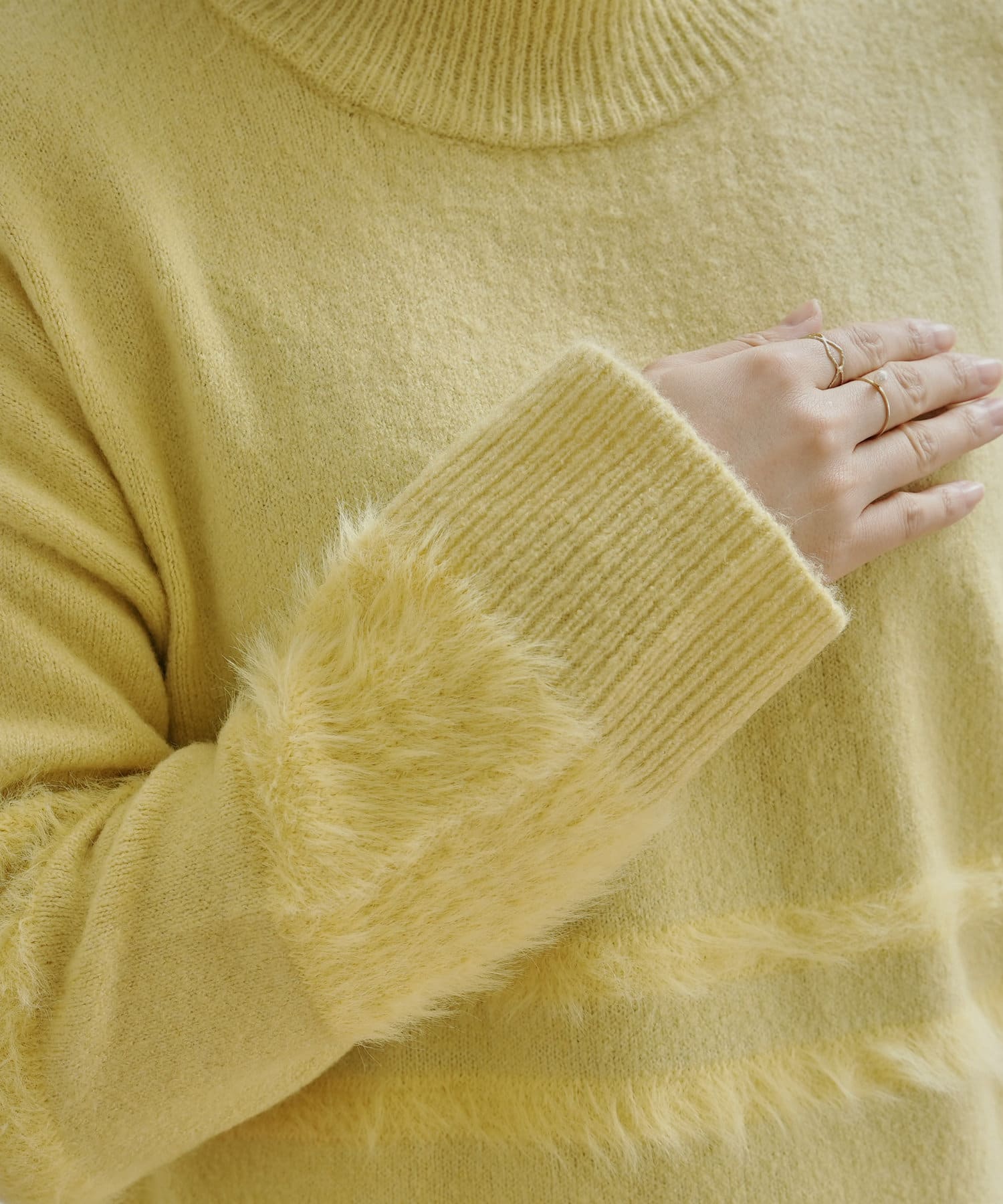 着膨れ感の出ない部分使いのシャギーニットが程よいオトナフェミニンさを演出
