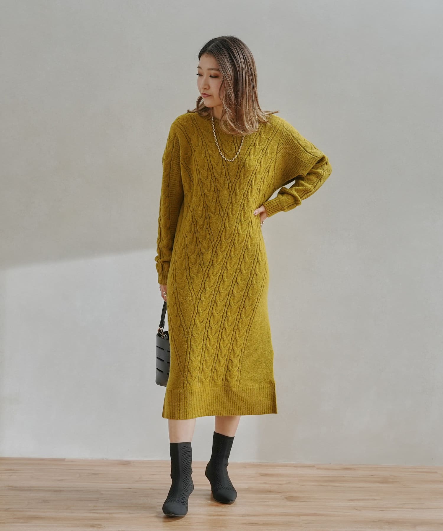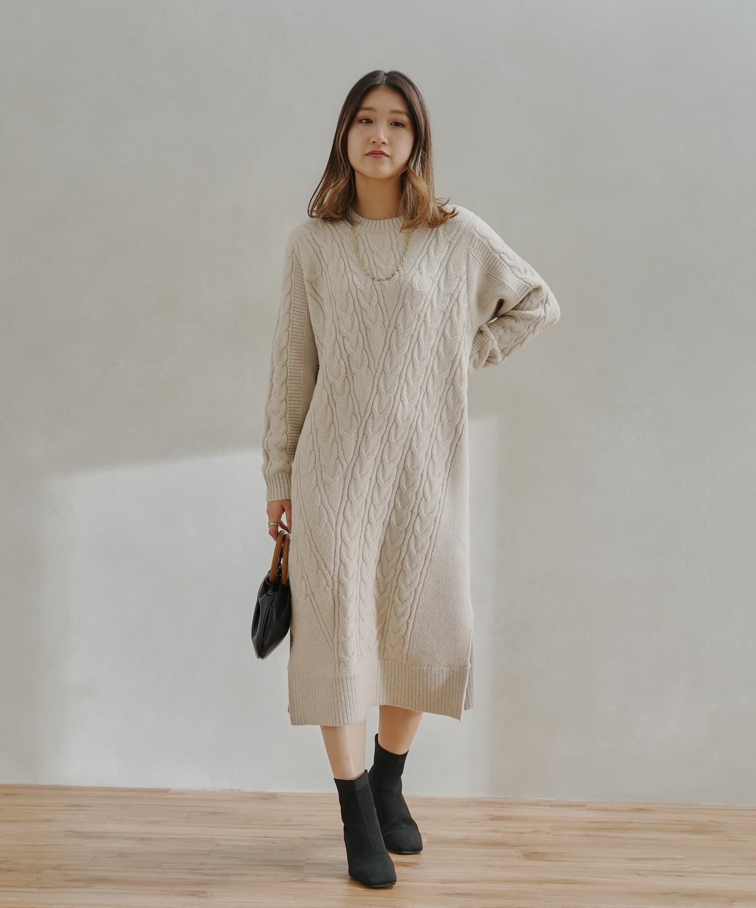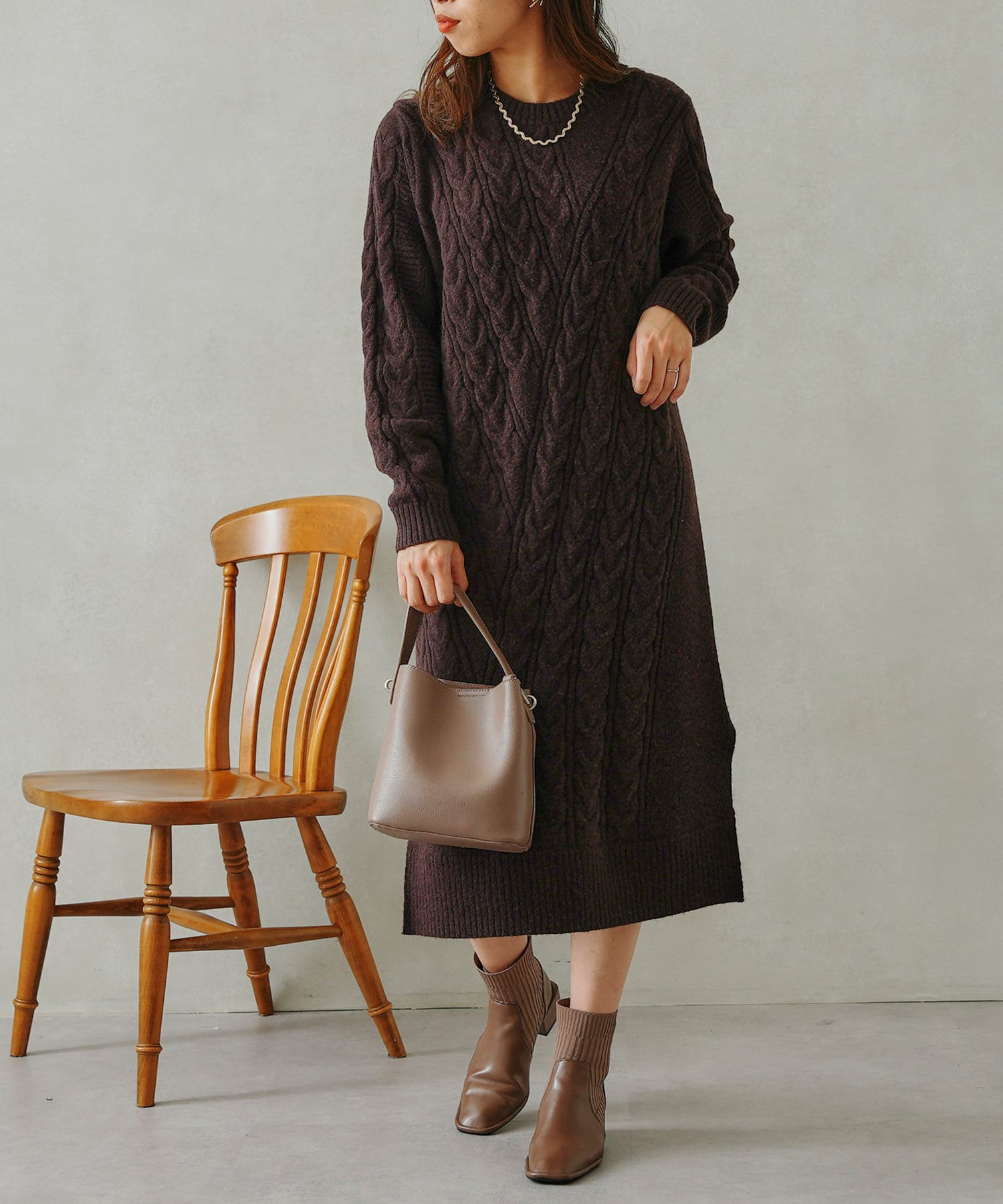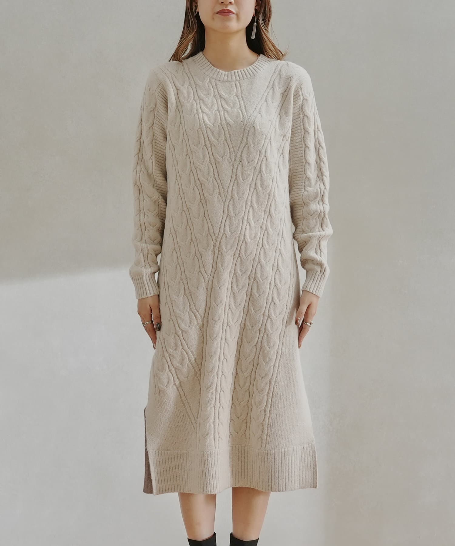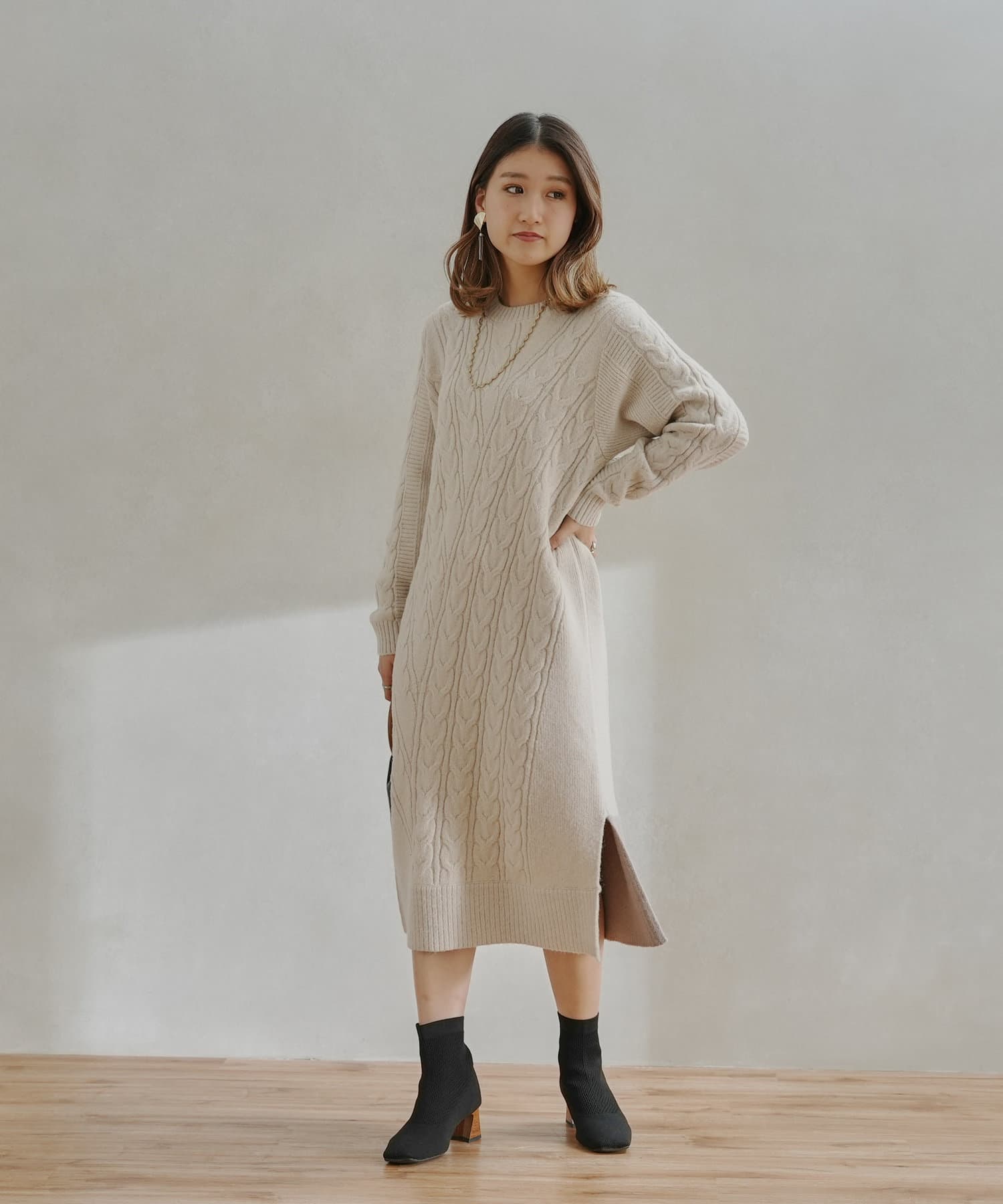 ・斜めに入ったケーブルの編み柄が珍しいニットワンピース