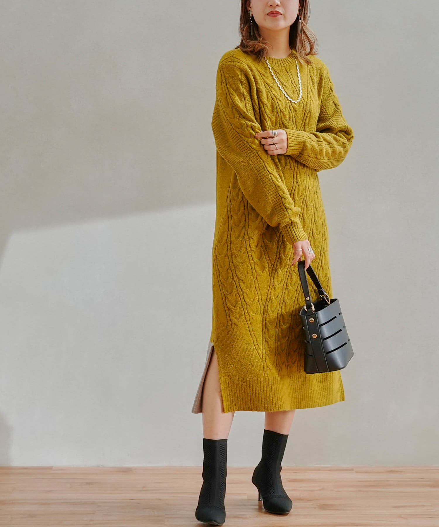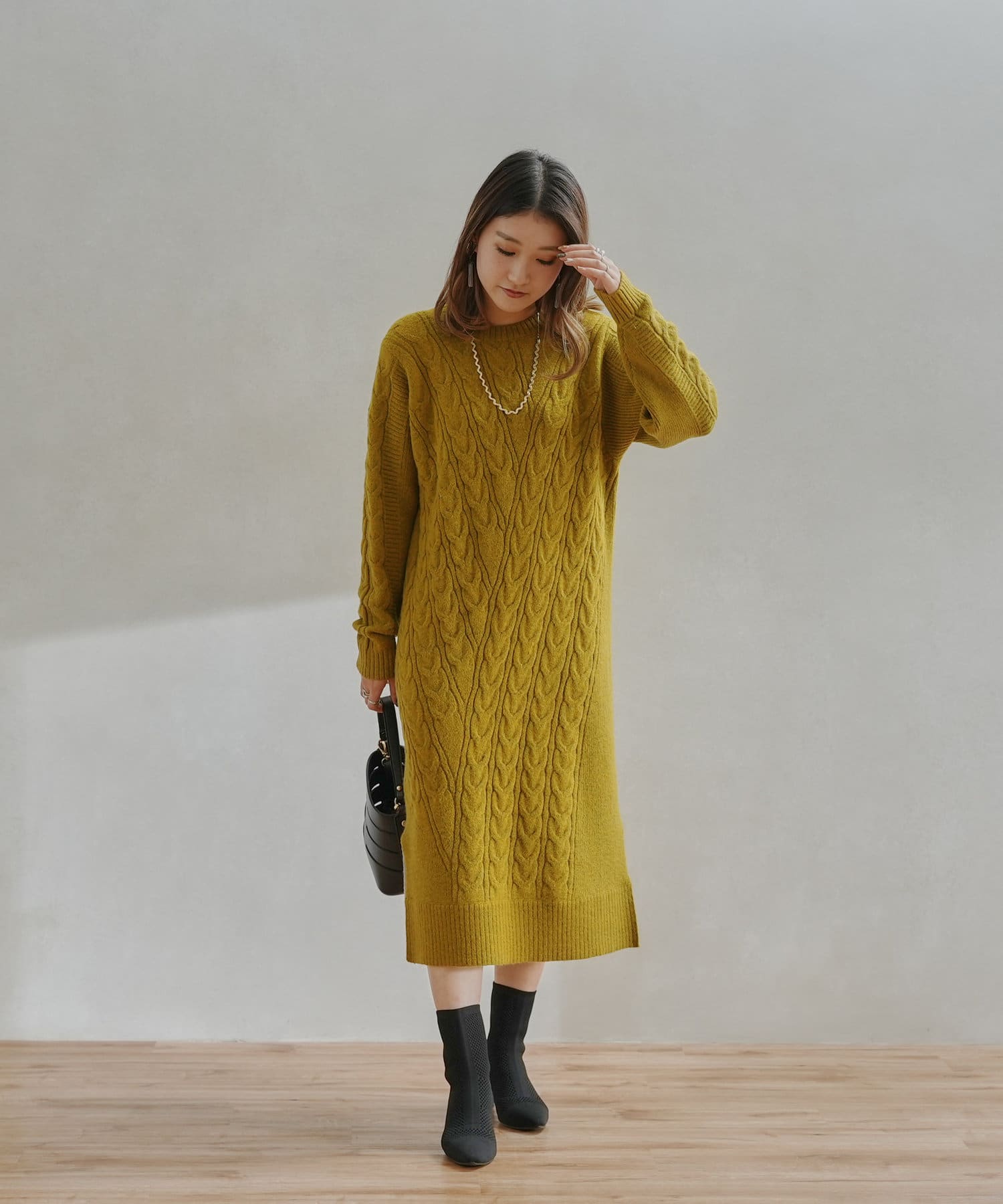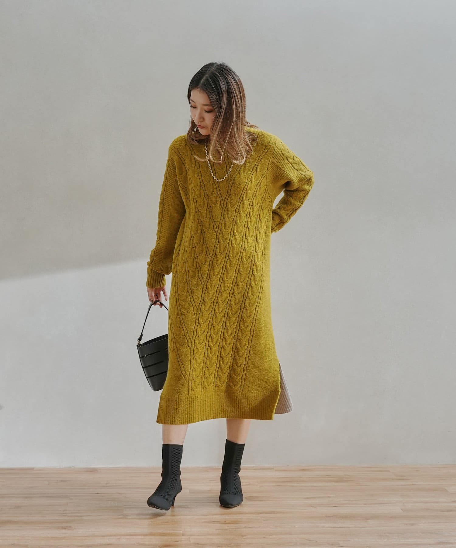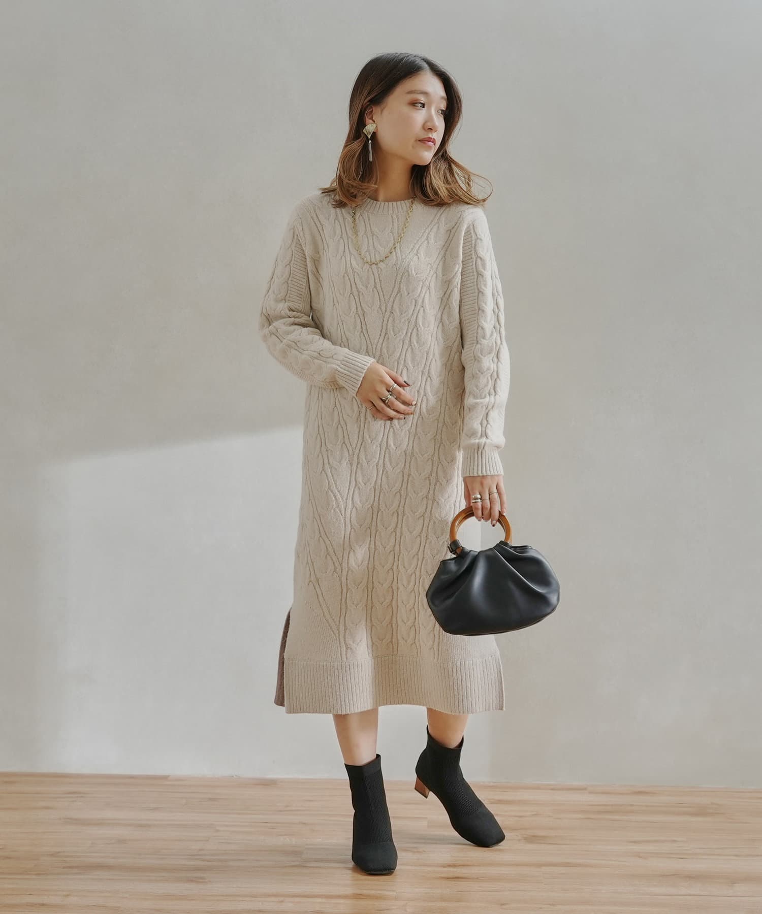 ・斜めに入ったケーブルの編み柄が珍しいニットワンピース