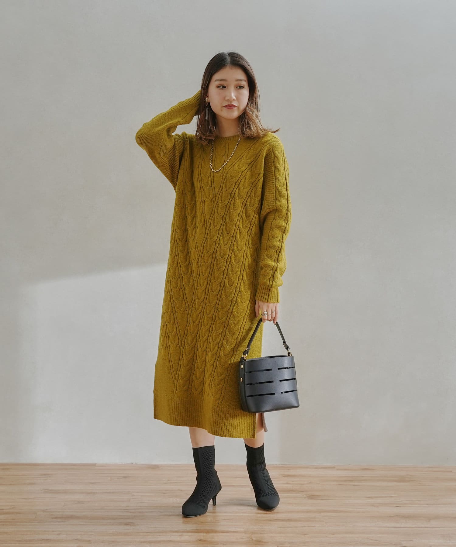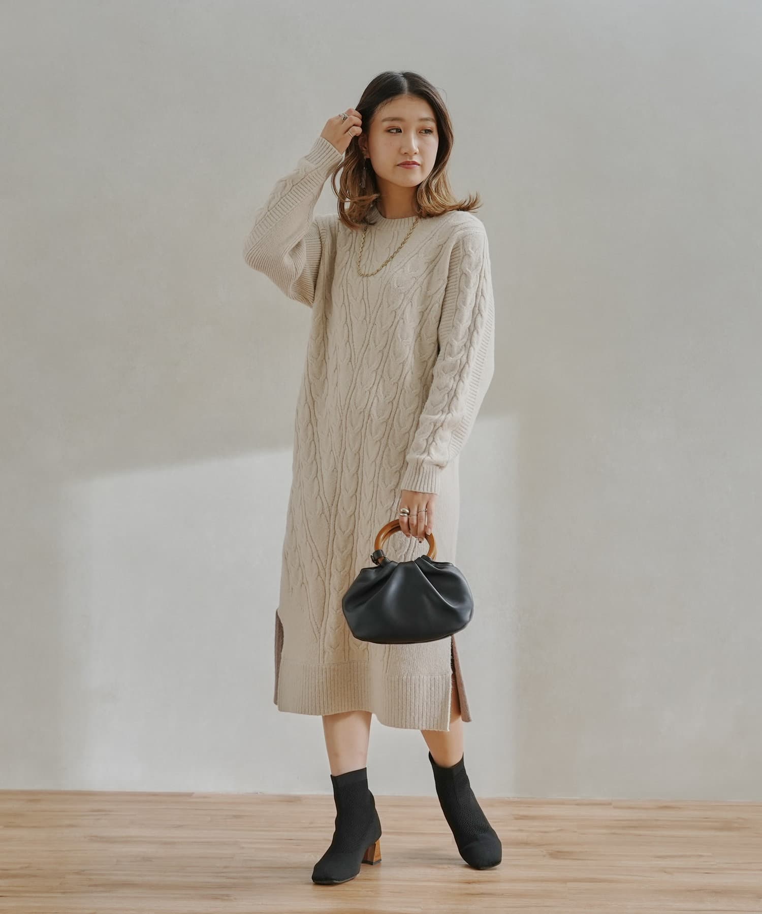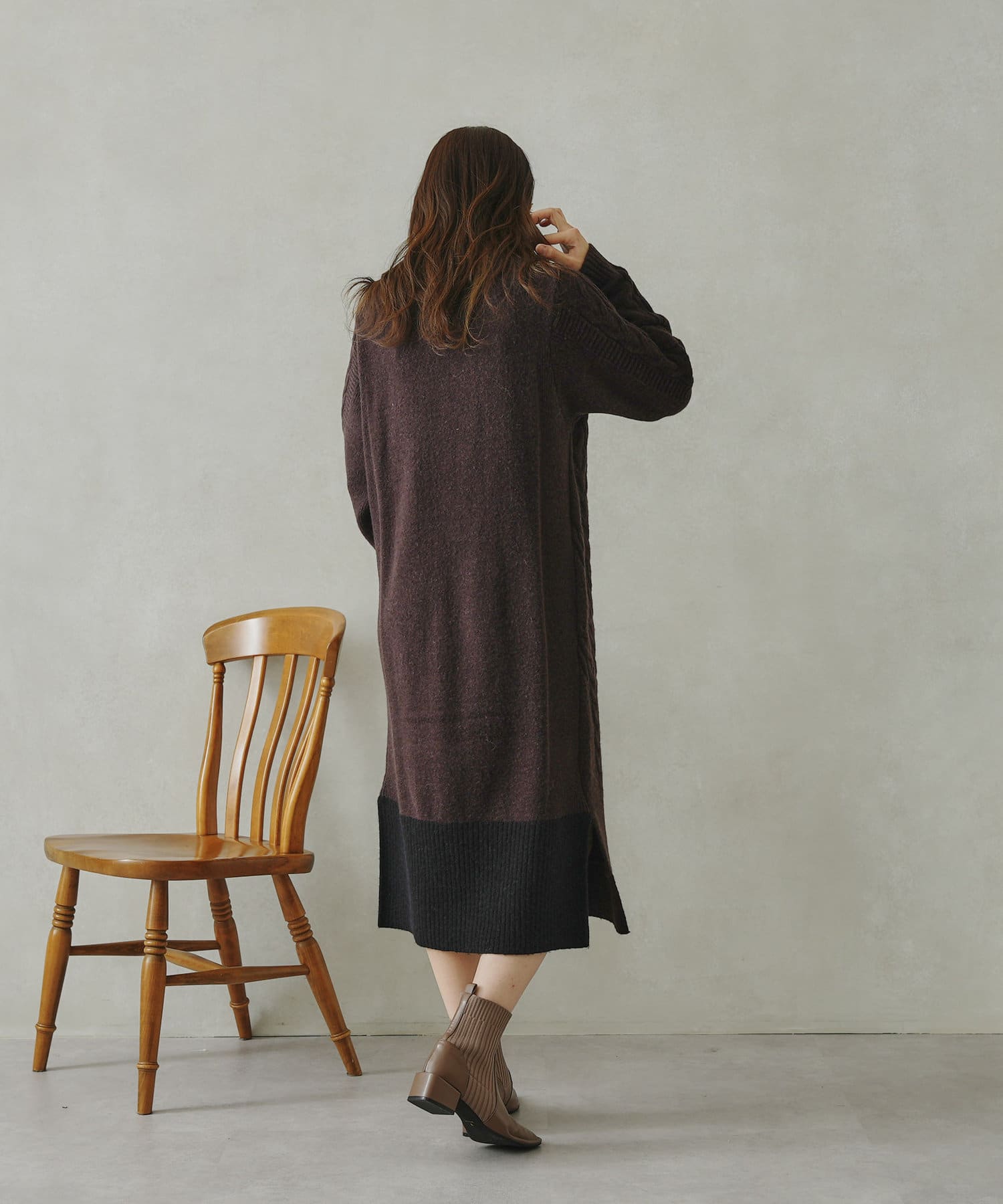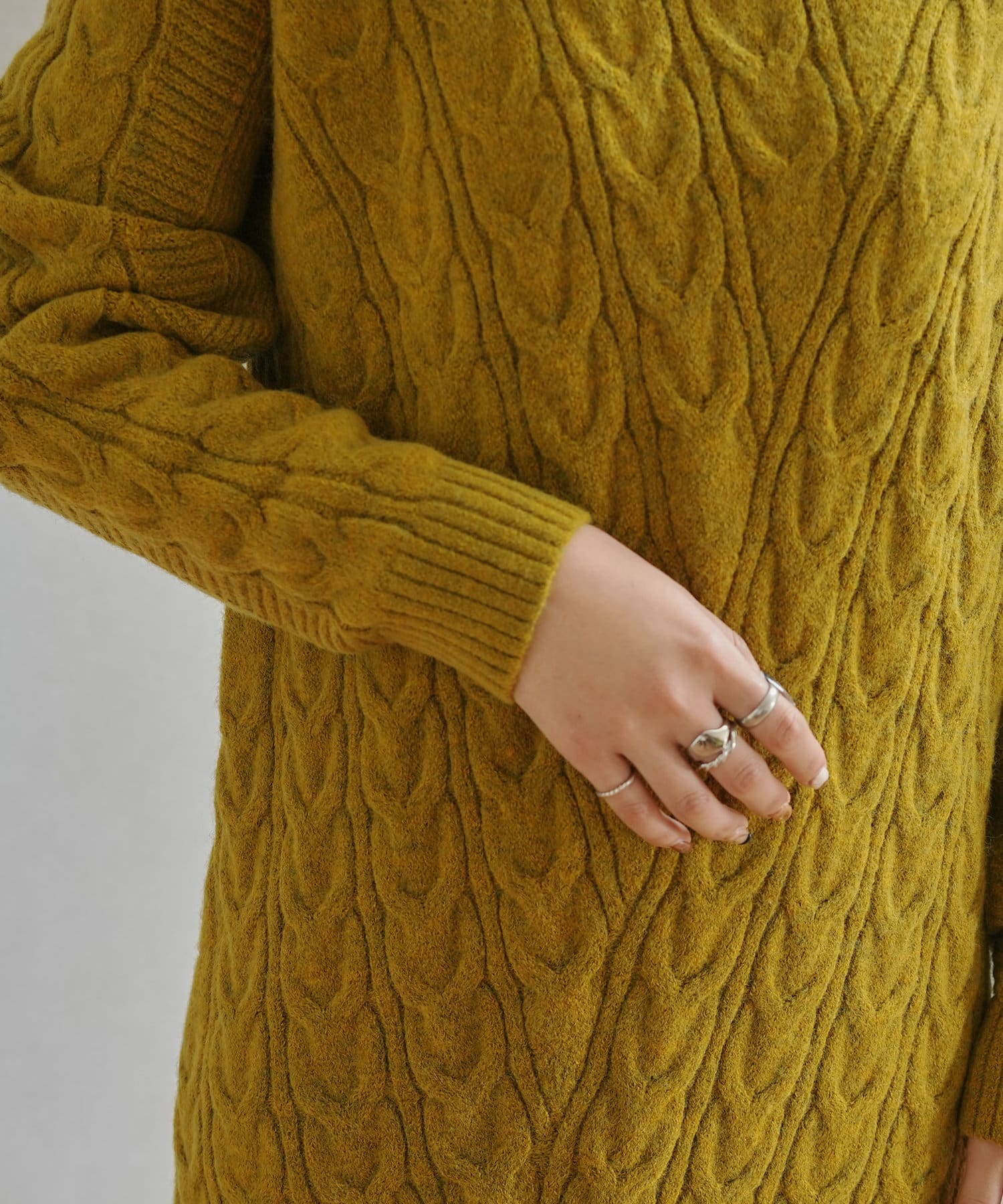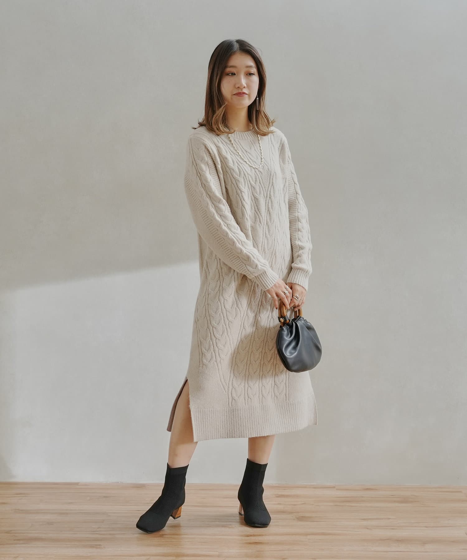 ・斜めに入ったケーブルの編み柄が珍しいニットワンピース