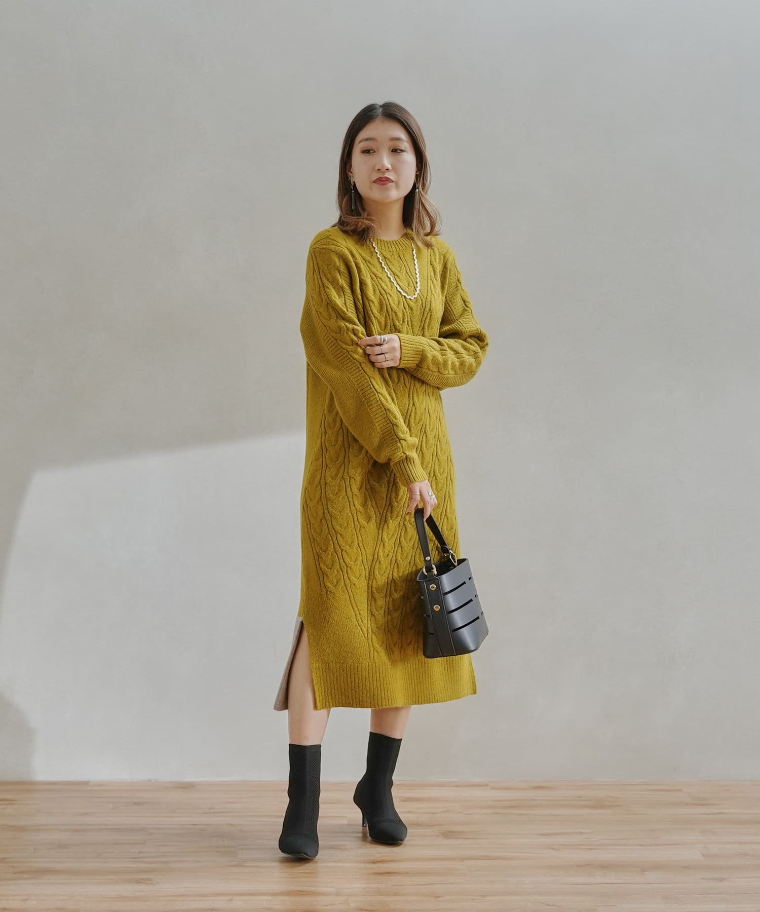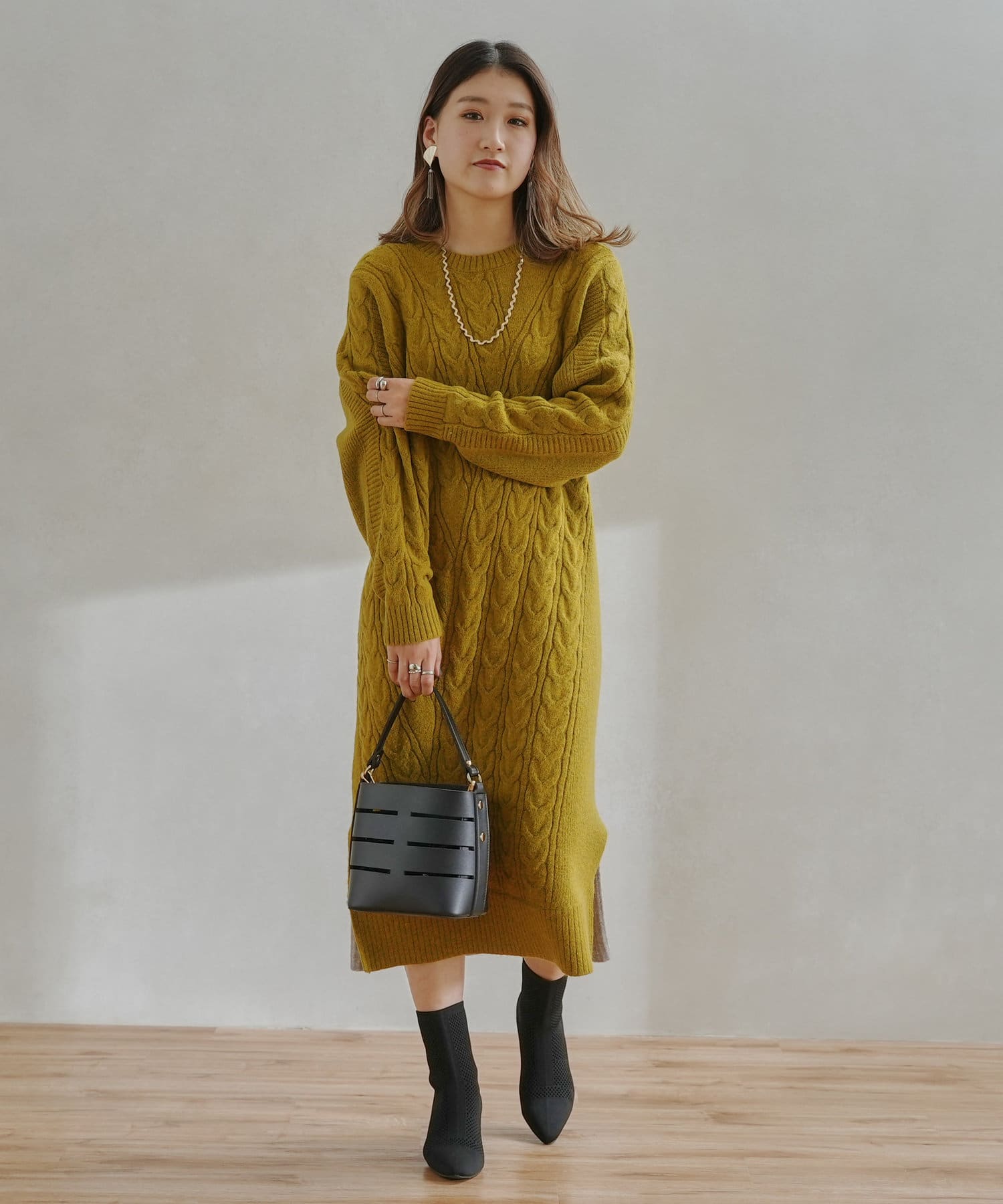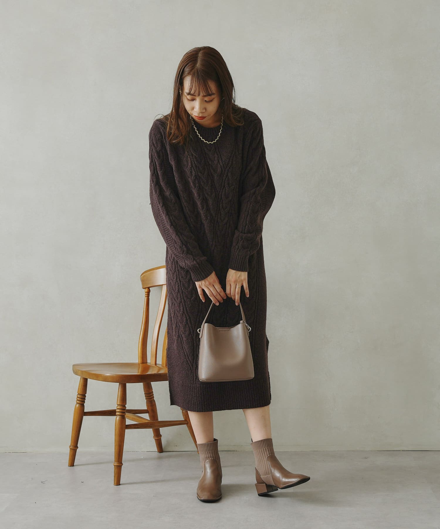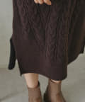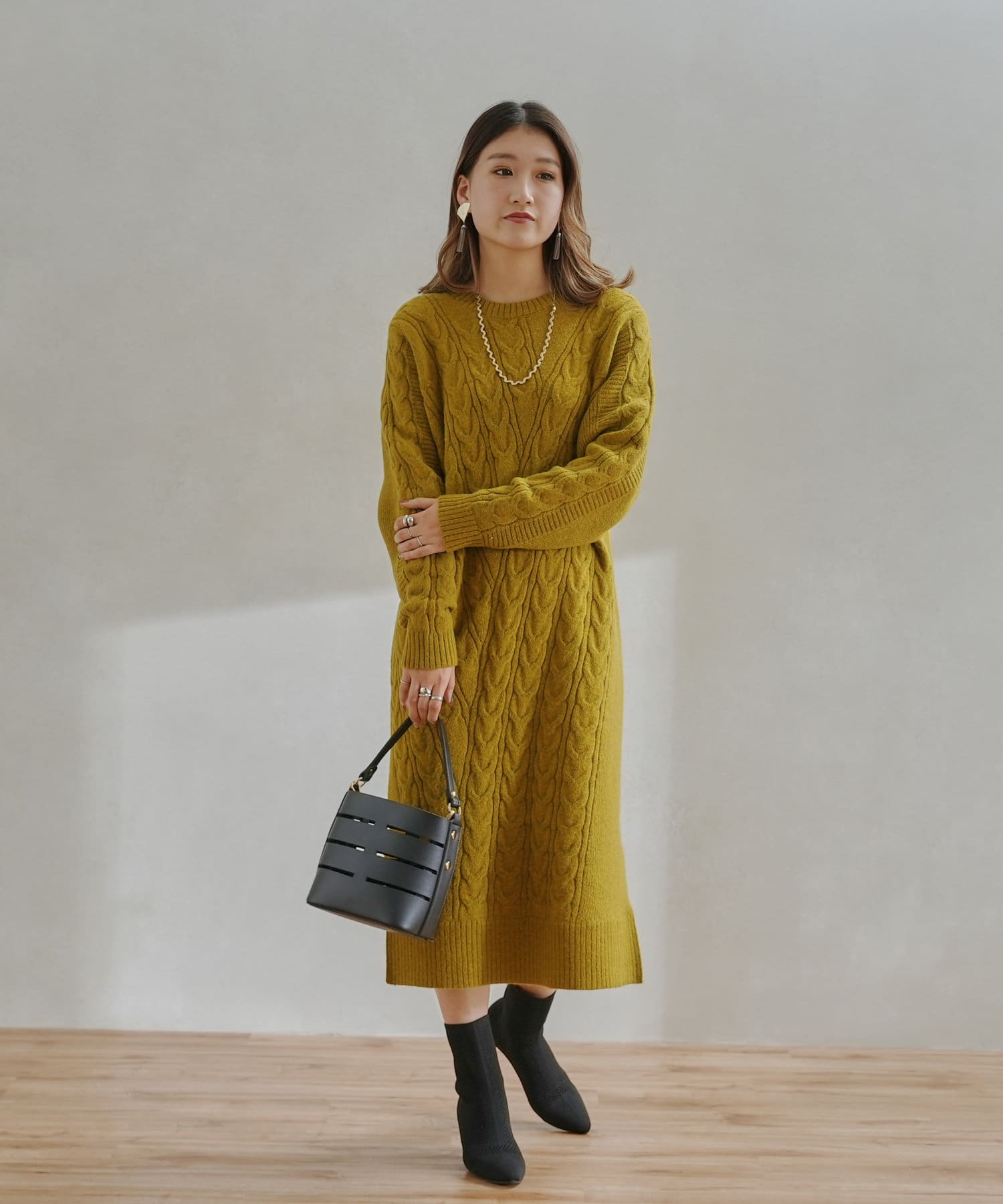 ・斜めに入ったケーブルの編み柄が珍しいニットワンピース