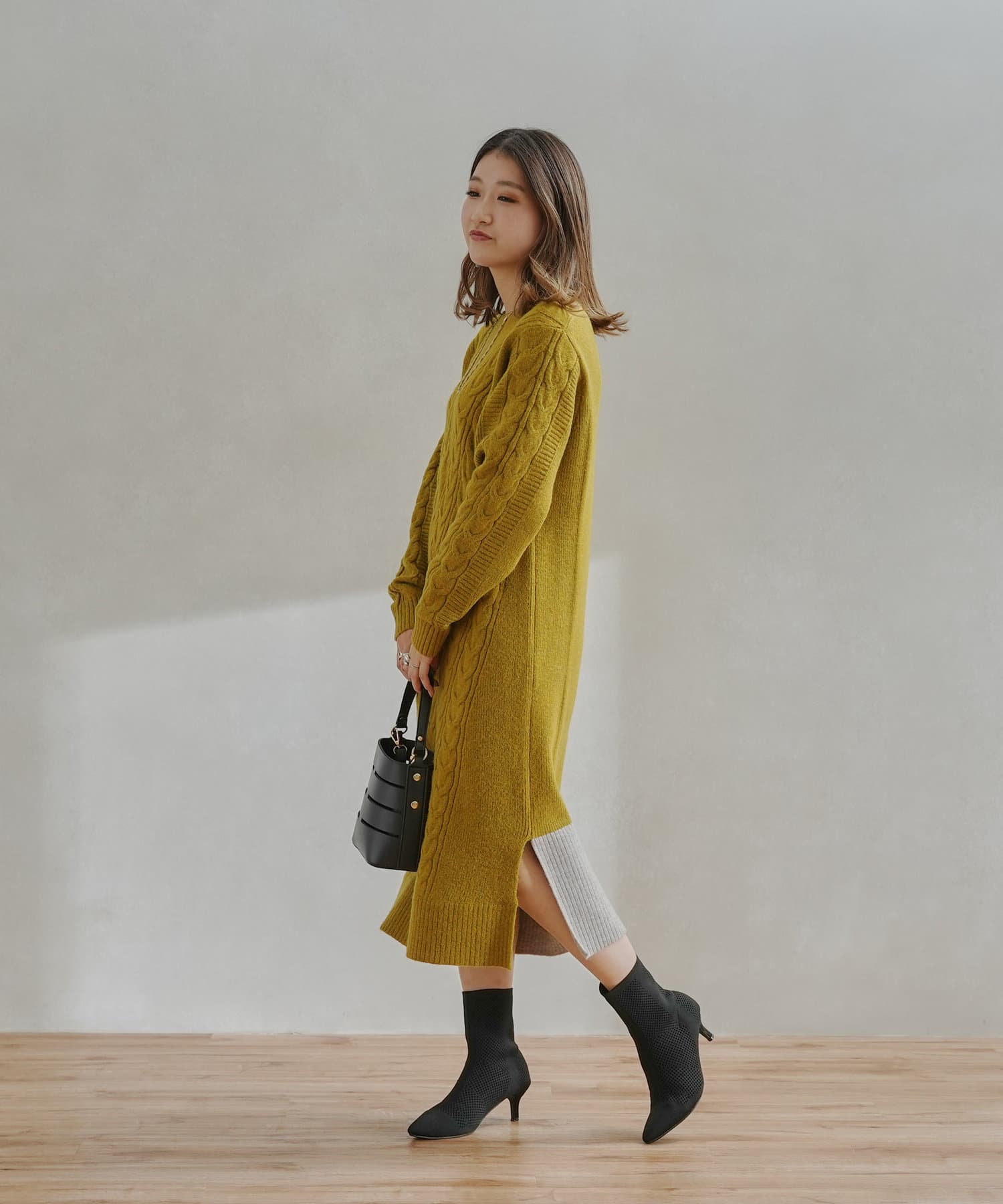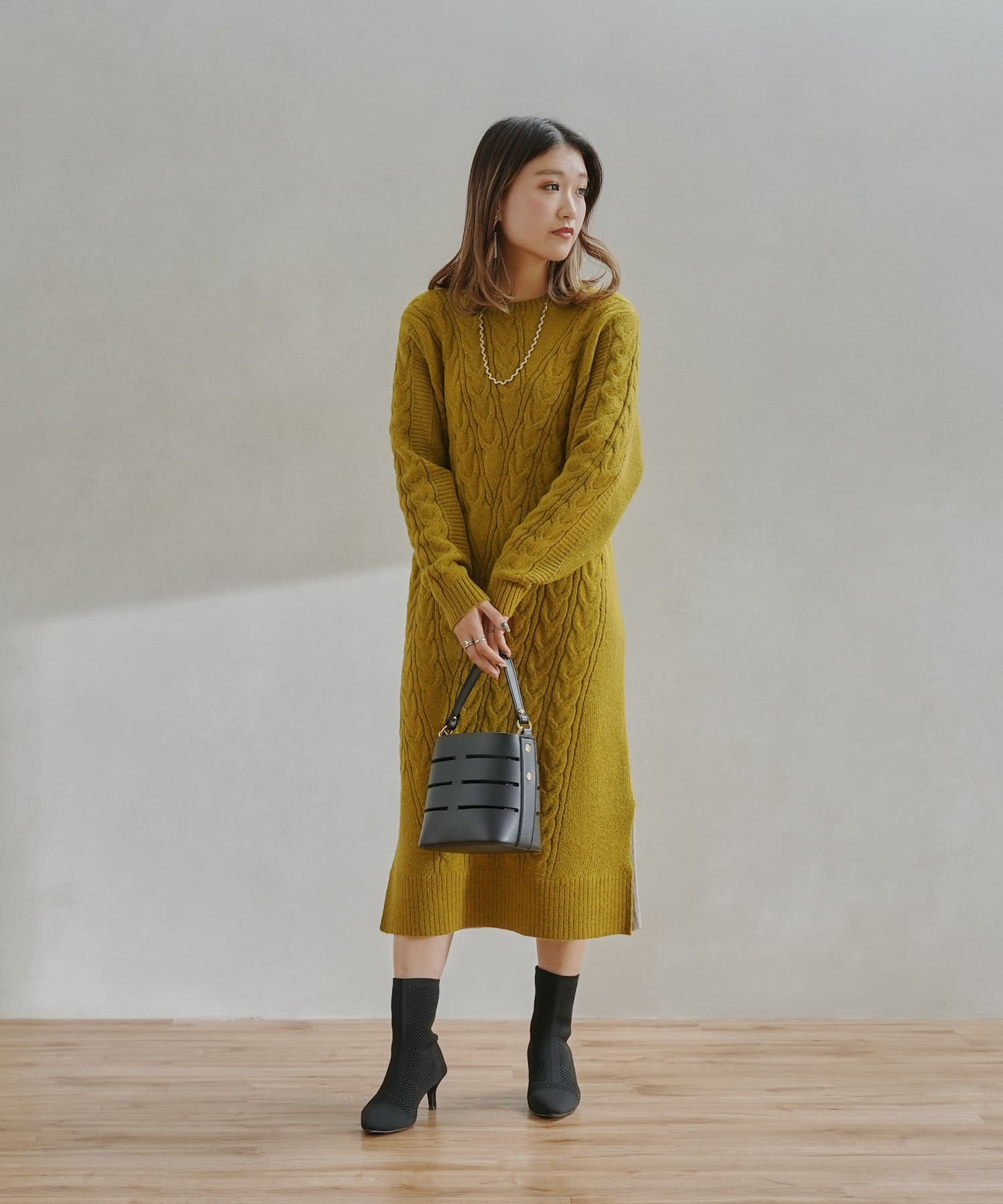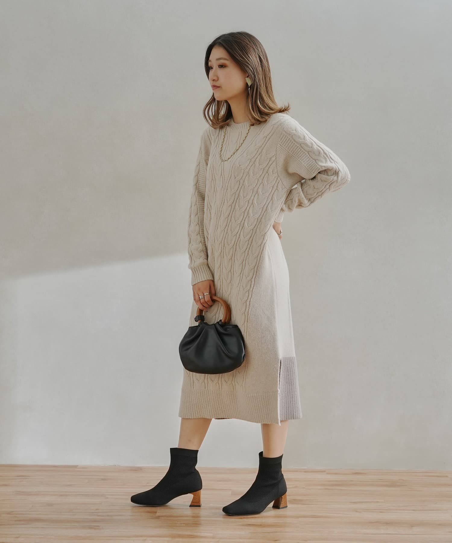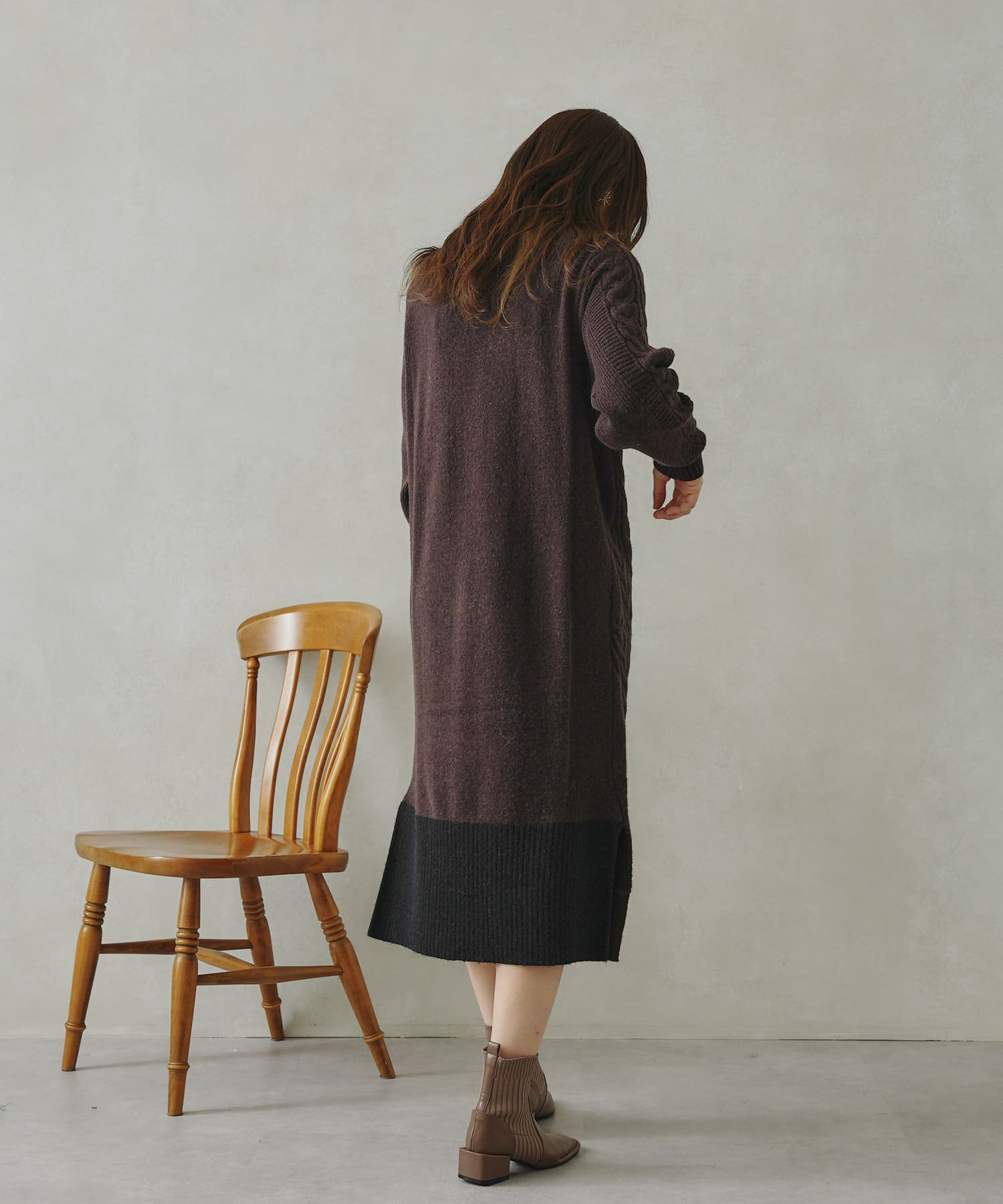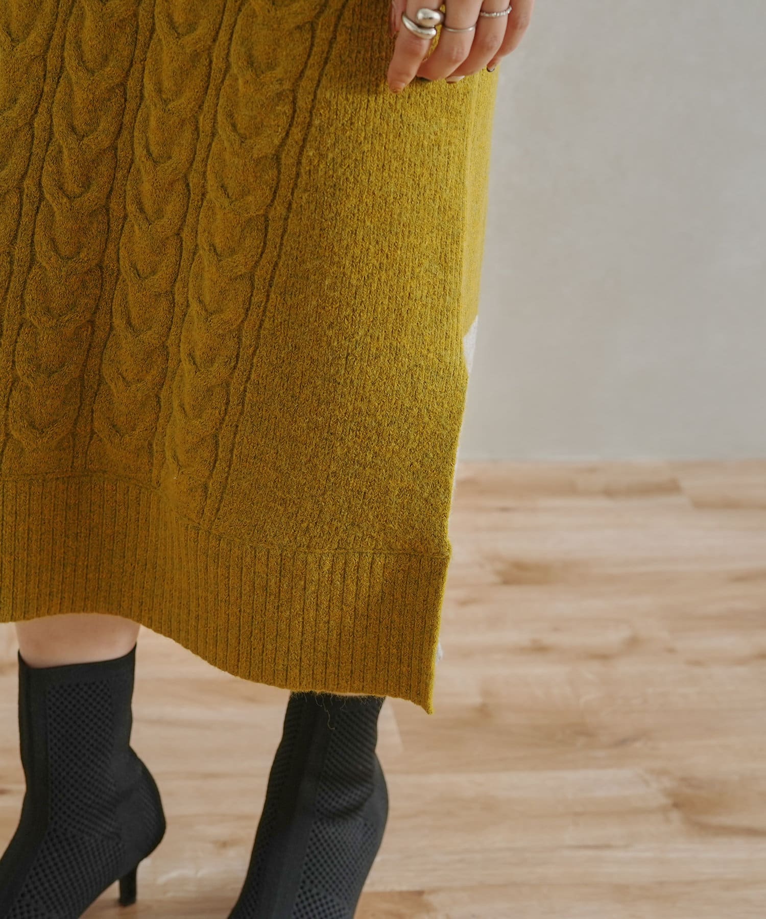 ・斜めに入ったケーブルの編み柄が珍しいニットワンピース