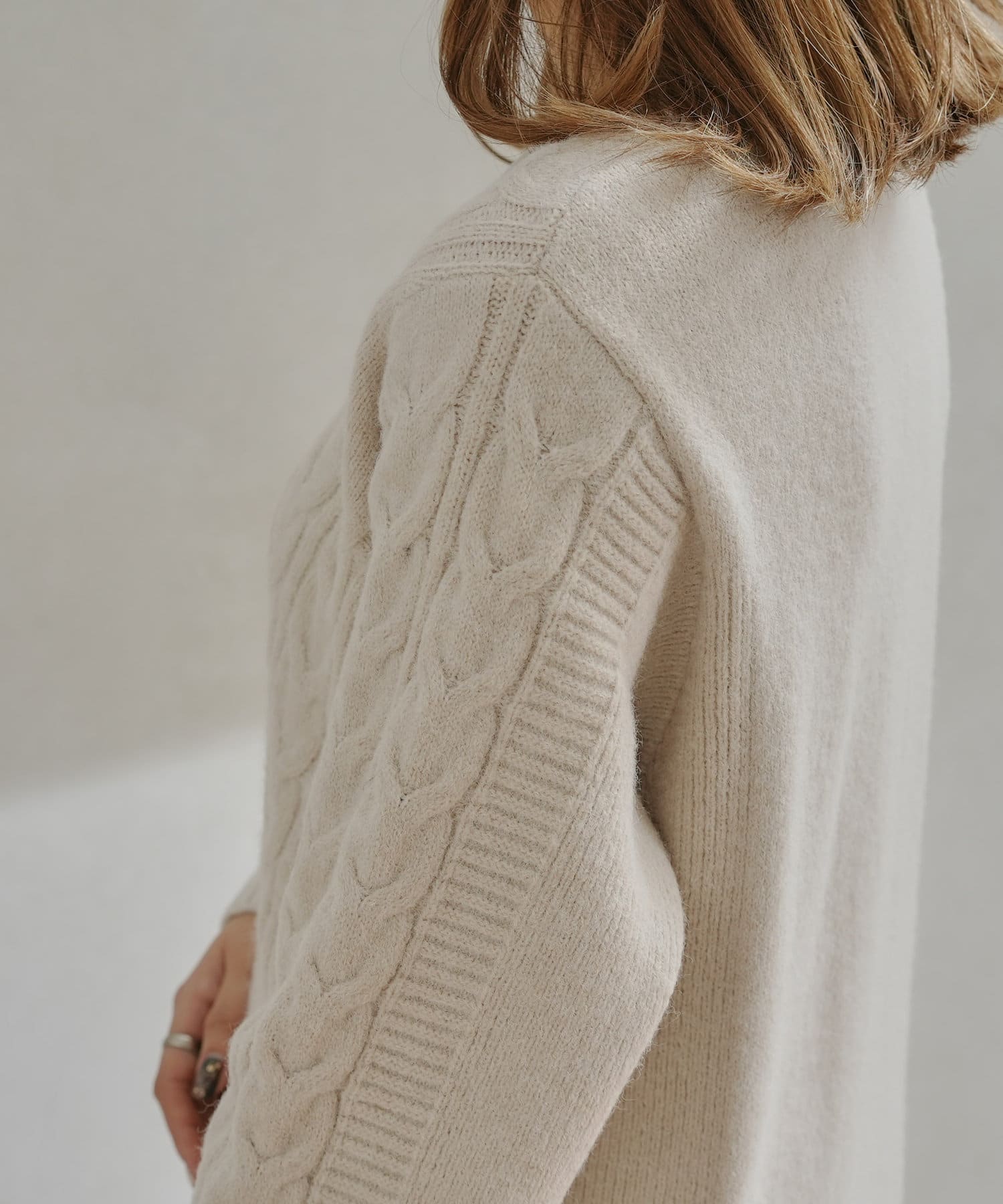 斜めに入ったケーブルが珍しいデザイン。後ろの配色がアクセントに。