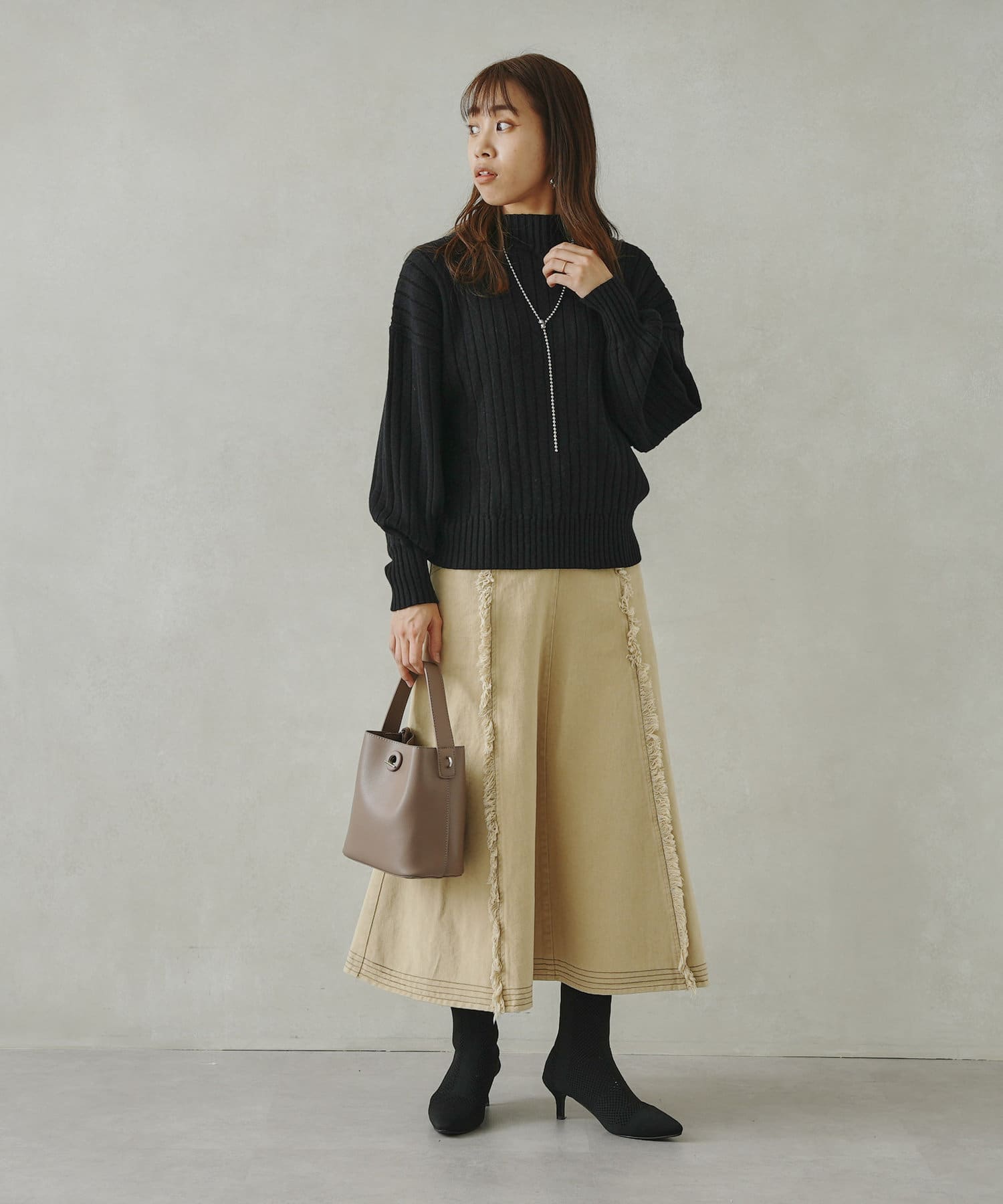 冬はニット、春夏はブラウスやTシャツなど、きれいめからカジュアルなスタイリングまで