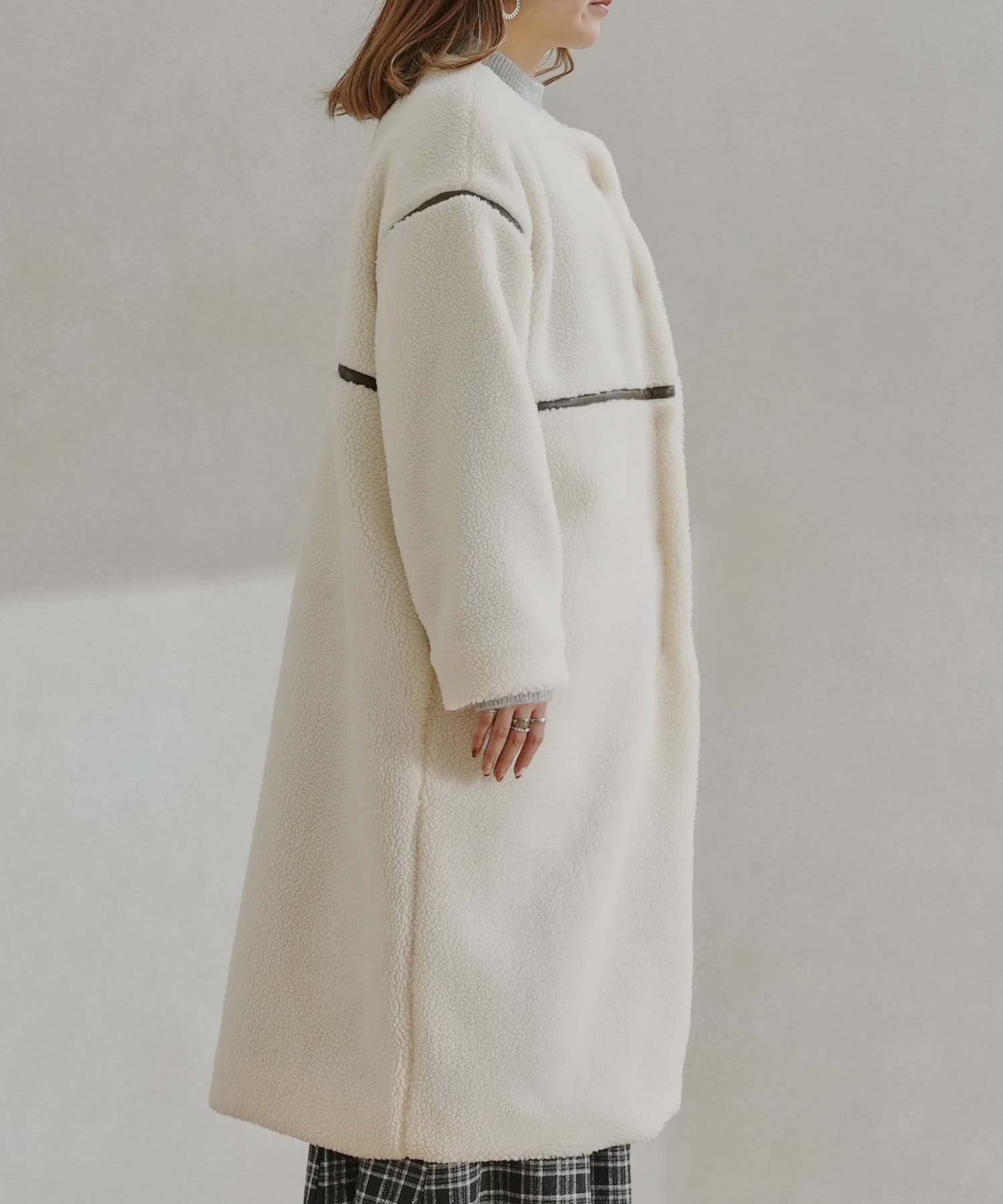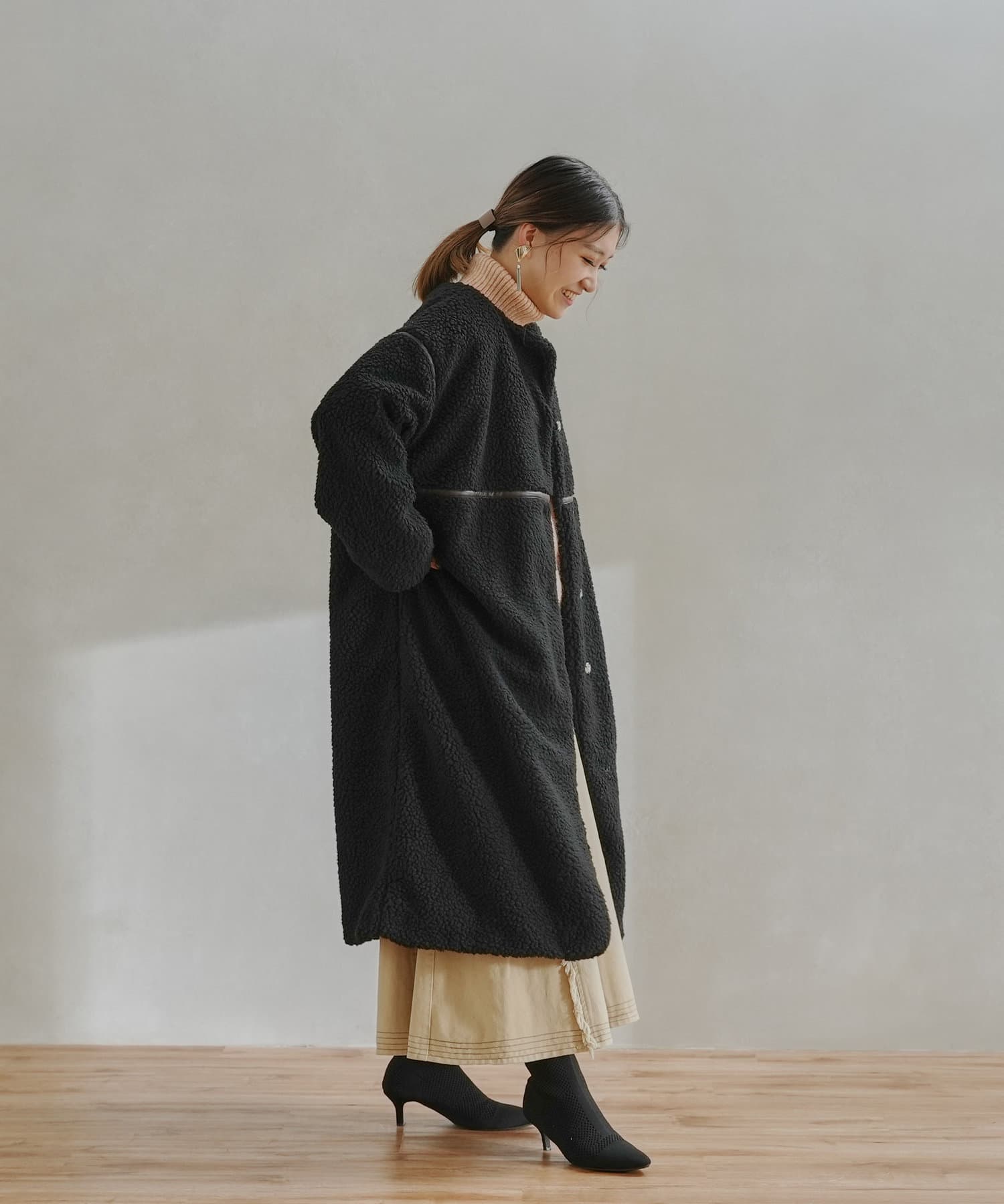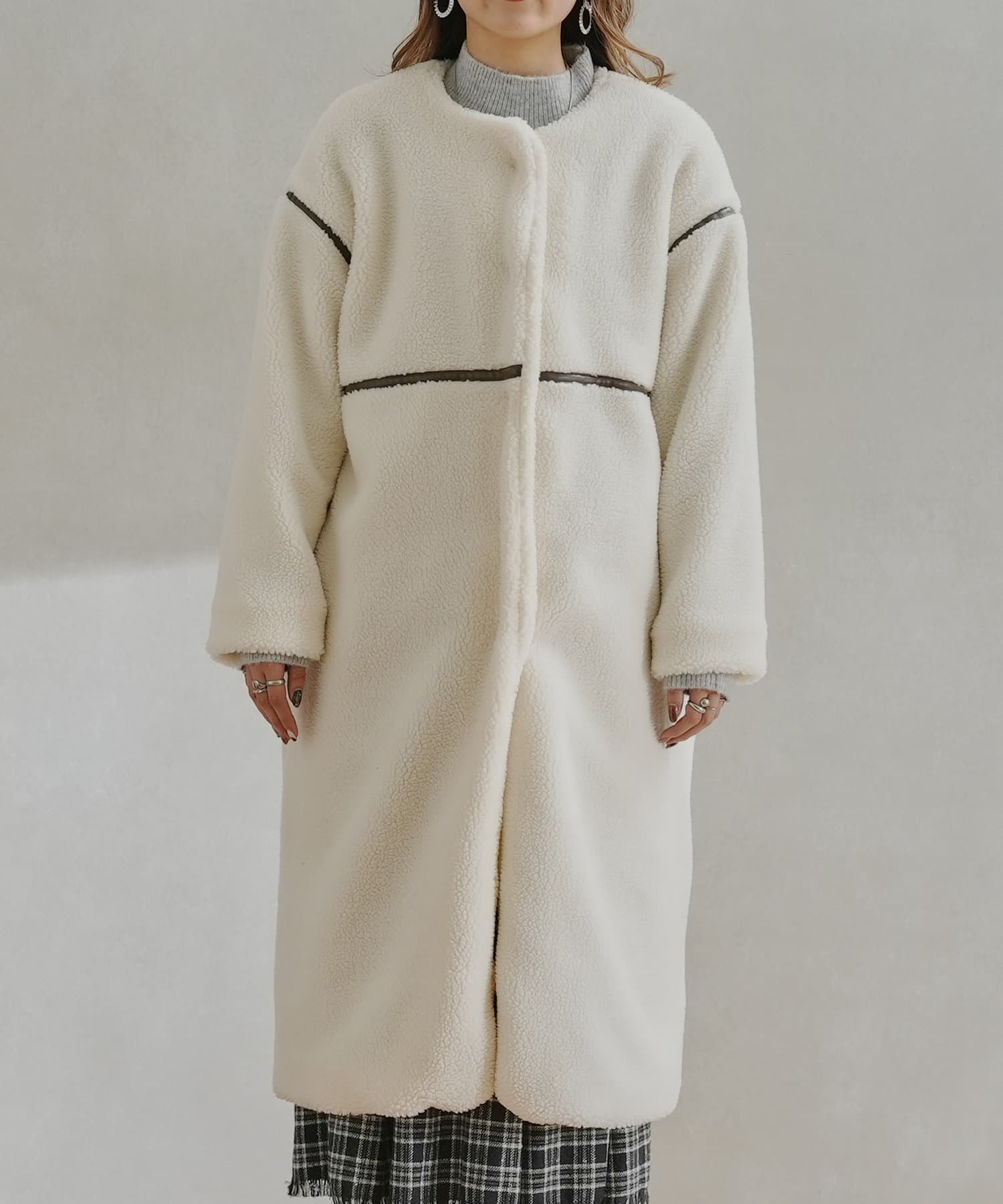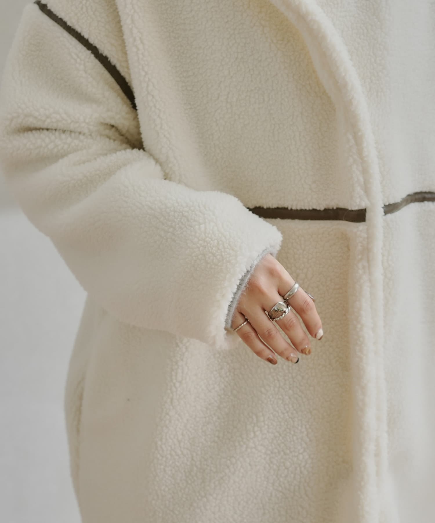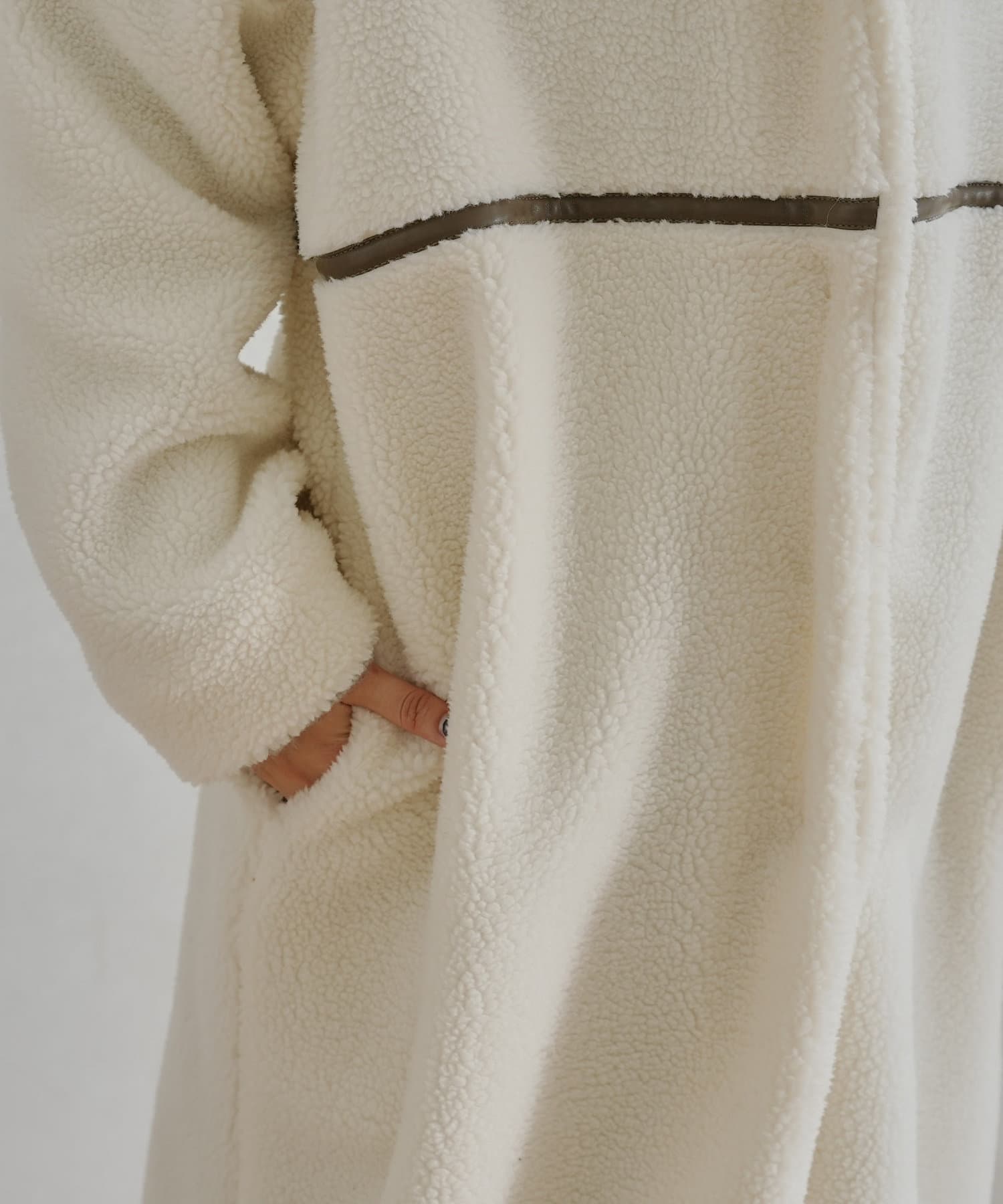 ・パイピングがアクセントになったボアコート。ゆったりしたシルエットなので
