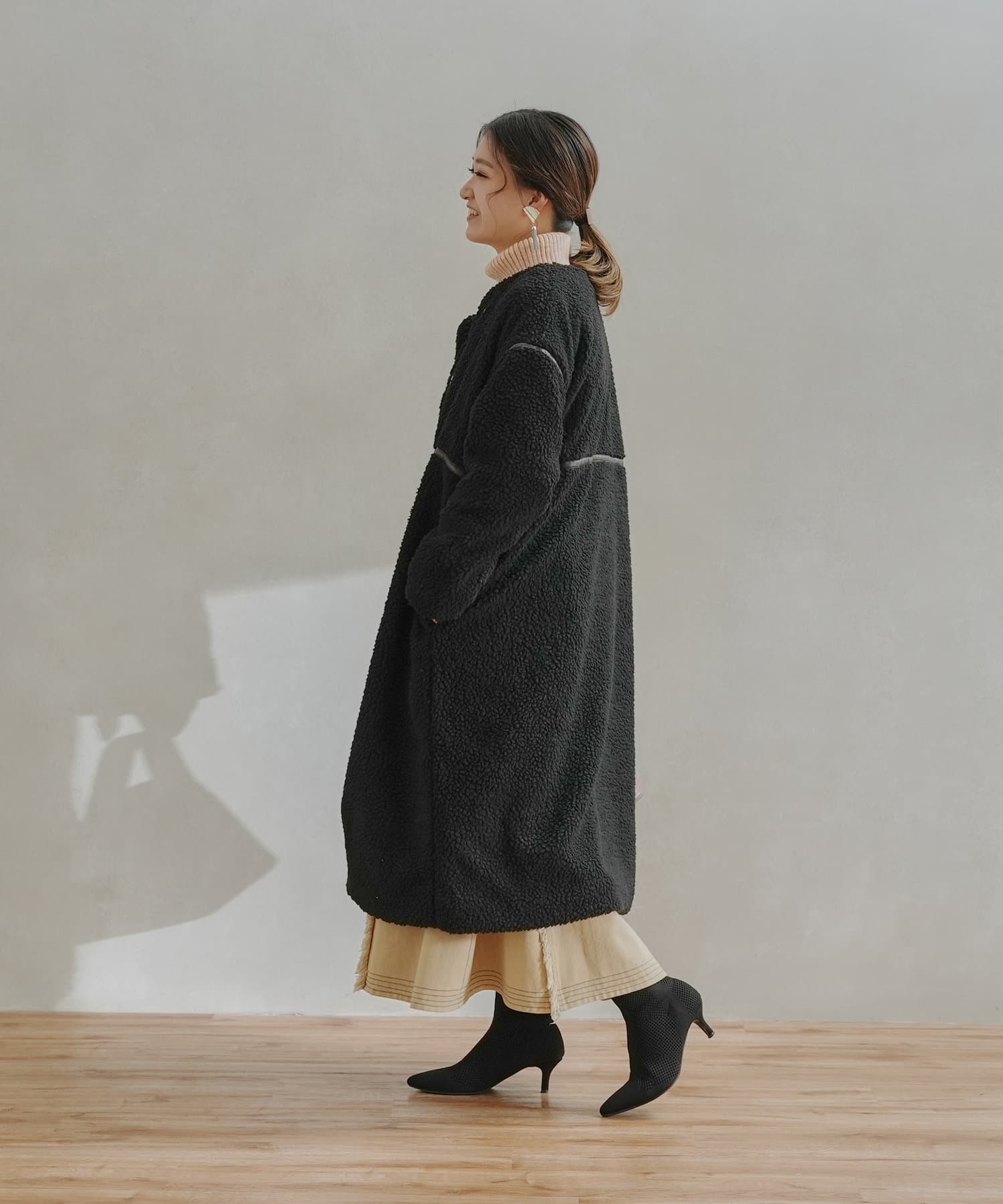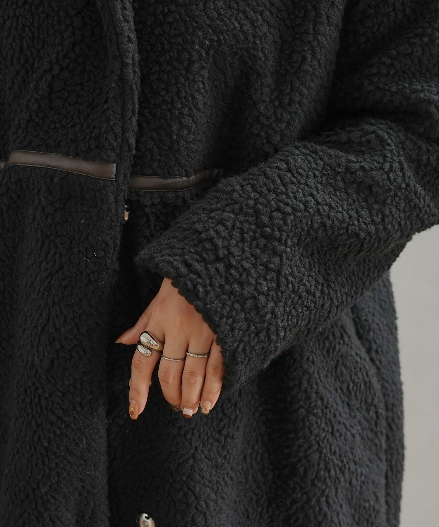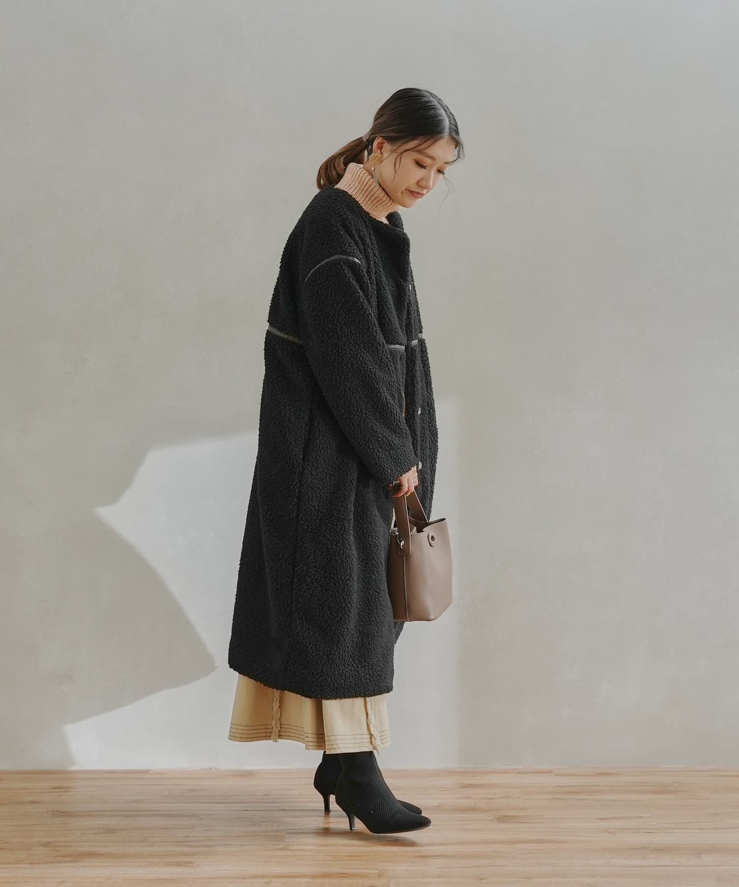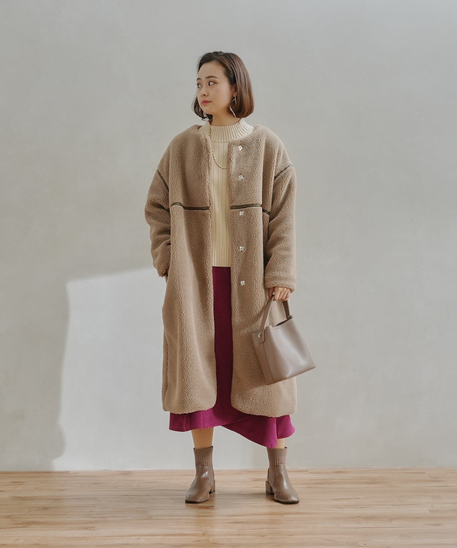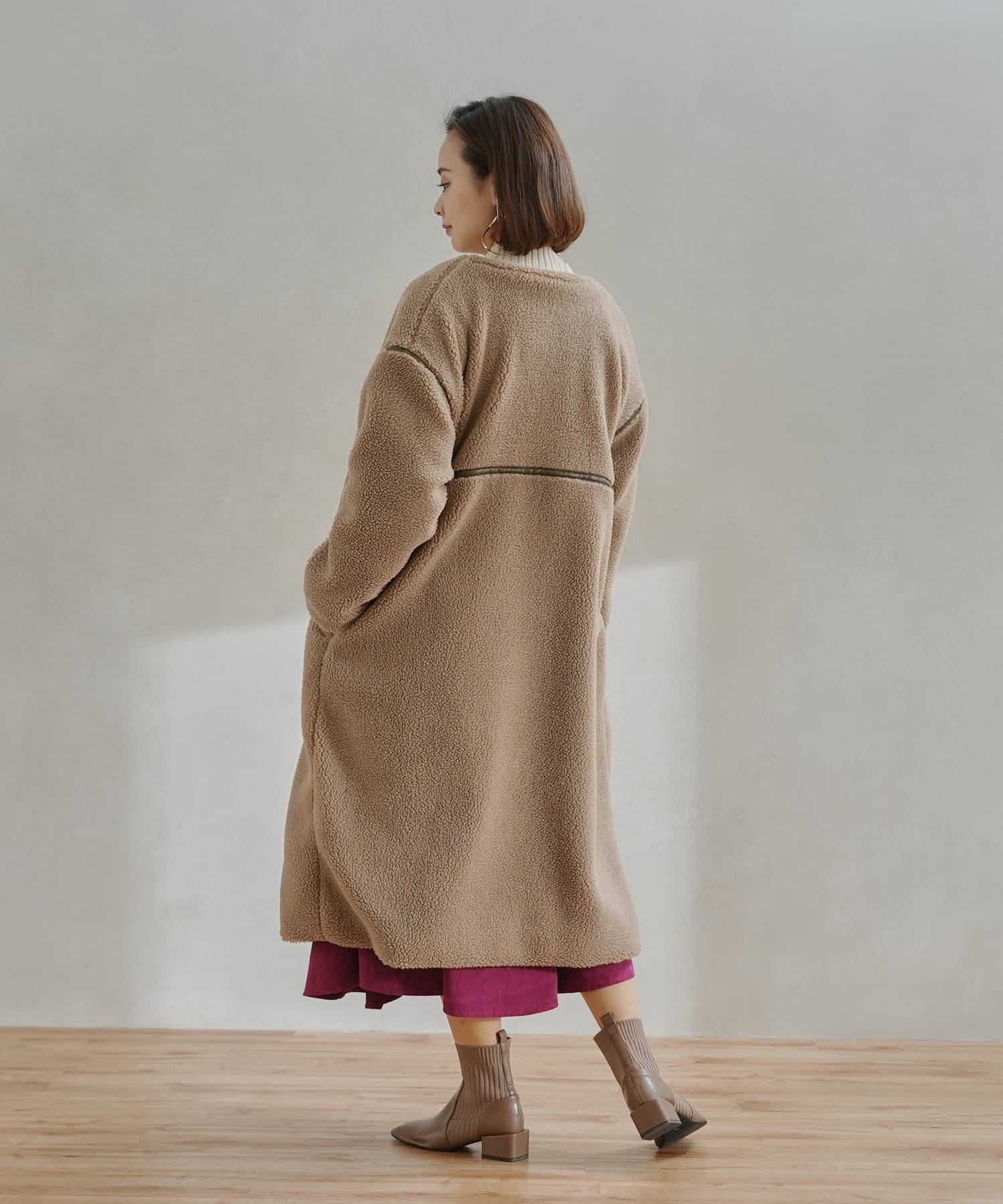 ・パイピングがアクセントになったボアコート。ゆったりしたシルエットなので