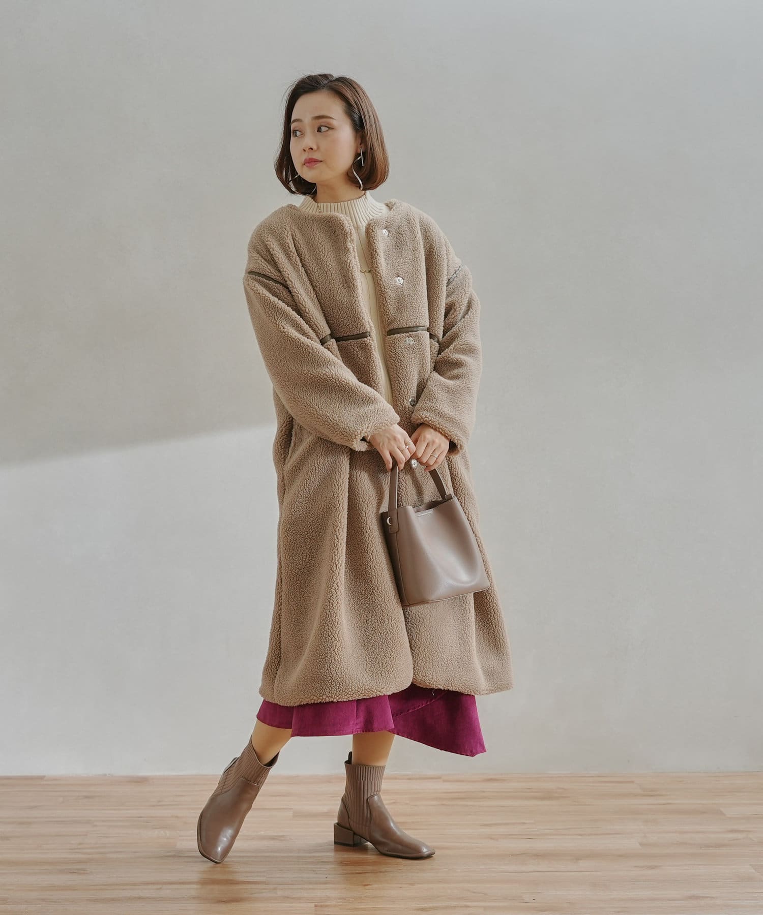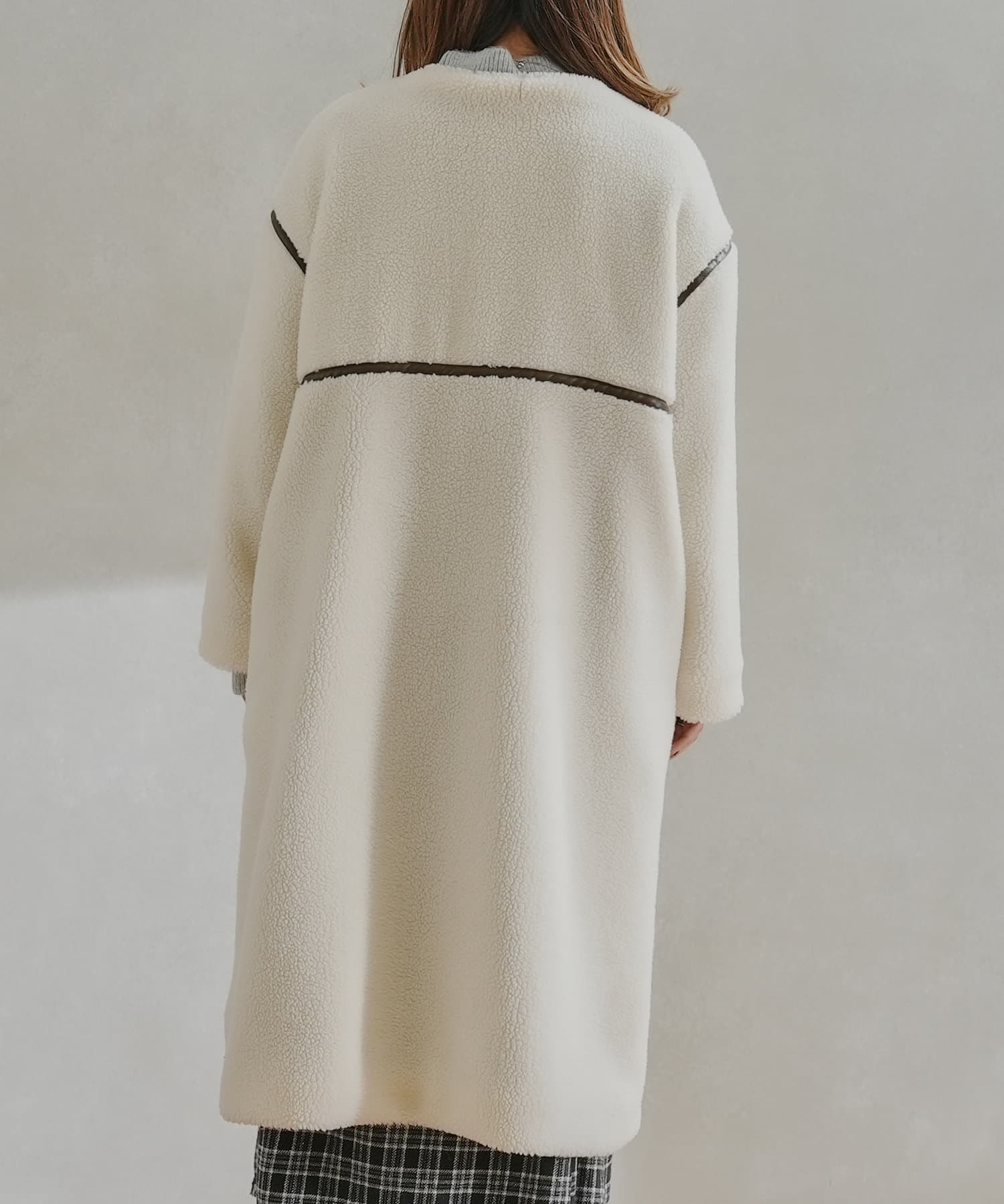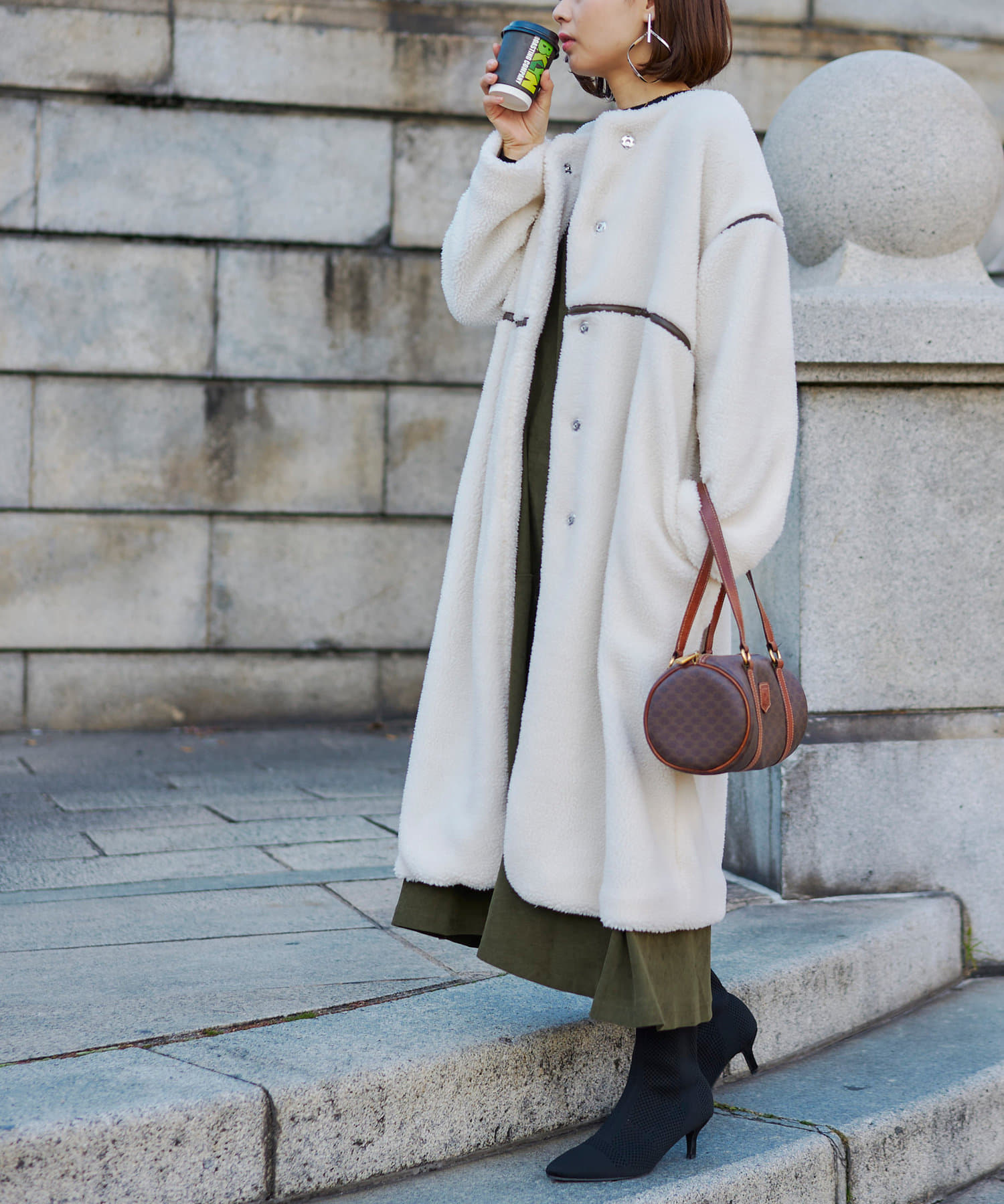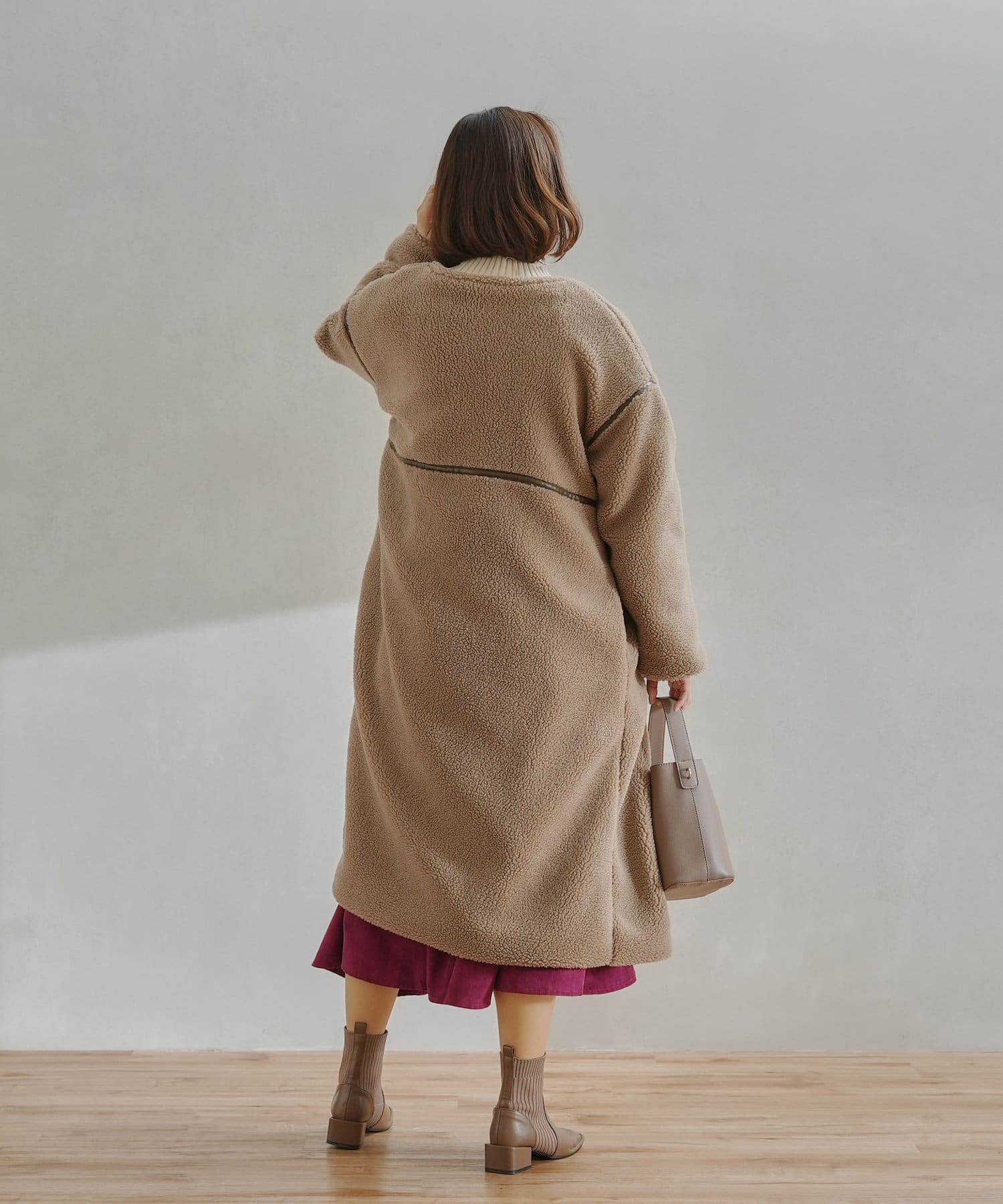 ・パイピングがアクセントになったボアコート。ゆったりしたシルエットなので