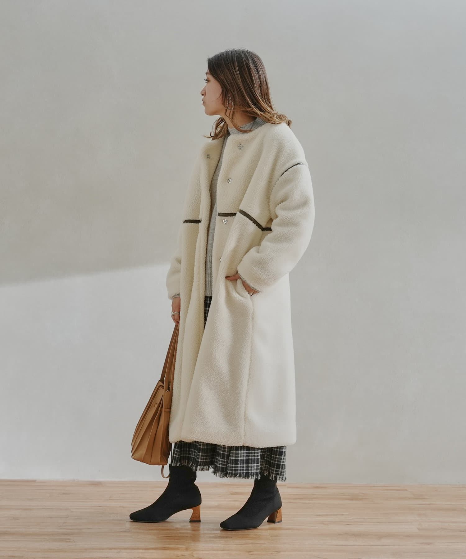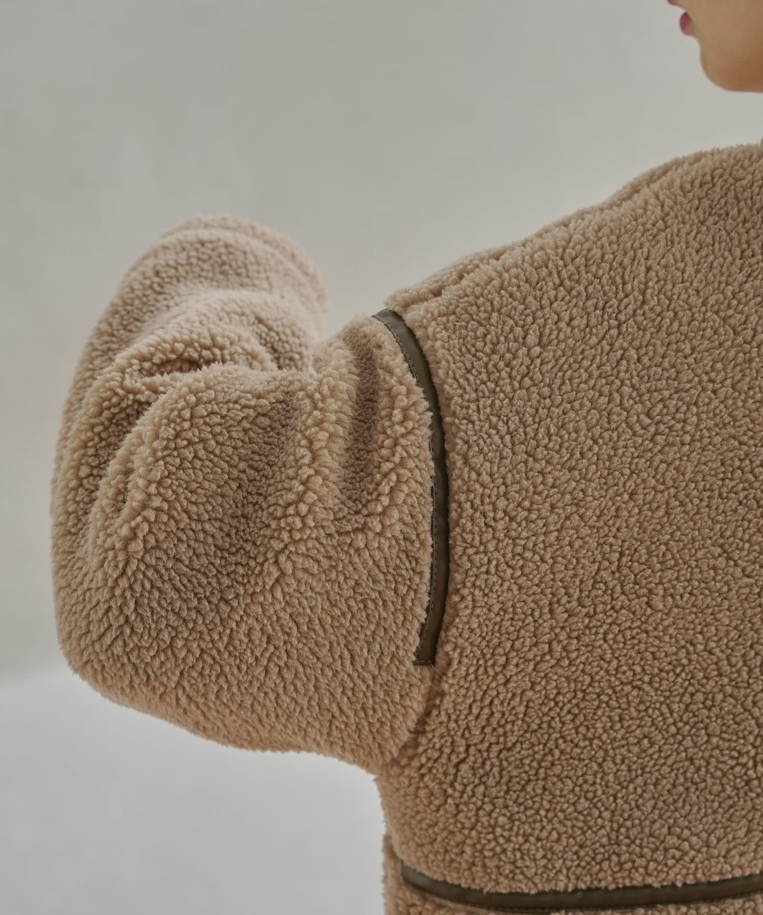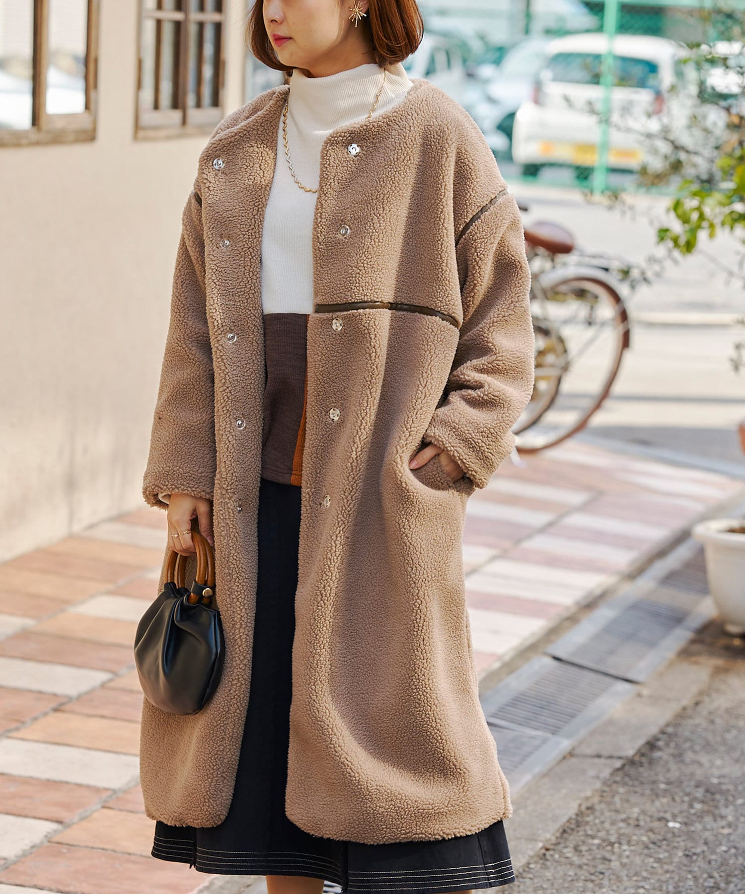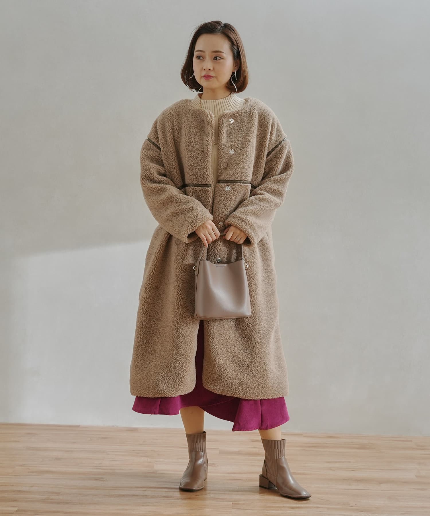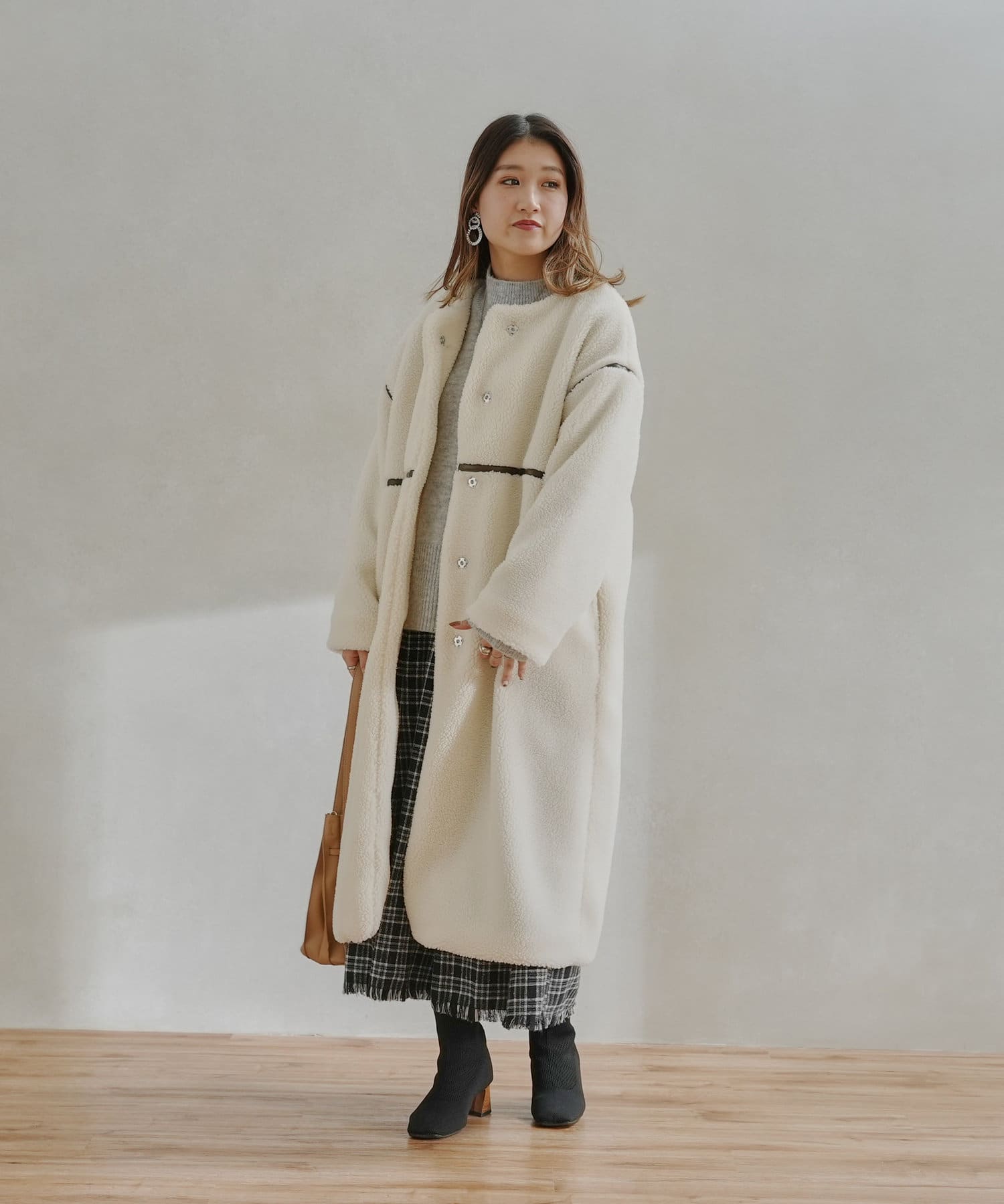 ・パイピングがアクセントになったボアコート。ゆったりしたシルエットなので