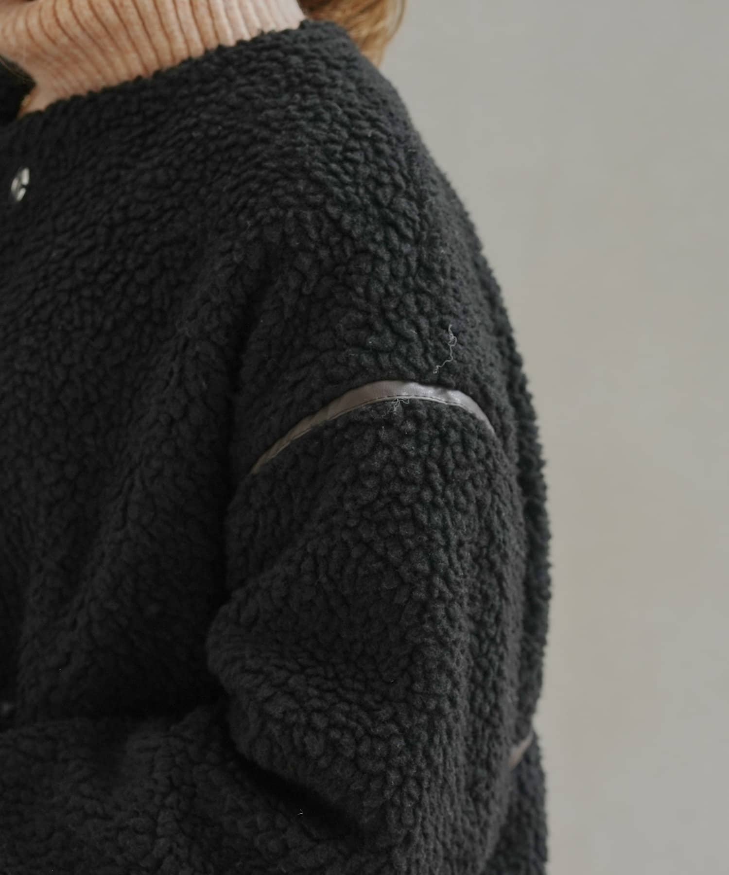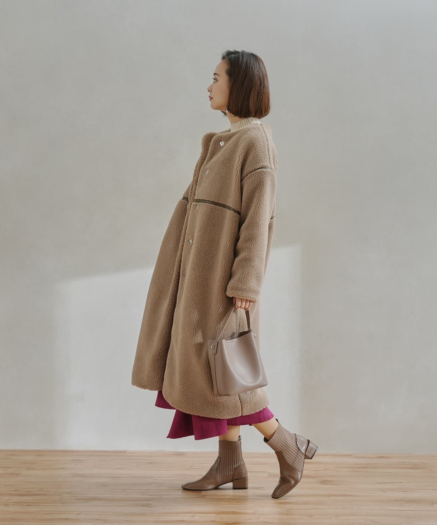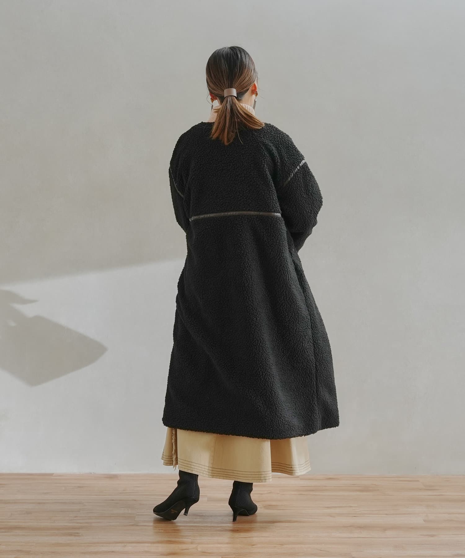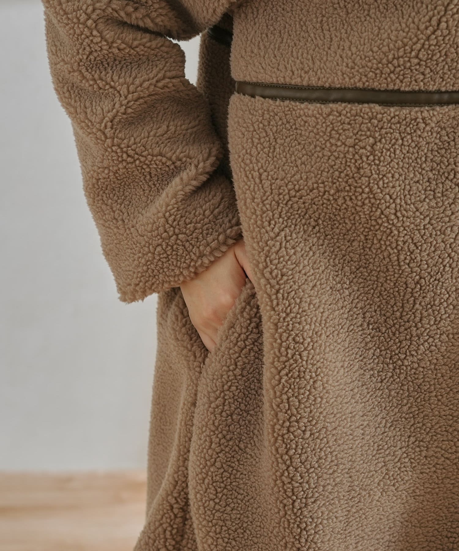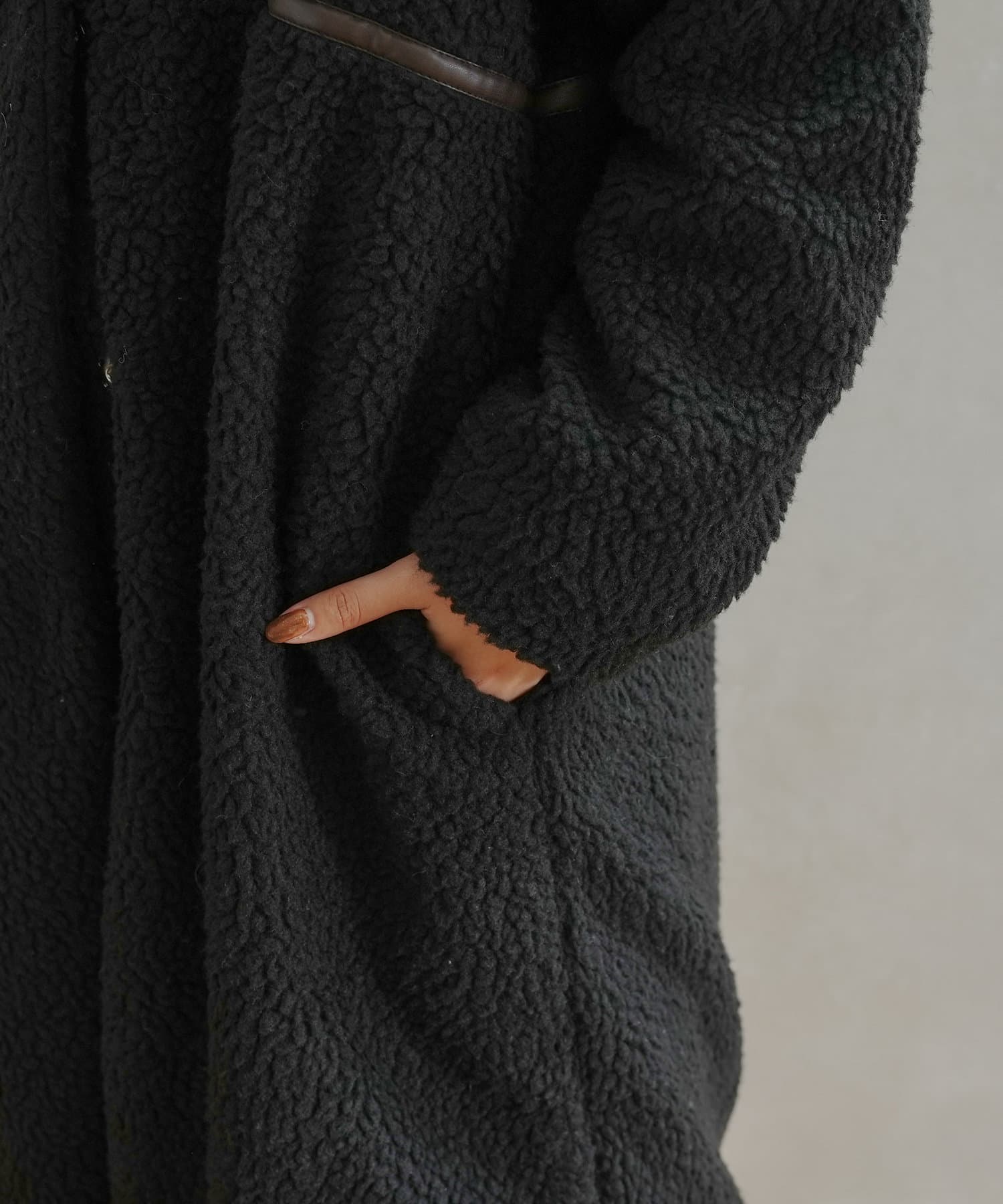 ・パイピングがアクセントになったボアコート。ゆったりしたシルエットなので