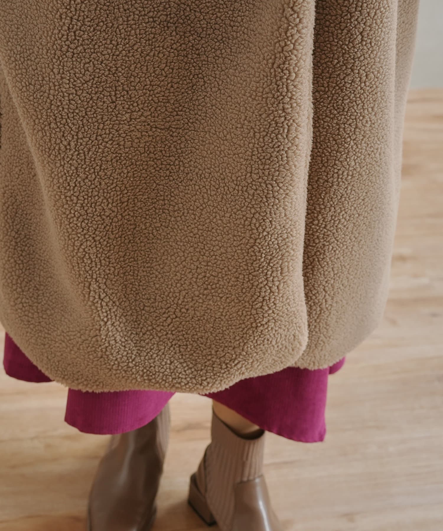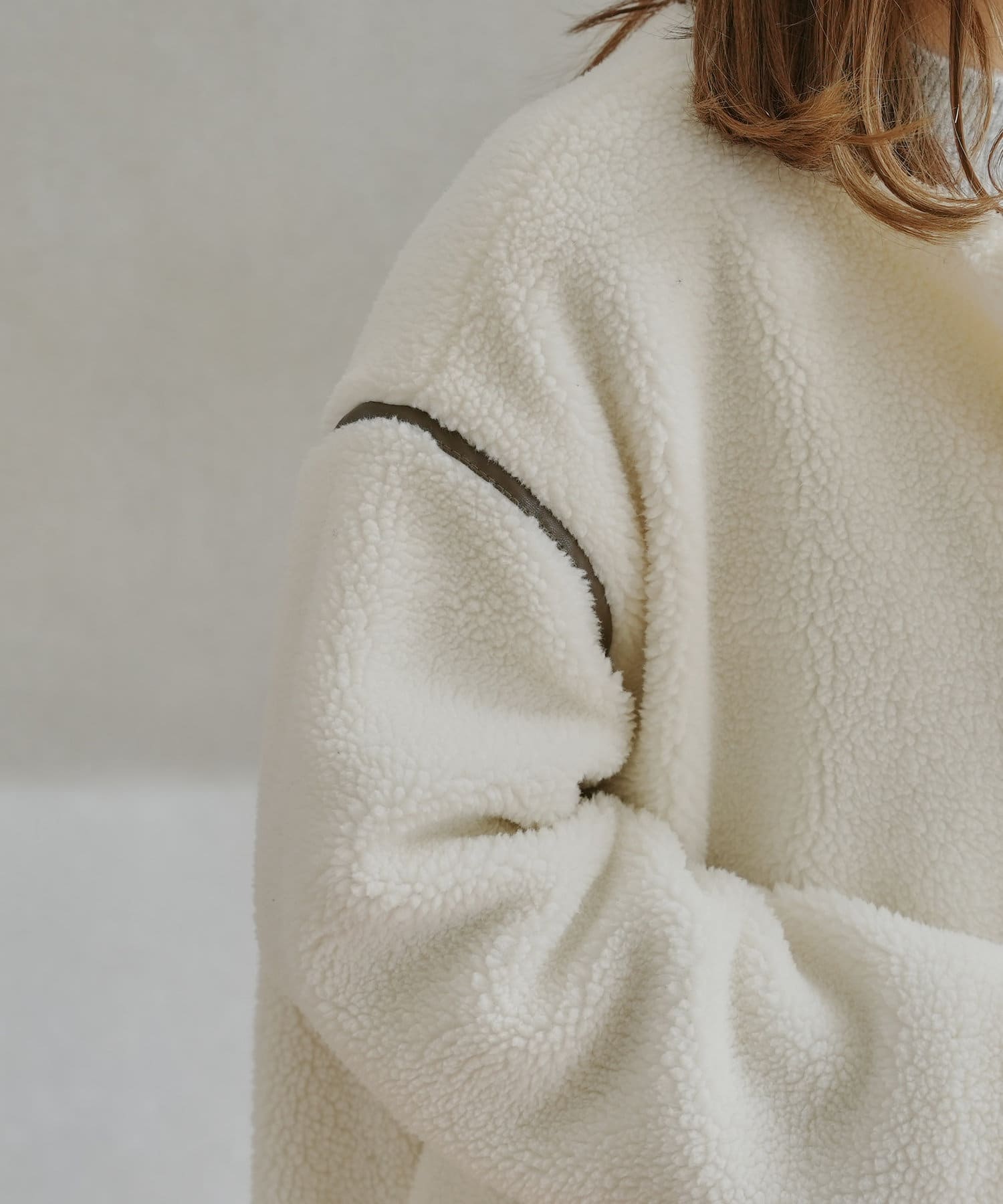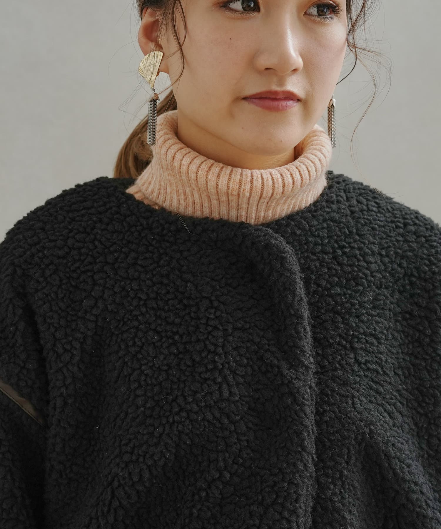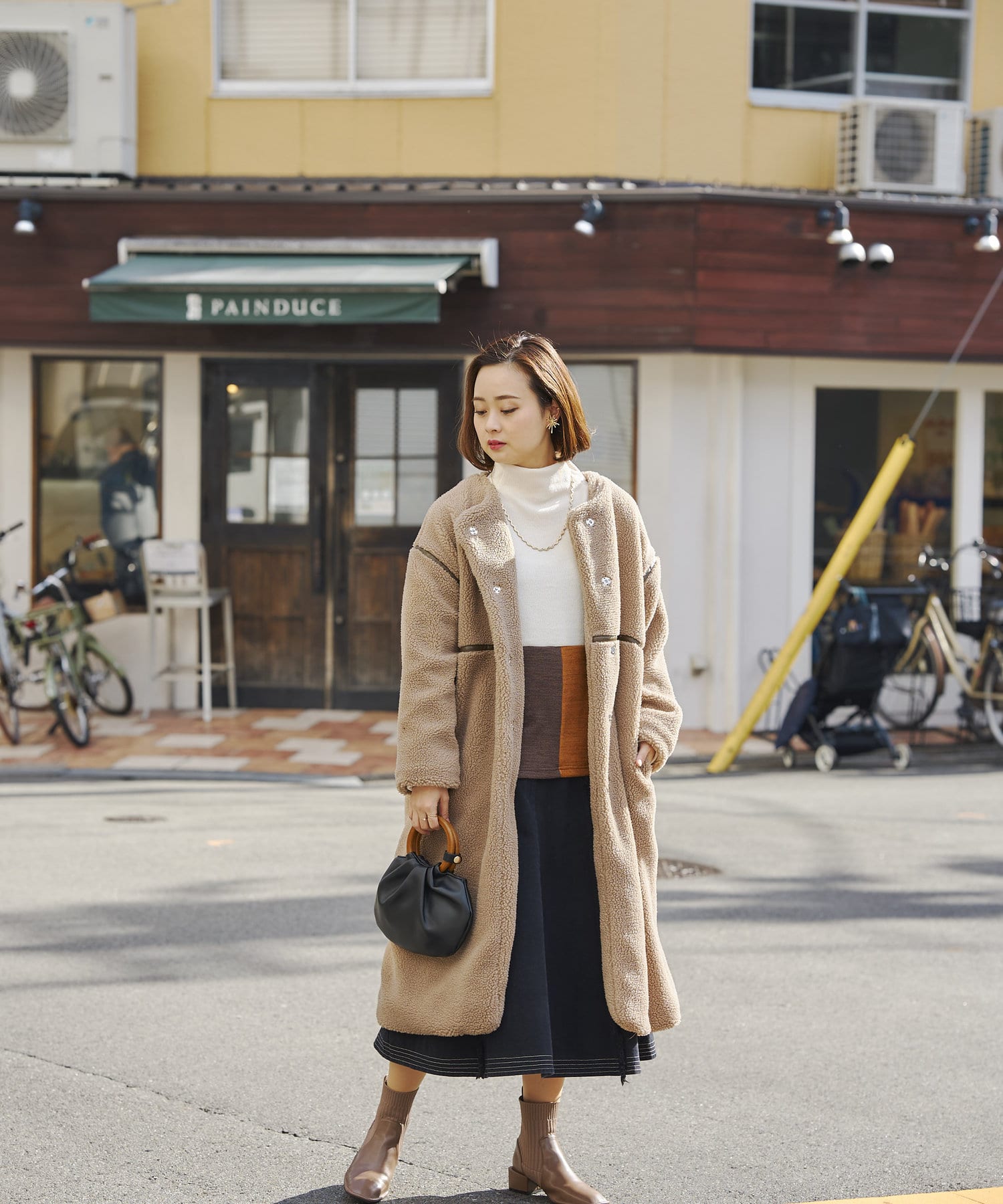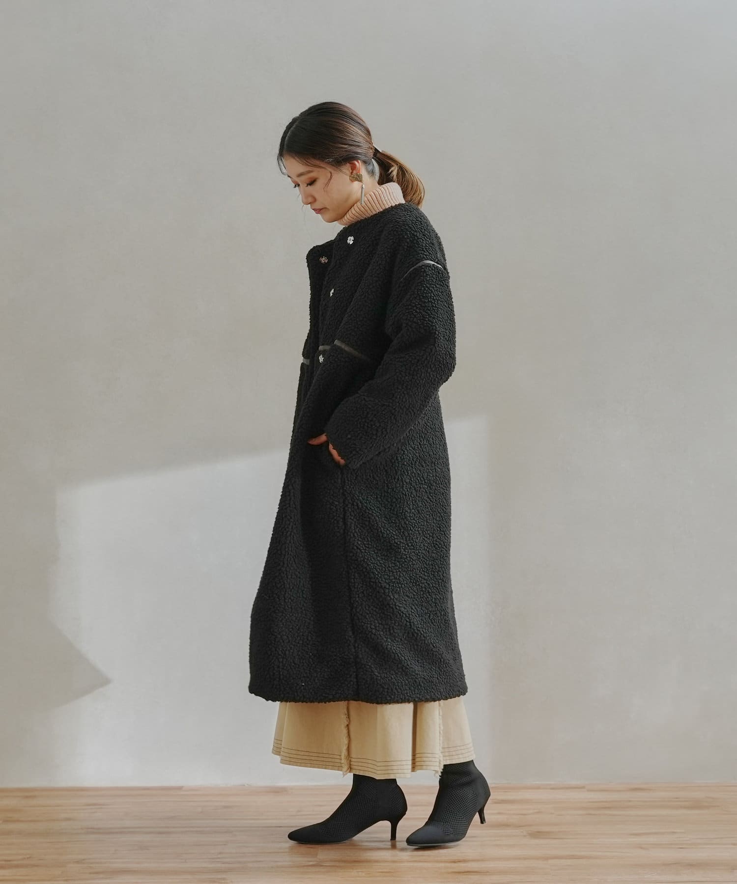・パイピングがアクセントになったボアコート。ゆったりしたシルエットなので
