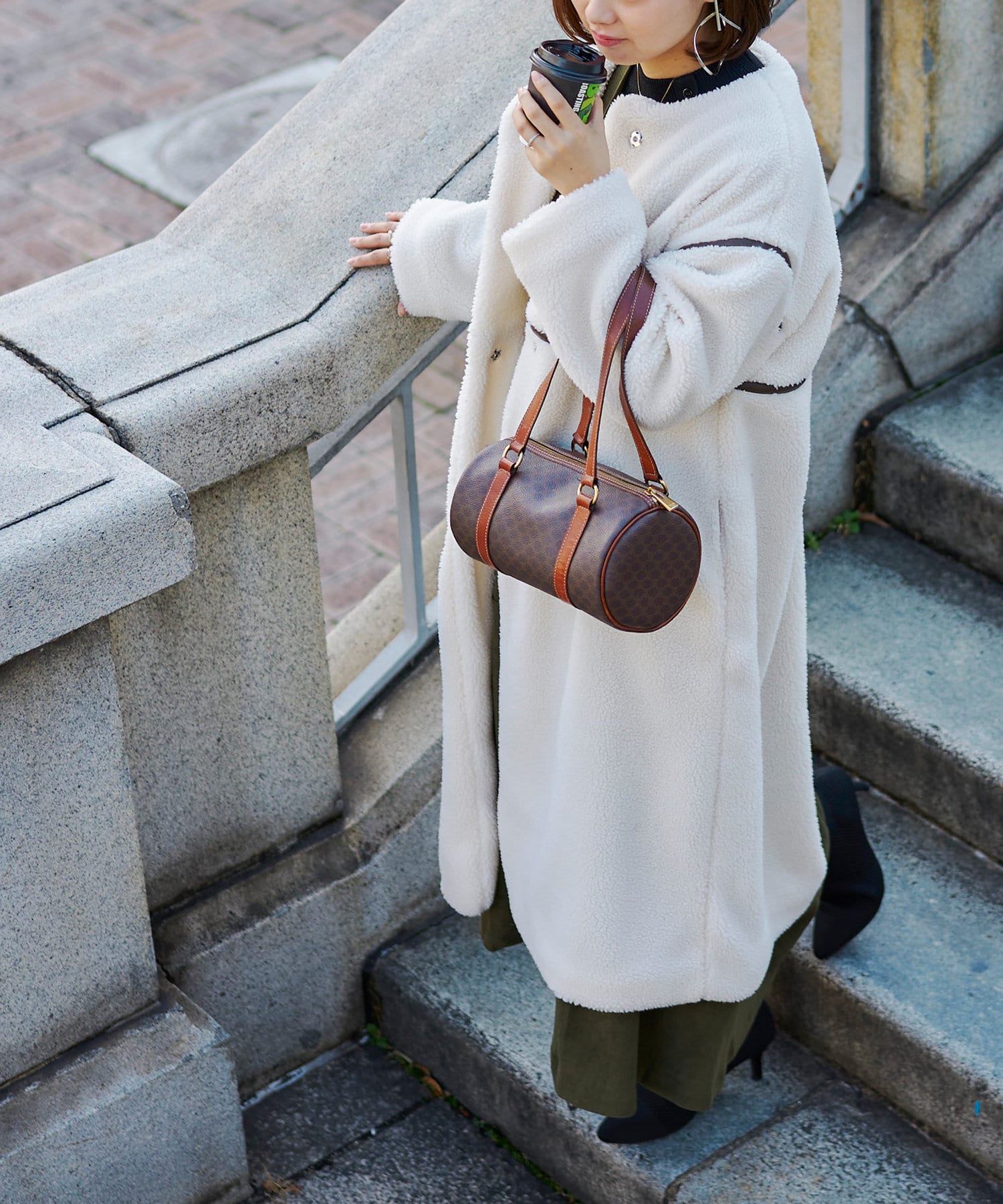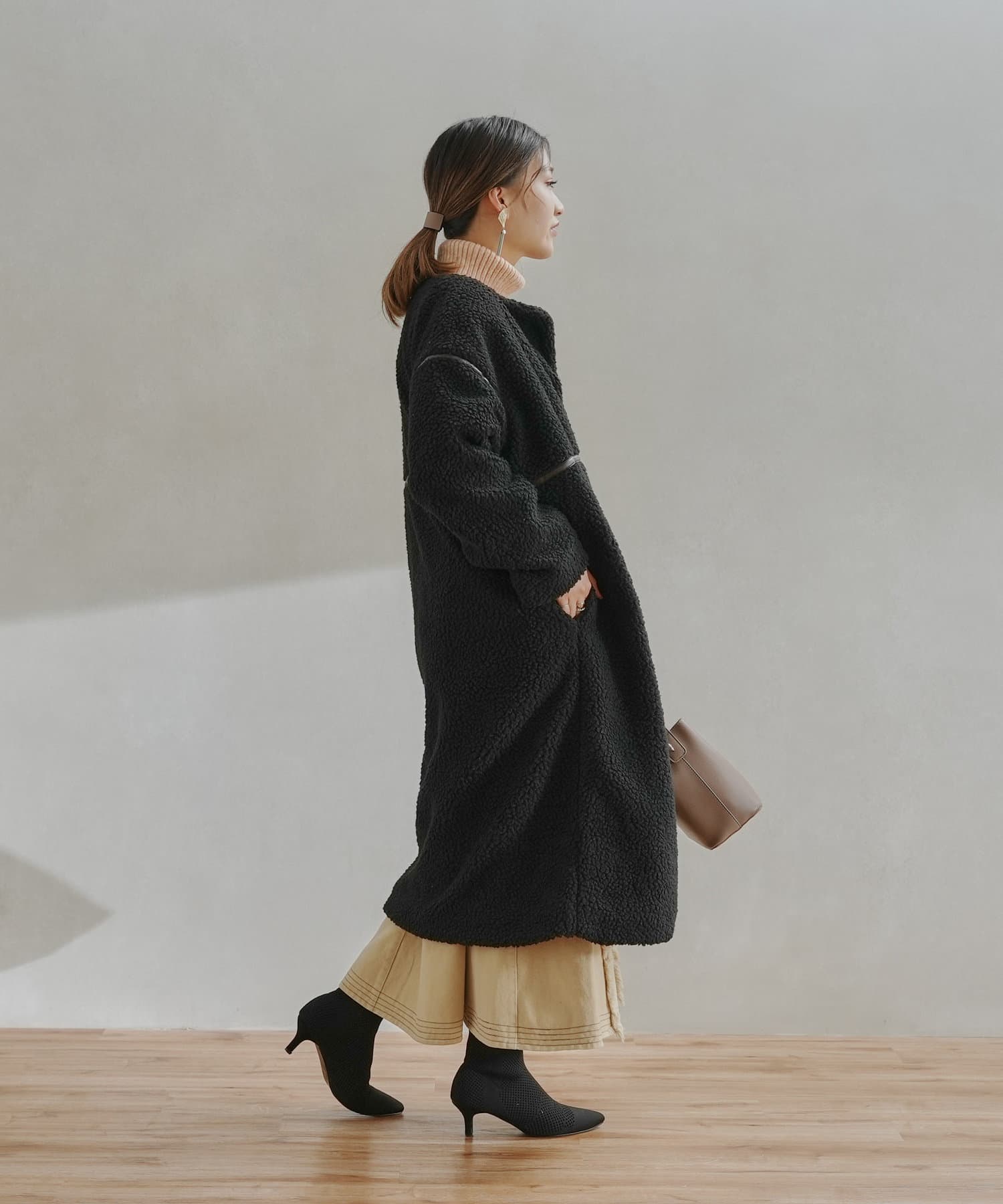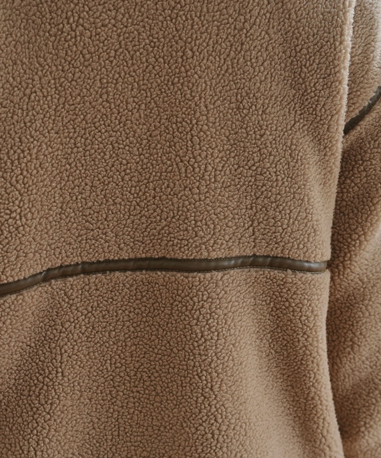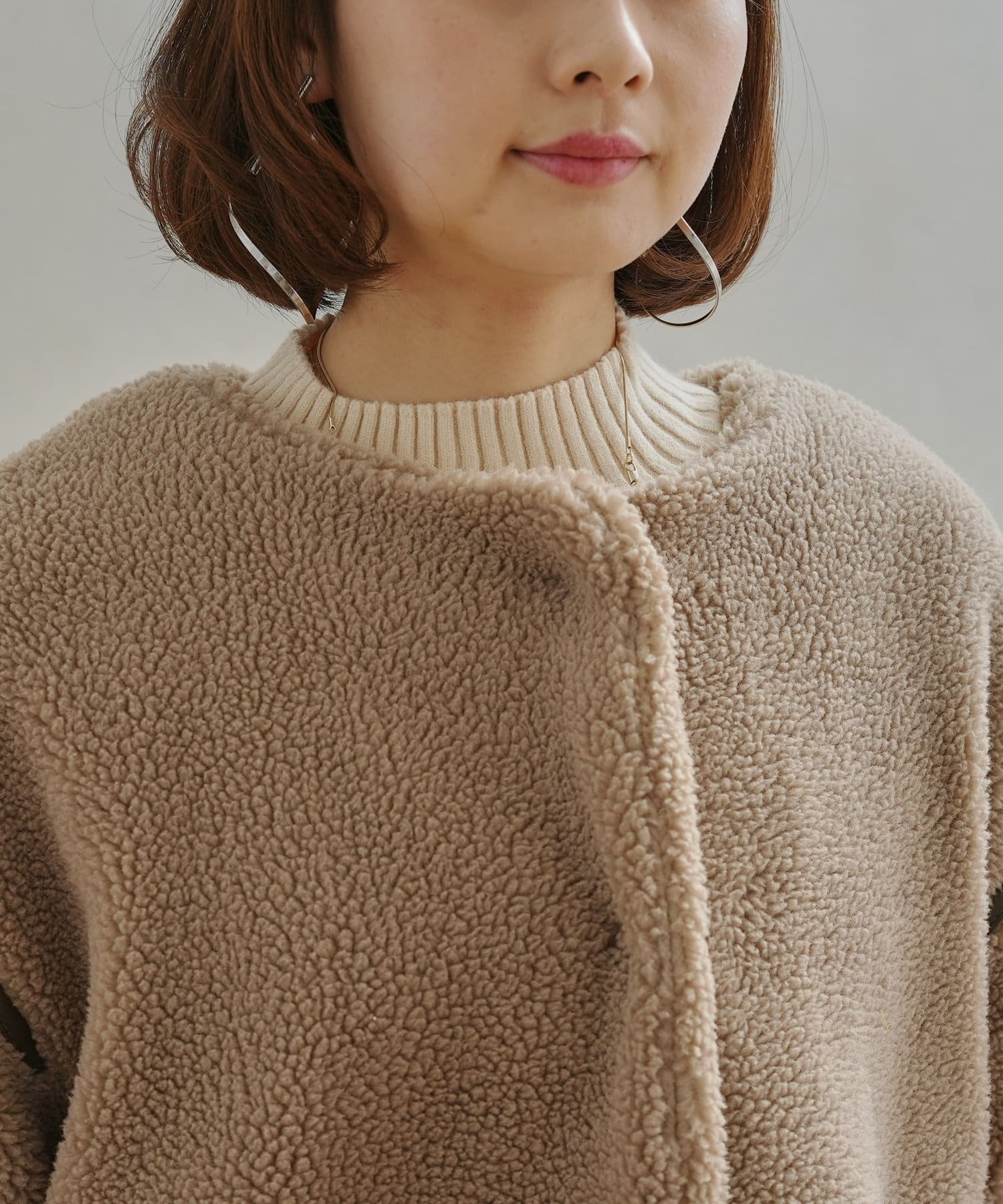 ・パイピングがアクセントになったボアコート。ゆったりしたシルエットなので