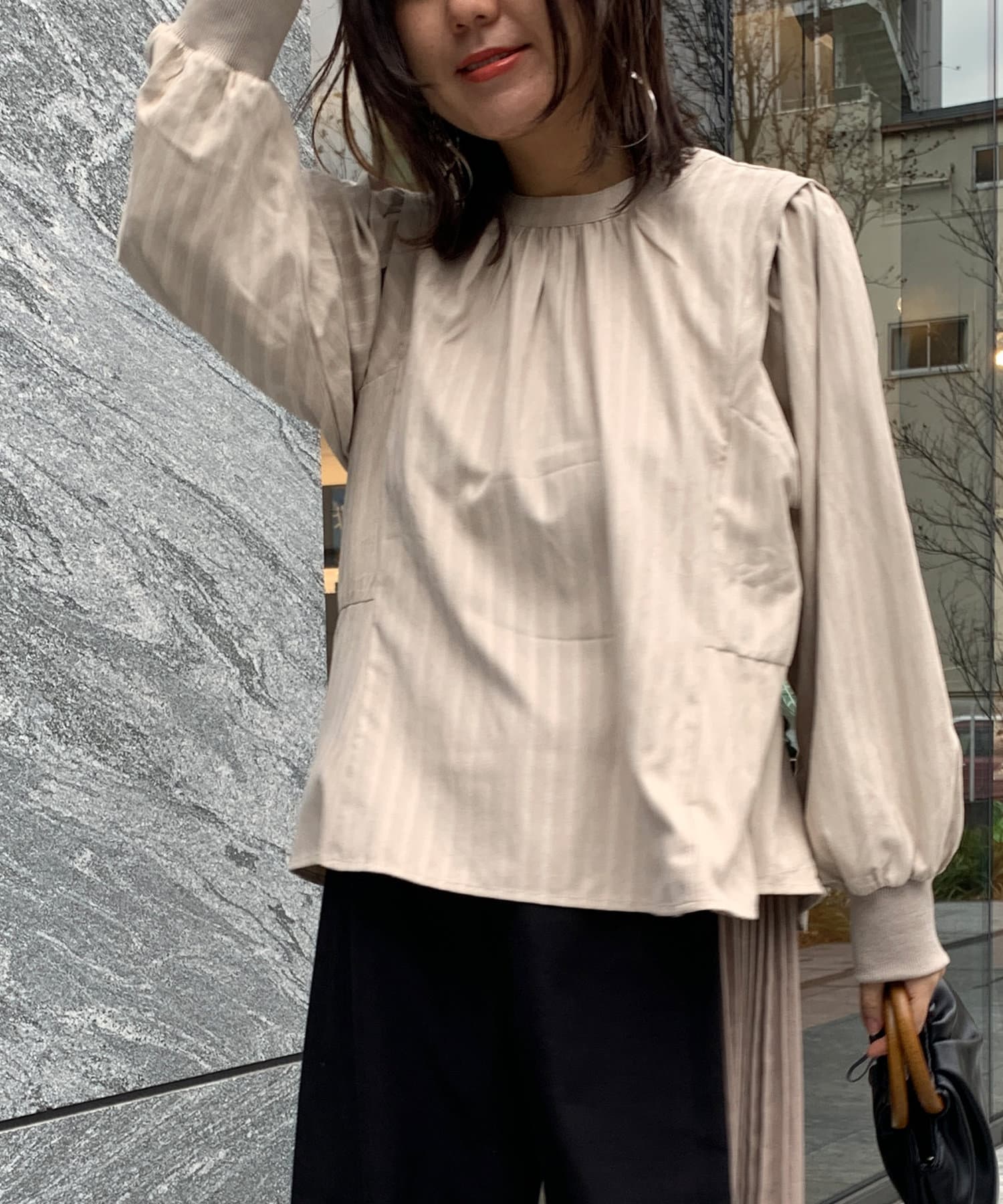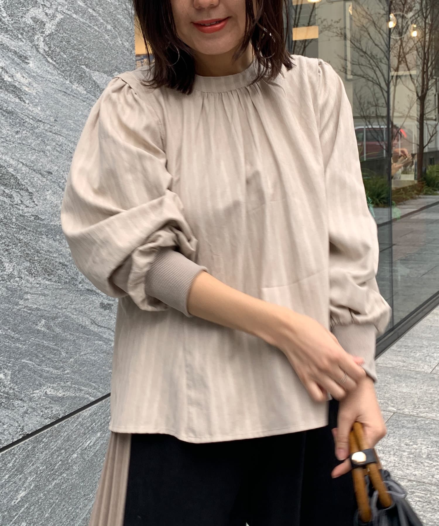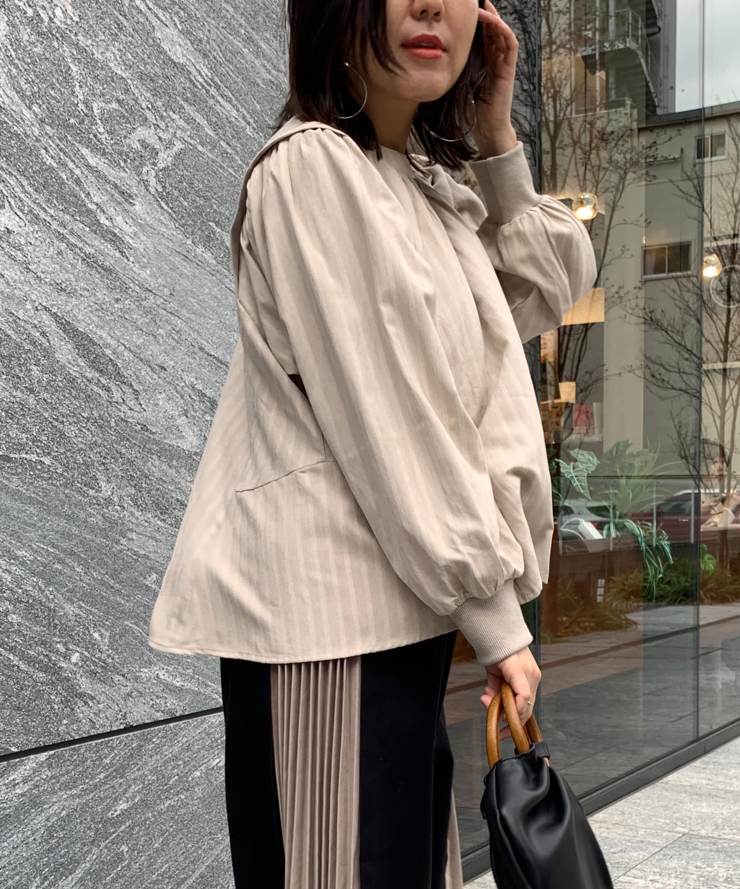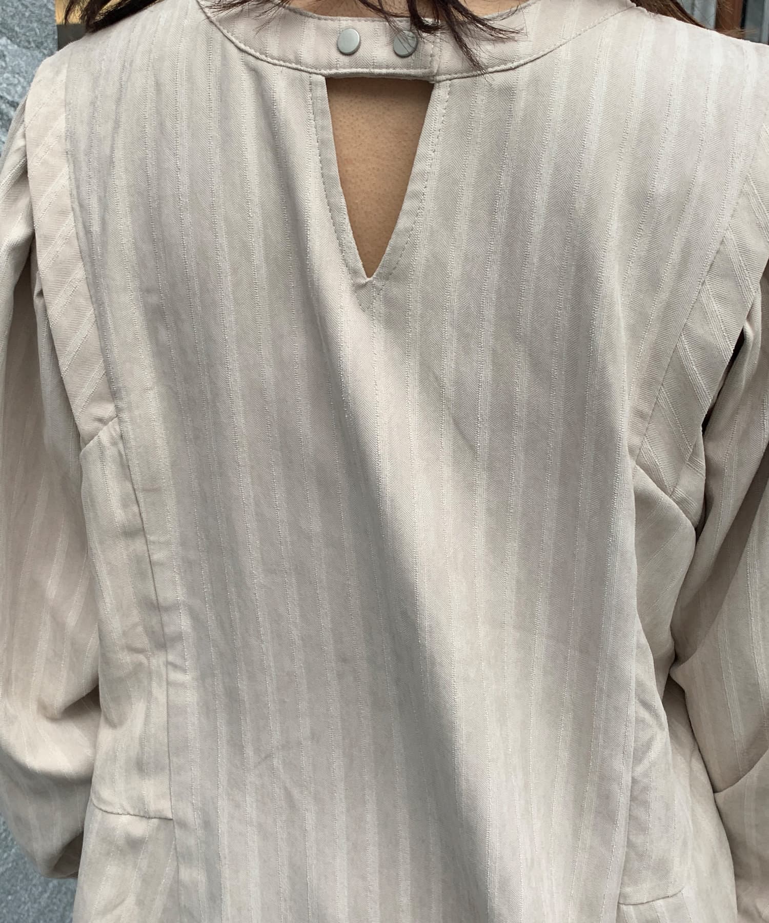 シア―ストライプ×ショルダータックのディテールがオトナのフェミニンさを