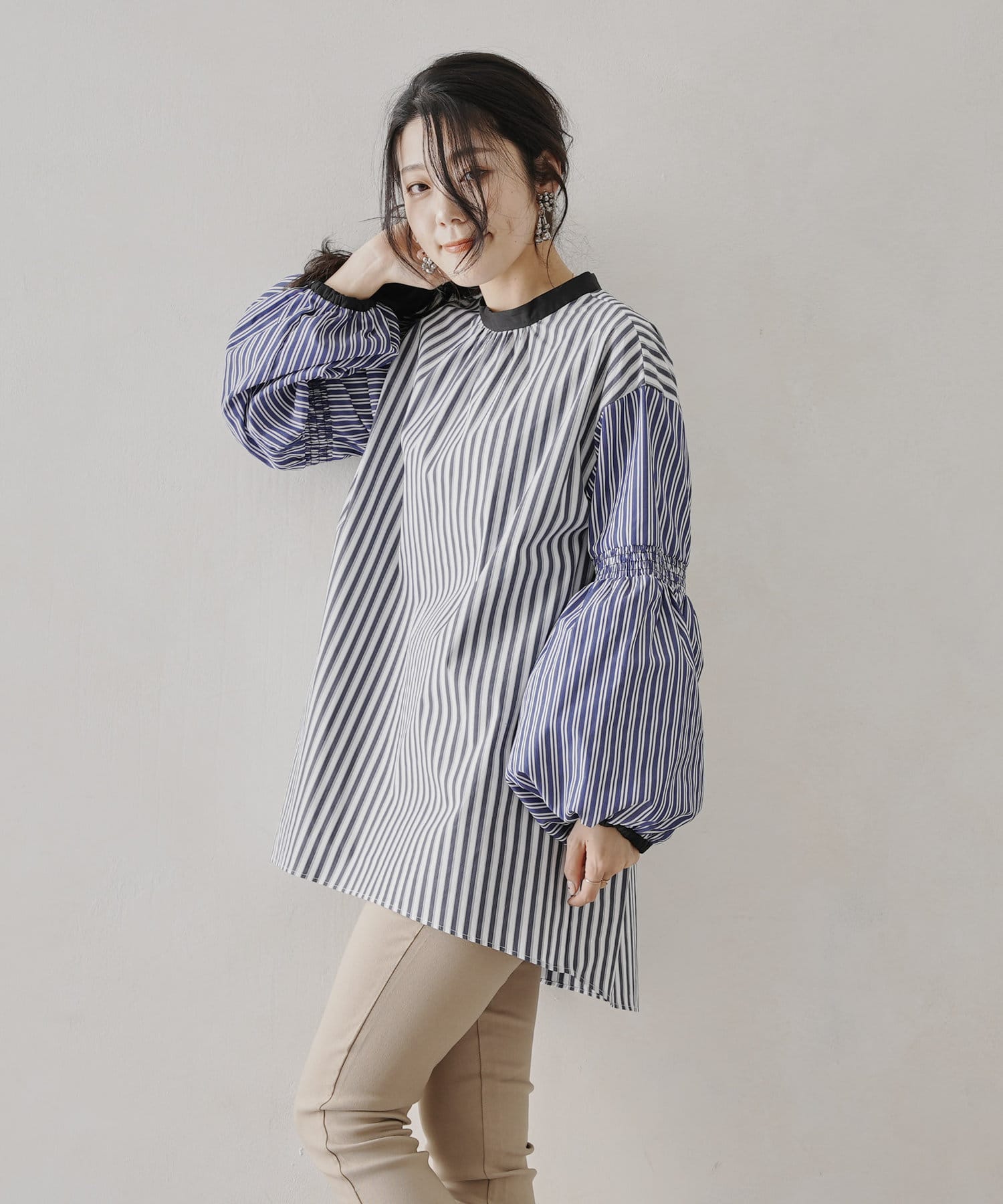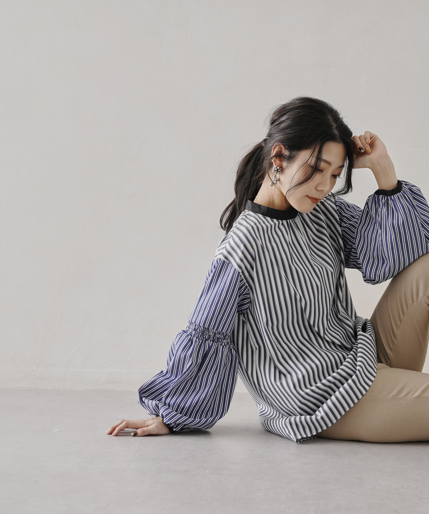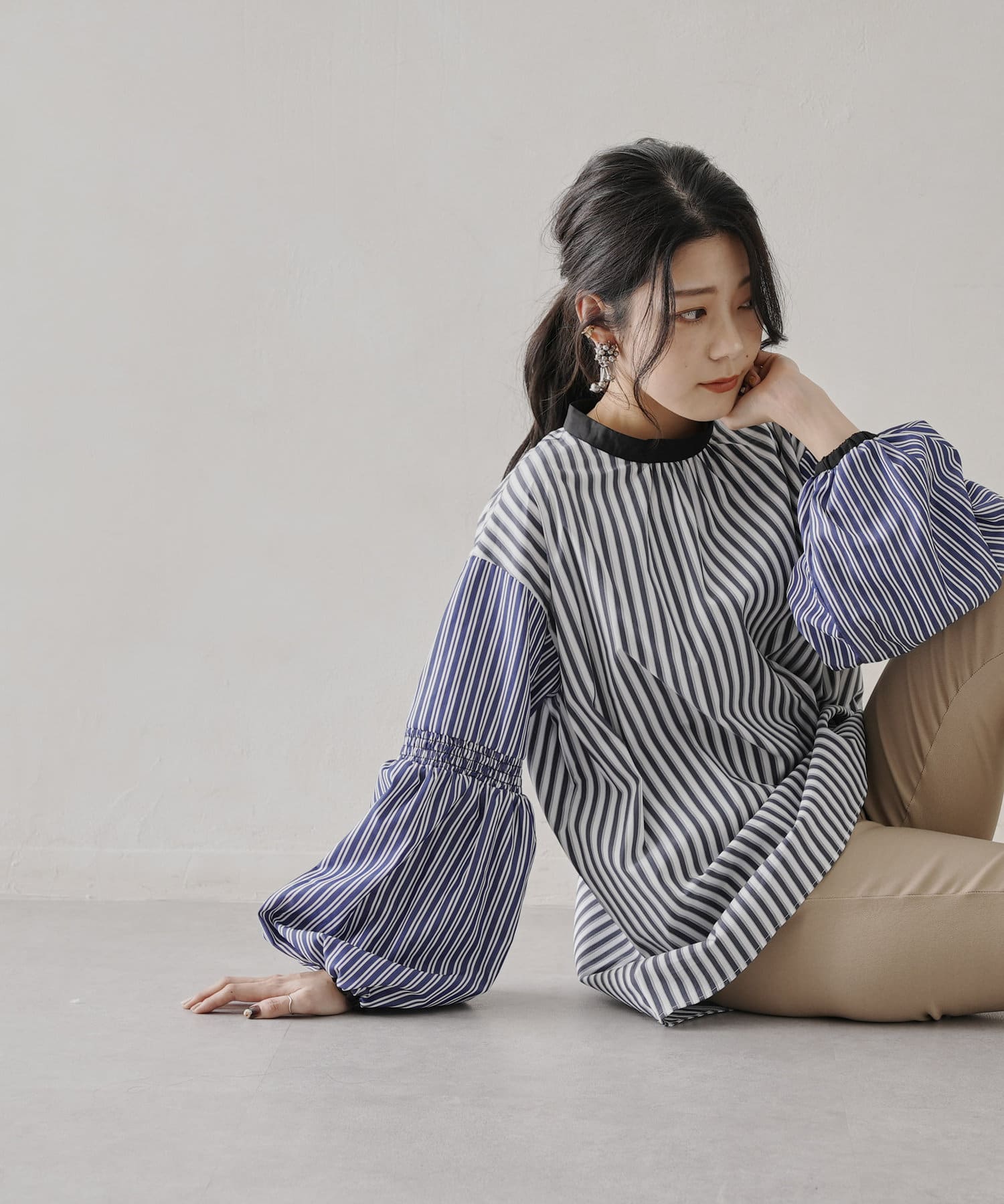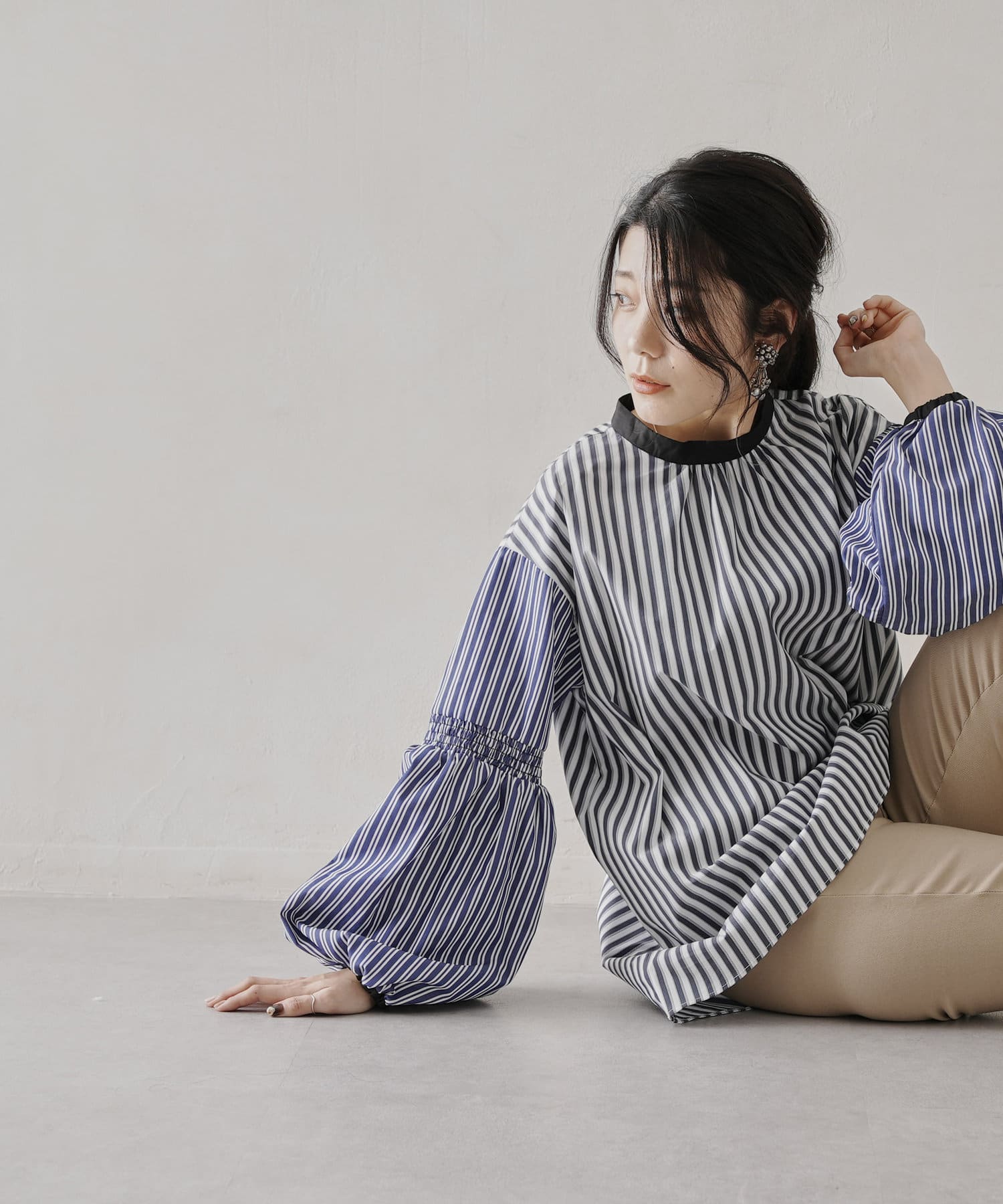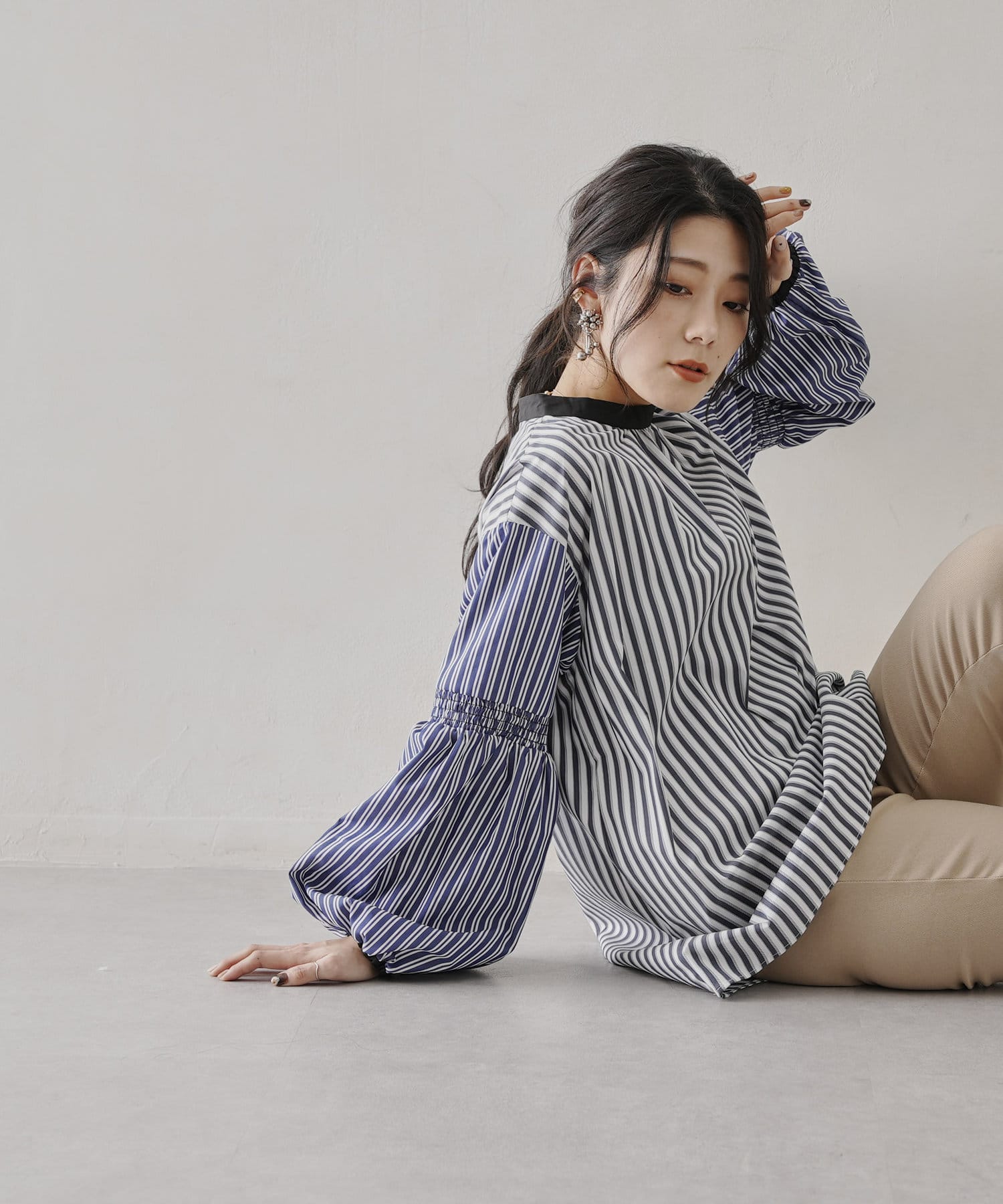 袖のシャーリングとストライプのパッチワークデザインが着るだけでオシャレ見えが叶う1着