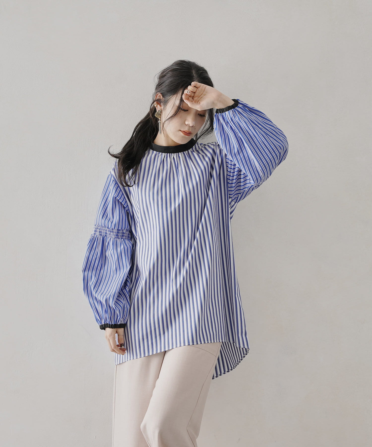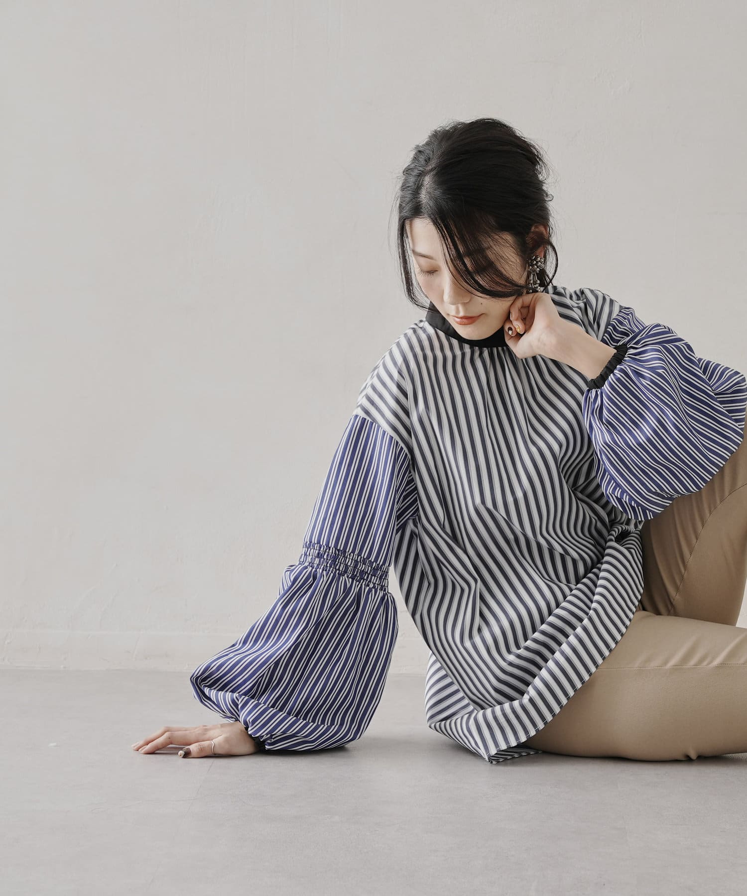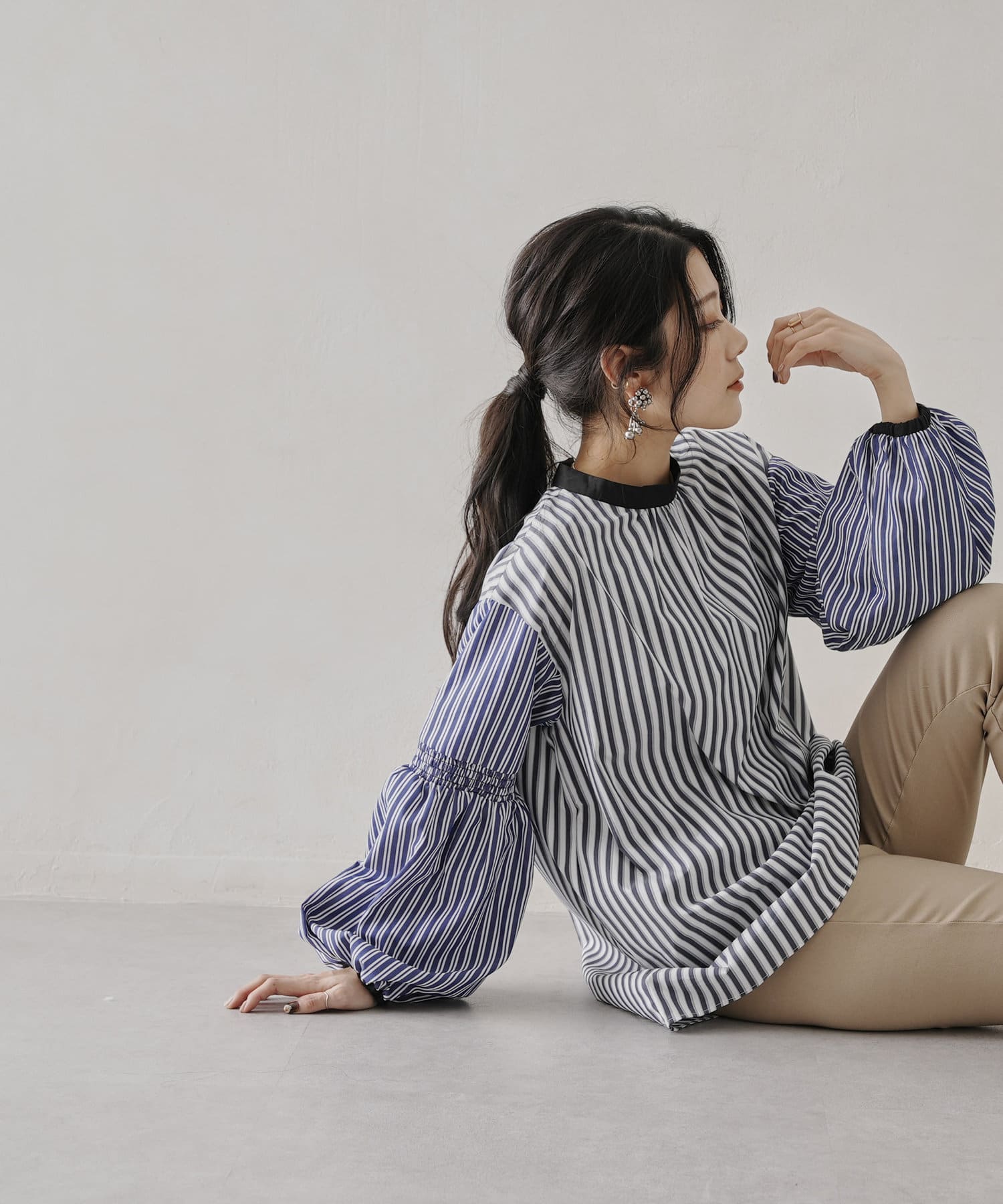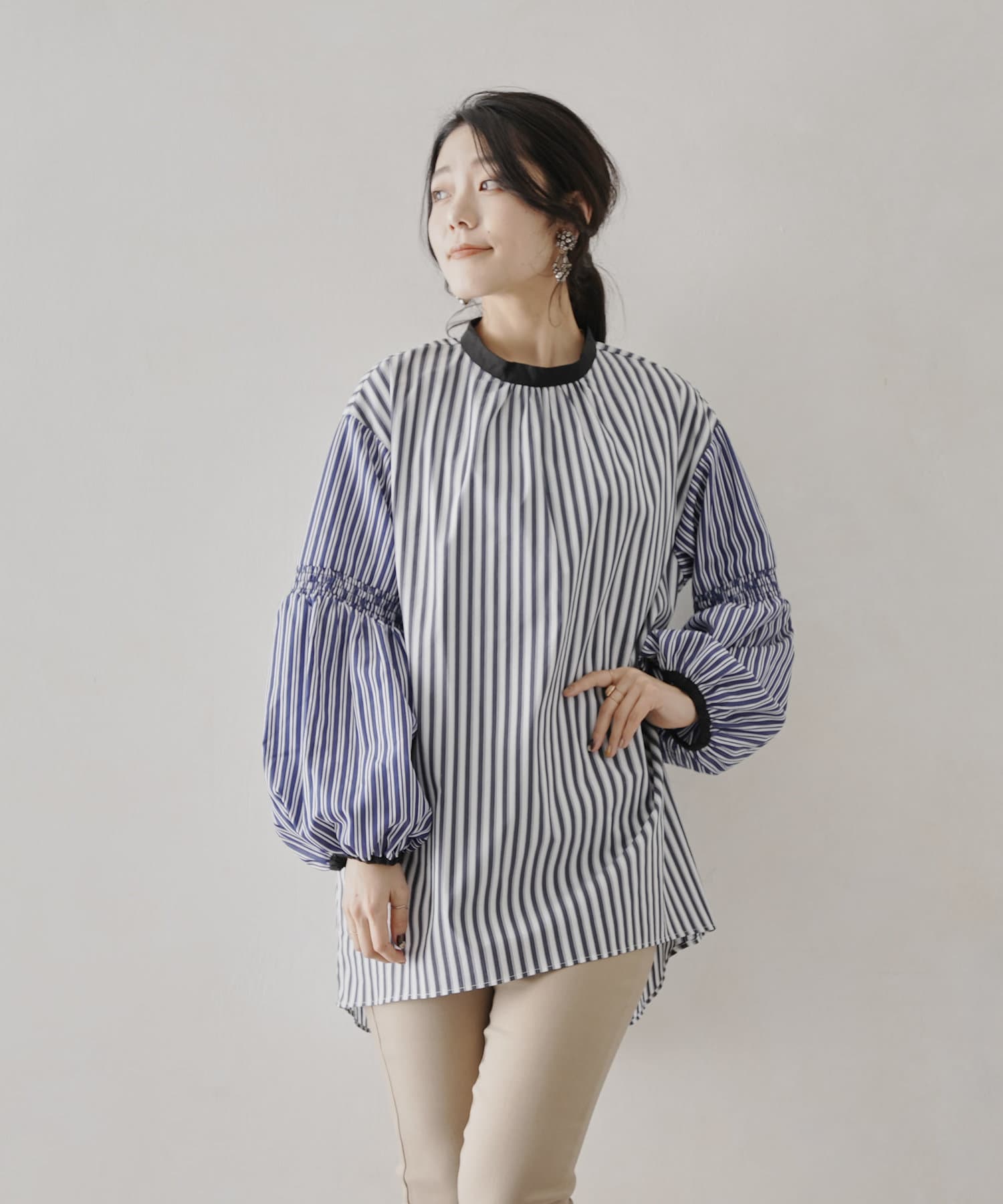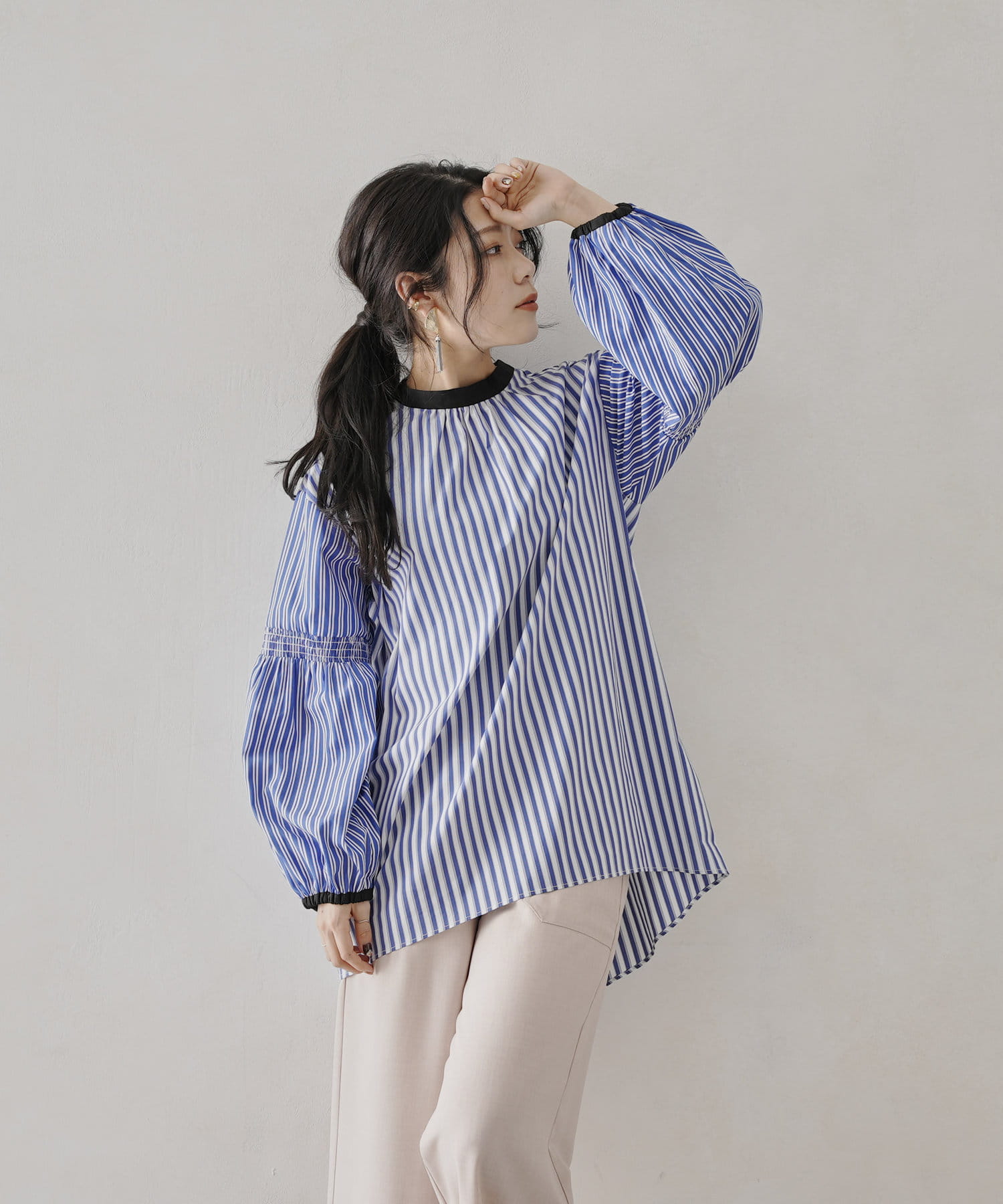 袖のシャーリングとストライプのパッチワークデザインが着るだけでオシャレ見えが叶う1着