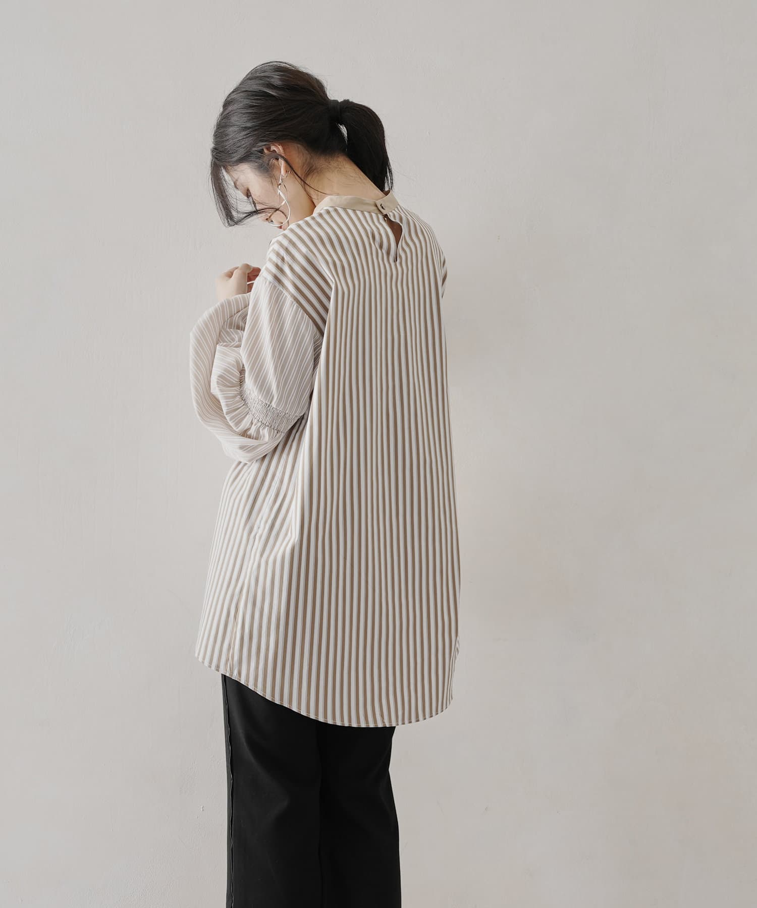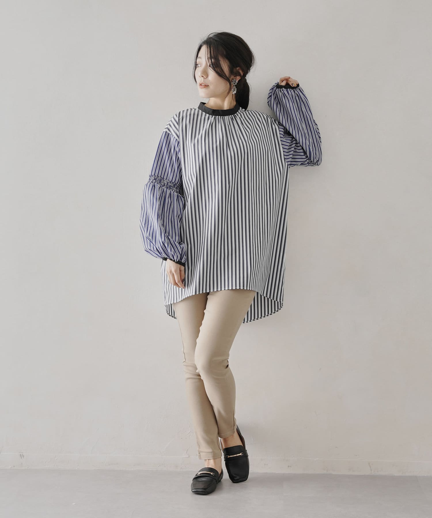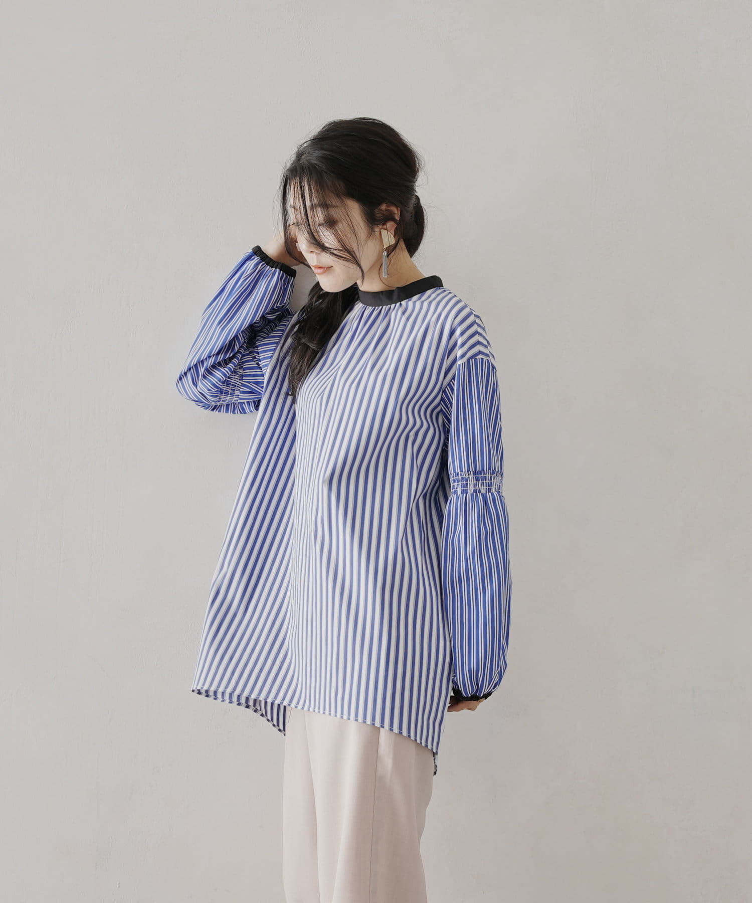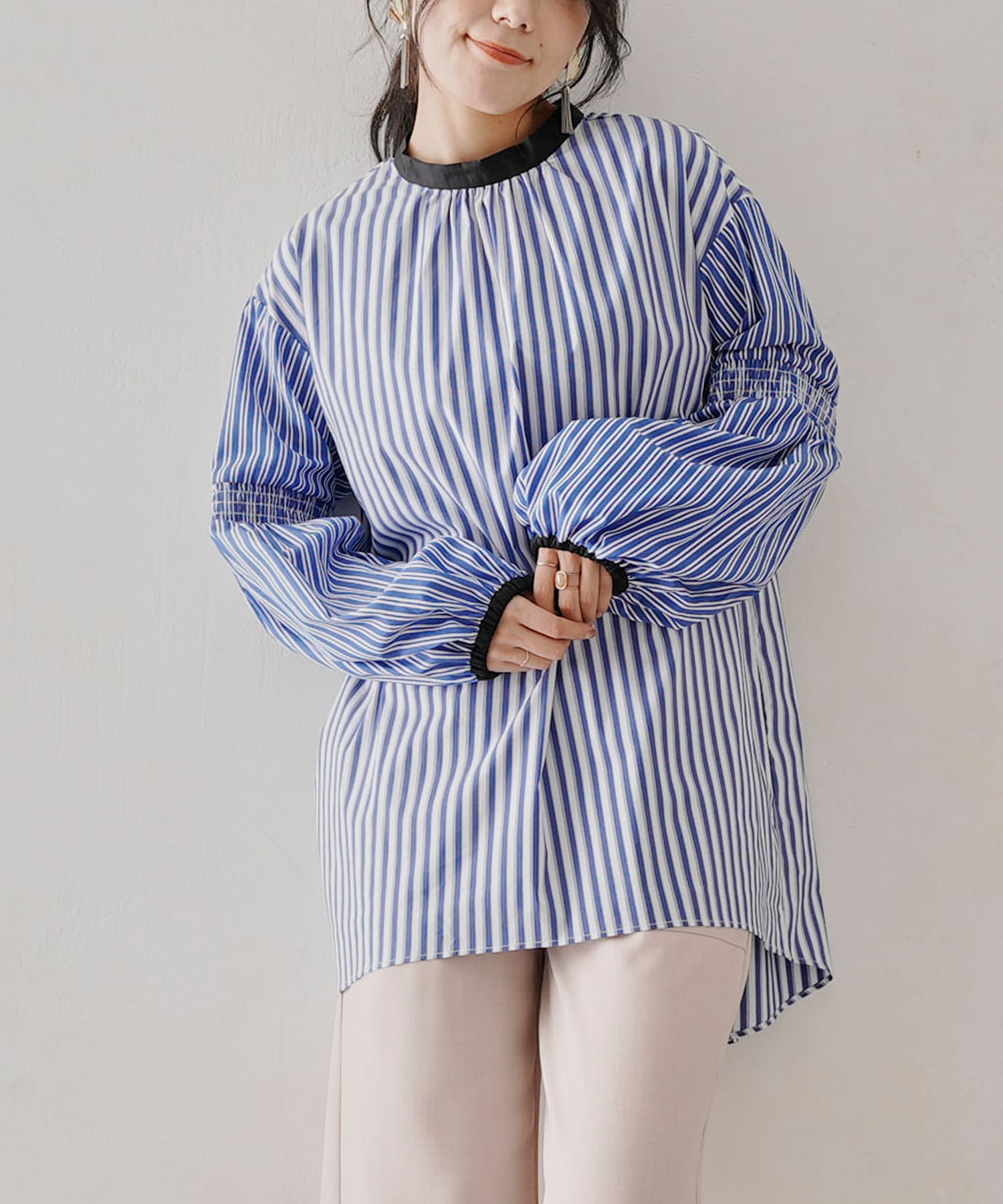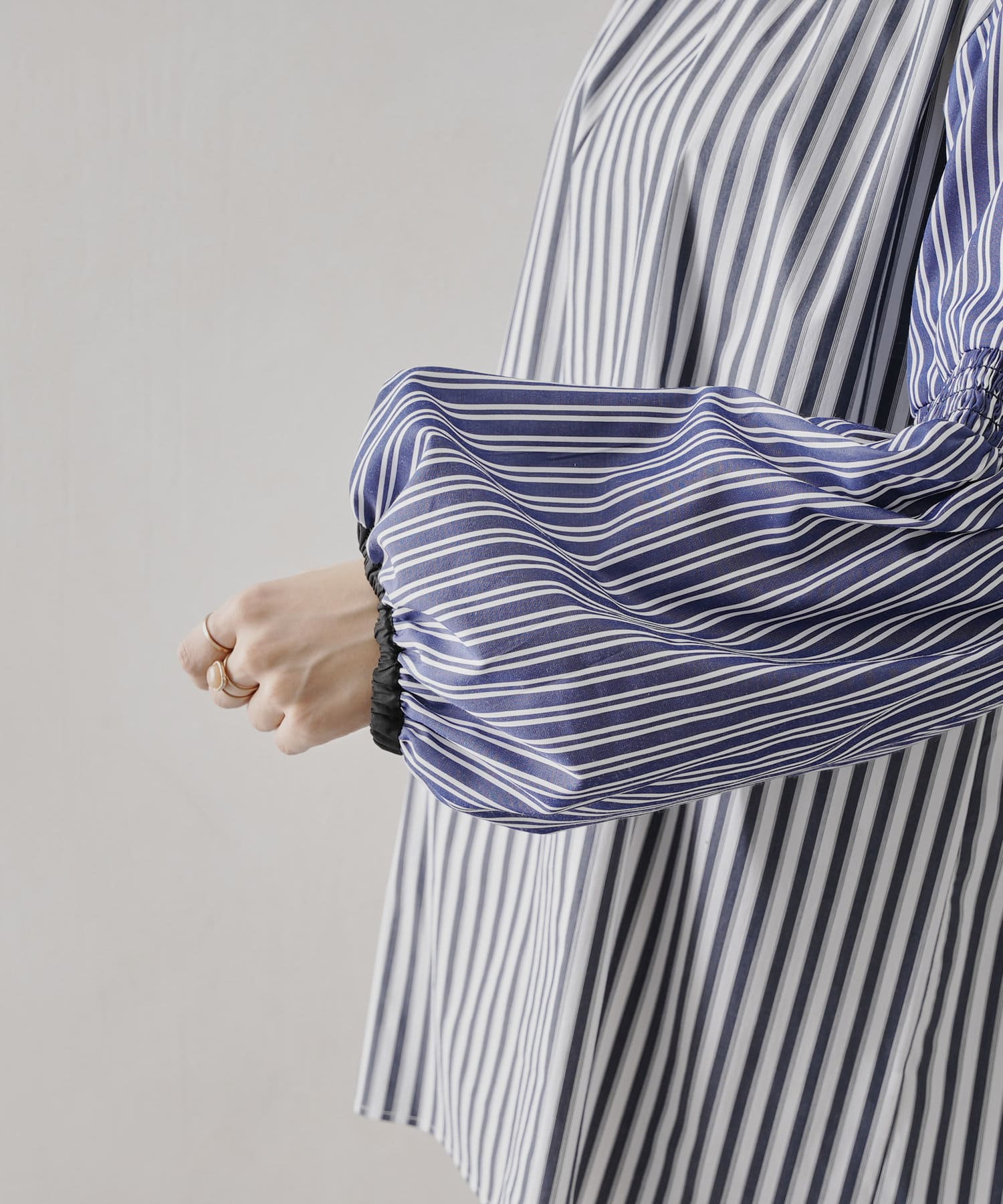 袖のシャーリングとストライプのパッチワークデザインが着るだけでオシャレ見えが叶う1着