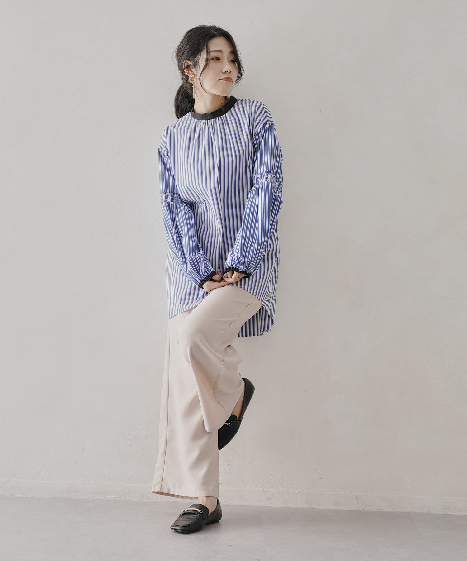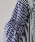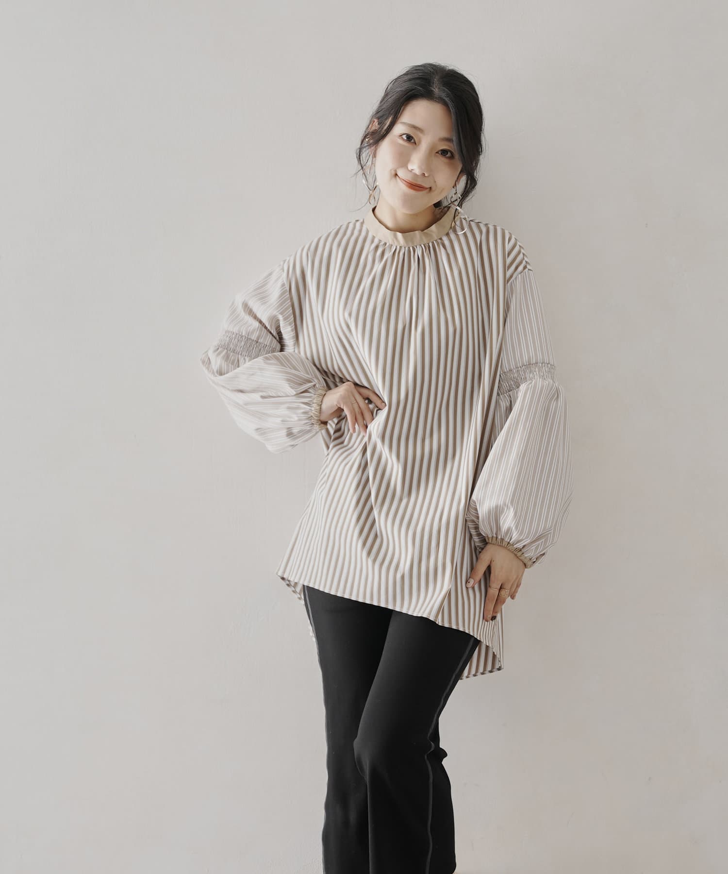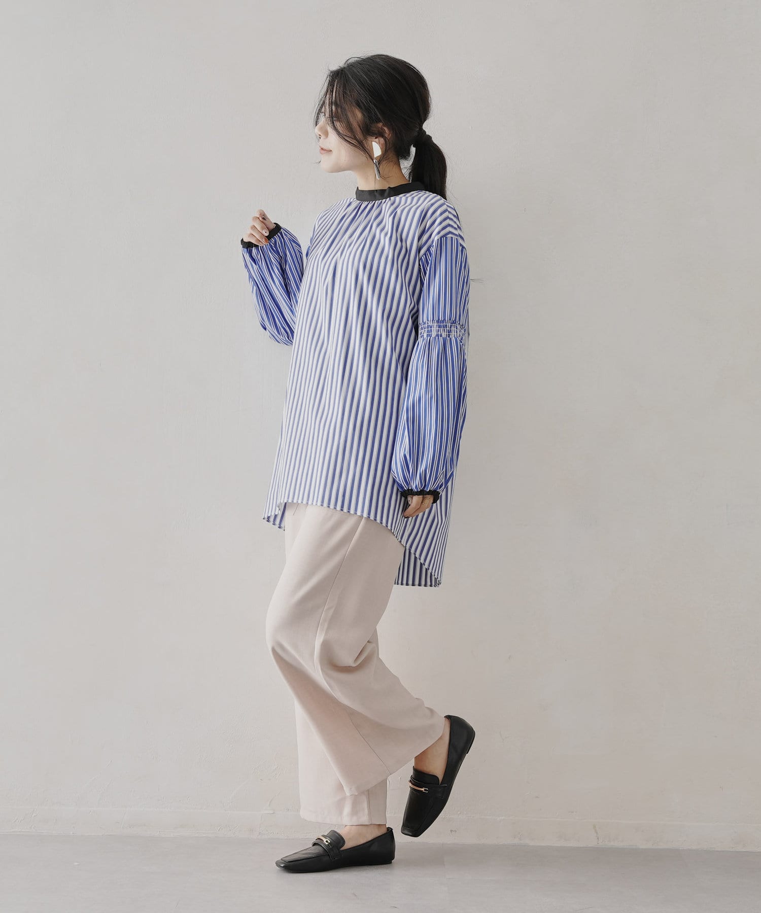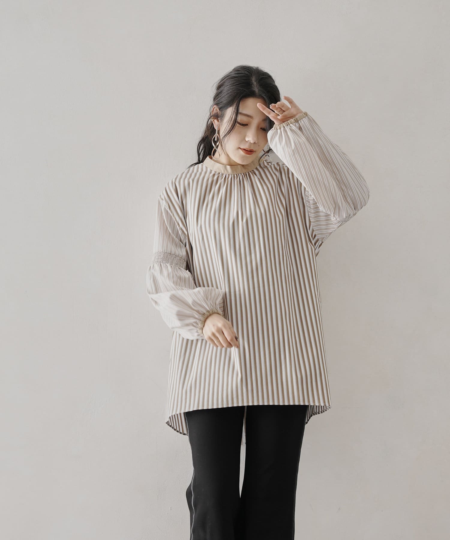 袖のシャーリングとストライプのパッチワークデザインが着るだけでオシャレ見えが叶う1着