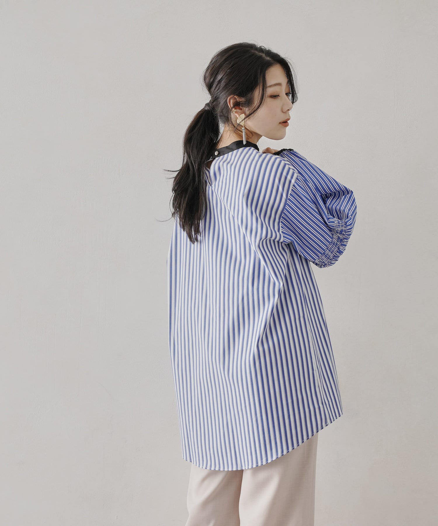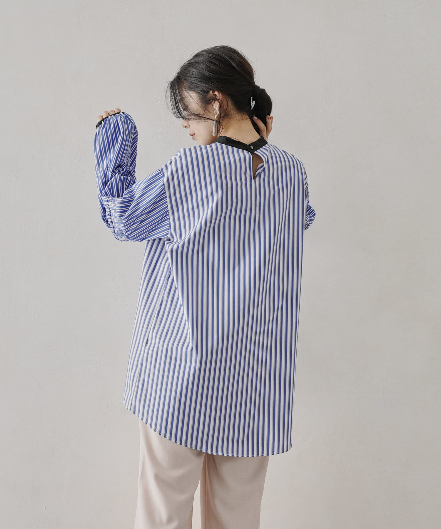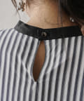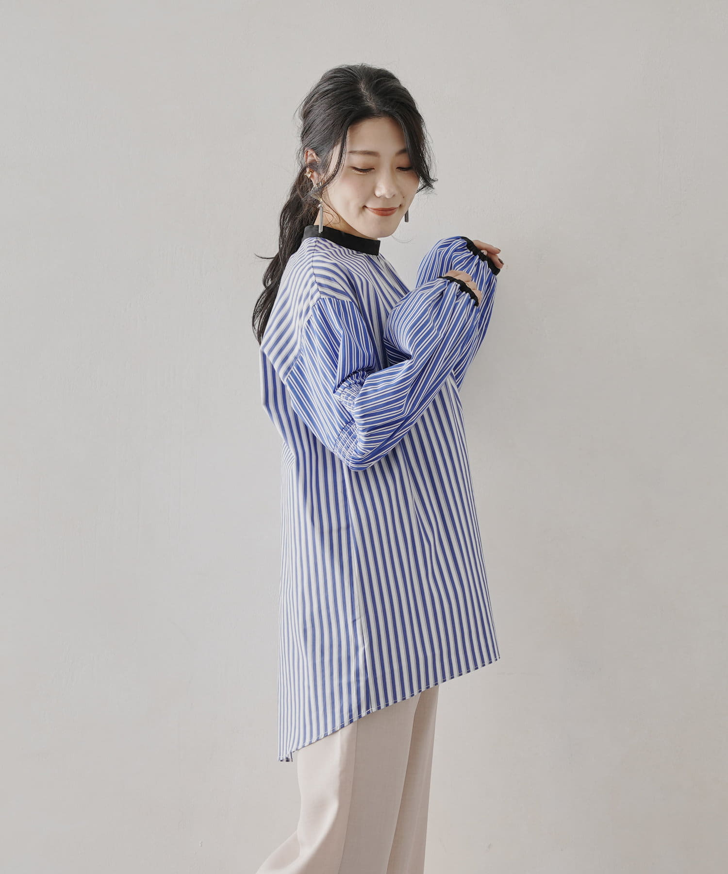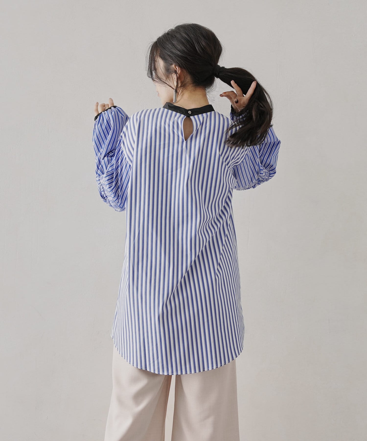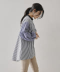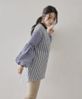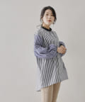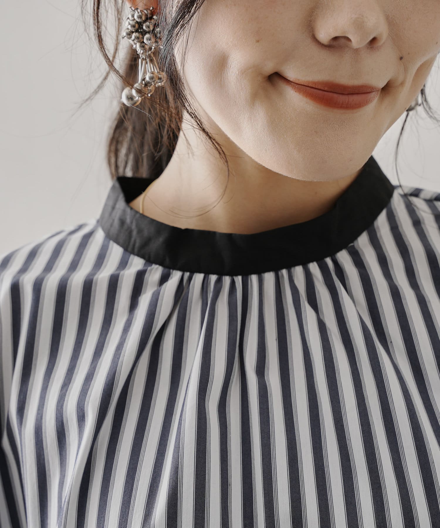 袖のシャーリングとストライプのパッチワークデザインが着るだけでオシャレ見えが叶う1着