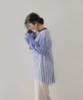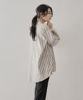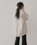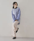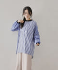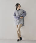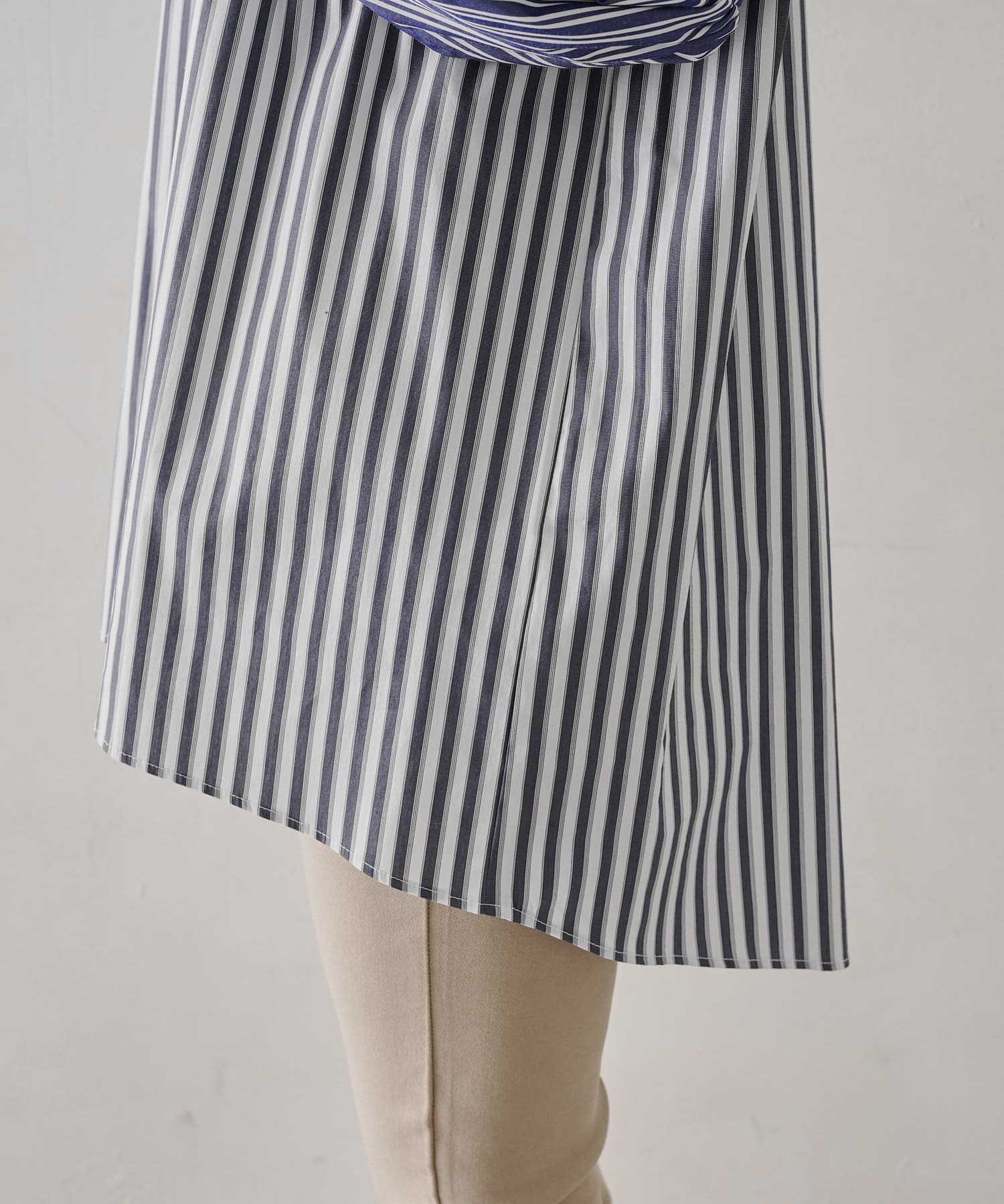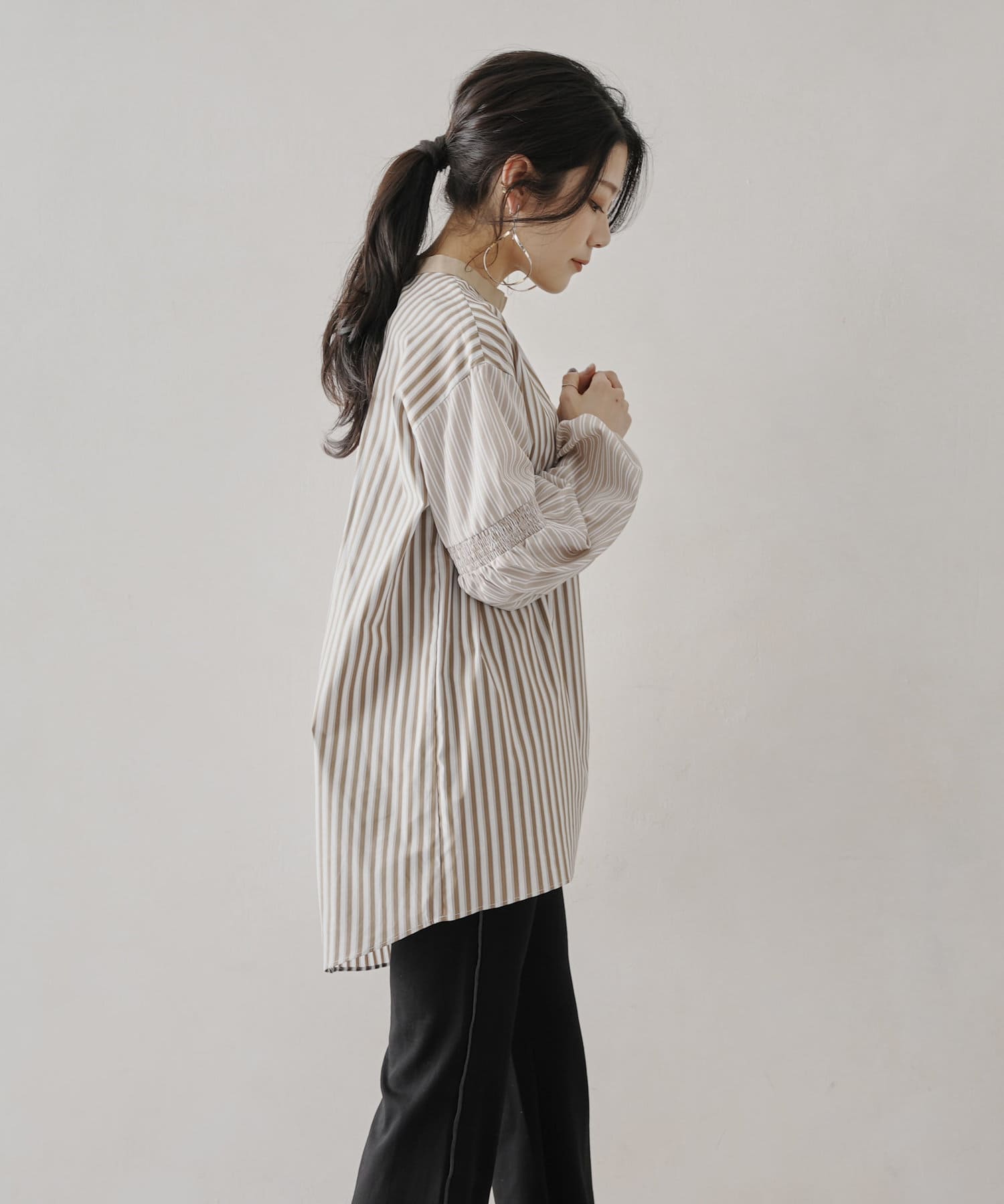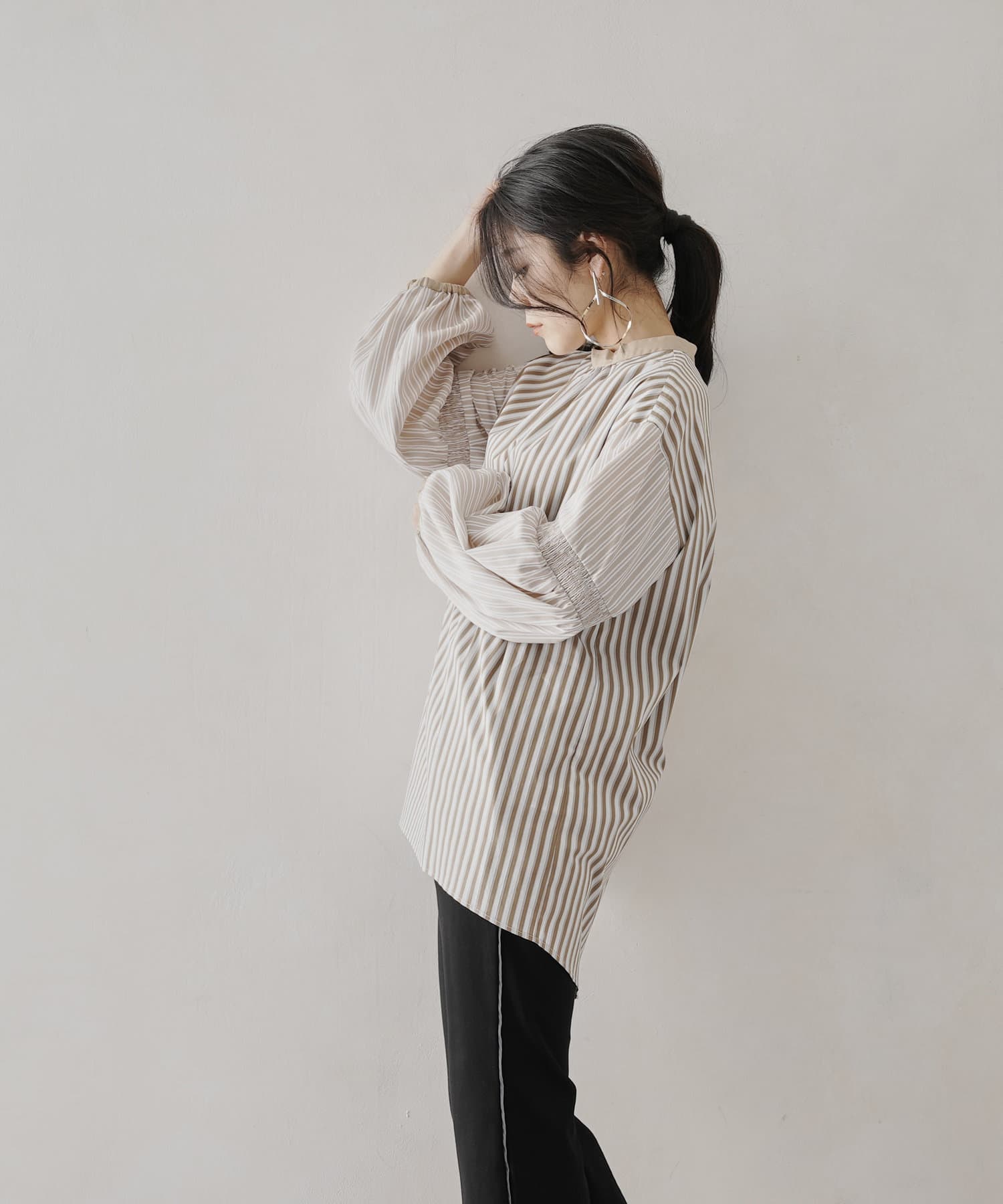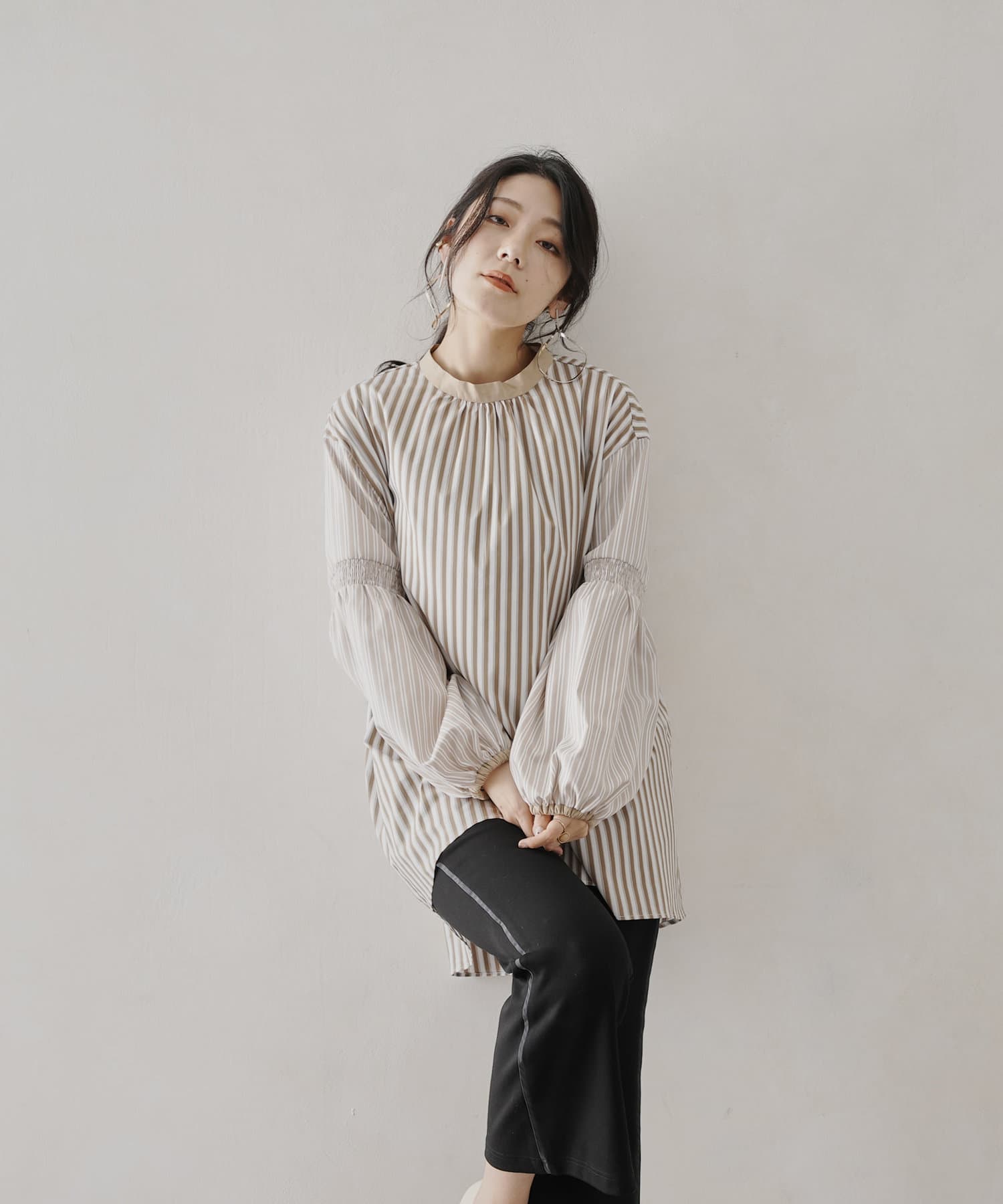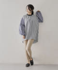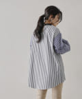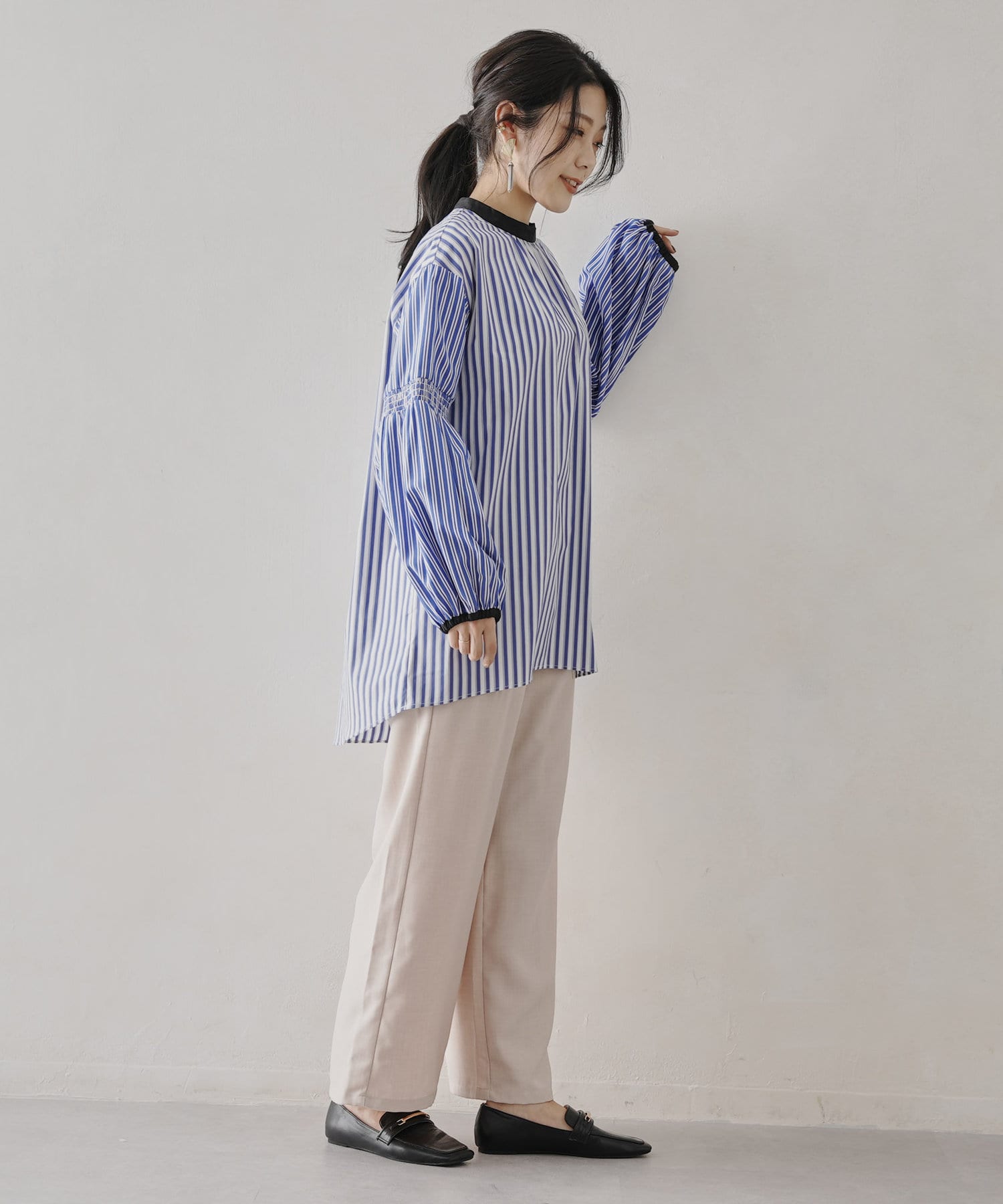 袖のシャーリングとストライプのパッチワークデザインが着るだけでオシャレ見えが叶う1着