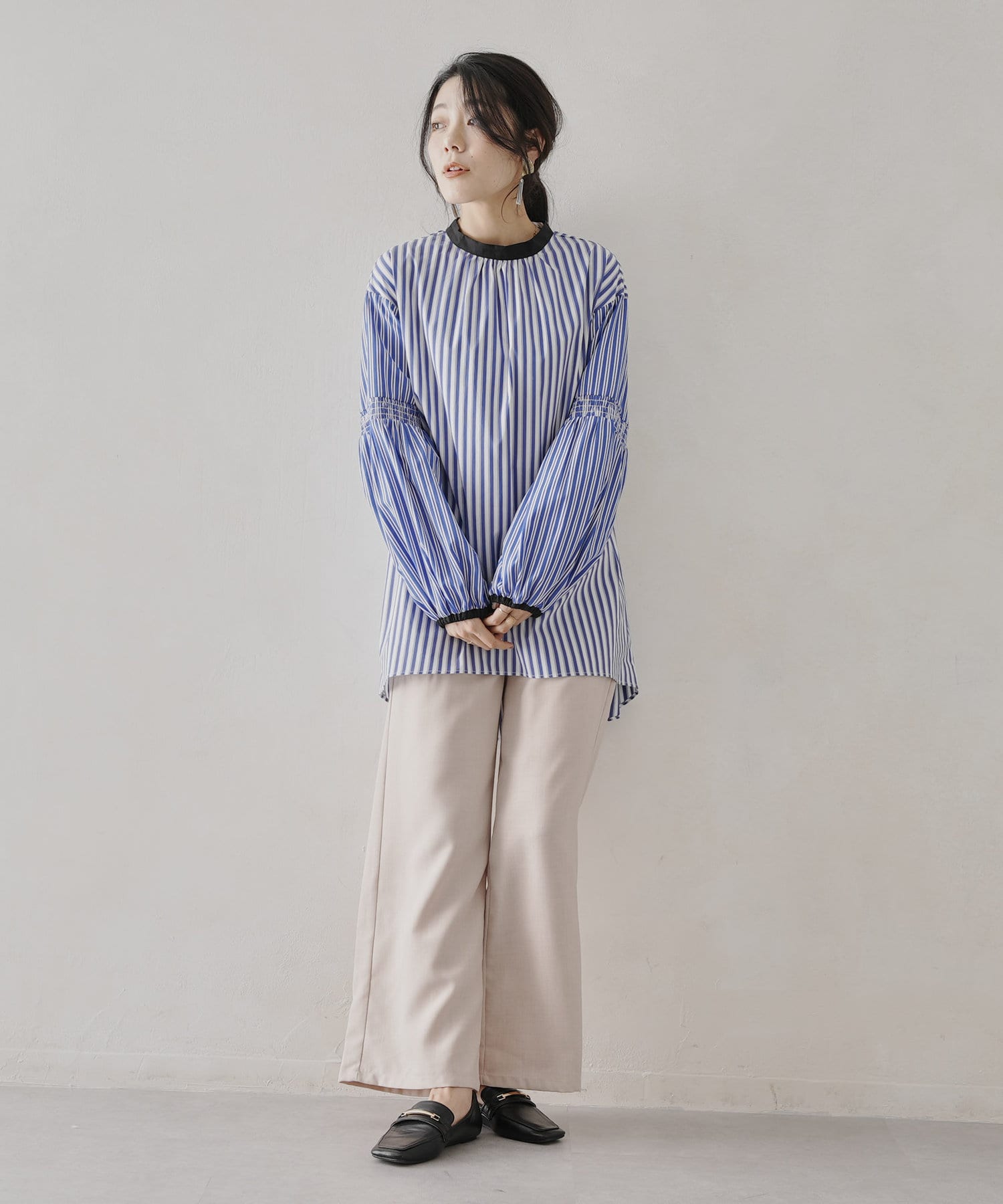 ・袖のシャーリングがポイントになっていてオトナフェミニンな印象に。