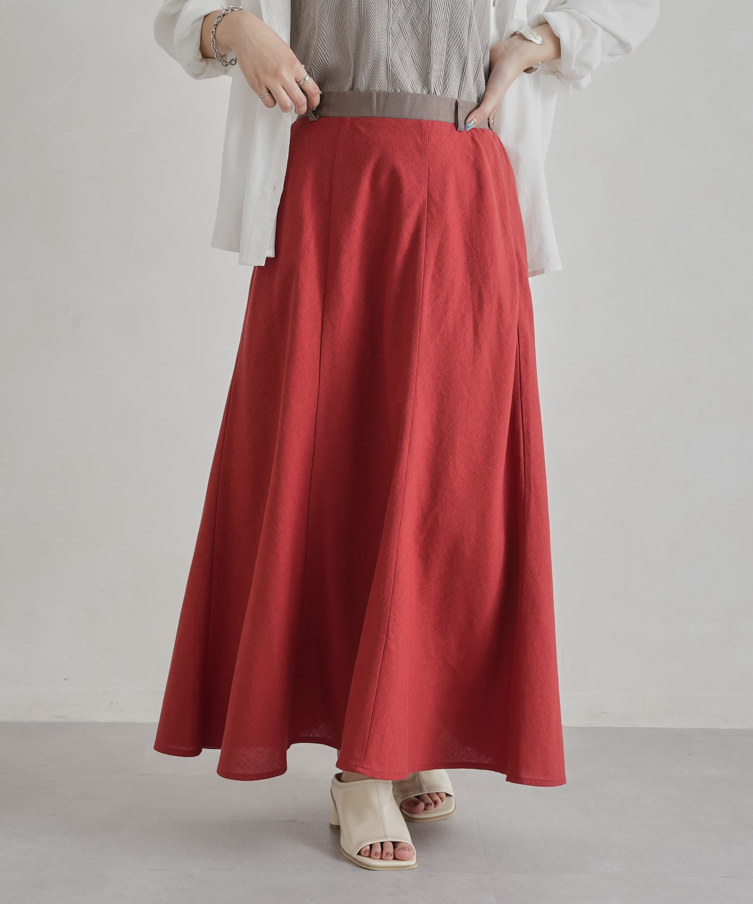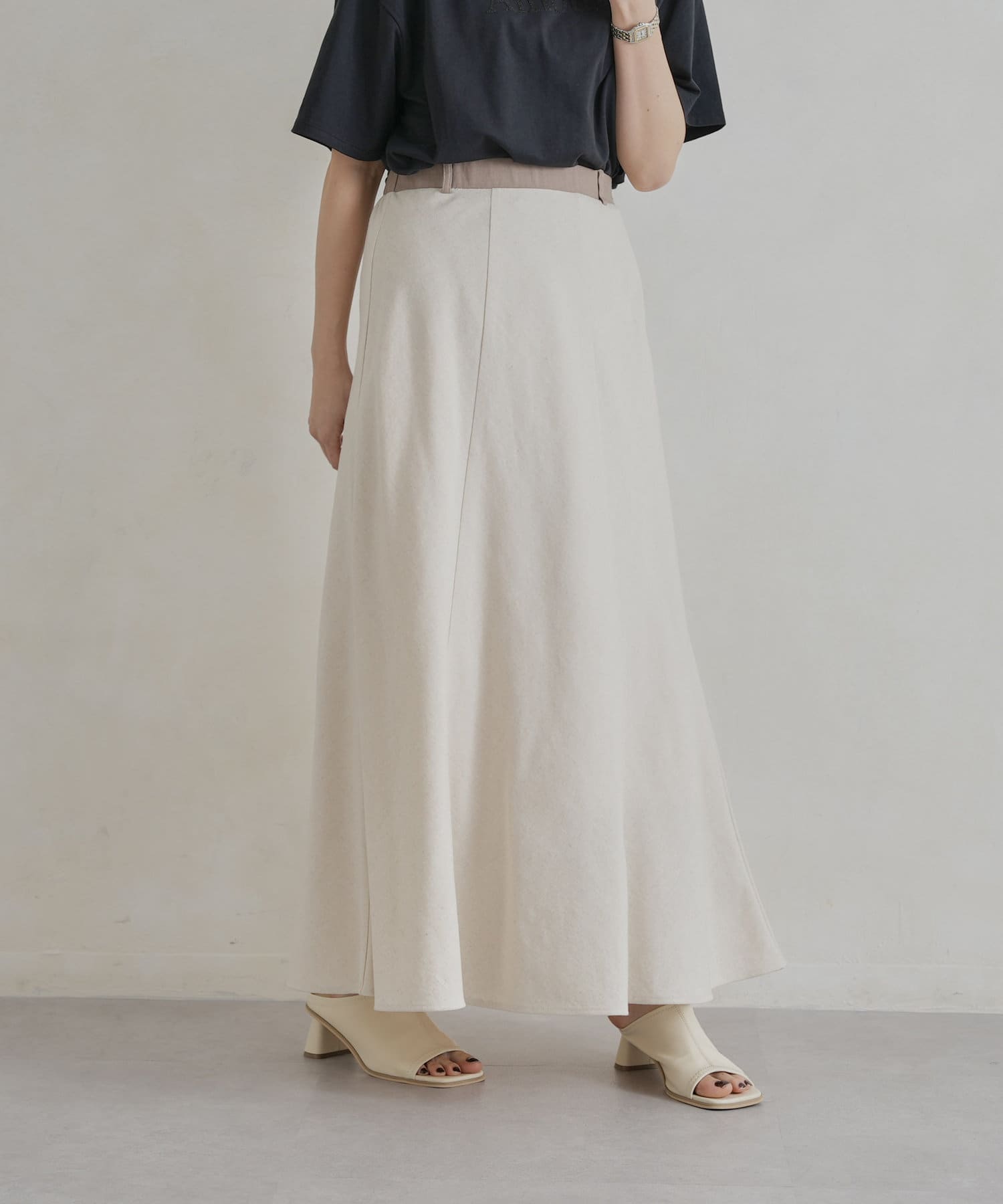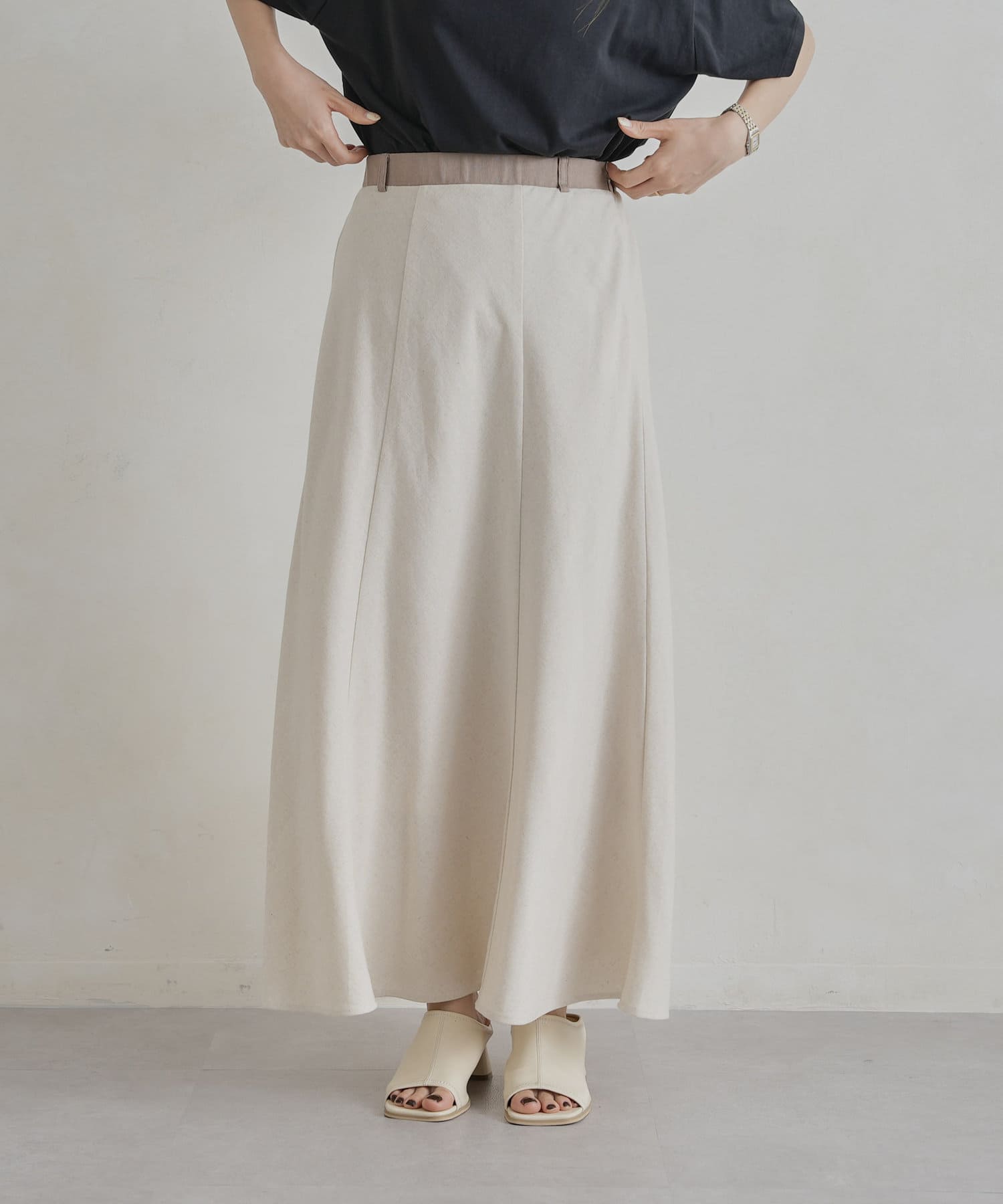 【着用動画あり】ウエスト配色リネンバイヤスフレアスカート