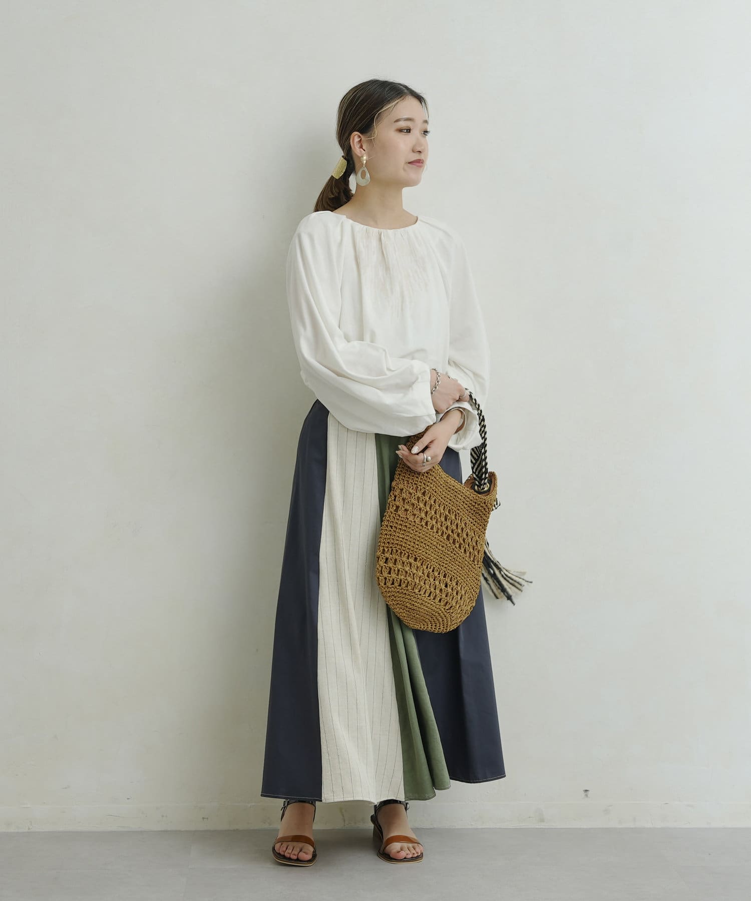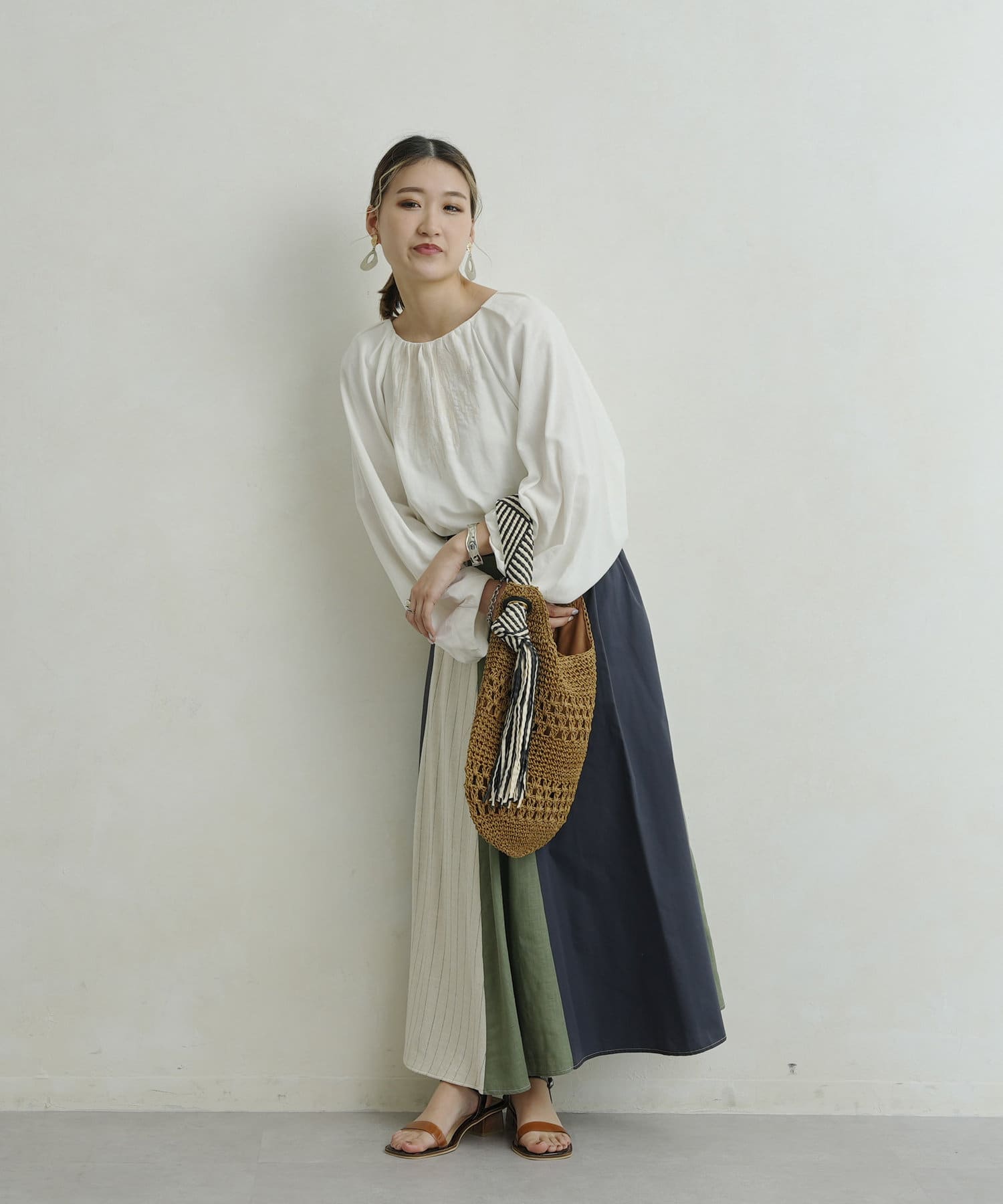 優しい印象の素材感なので、布帛トップスとも合わせやすいです。