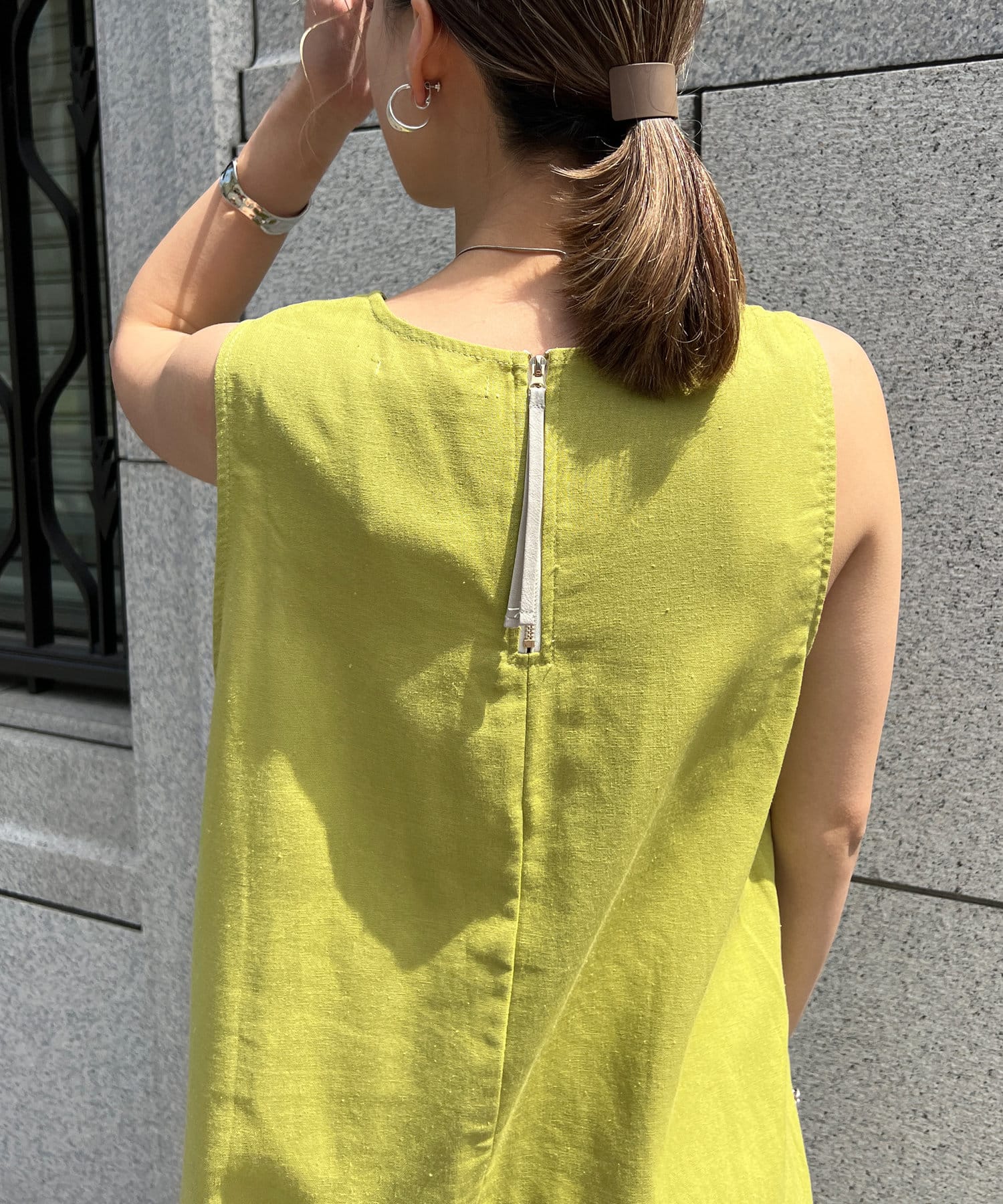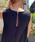 ・後ろのレザーひも付きジッパーが抜け感と女性らしい雰囲気を演出する