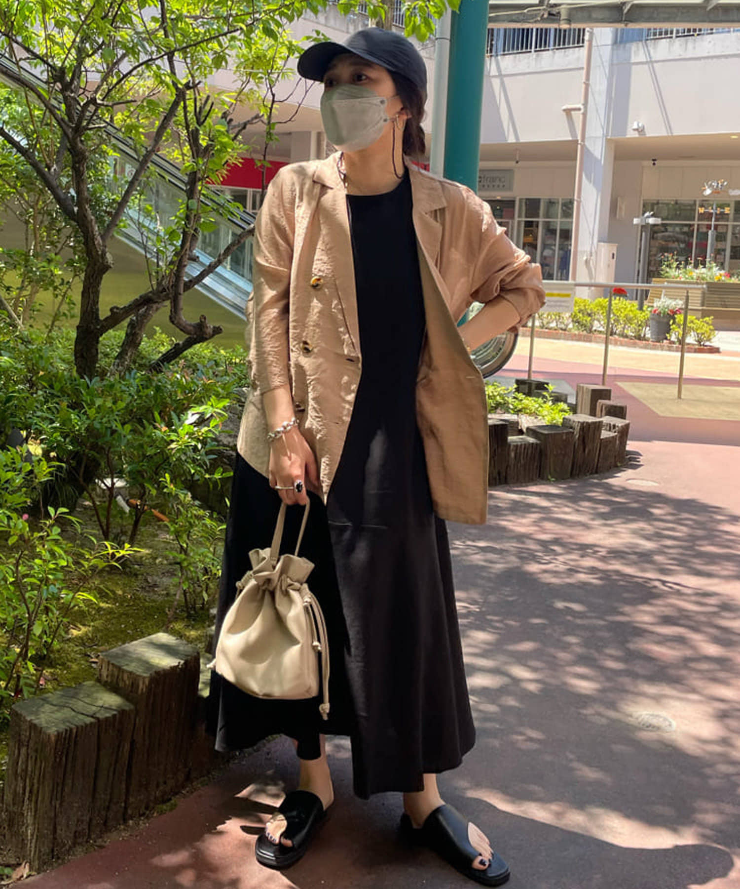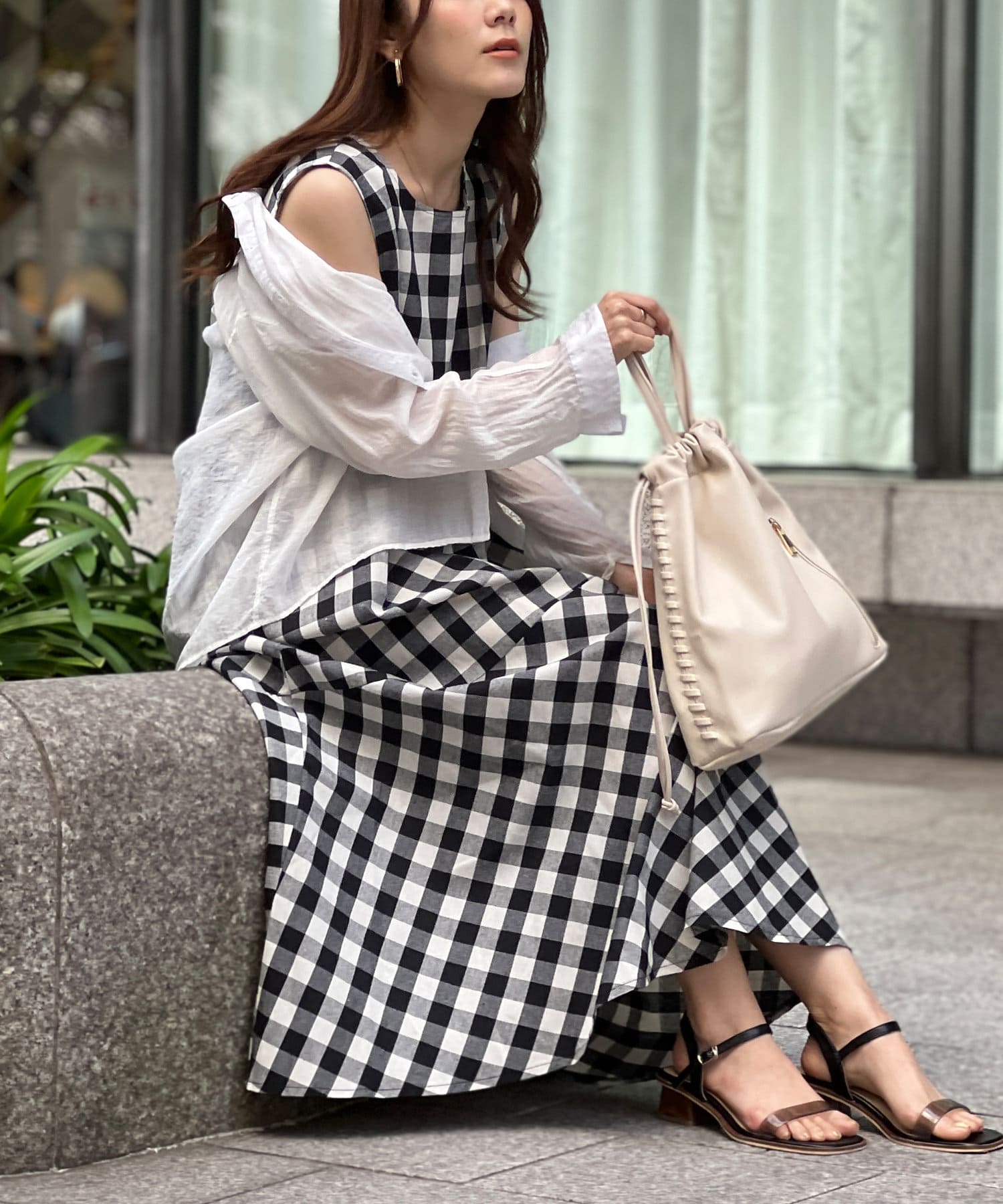 カーデやジャケットを肩にかけてオトナの抜け感を演出するのも