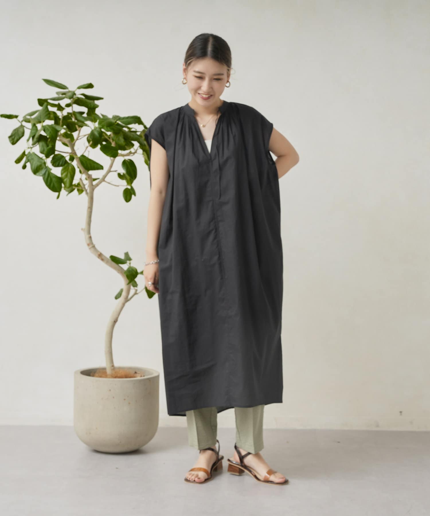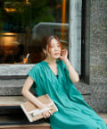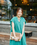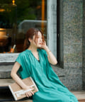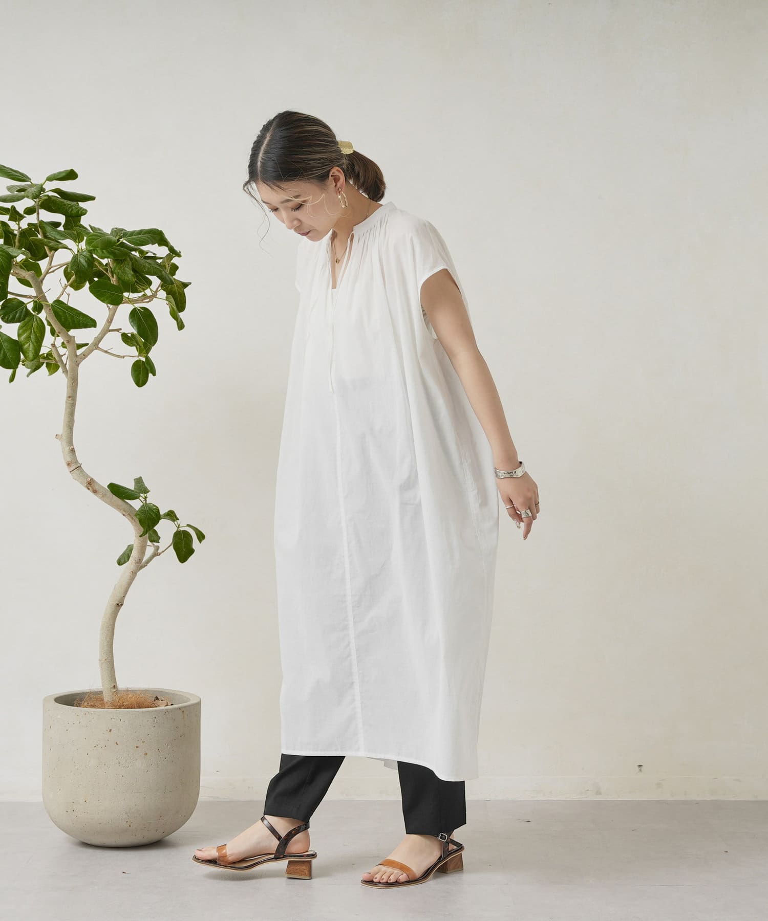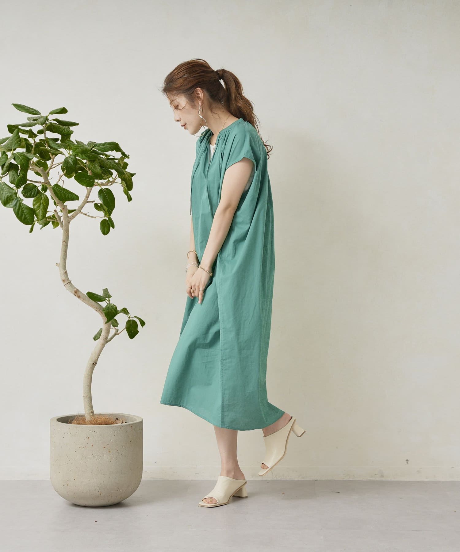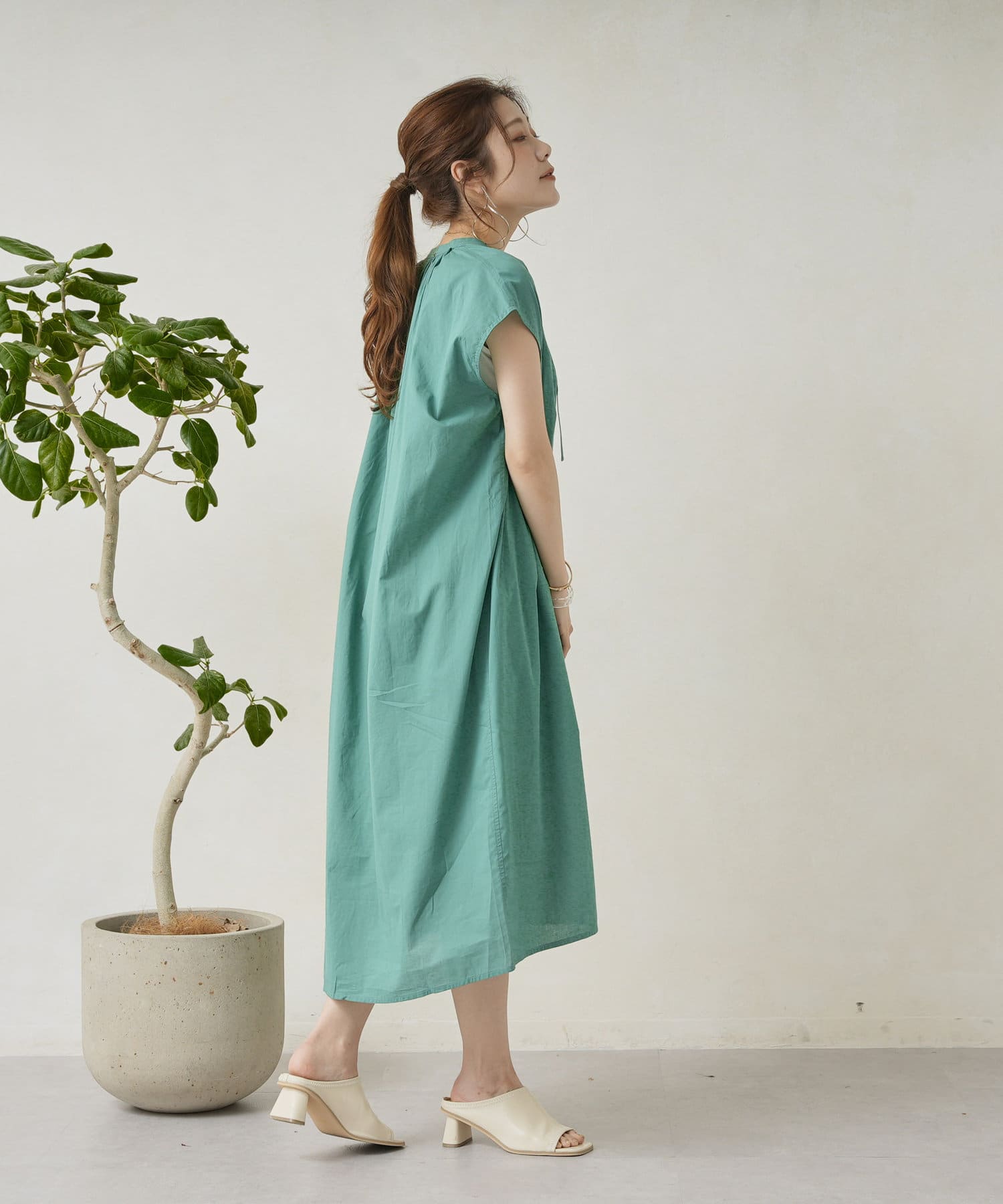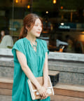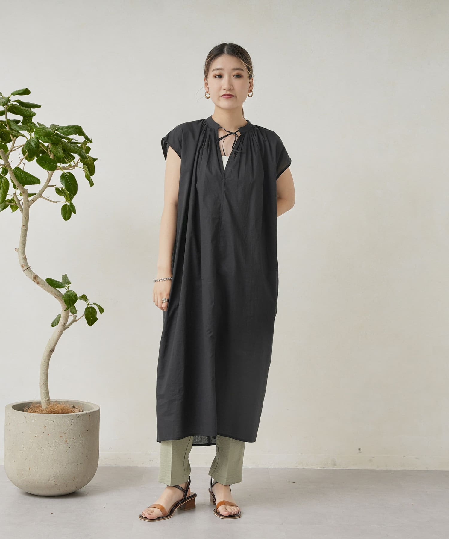 キーネックギャザースモックワンピース