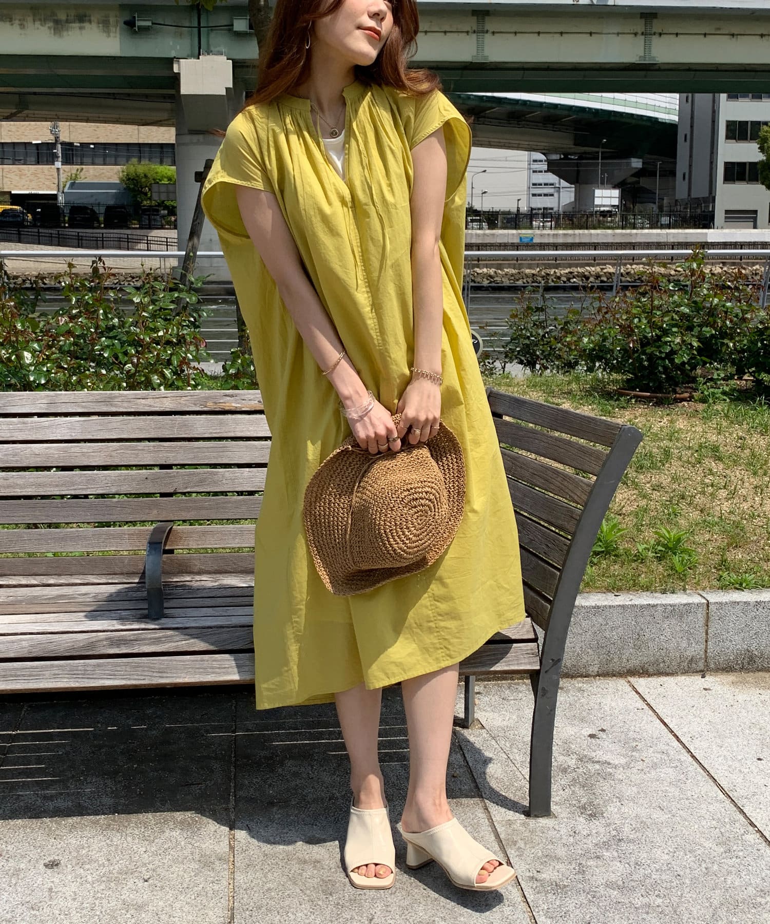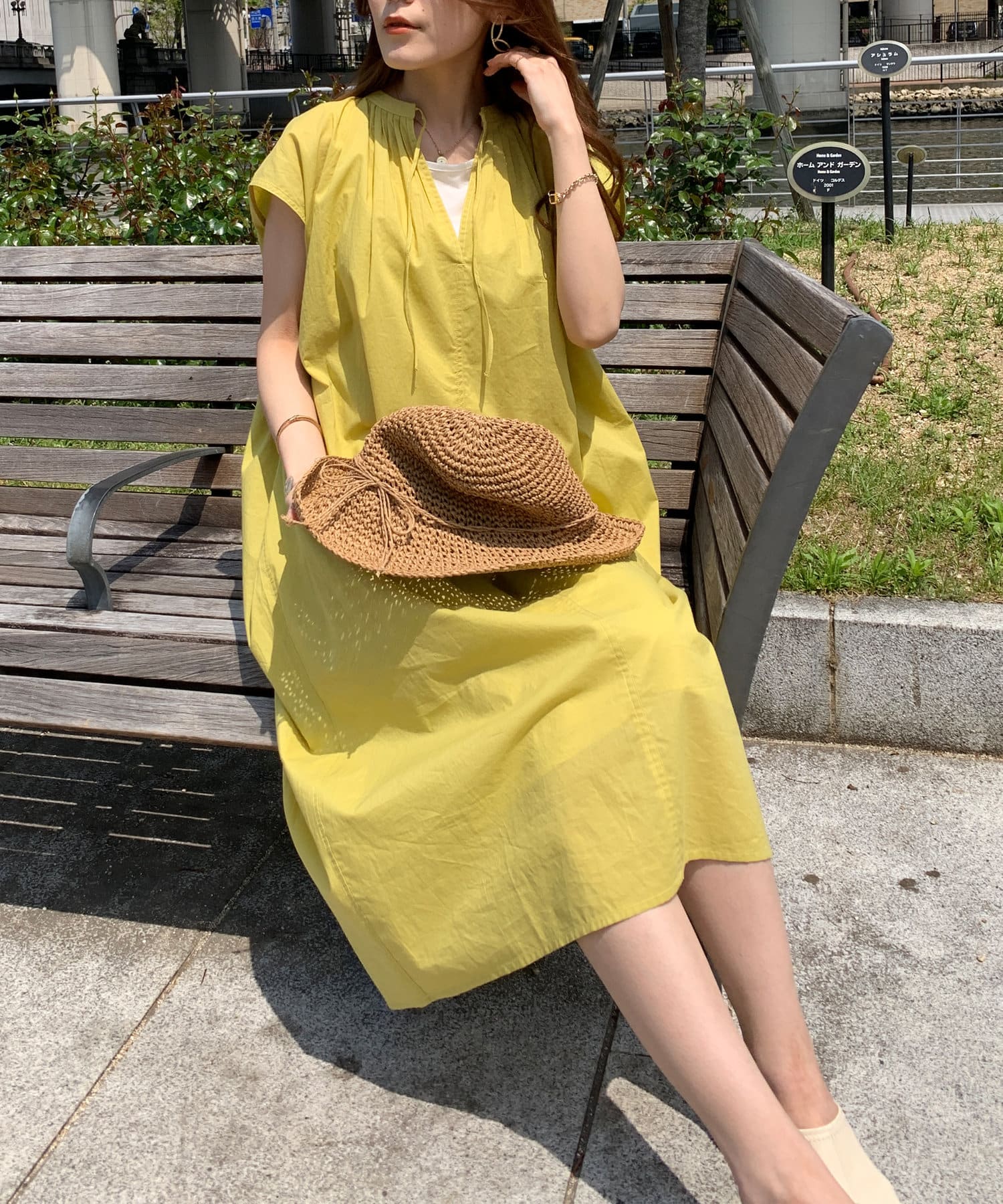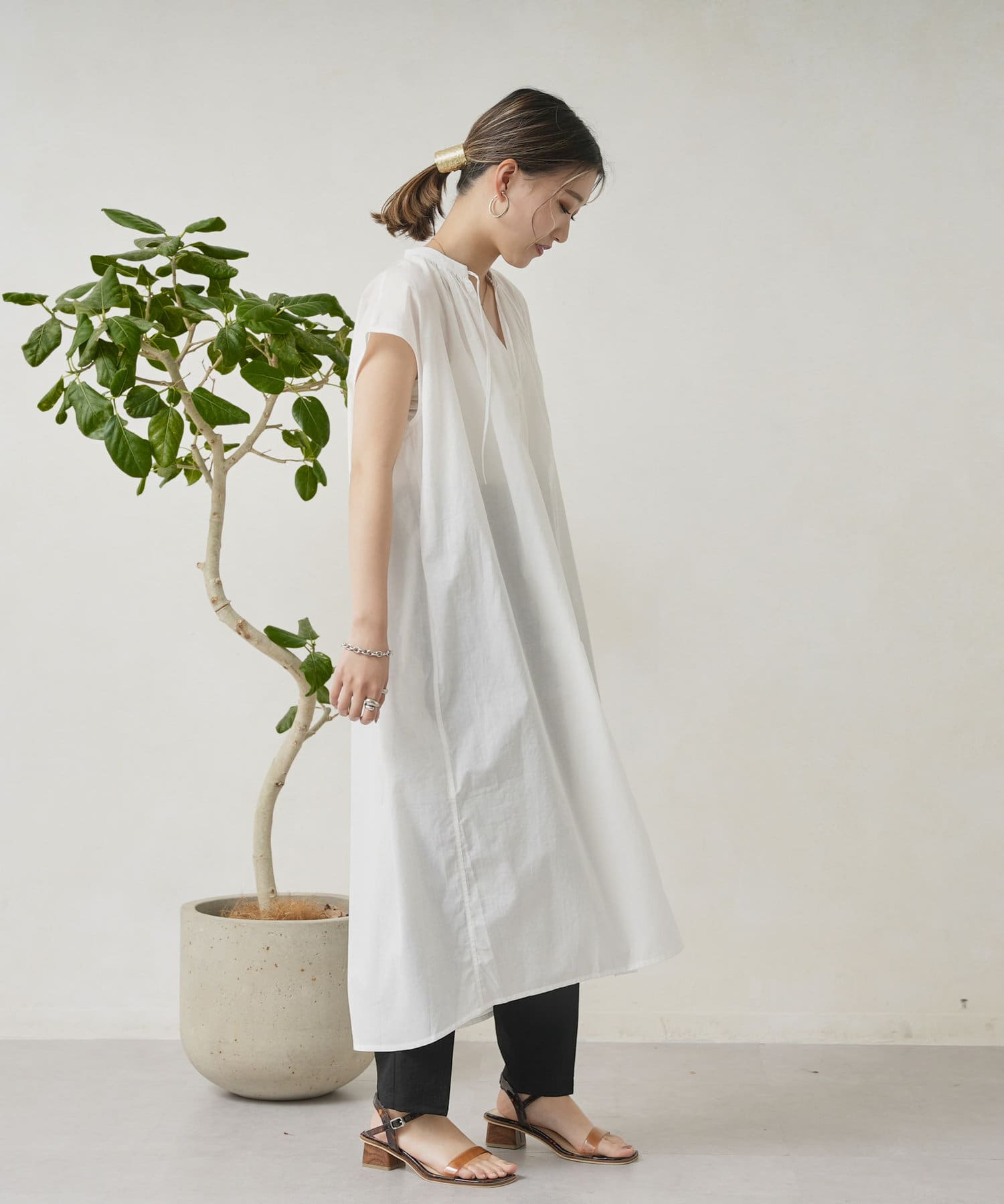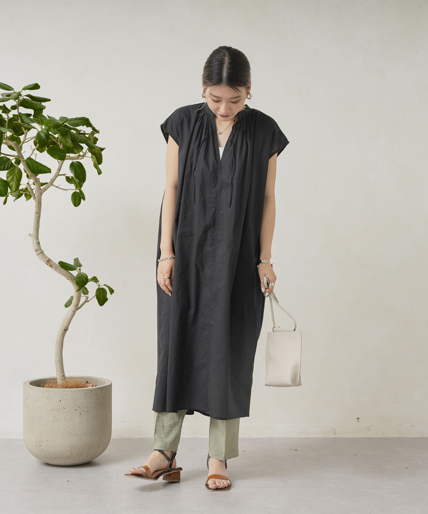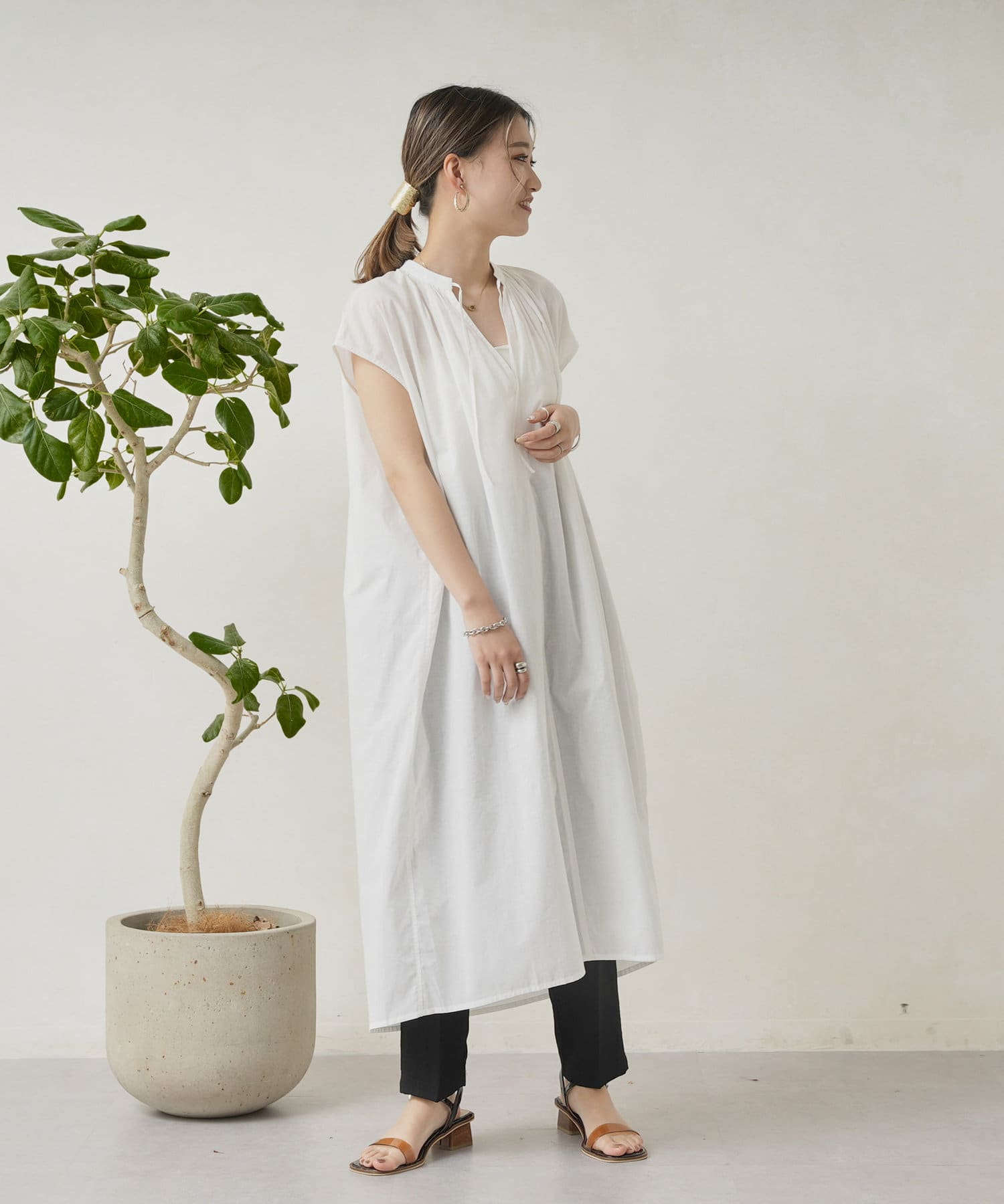 キーネックギャザースモックワンピース