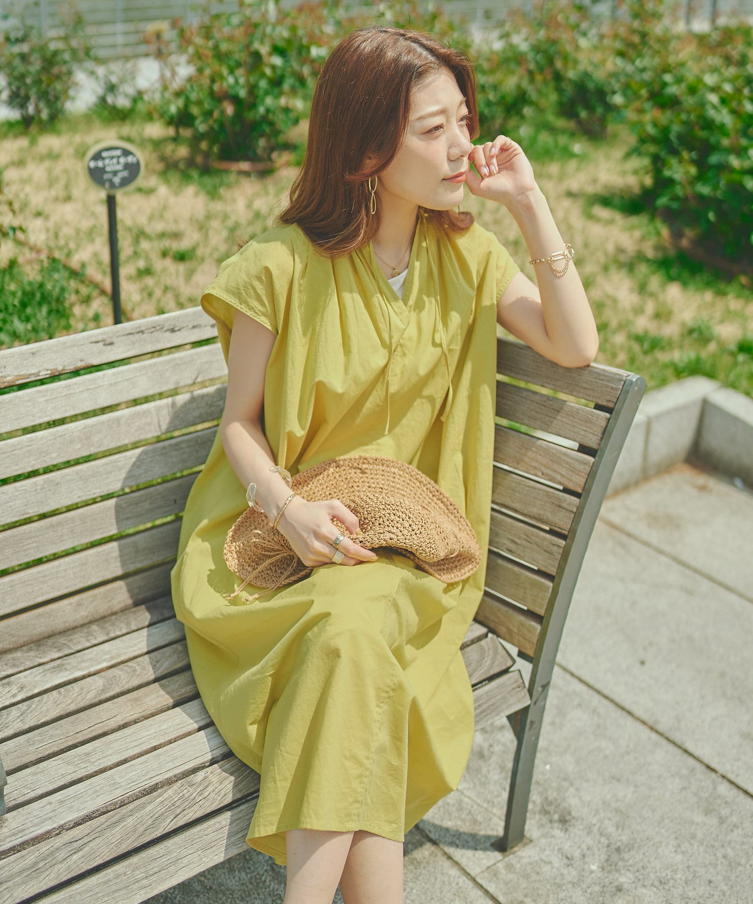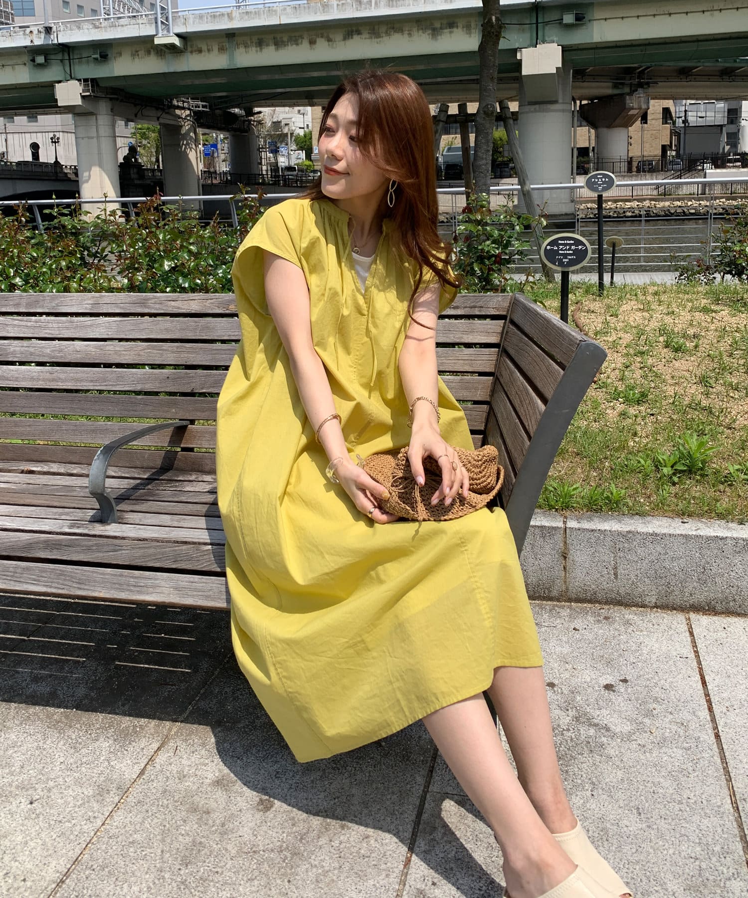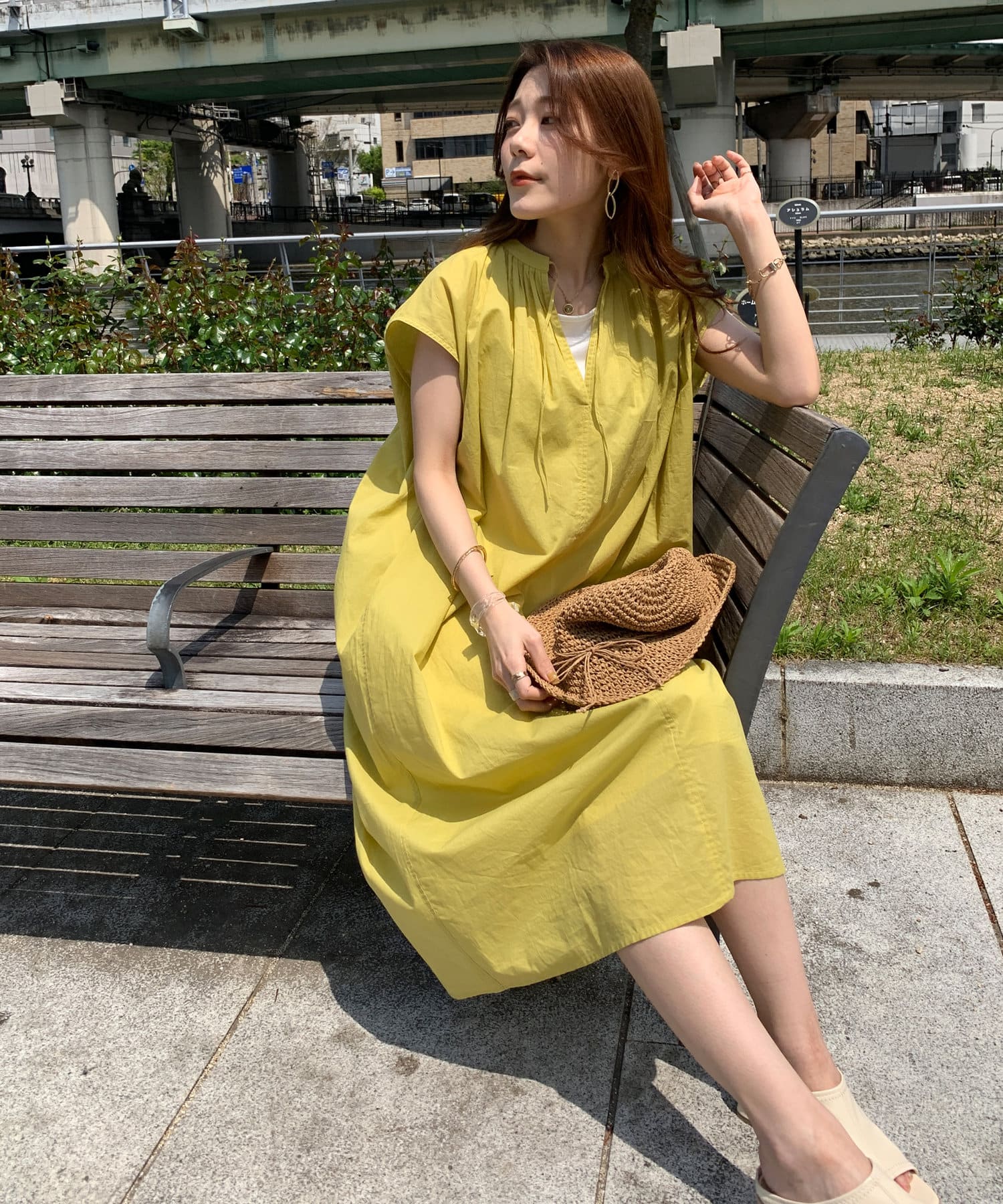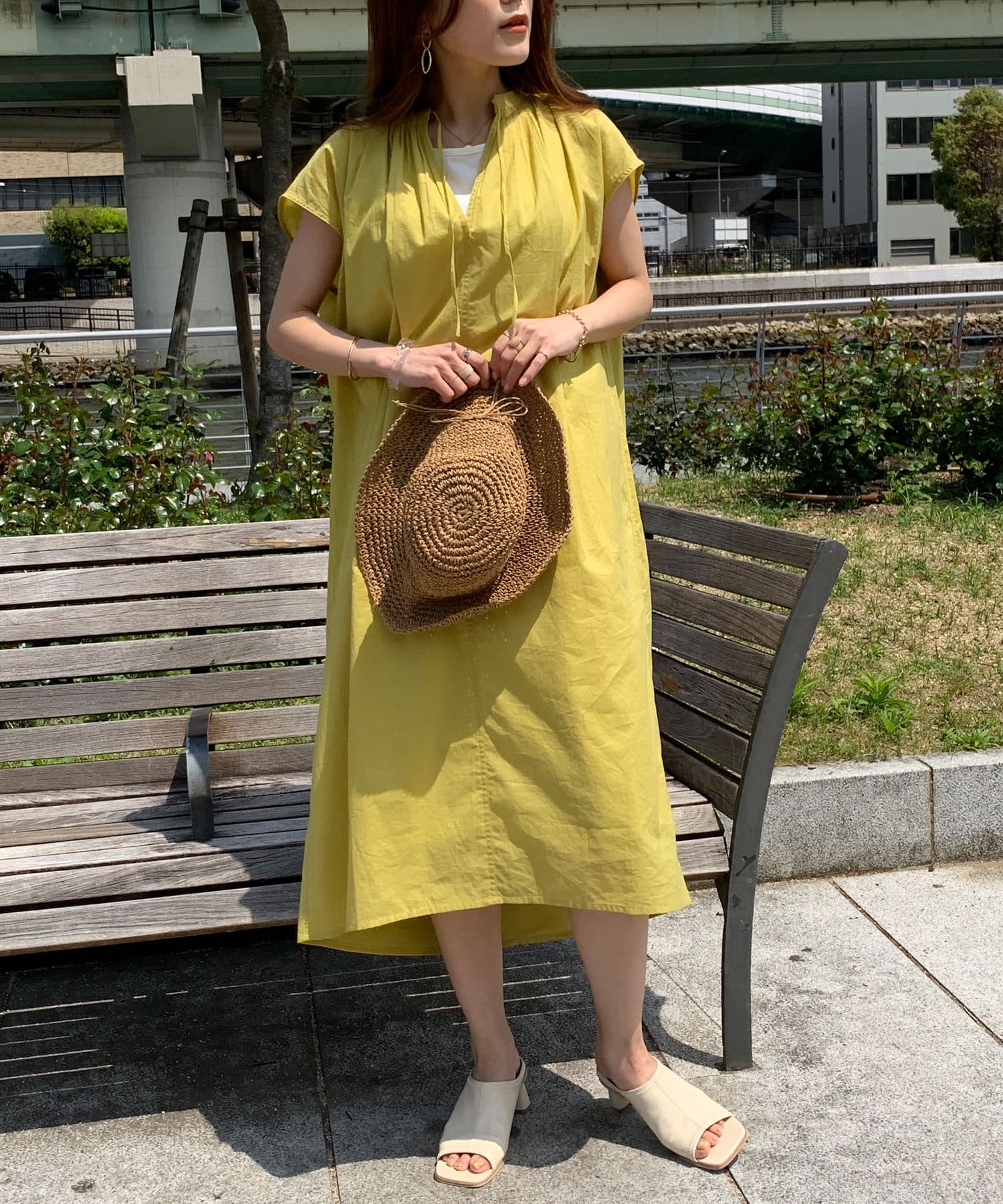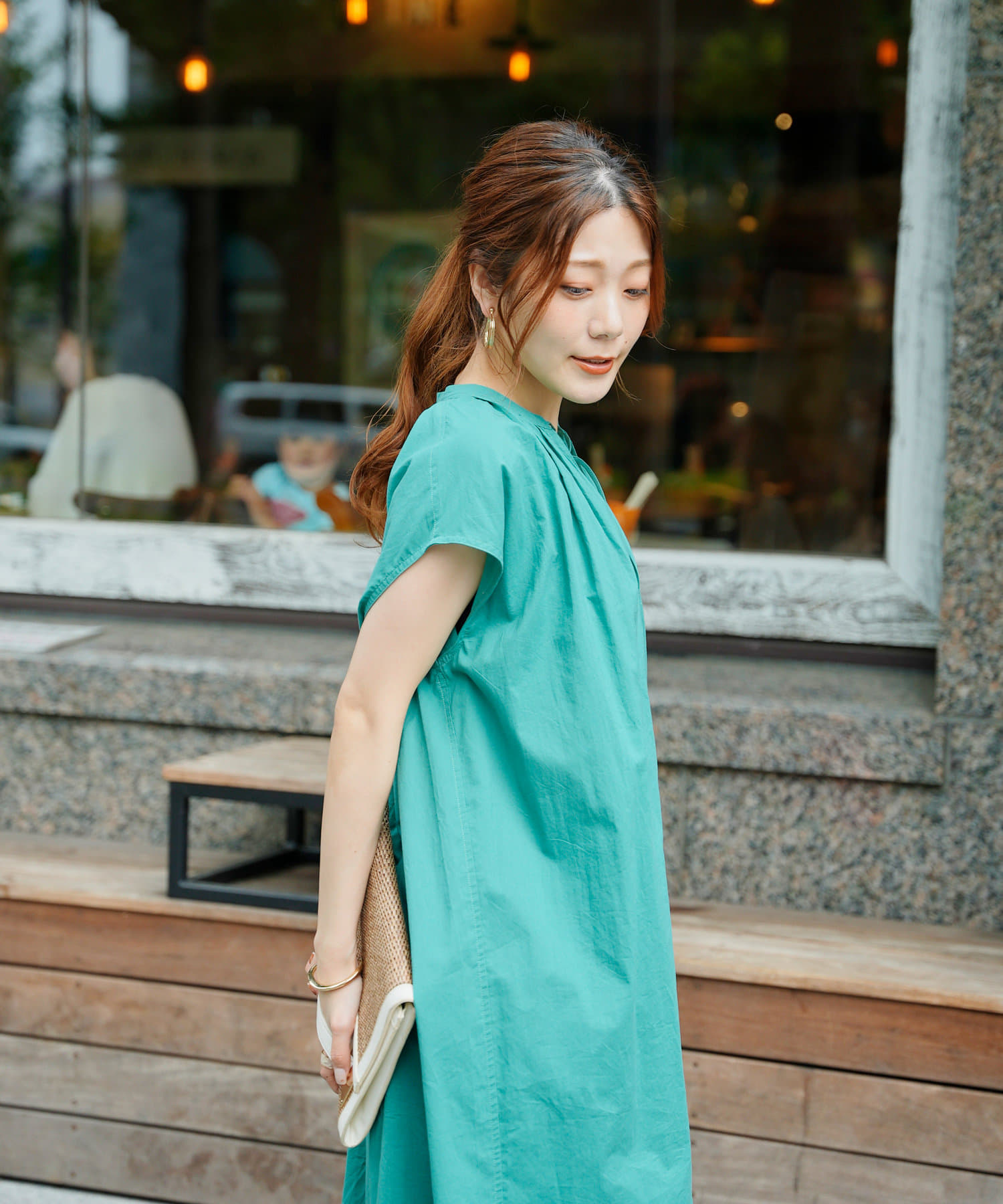 キーネックギャザースモックワンピース