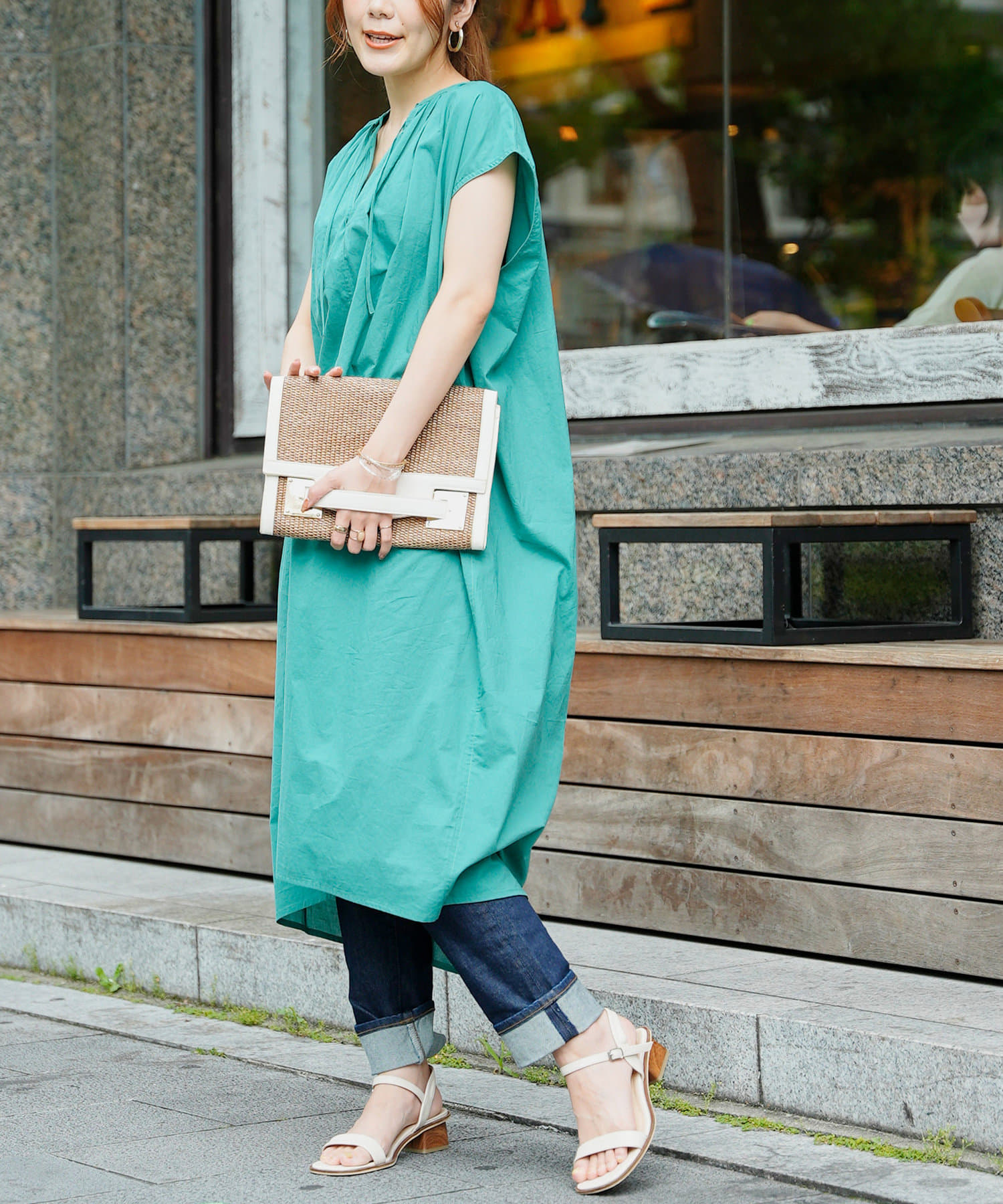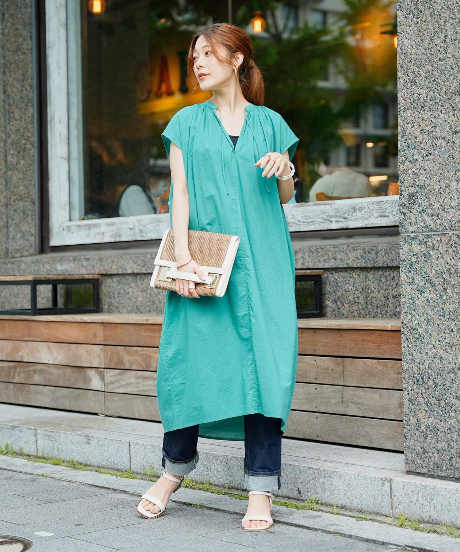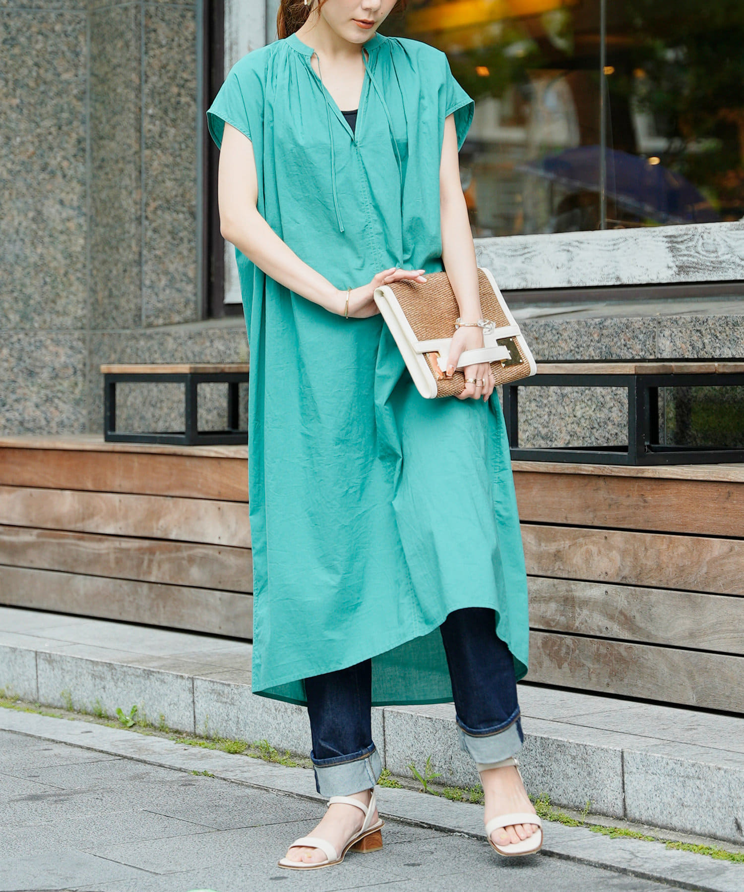 デニムやストレートパンツのレイヤードスタイルもおすすめです。