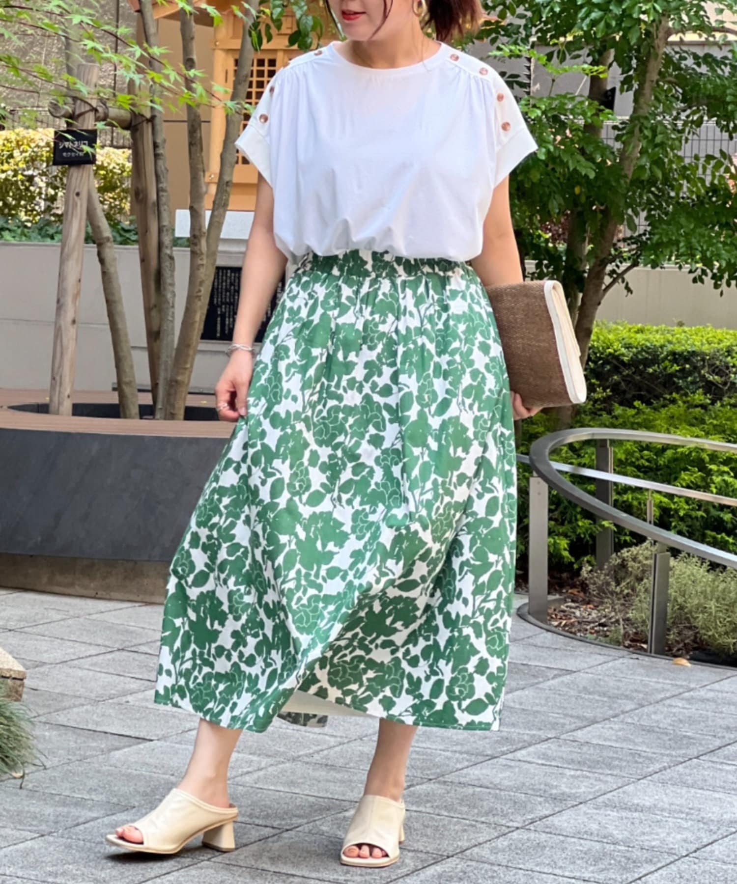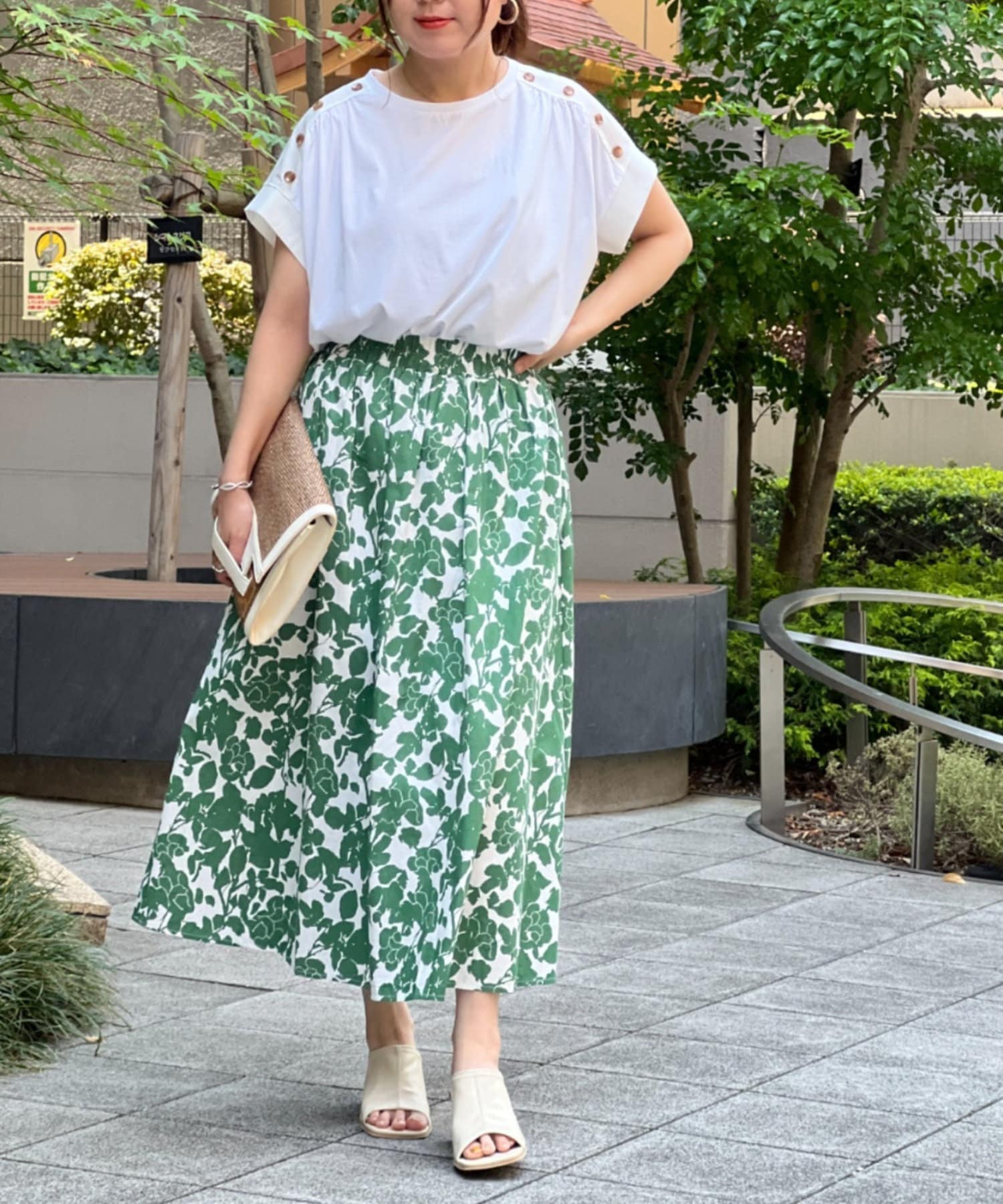 夏を感じる大きめのプリント柄がコーディネートに程よいインパクトを