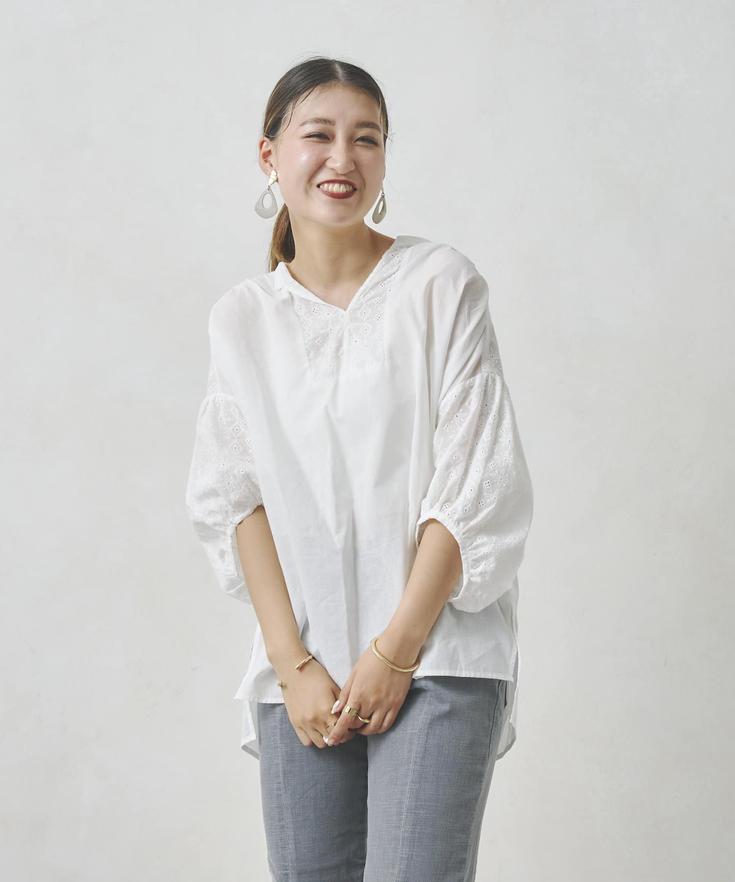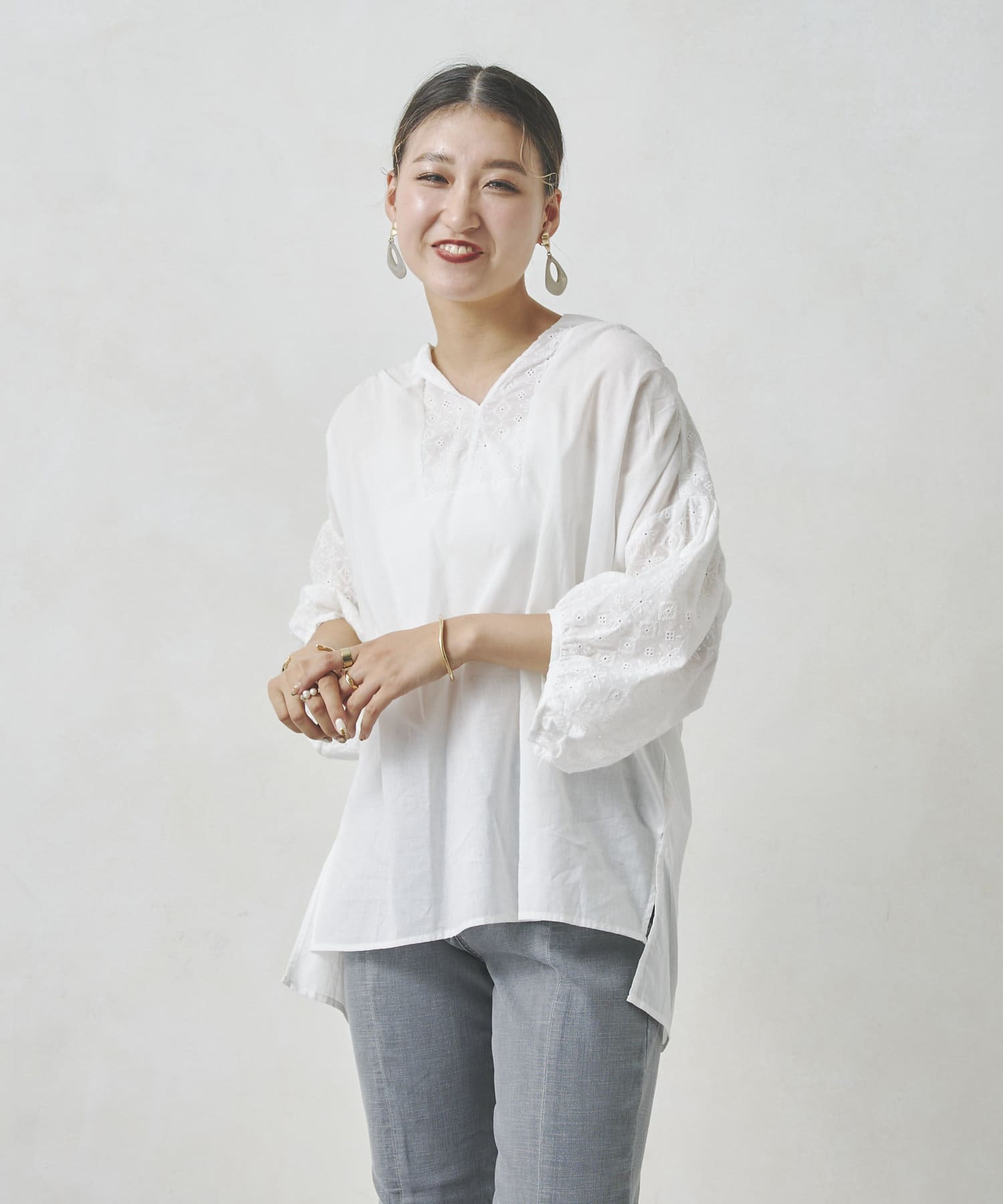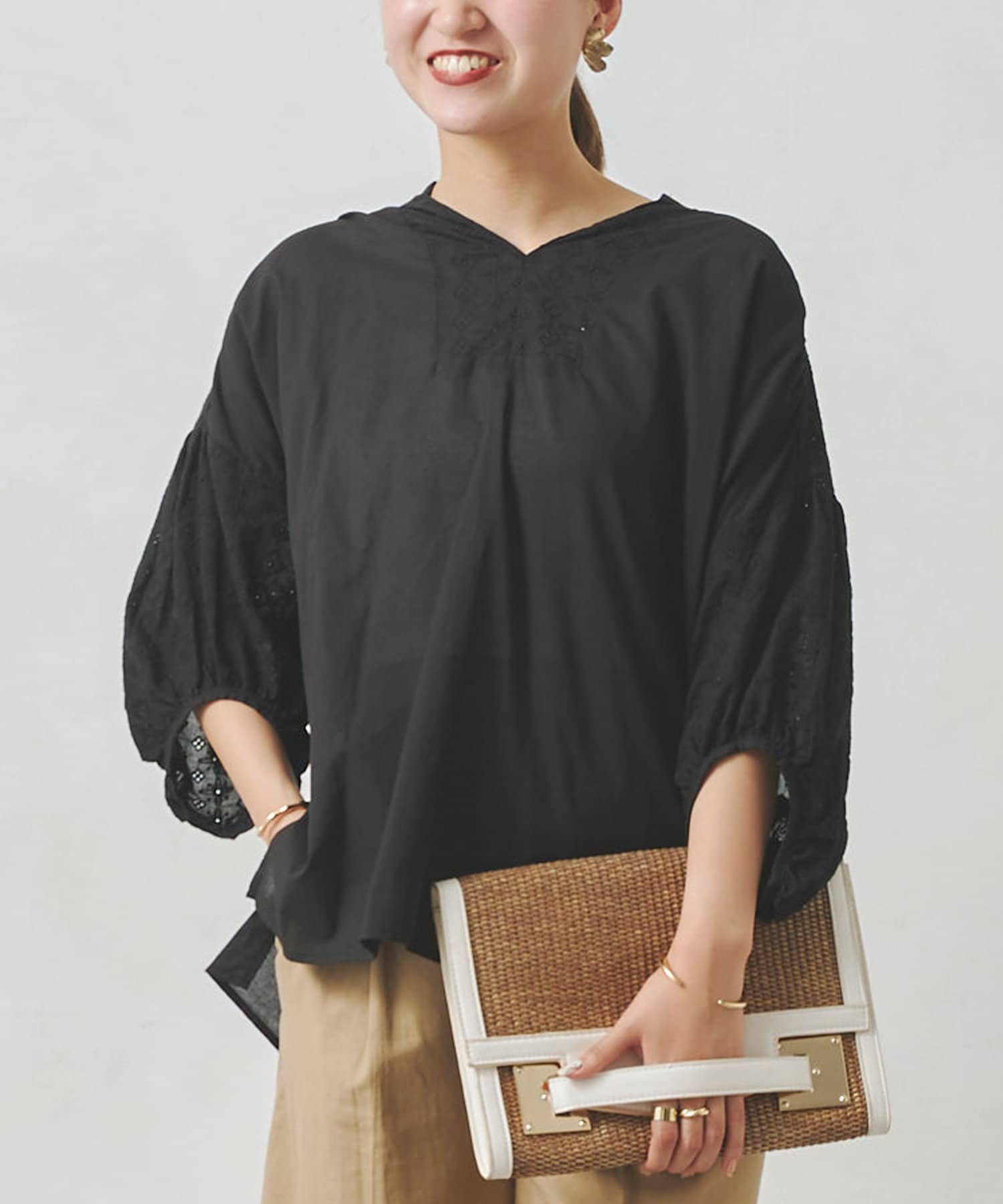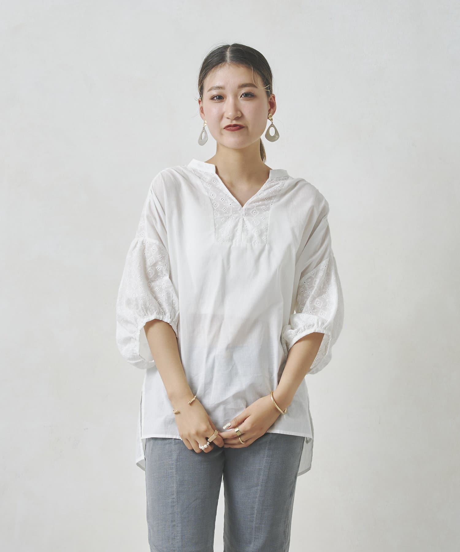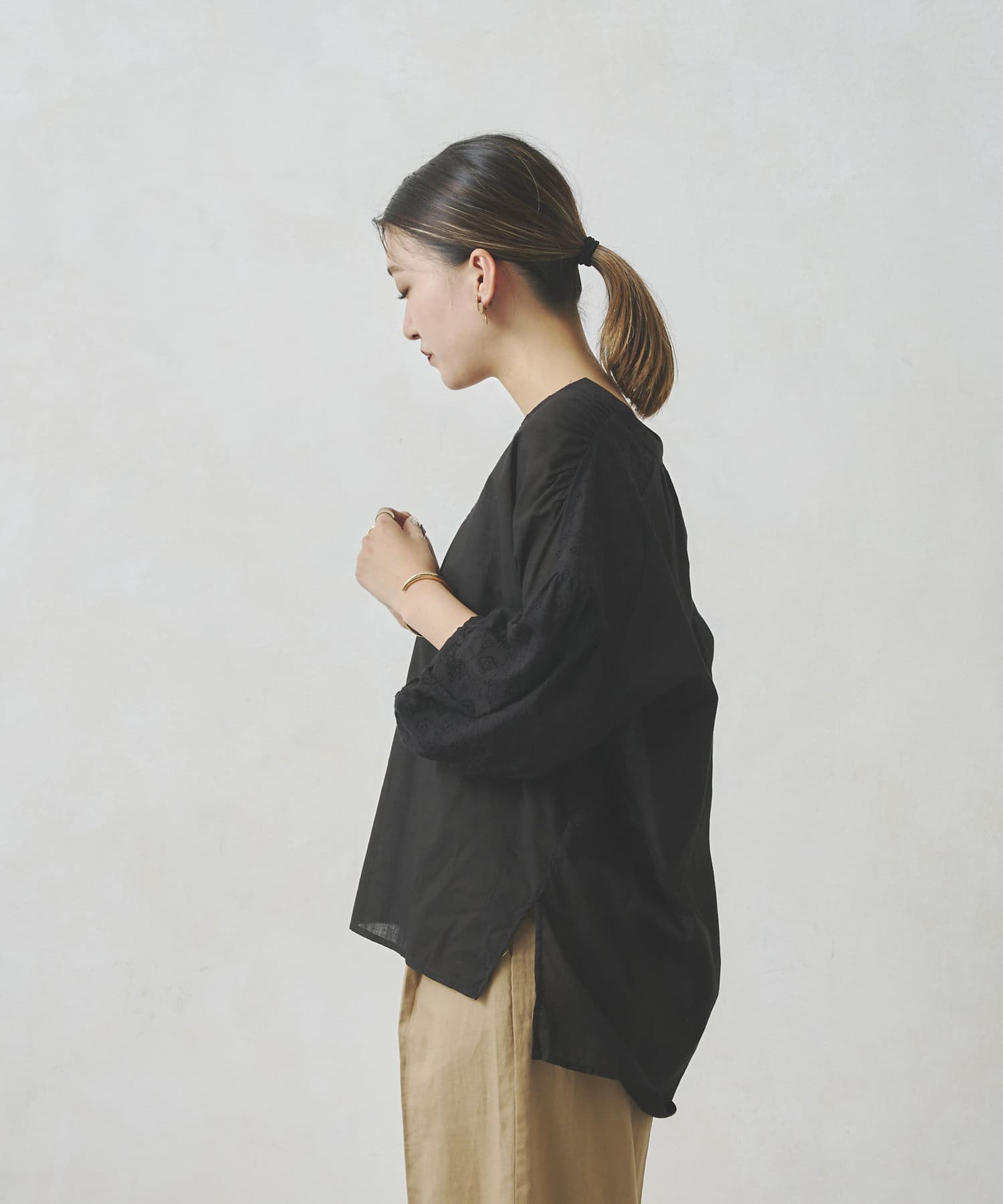 清涼感のある綿素材とバルーンスリーブが女性らしい刺繍ブラウス