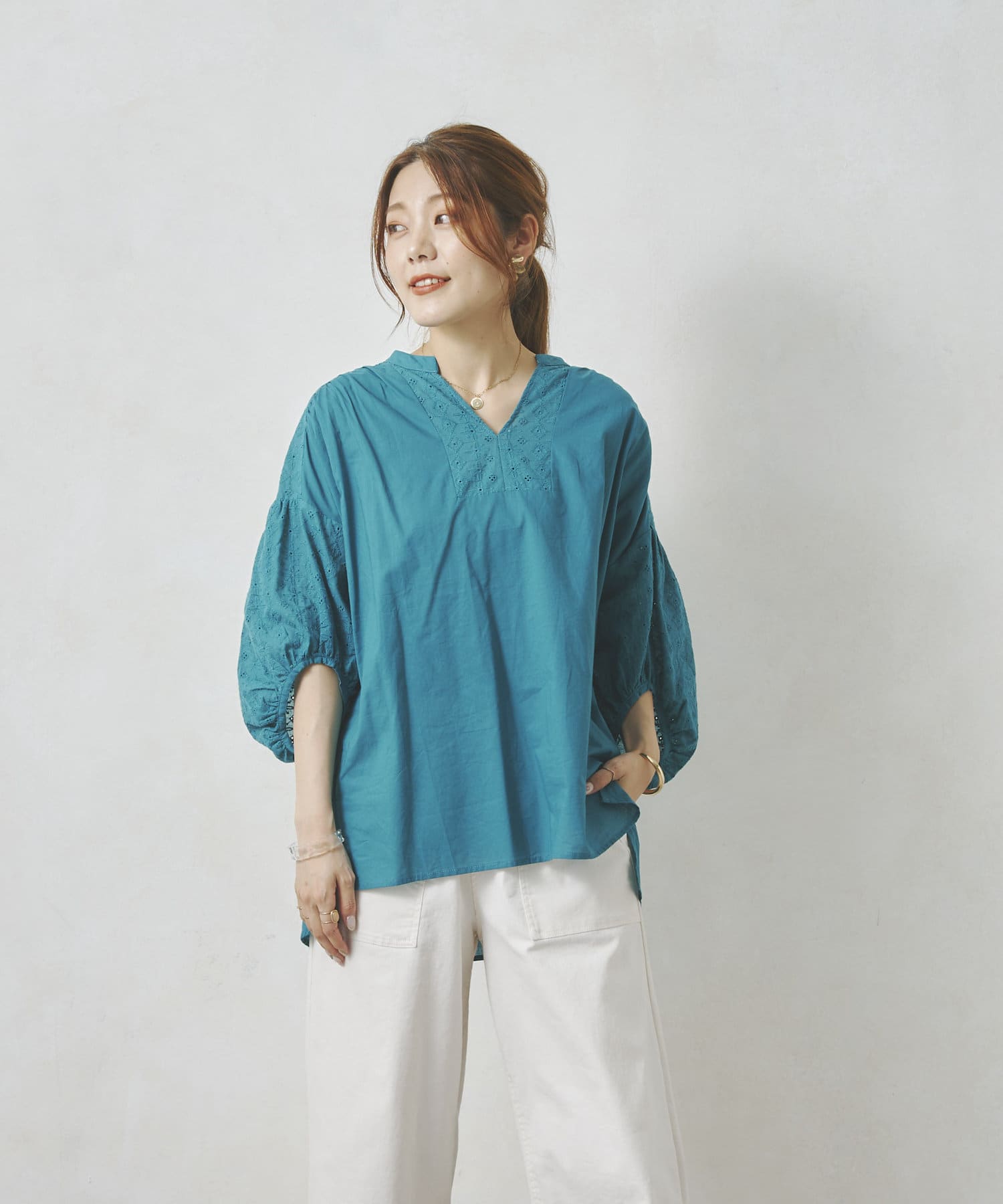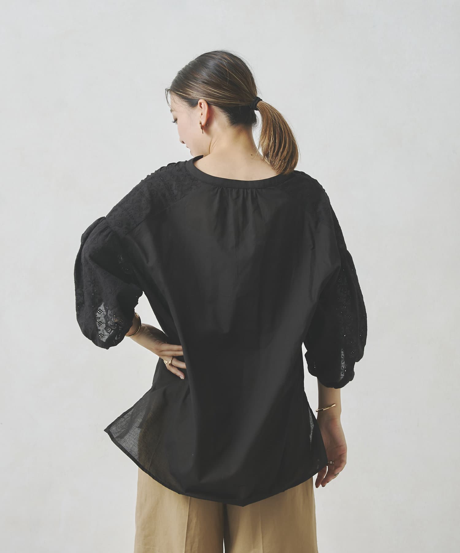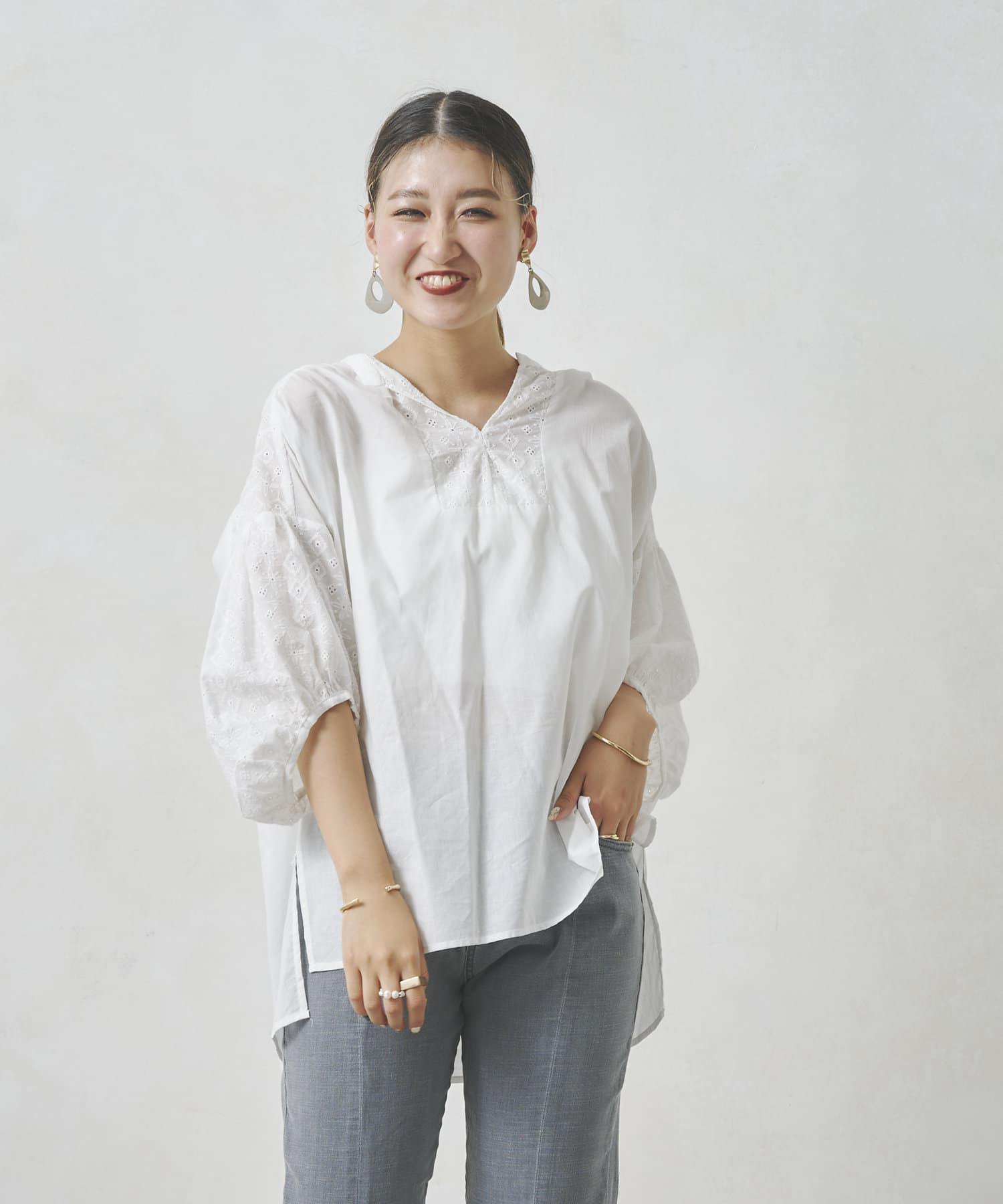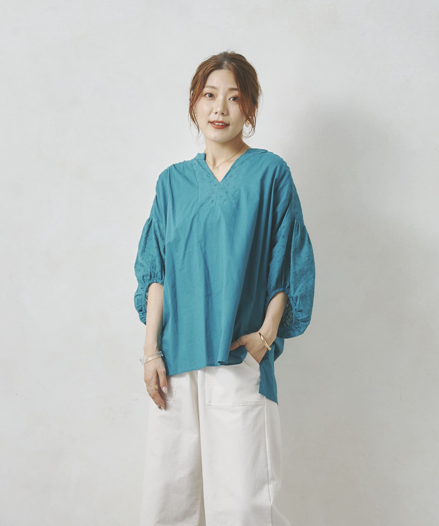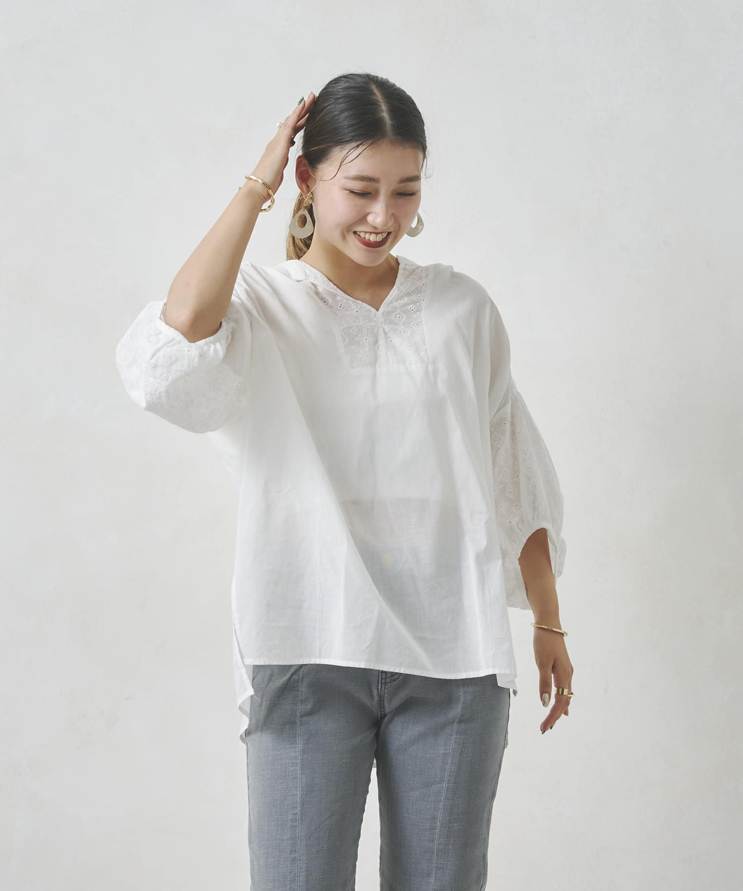 清涼感のある綿素材とバルーンスリーブが女性らしい刺繍ブラウス