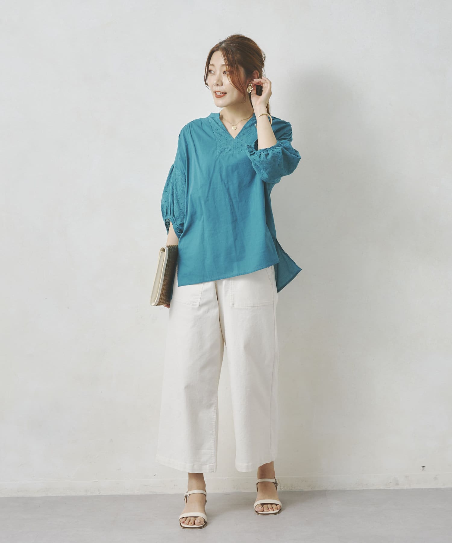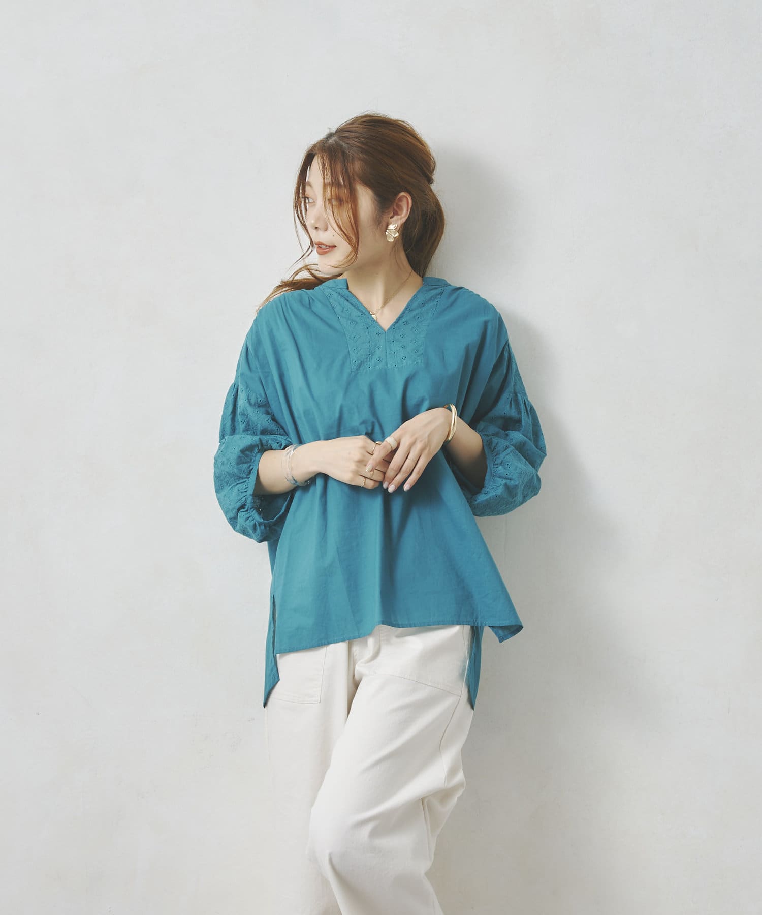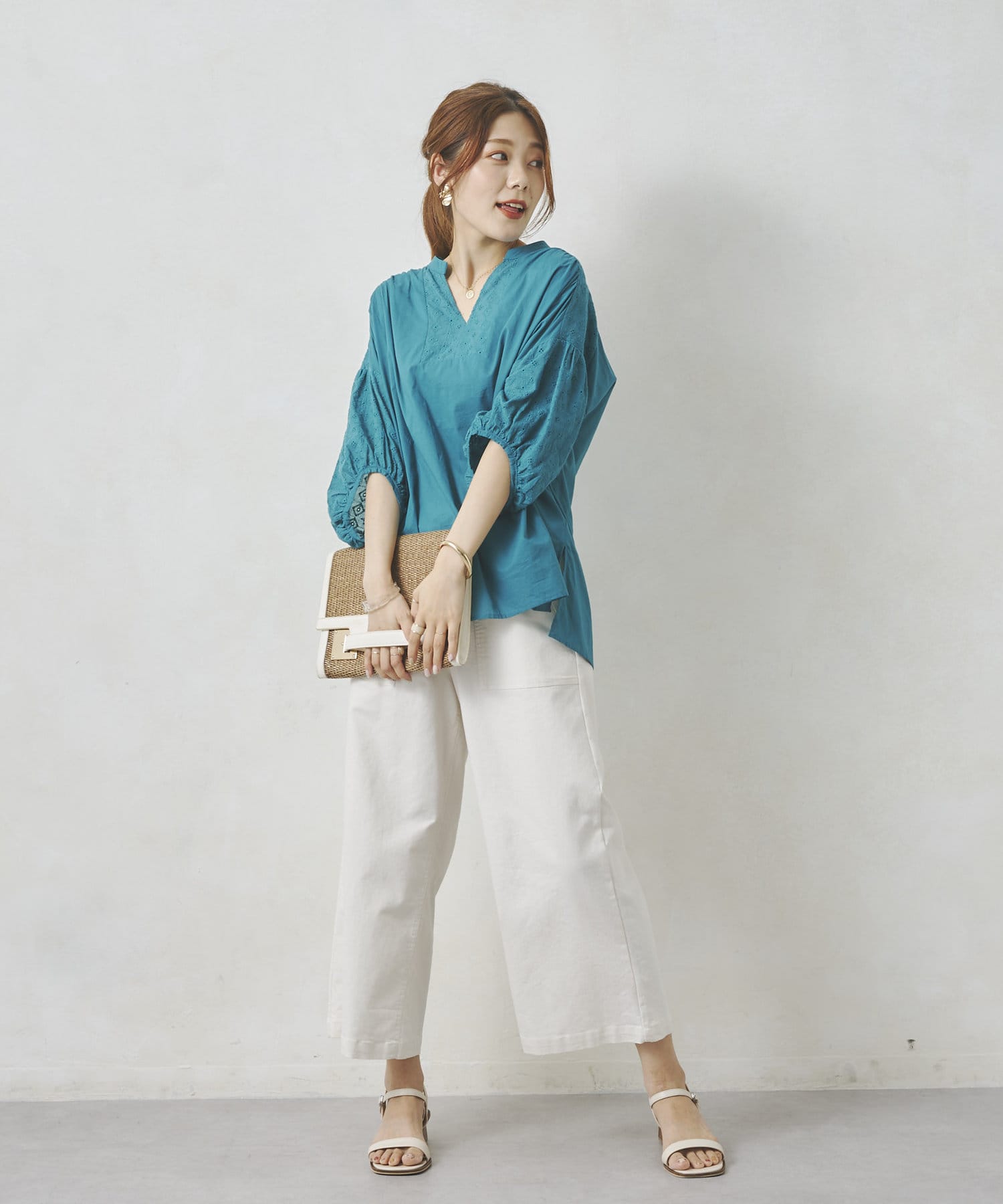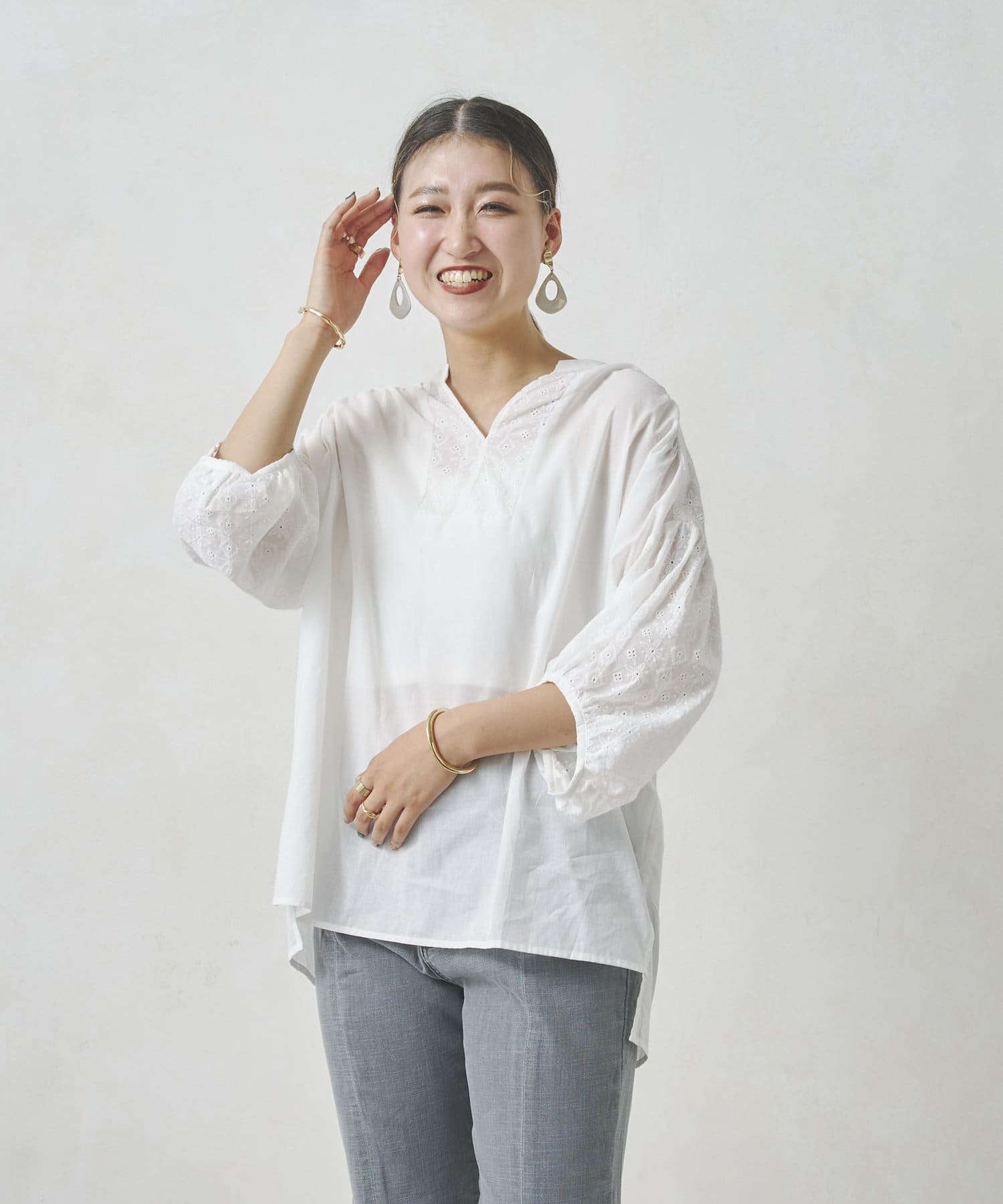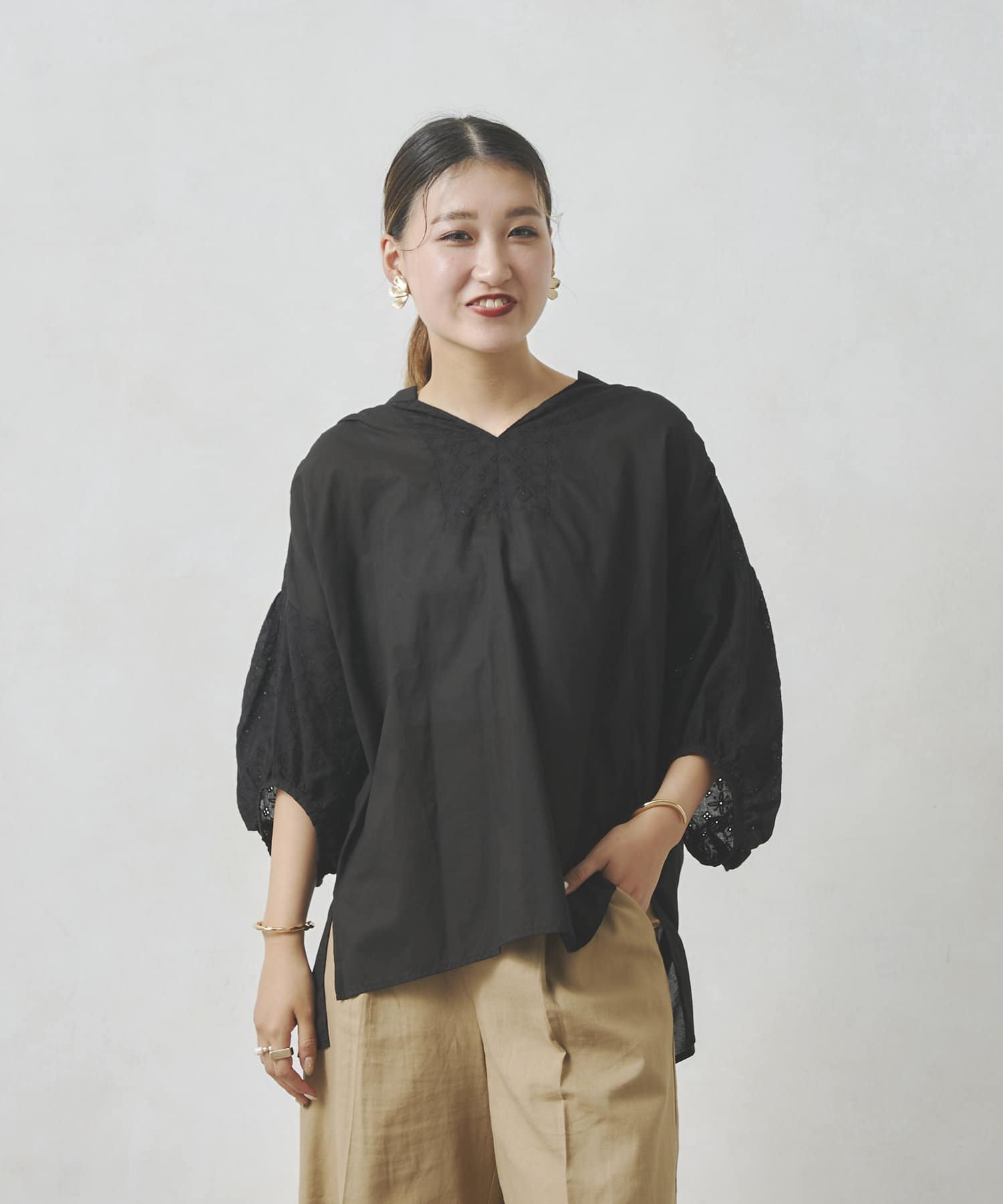 清涼感のある綿素材とバルーンスリーブが女性らしい刺繍ブラウス