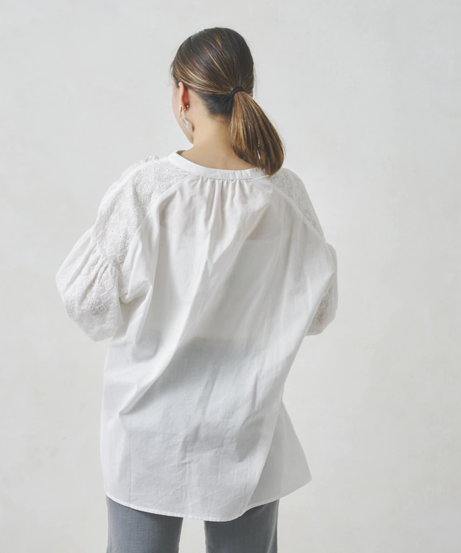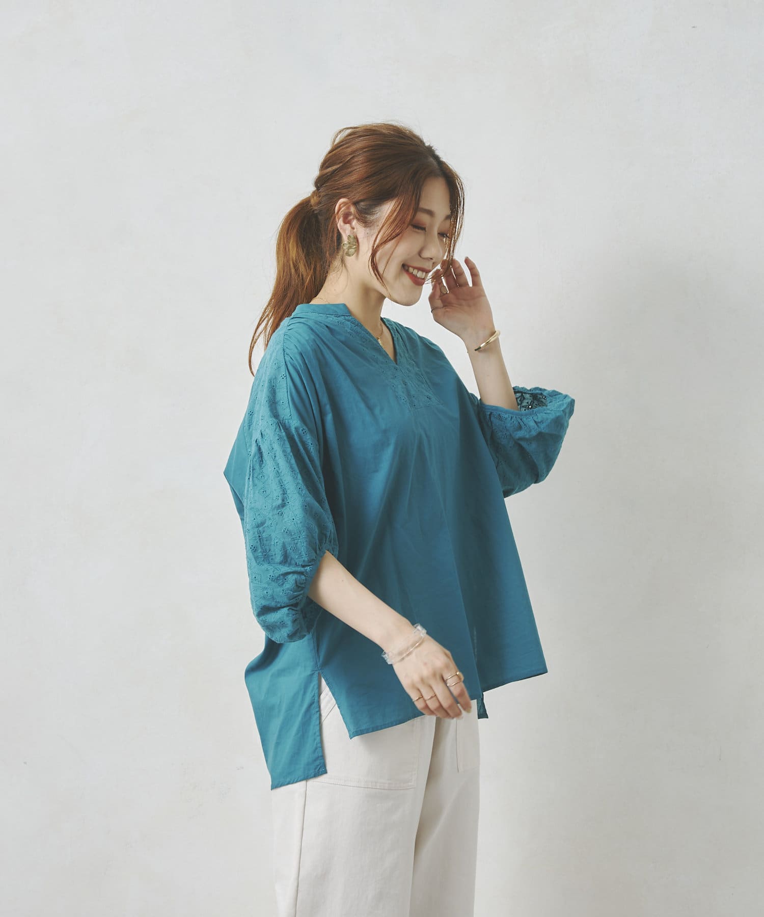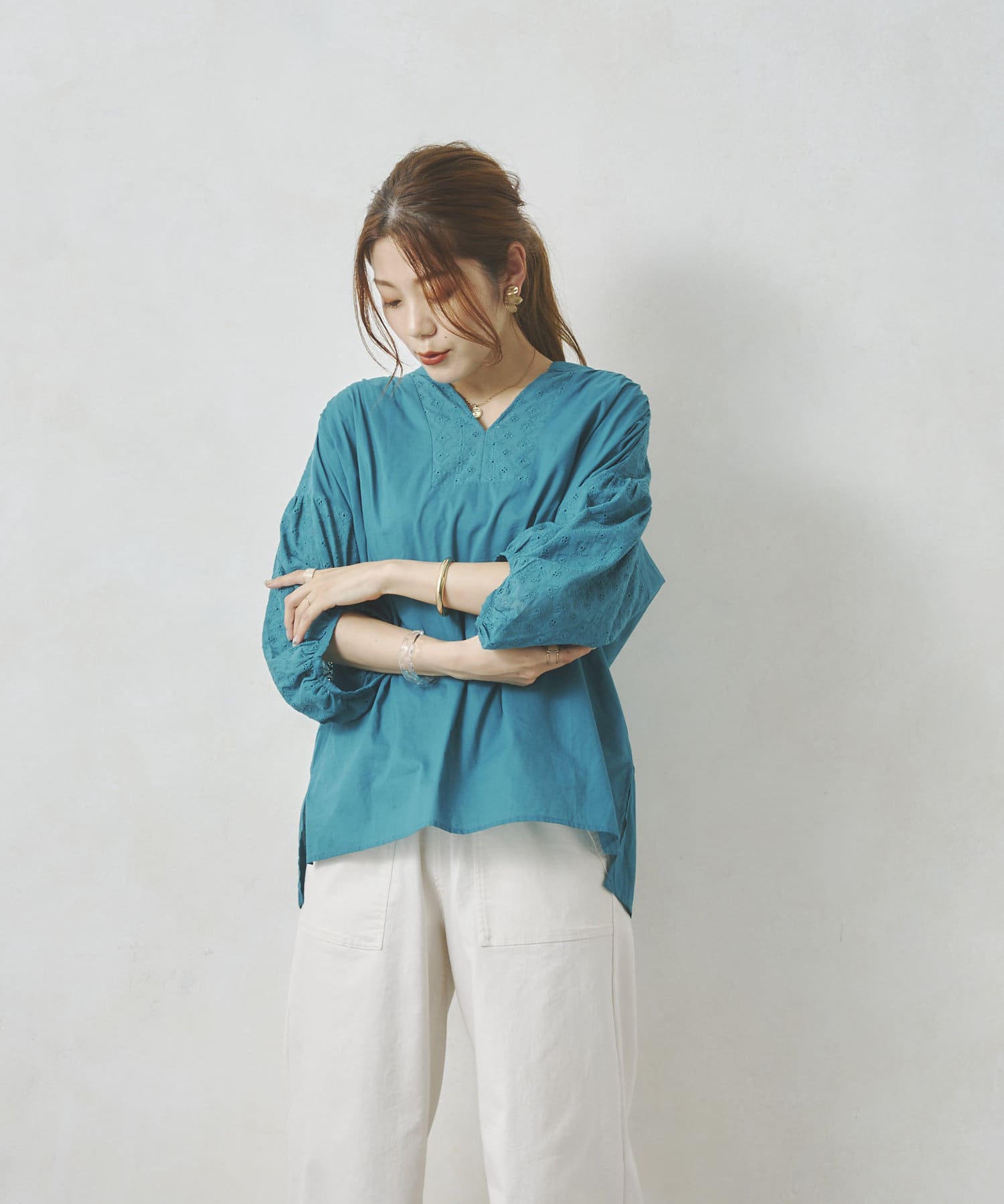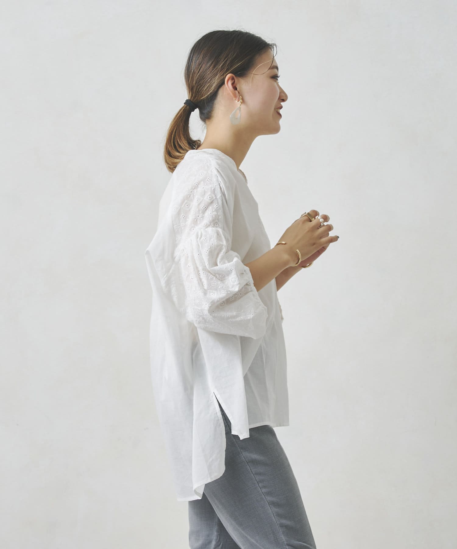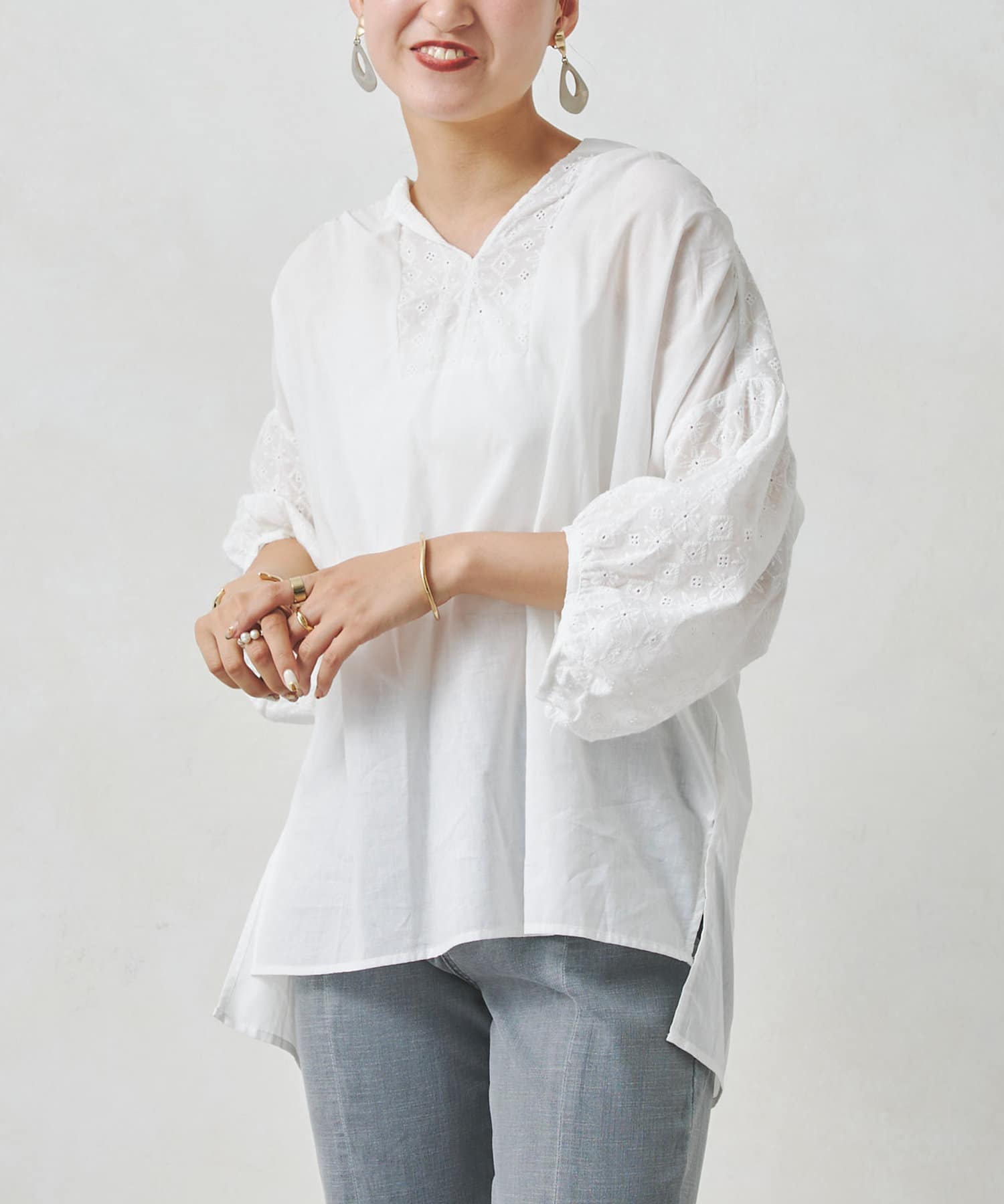 清涼感のある綿素材とバルーンスリーブが女性らしい刺繍ブラウス