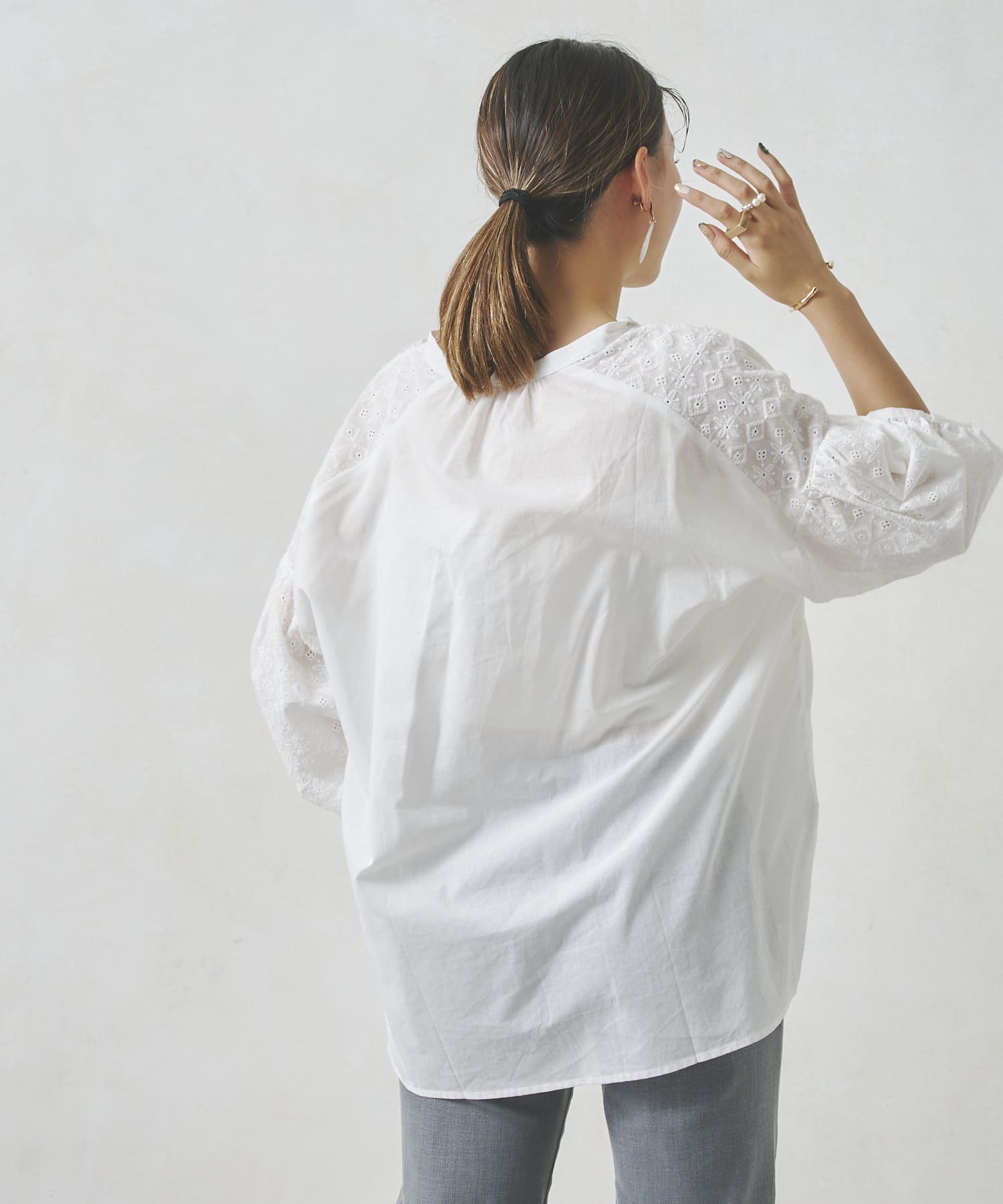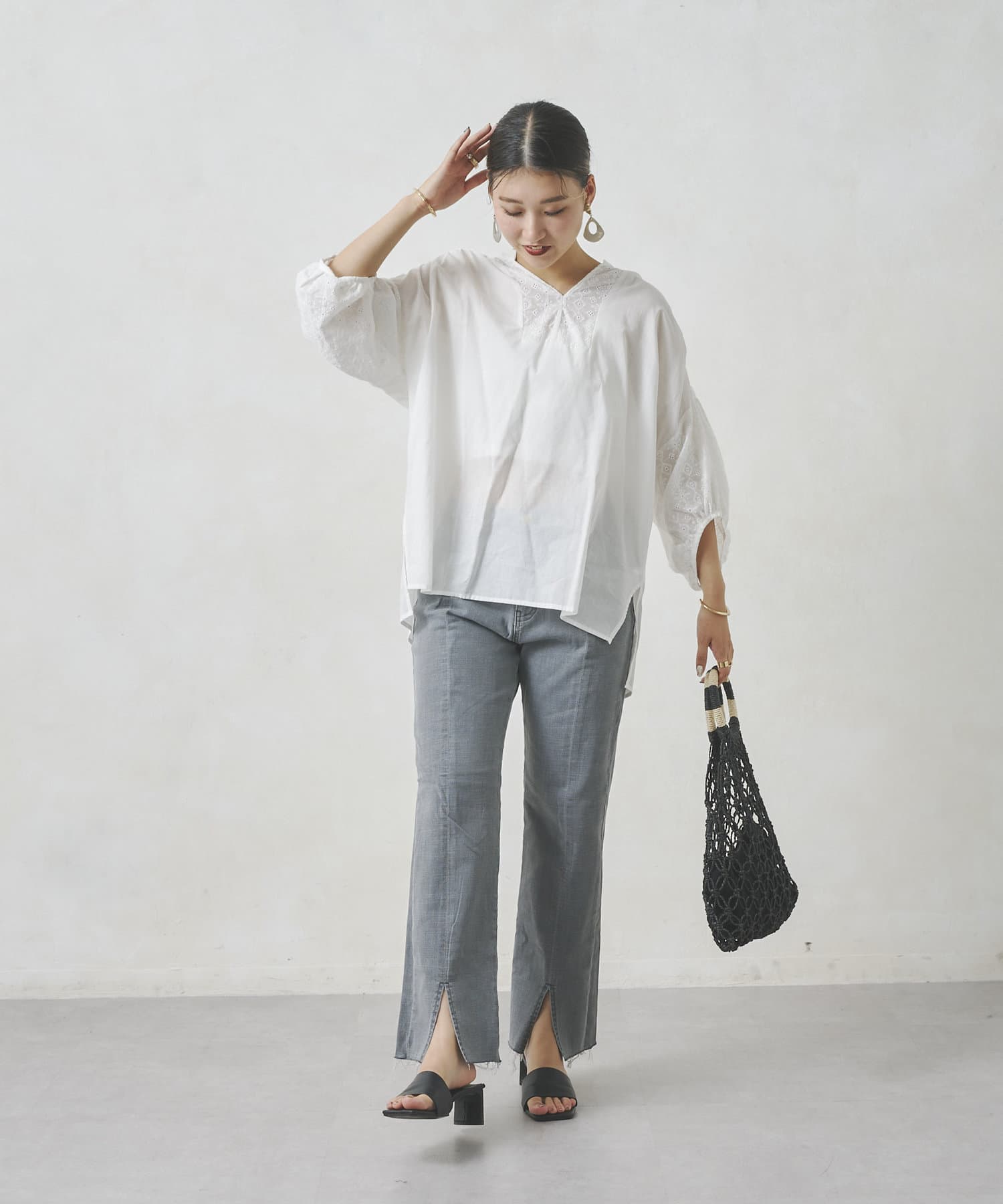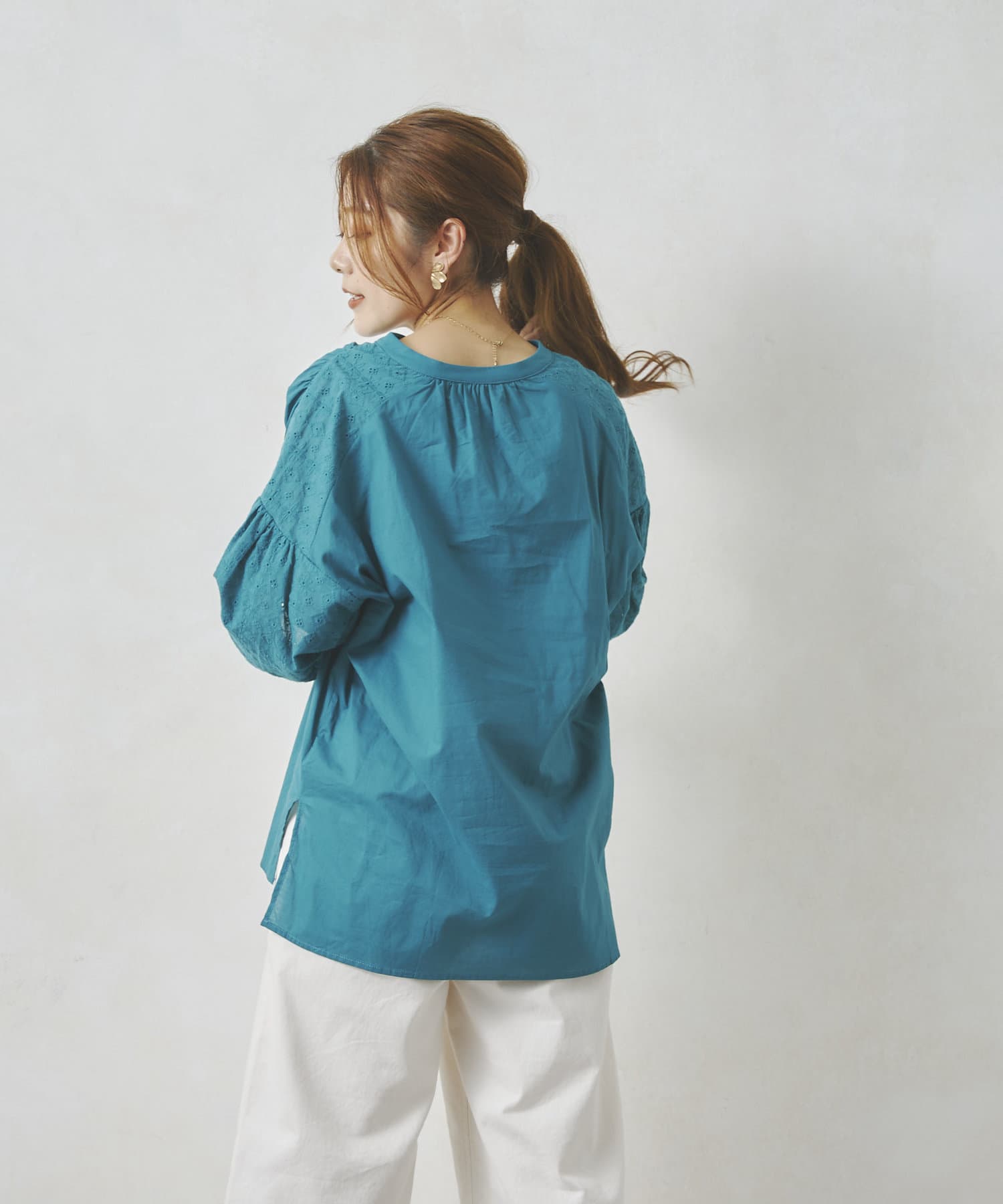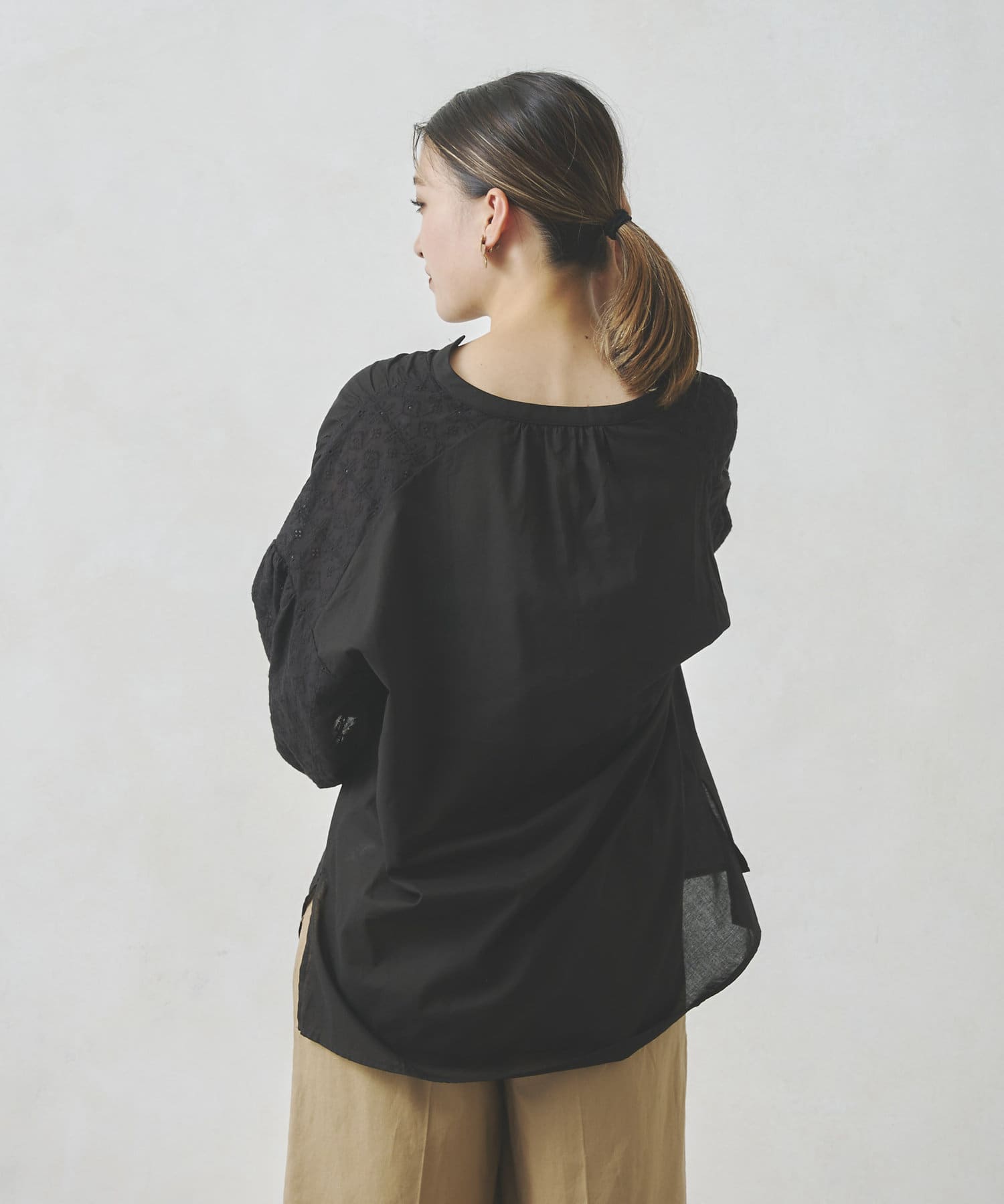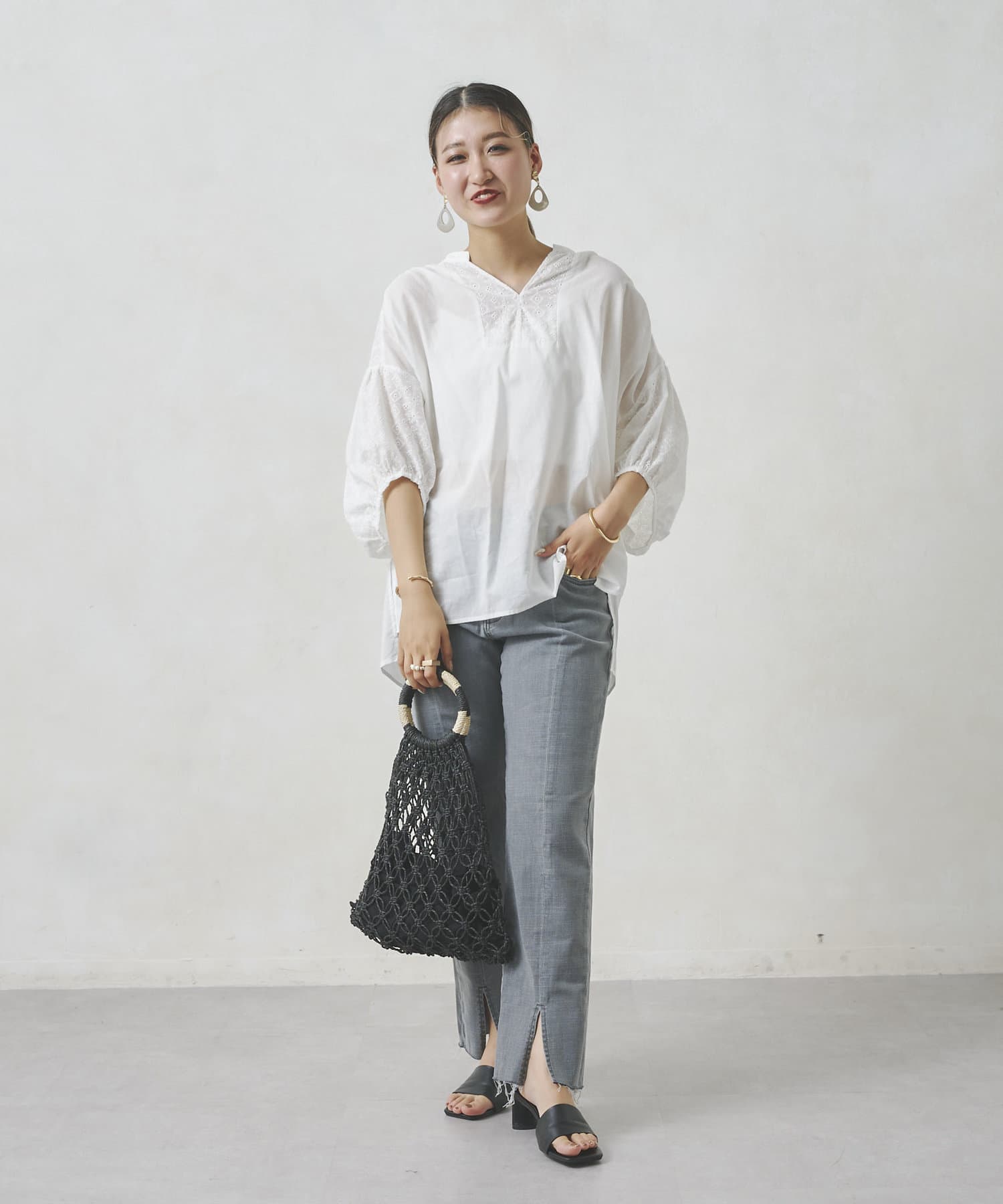 清涼感のある綿素材とバルーンスリーブが女性らしい刺繍ブラウス