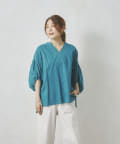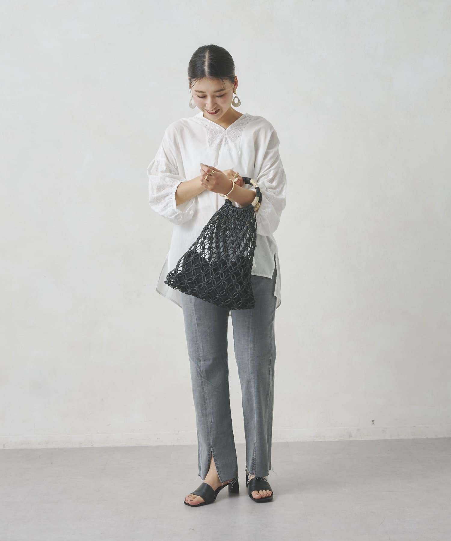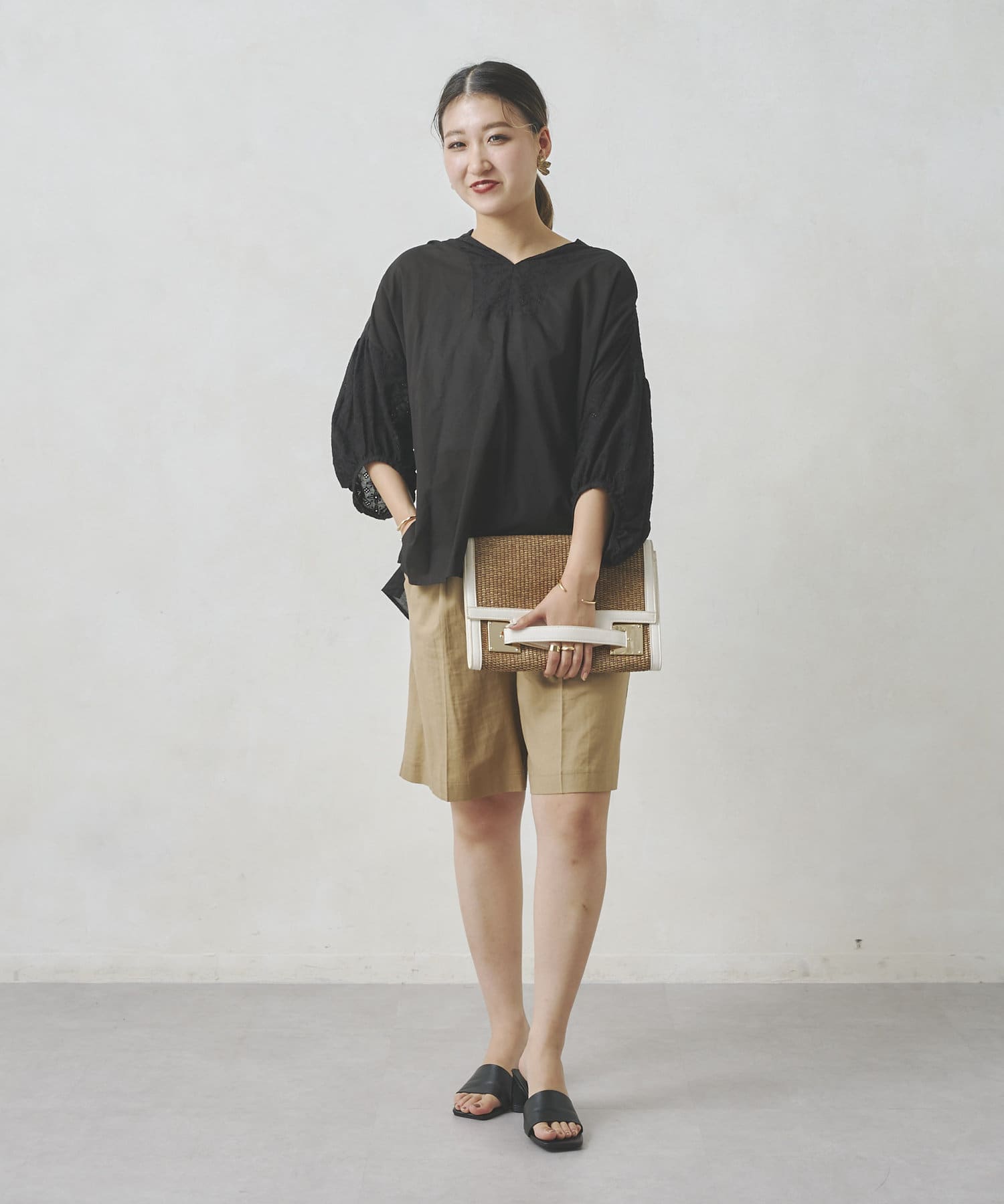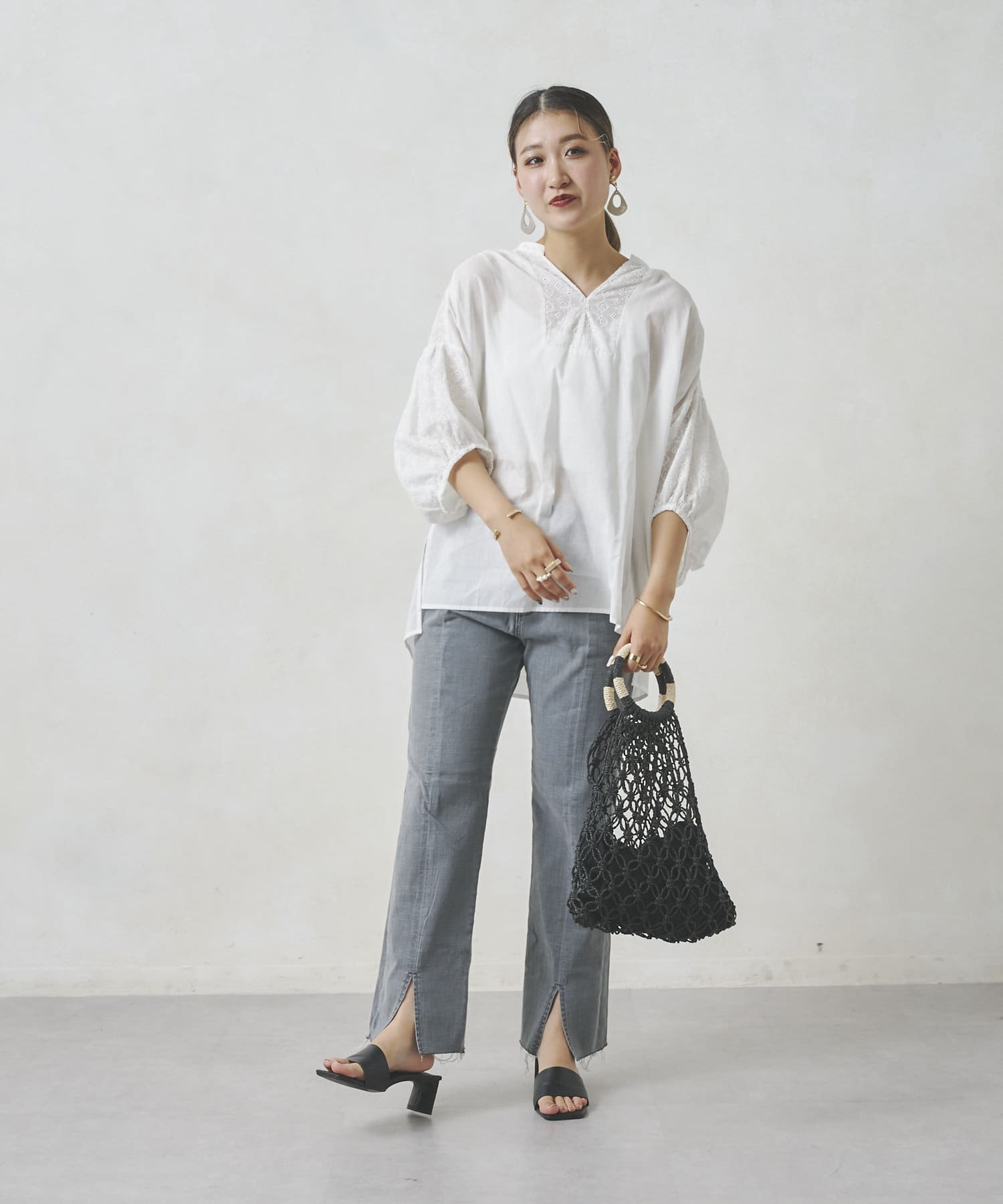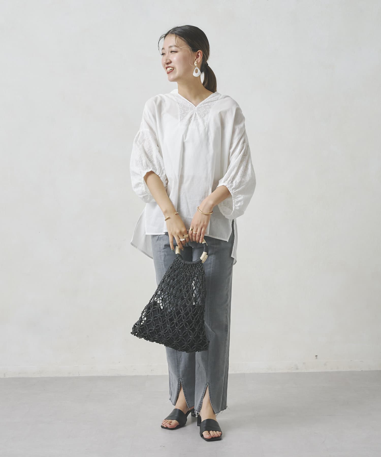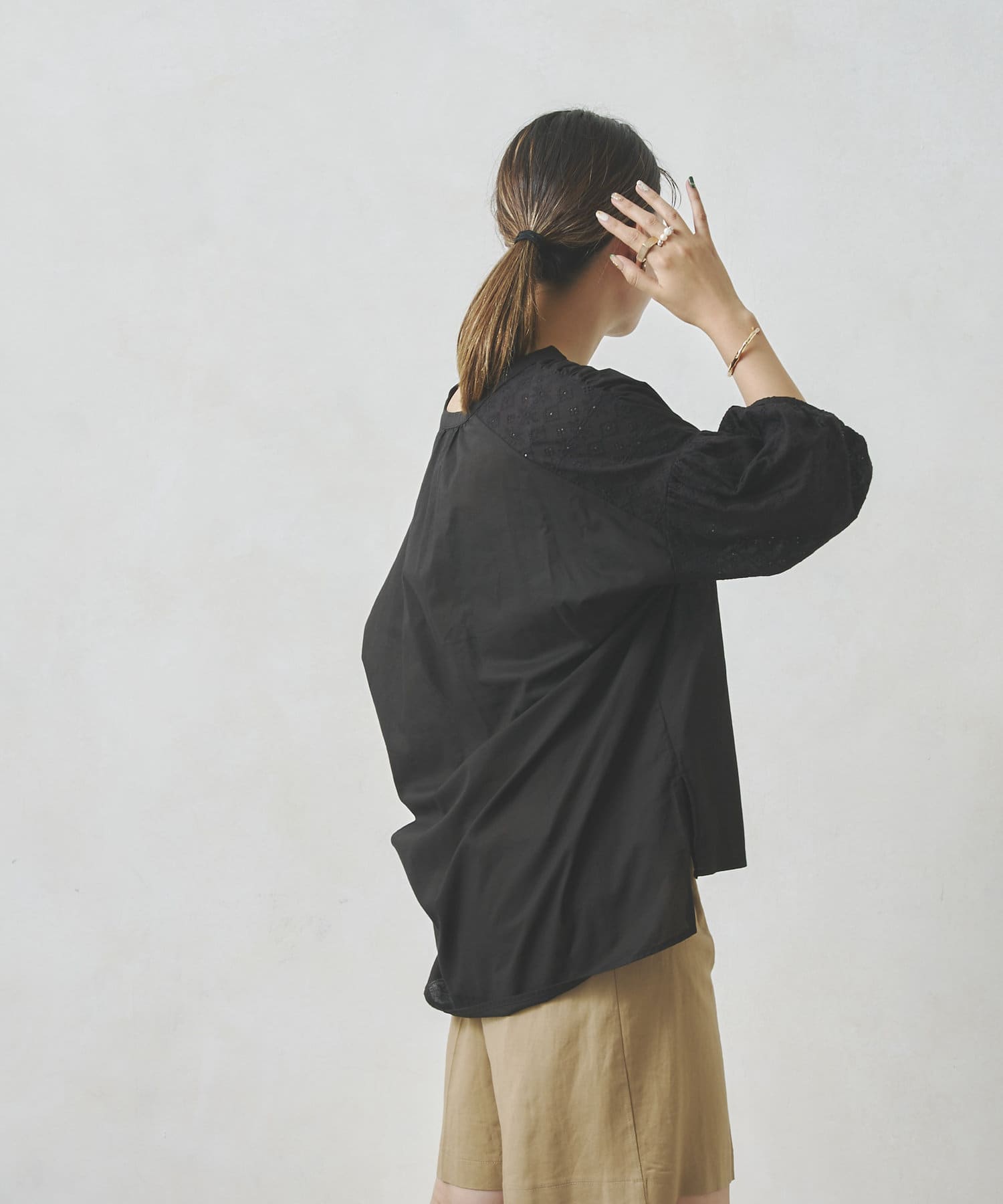清涼感のある綿素材とバルーンスリーブが女性らしい刺繍ブラウス