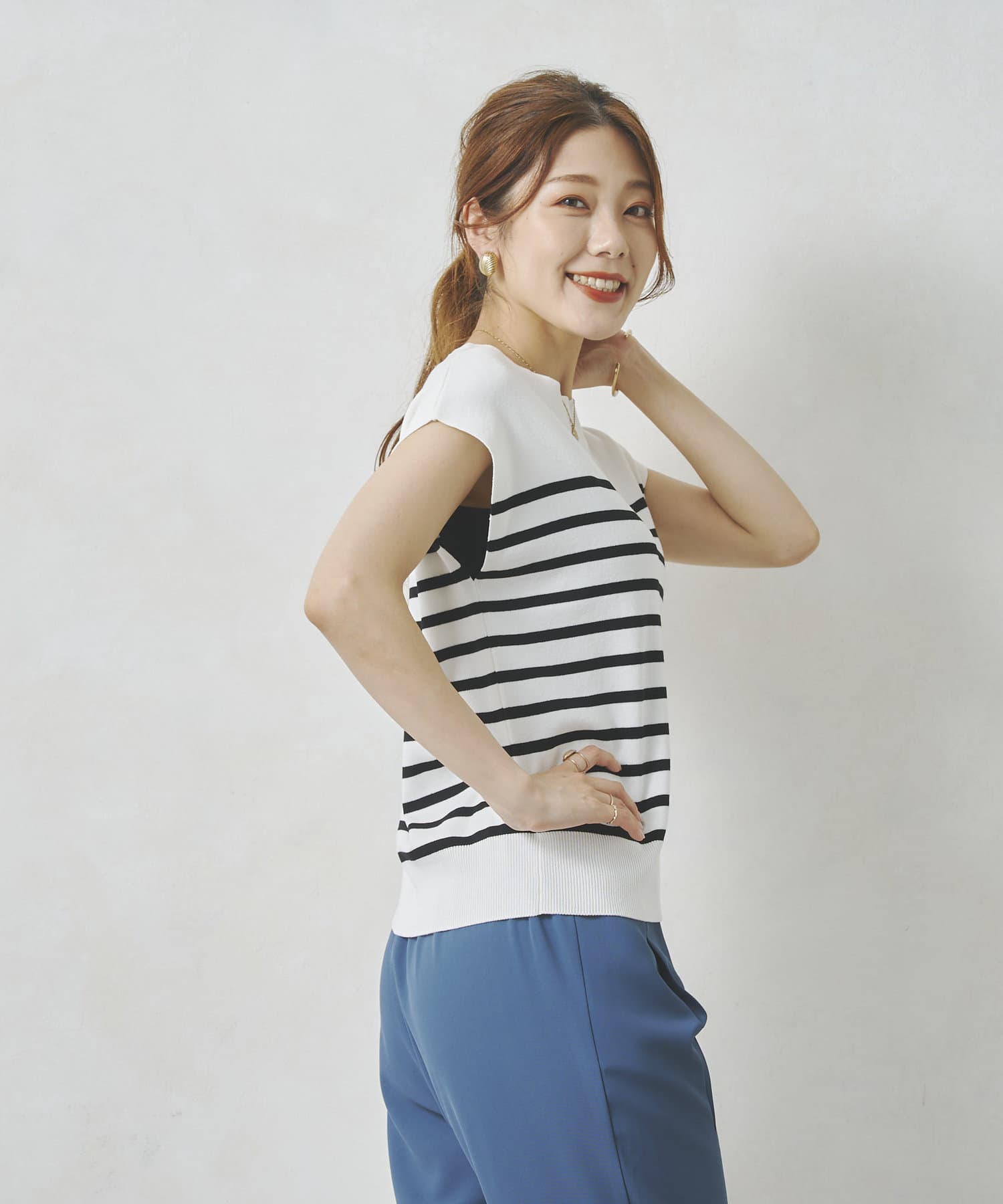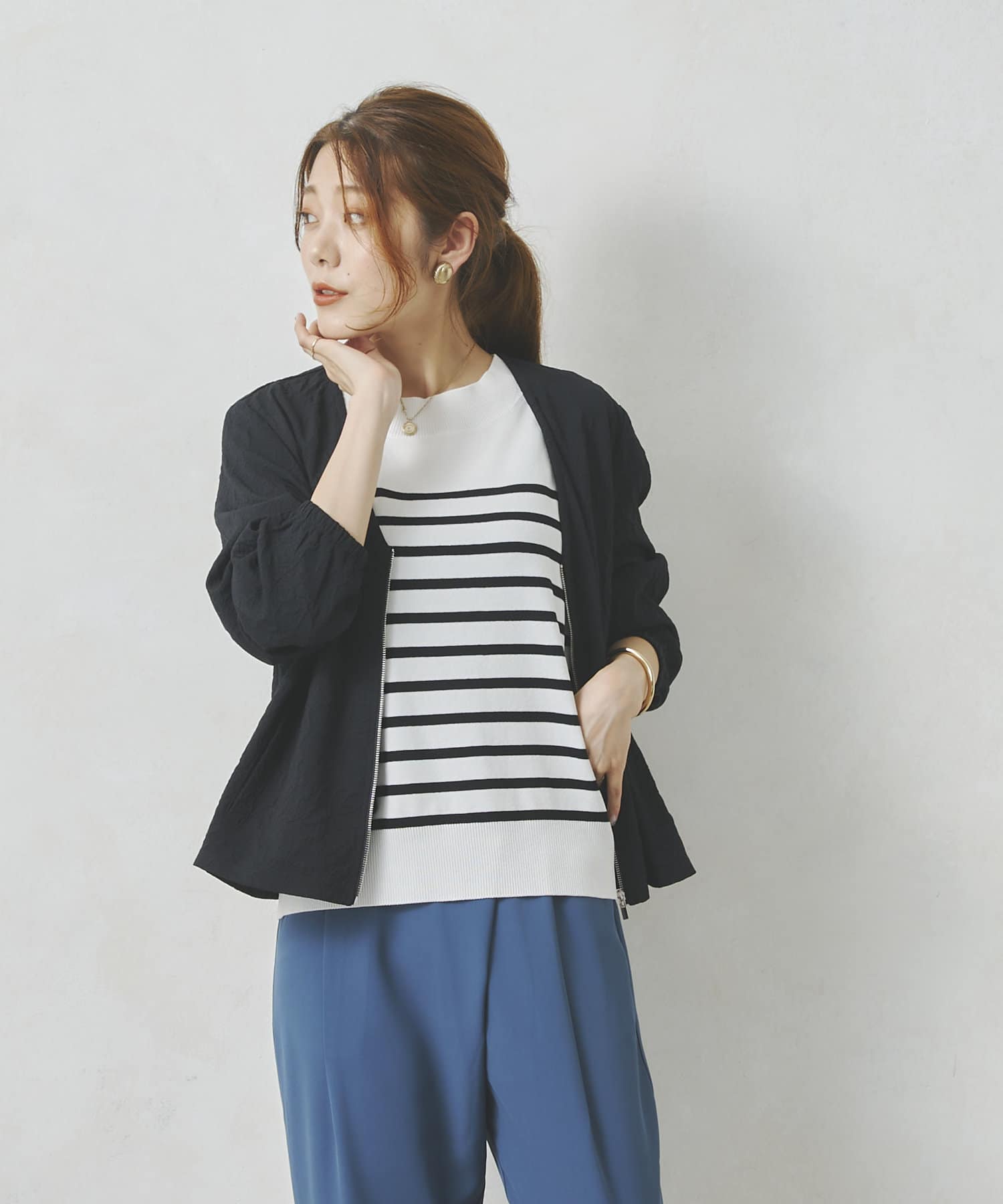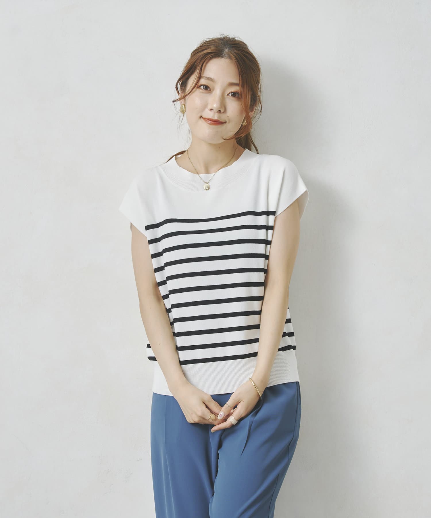 大人っぽくボーダーが着られて、周りの反応も良かったです。ただ襟元は伸びたようなシワが最初からあるので、何度か来ていくうちに襟は寄れていくのだろうなとちょっと心配です。