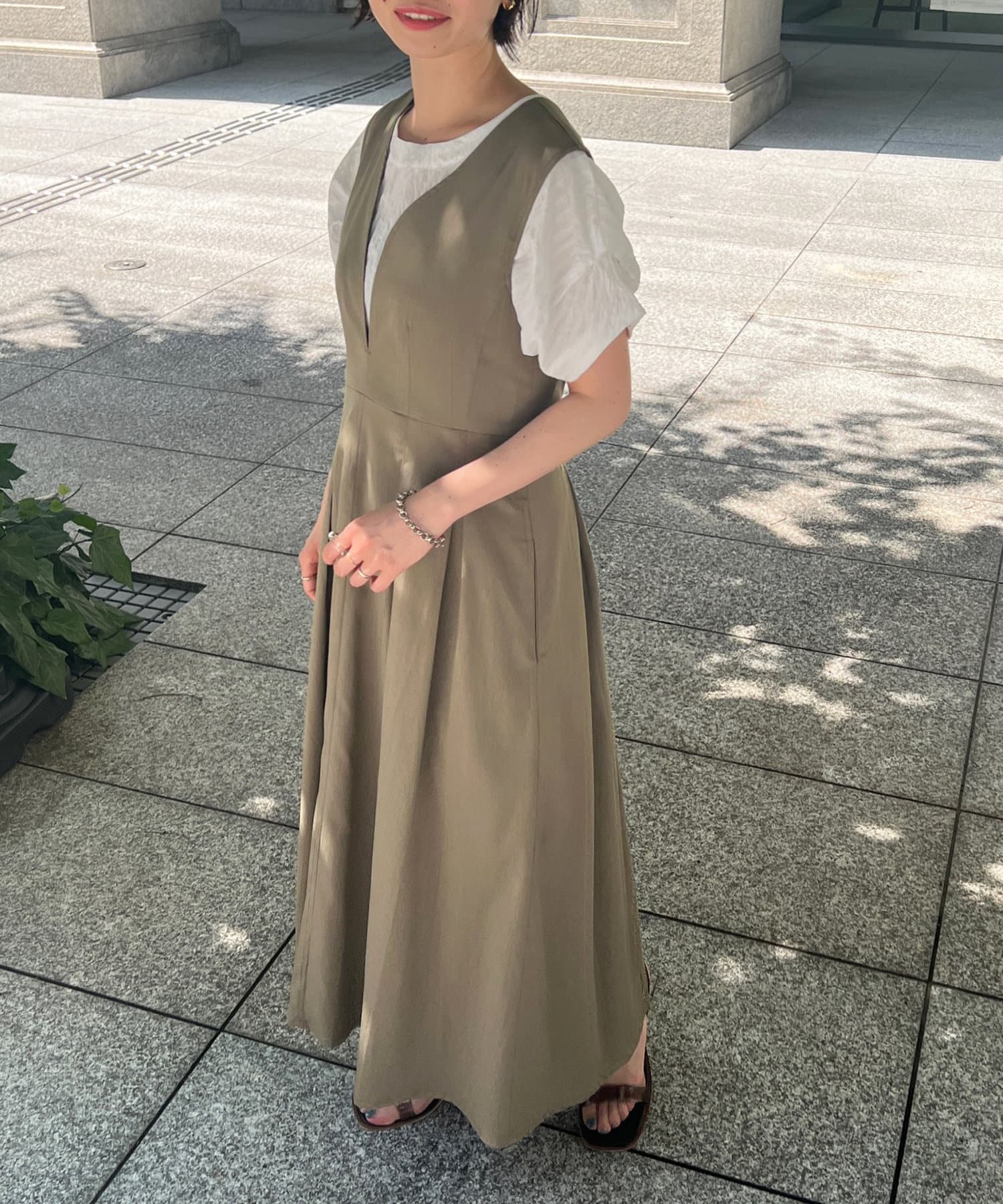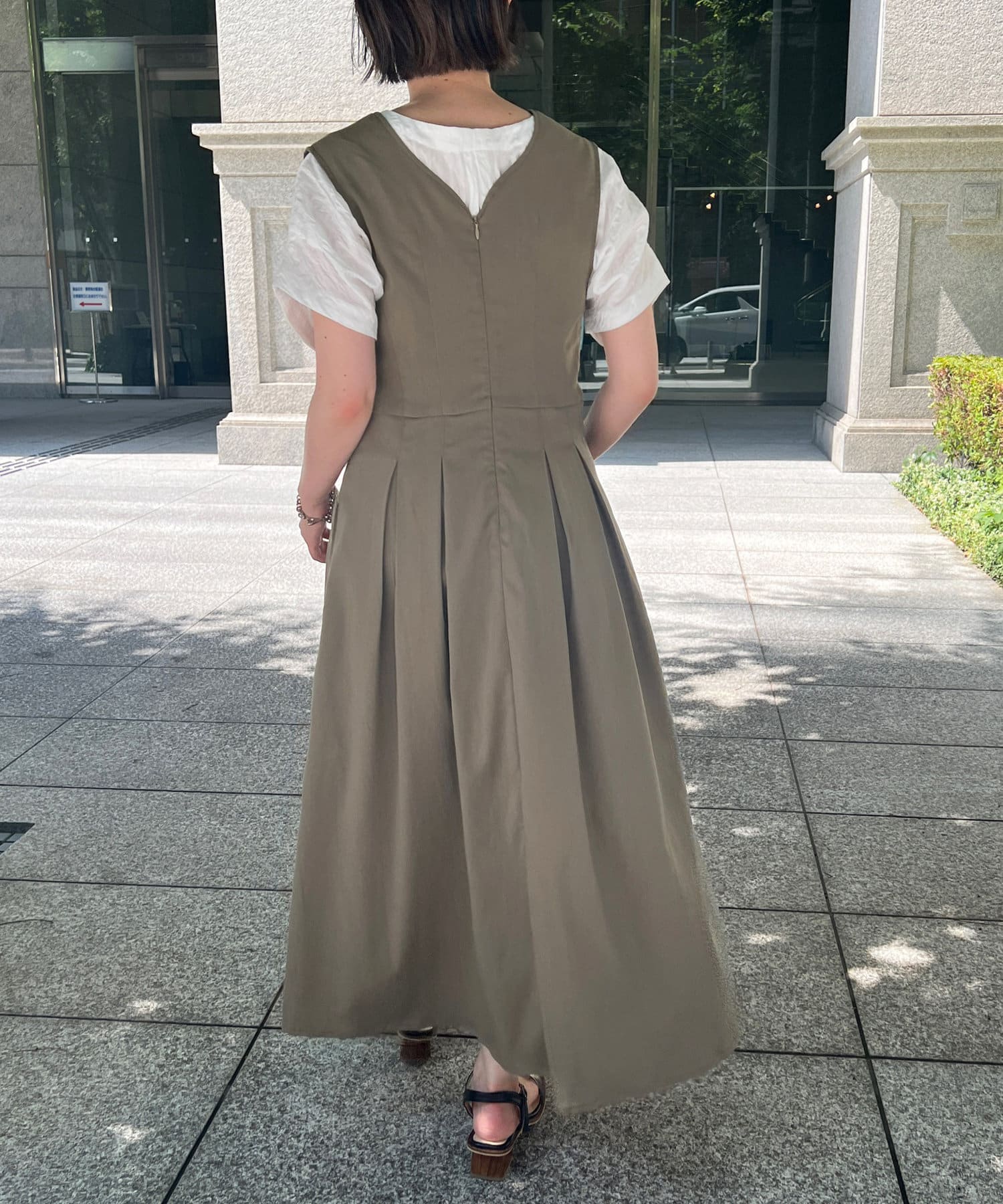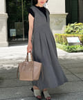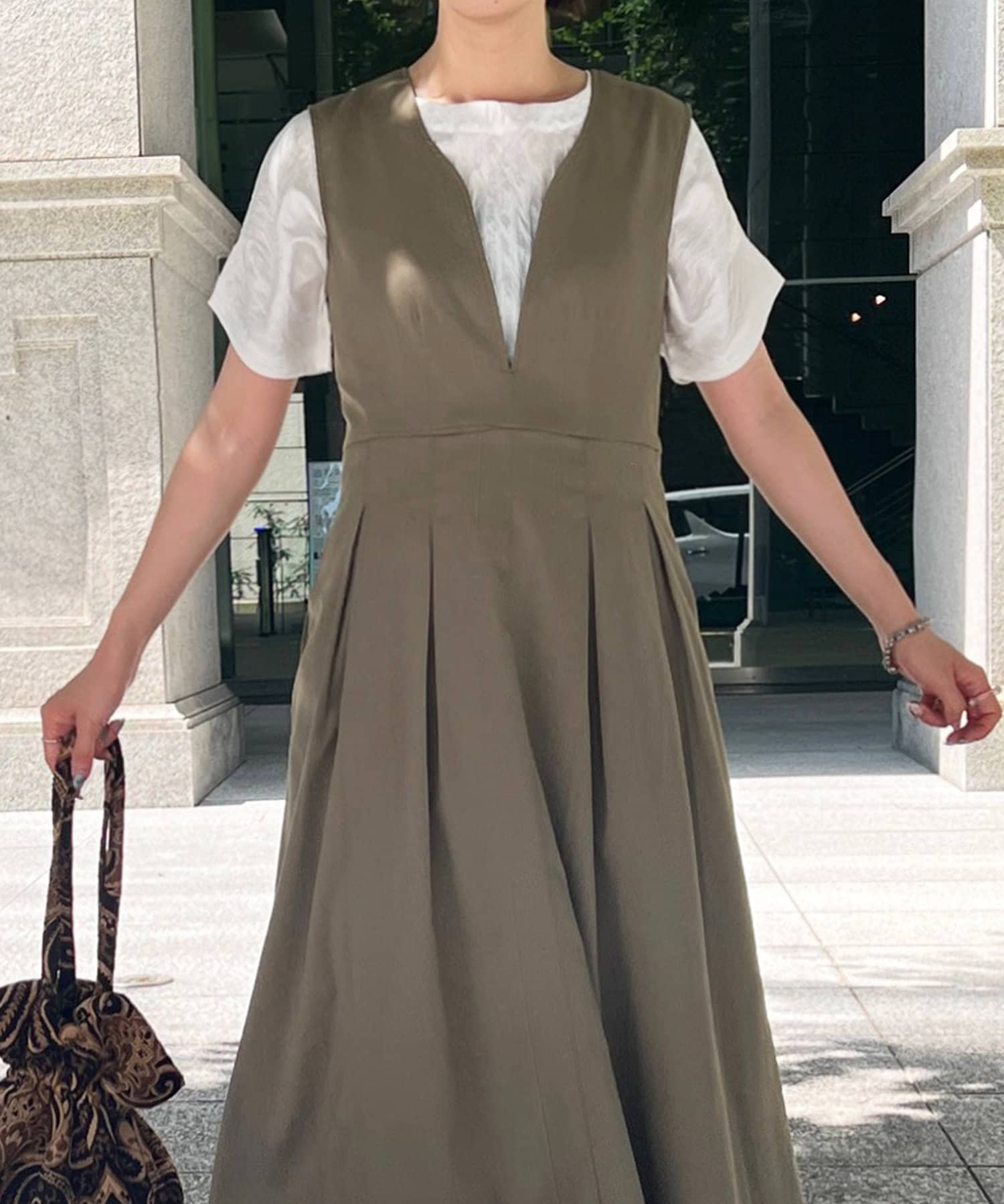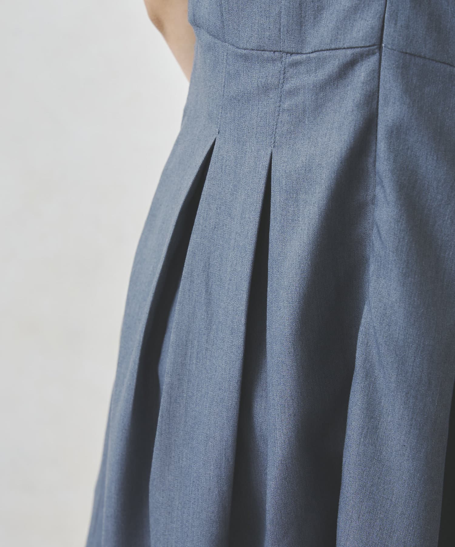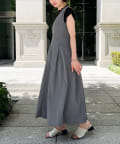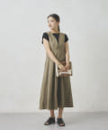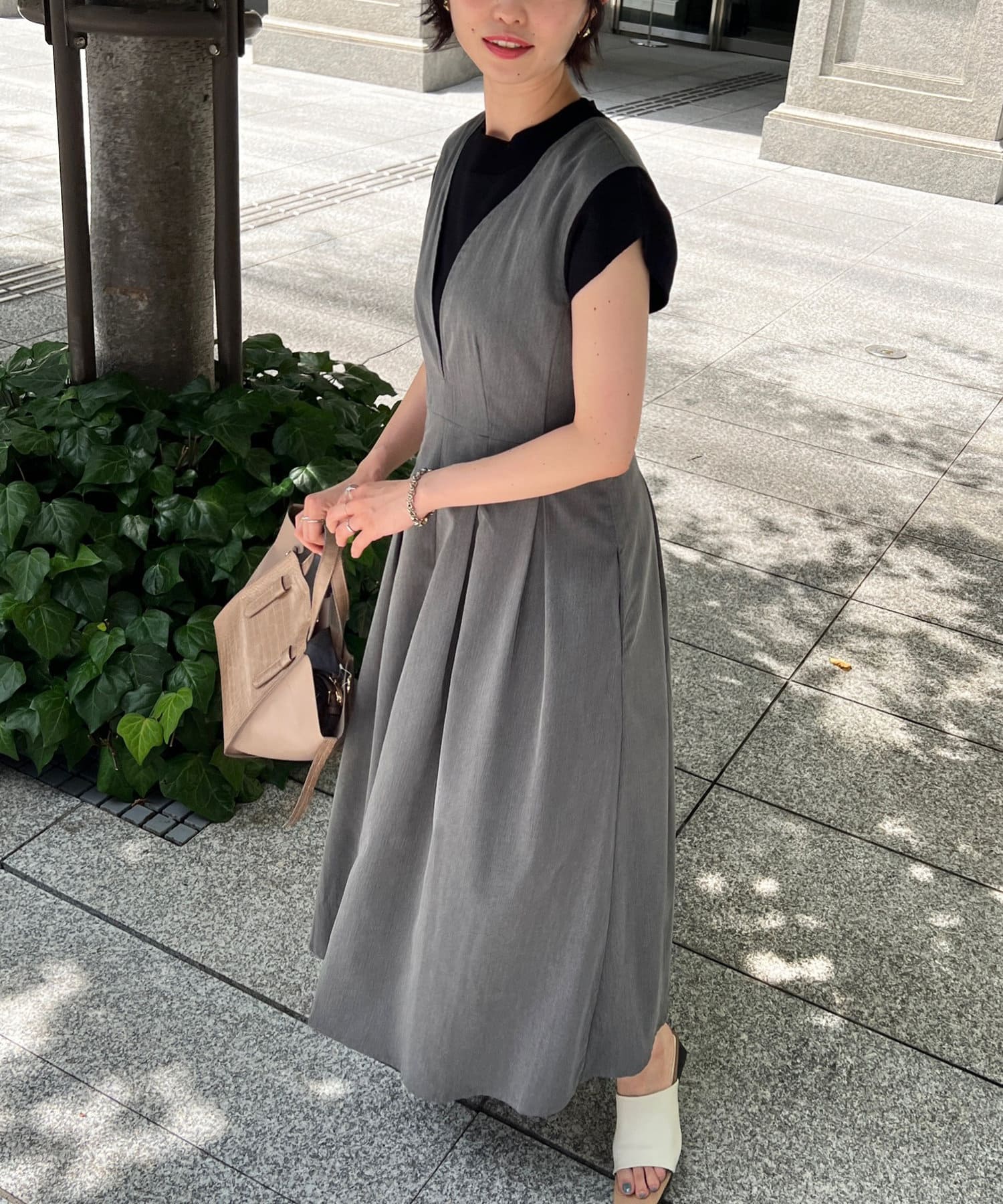 ・胸下切替から広がるドラマティックなタックフレアシルエットも女性らしさを後押し。