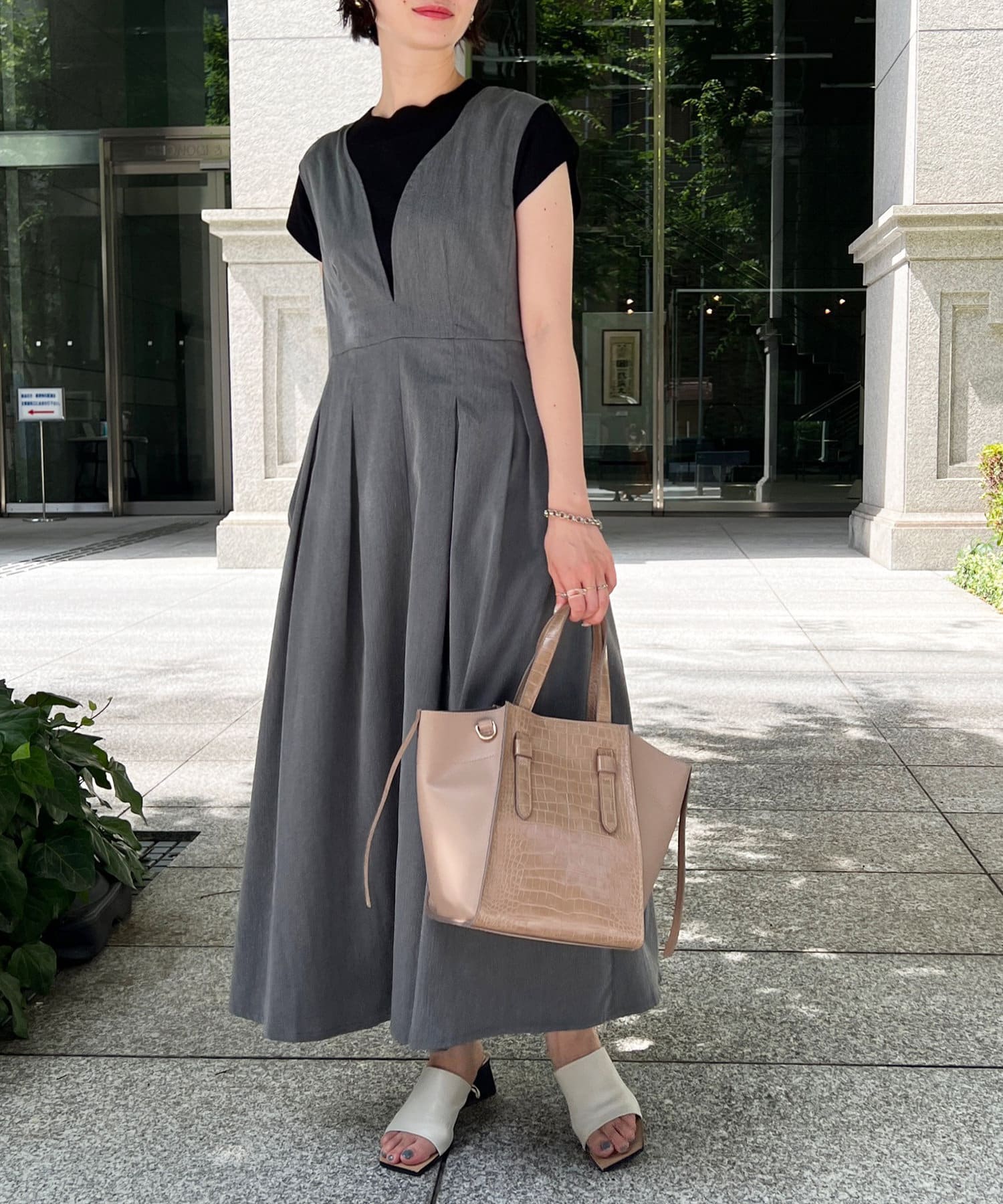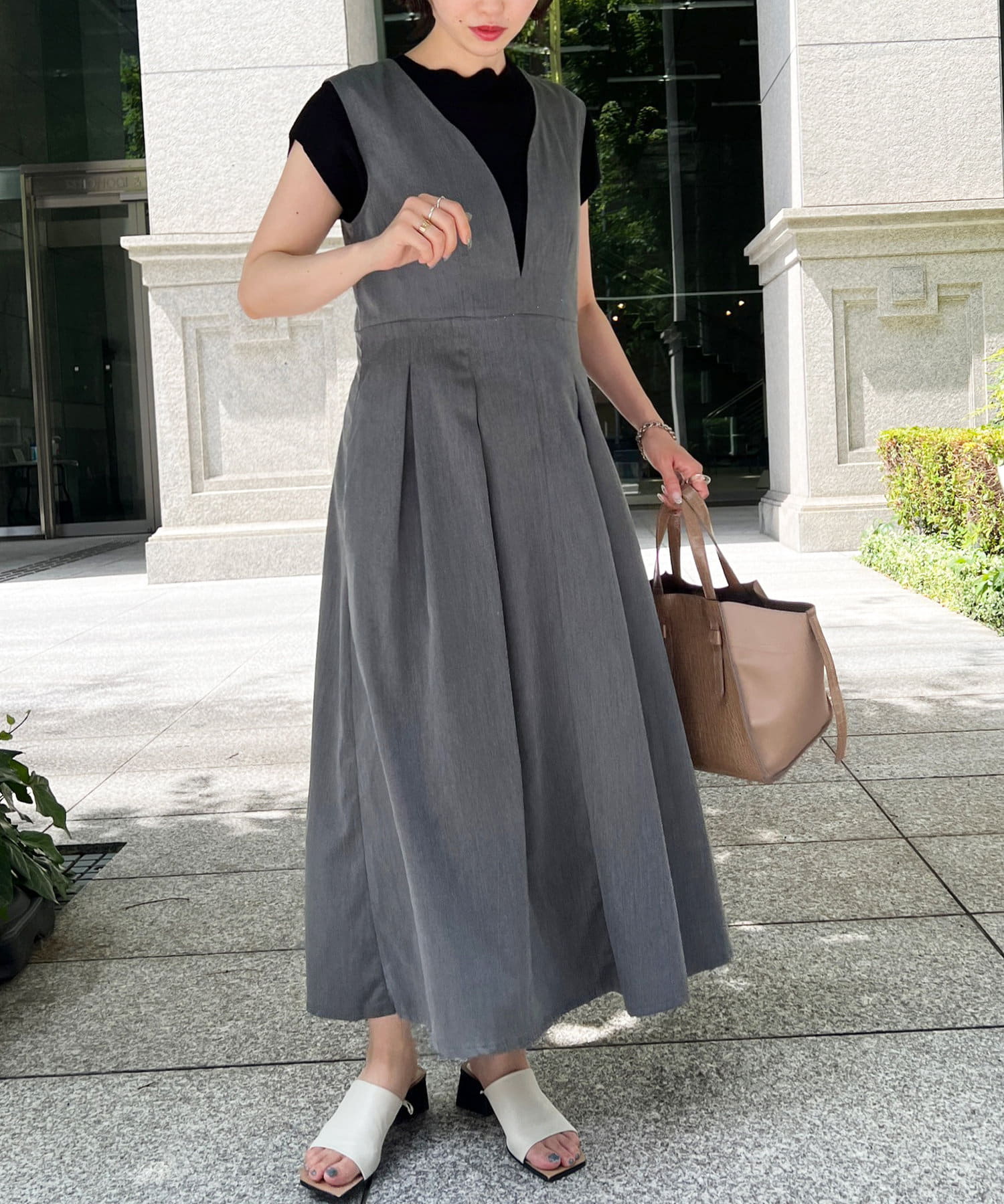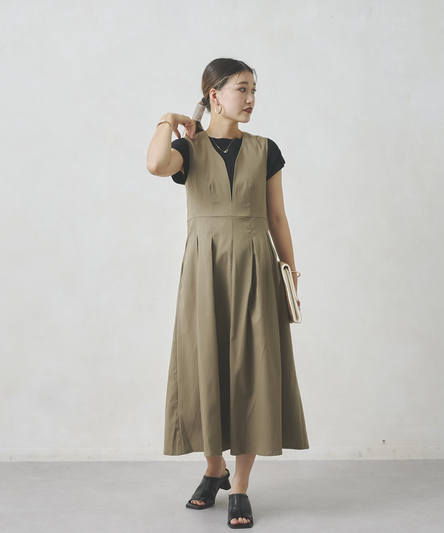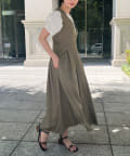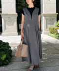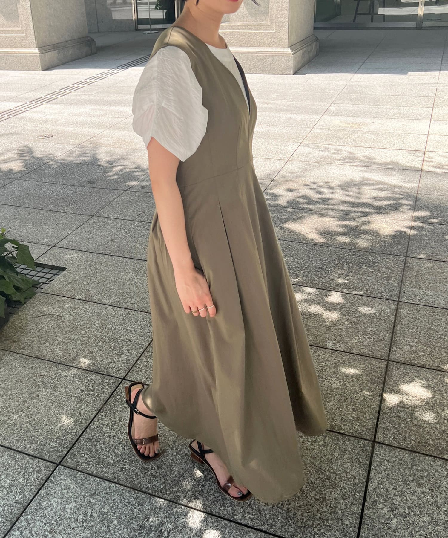 ・胸下切替から広がるドラマティックなタックフレアシルエットも女性らしさを後押し。