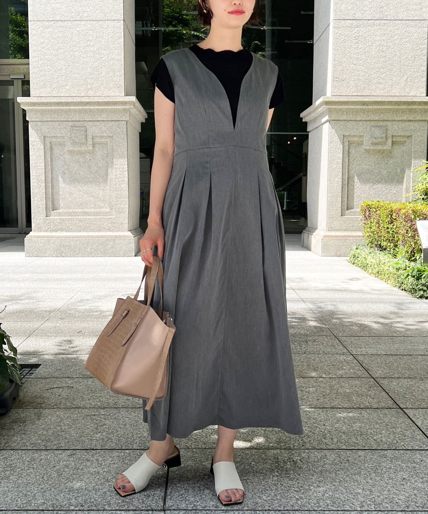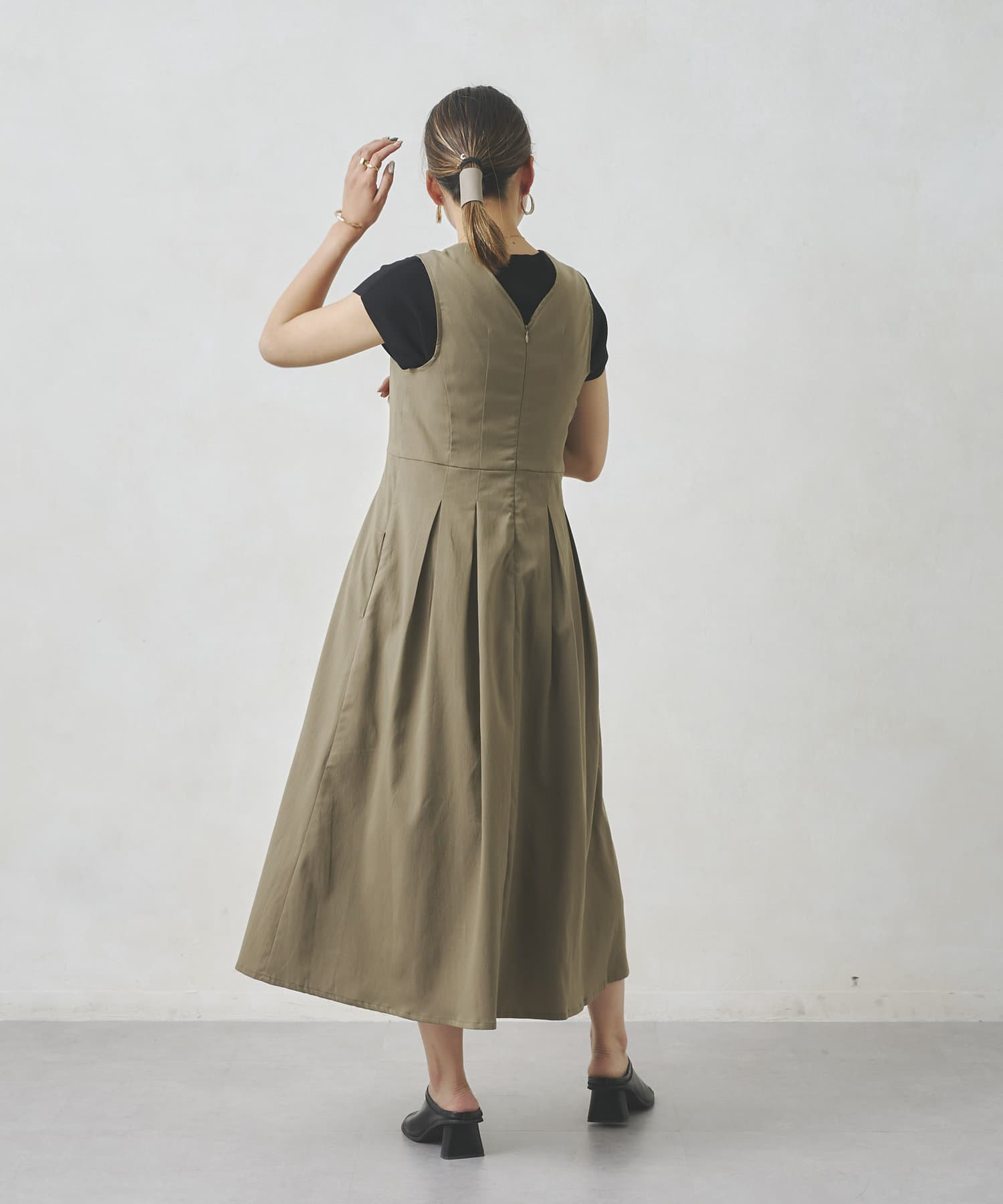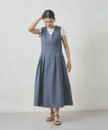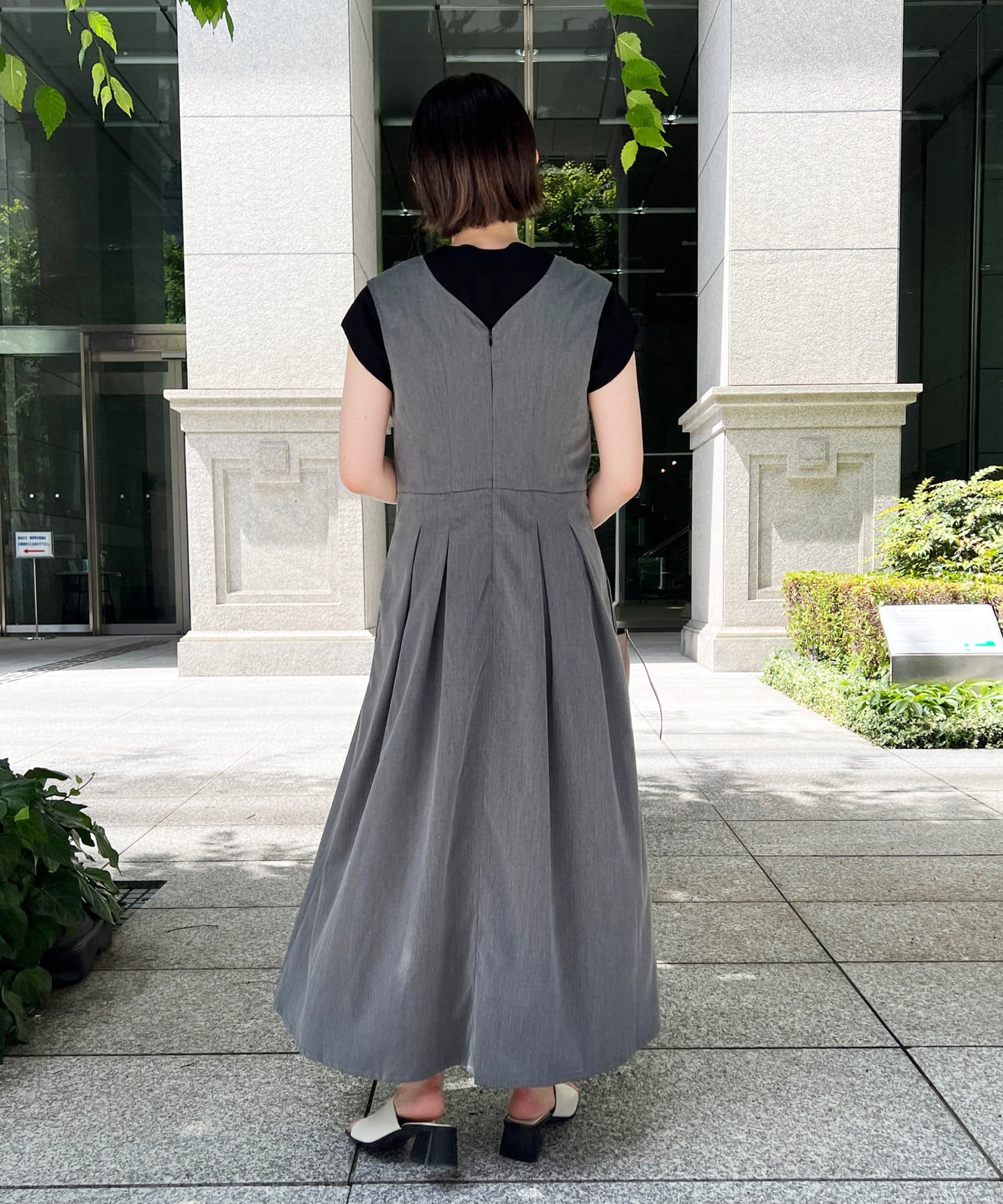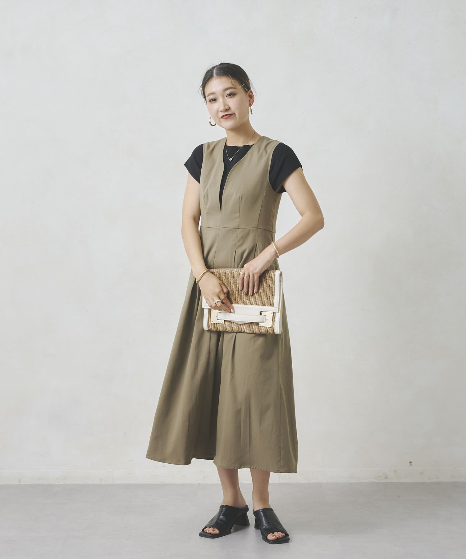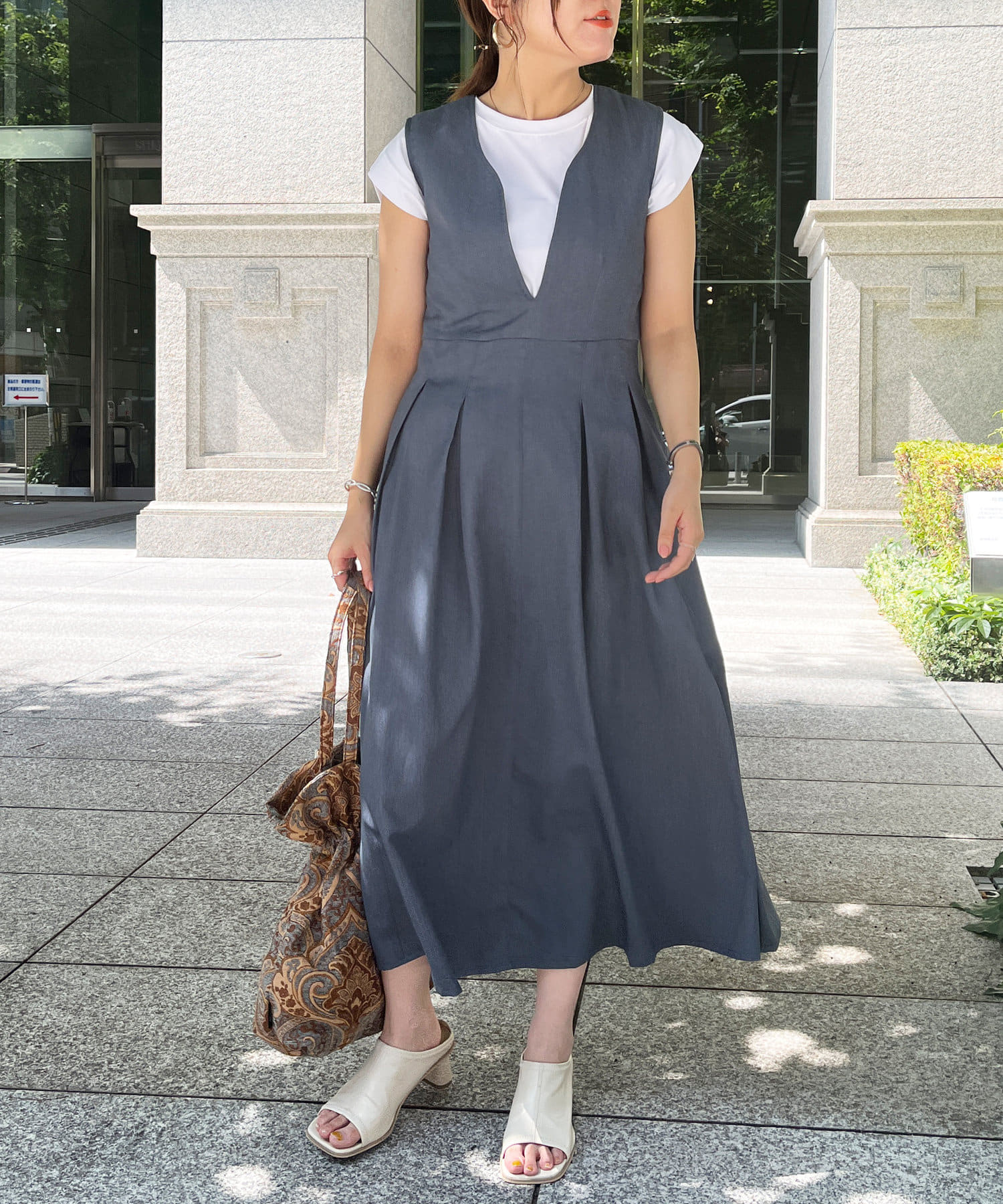 ・胸下切替から広がるドラマティックなタックフレアシルエットも女性らしさを後押し。