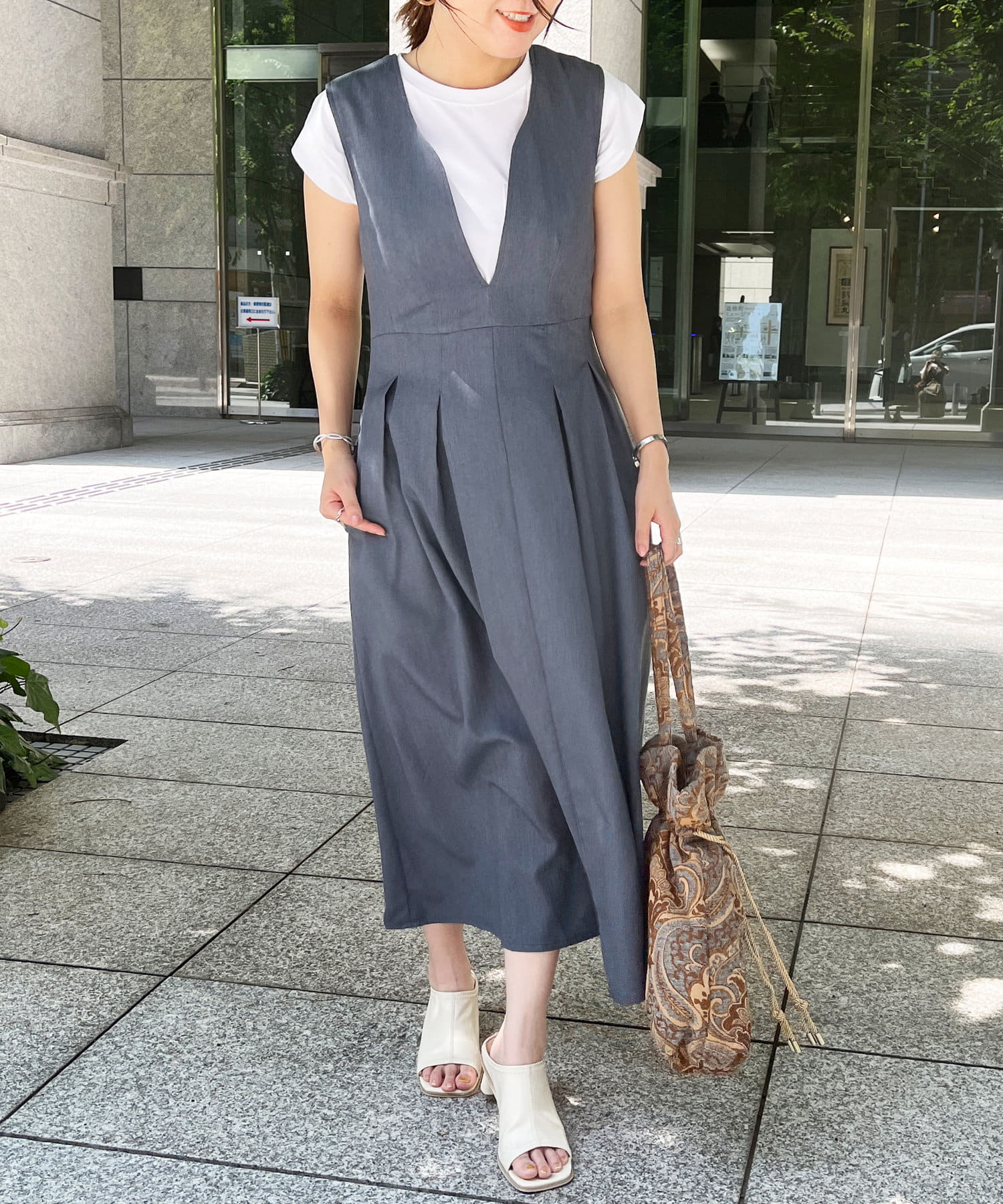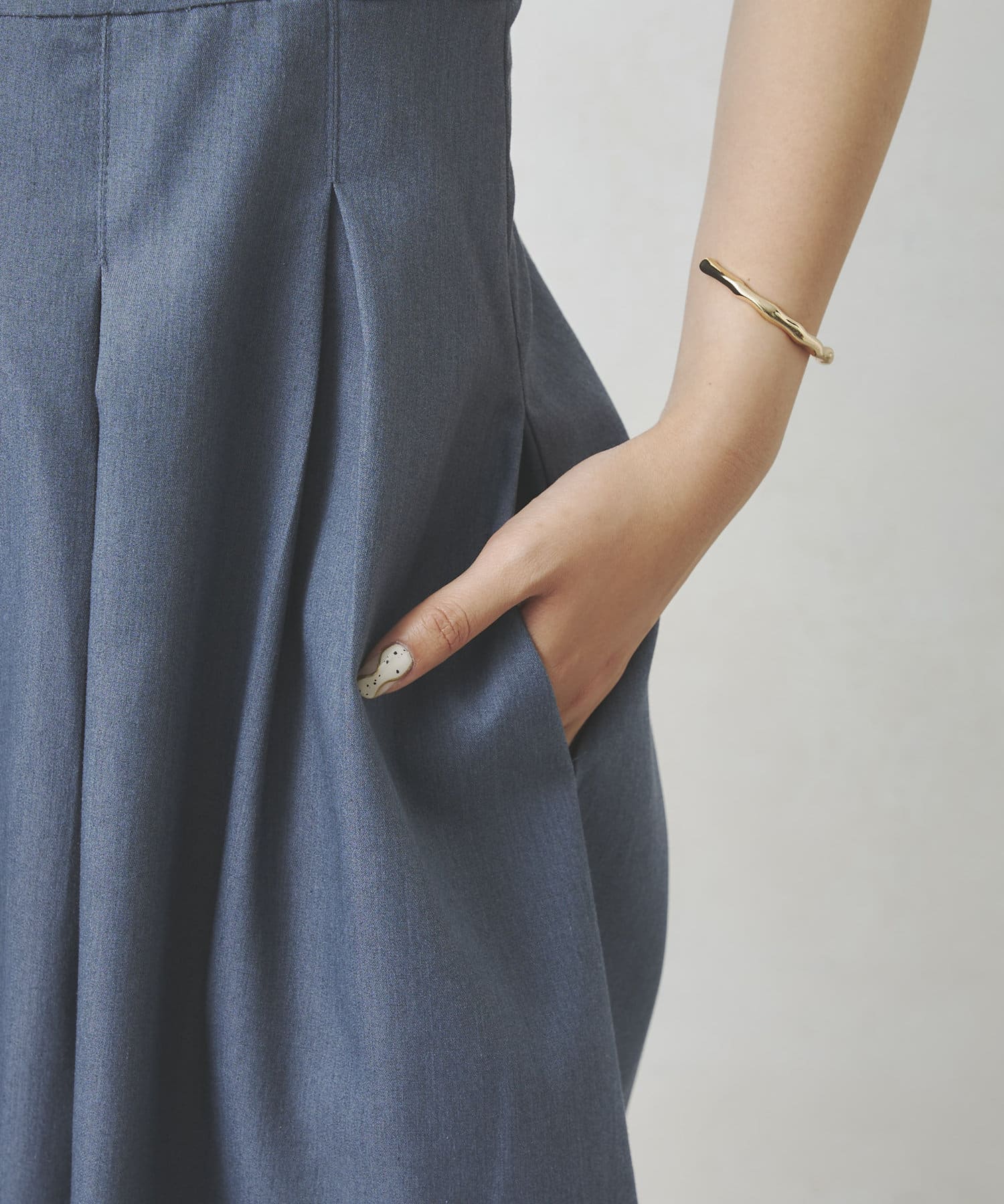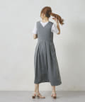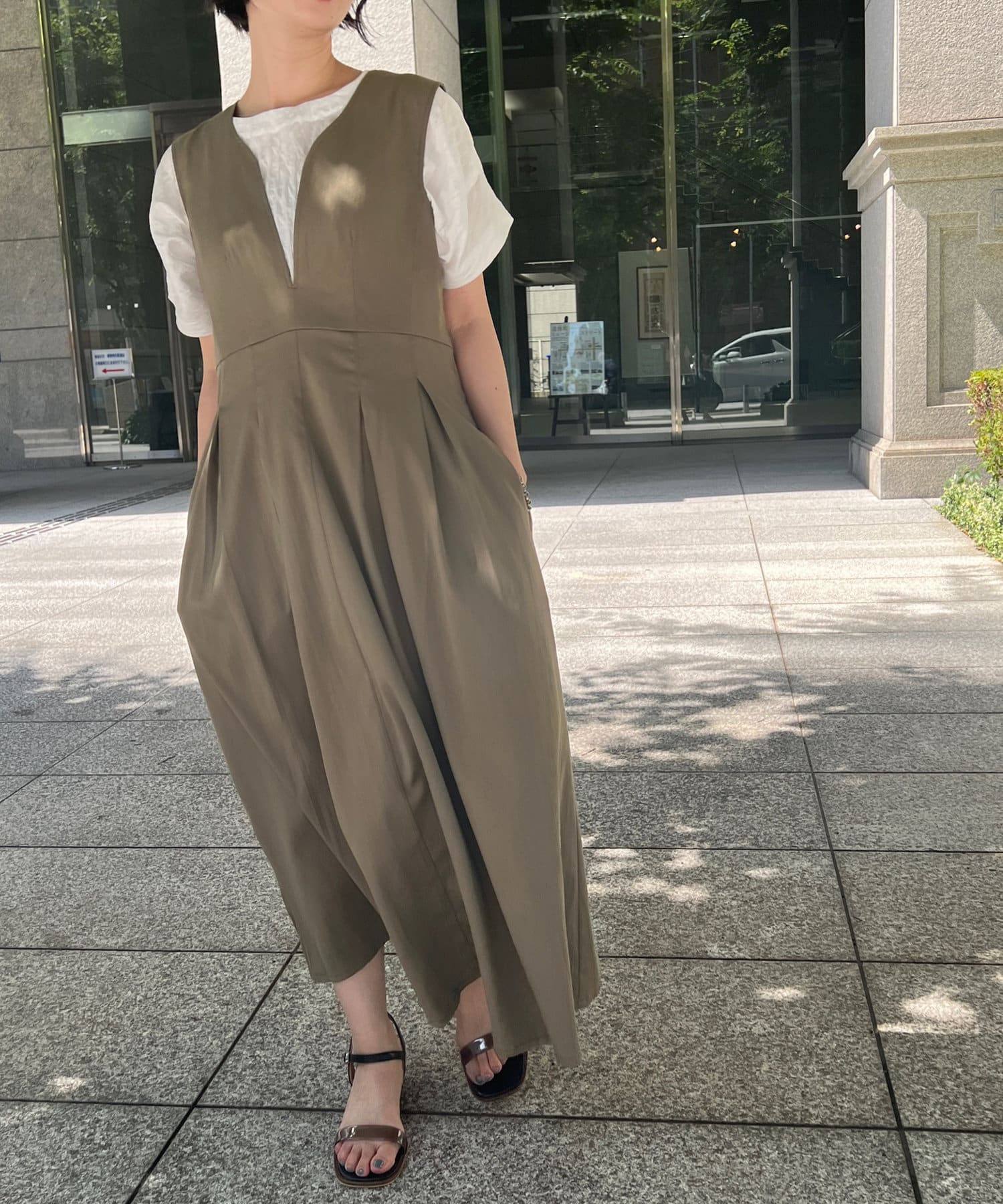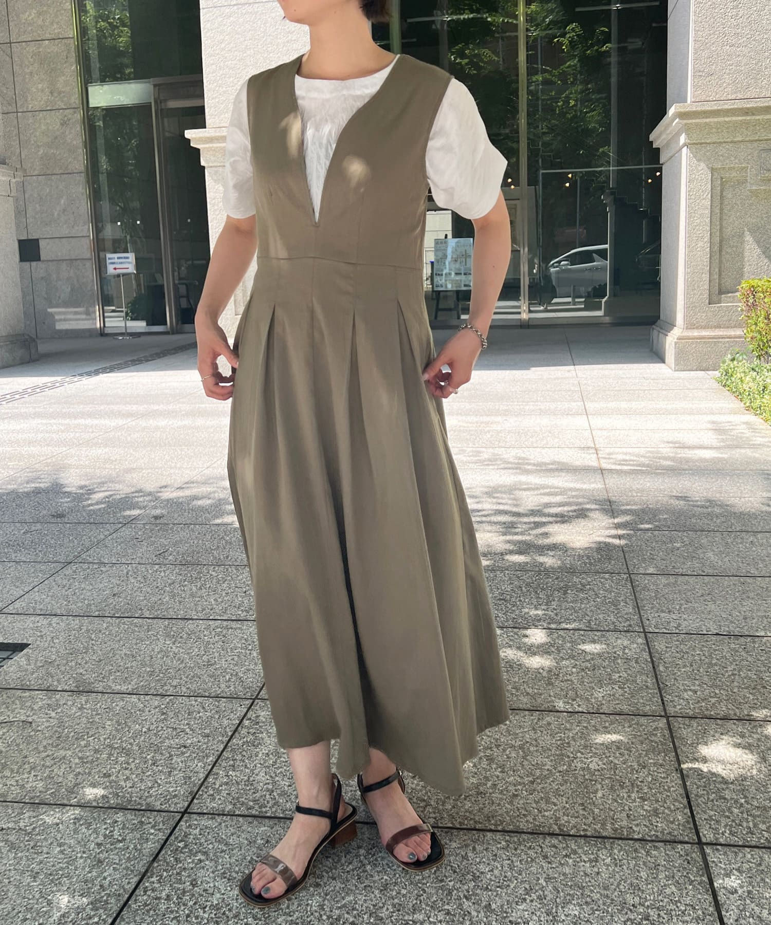 ・胸下切替から広がるドラマティックなタックフレアシルエットも女性らしさを後押し。