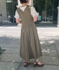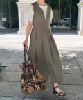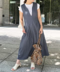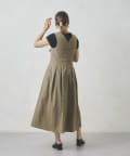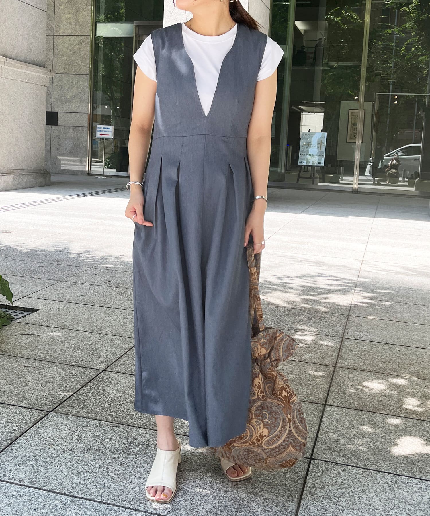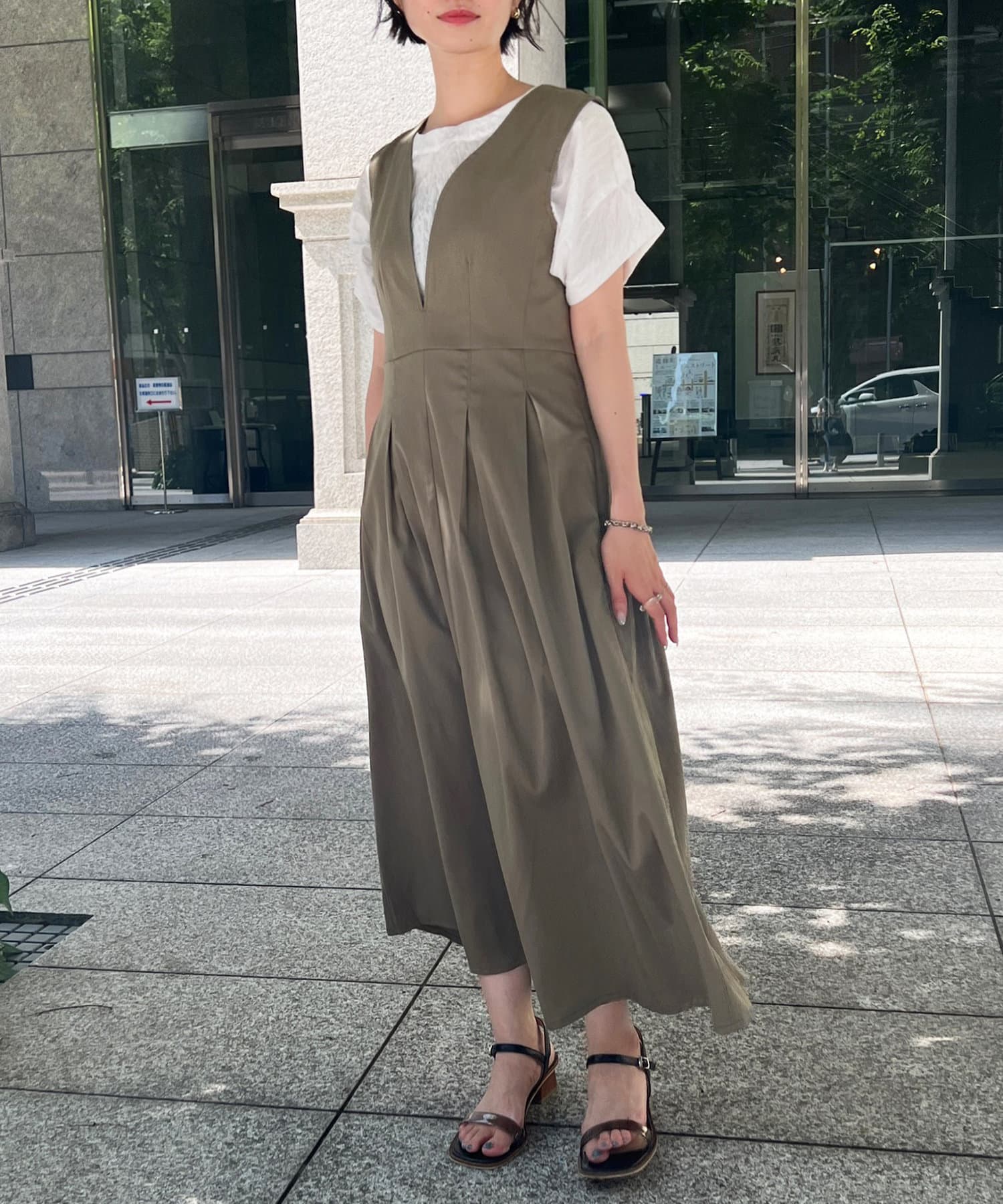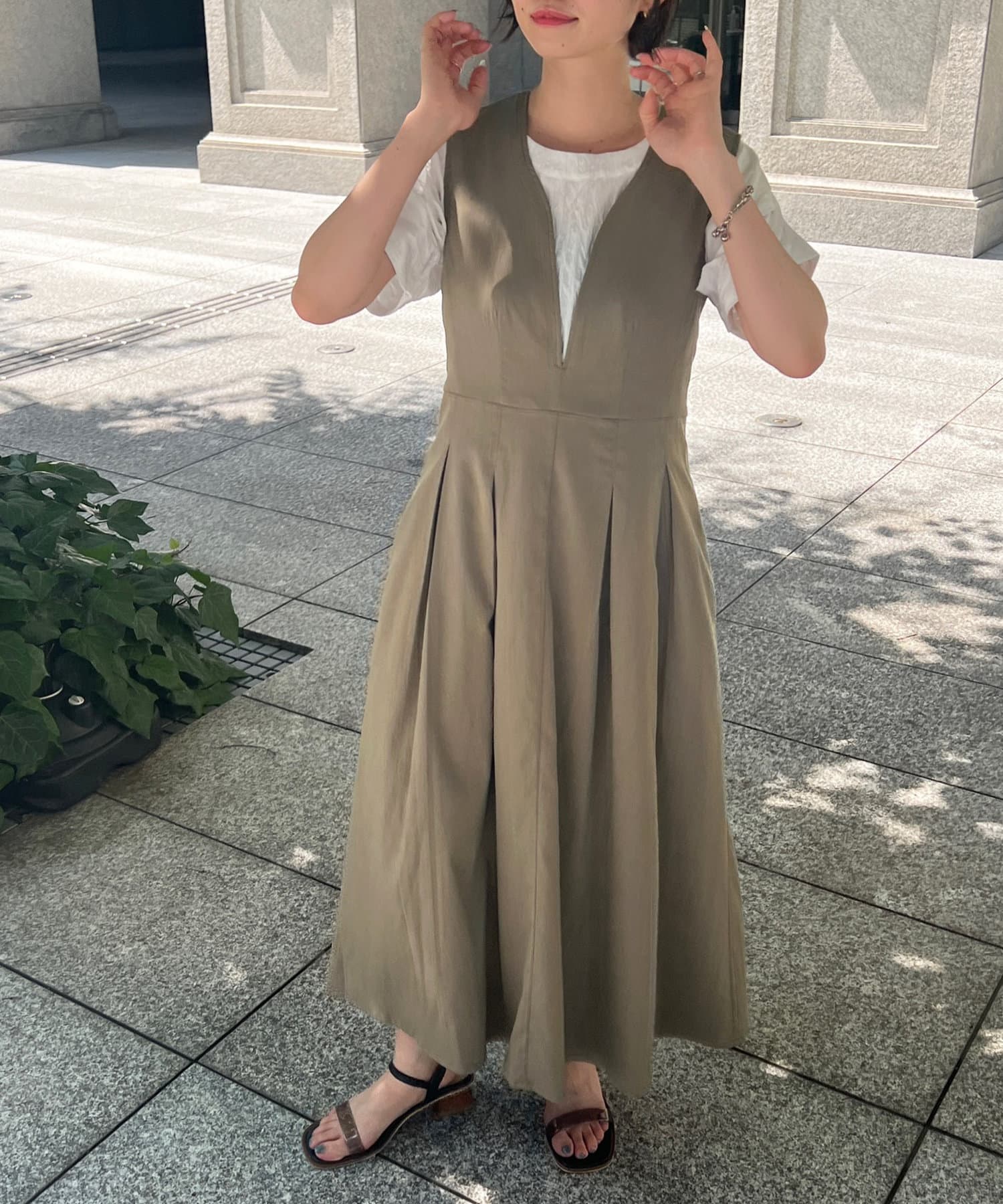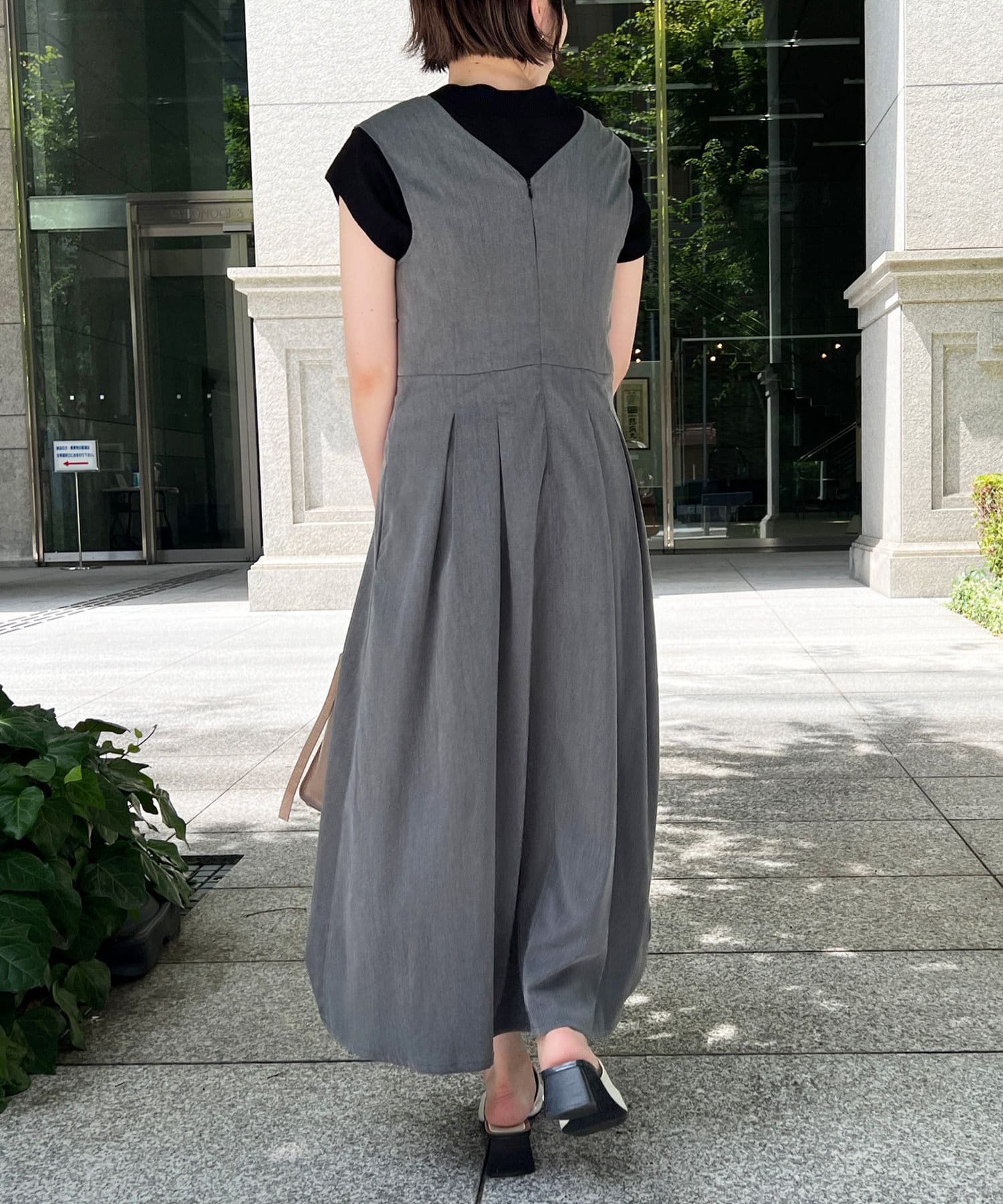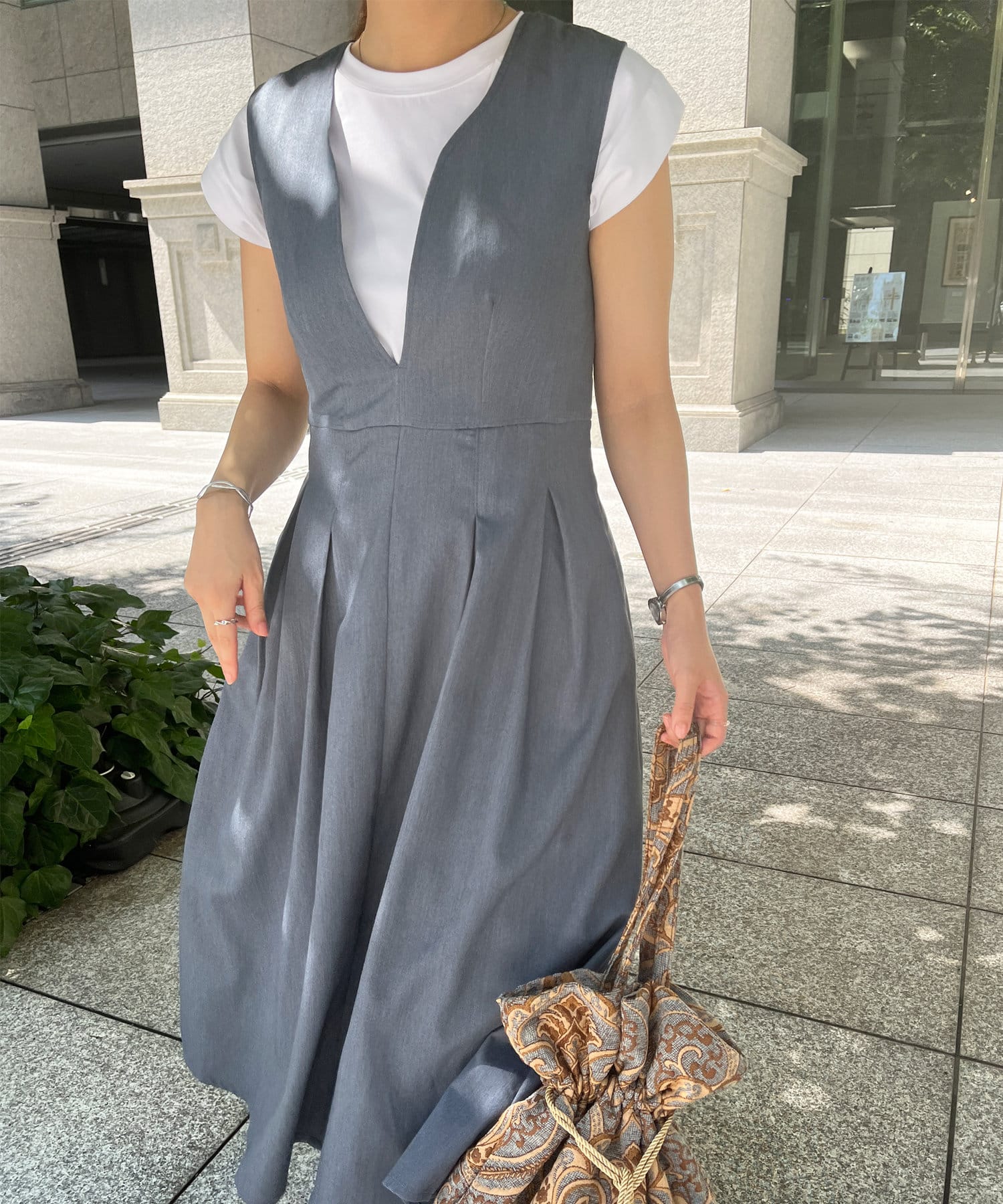 ・胸下切替から広がるドラマティックなタックフレアシルエットも女性らしさを後押し。