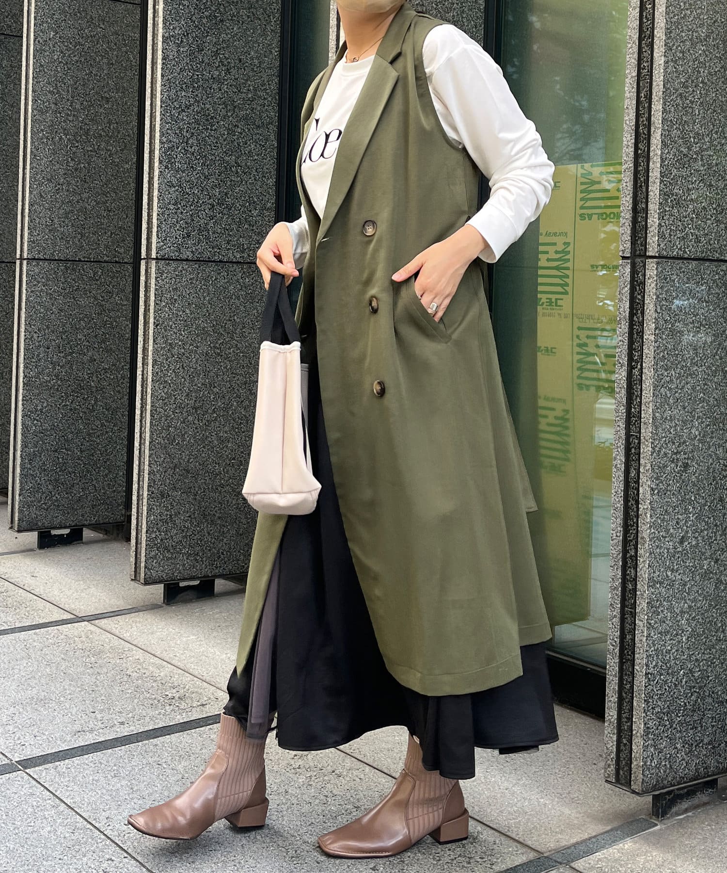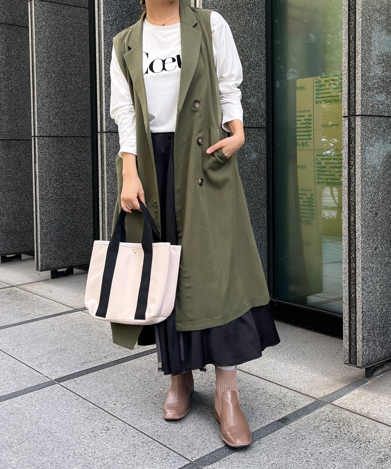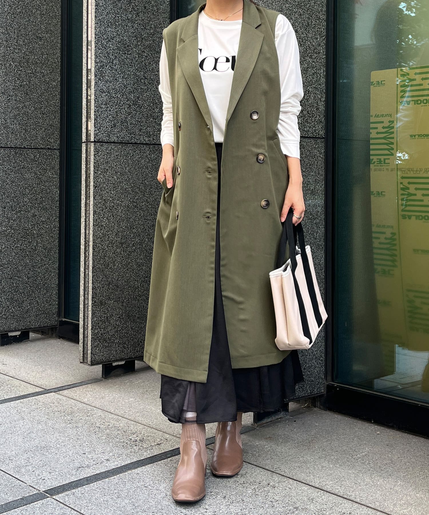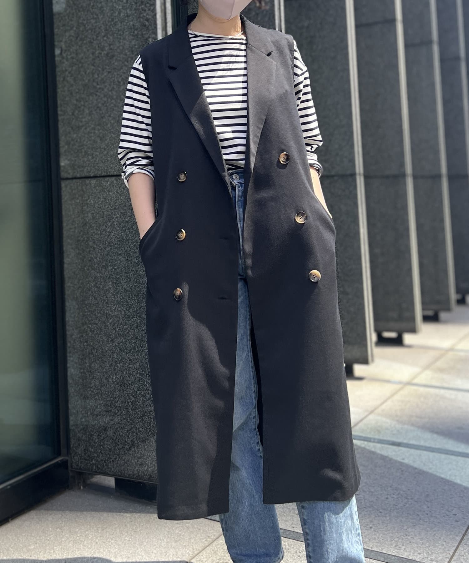 秋、冬用のジレコートを探していて、セールになっていたので購入した。色は迷ってカーキにしましたが、正解でした。生地もしっかりしていて、お洒落なコートです。座った時に出来るシワが出やすいかも。