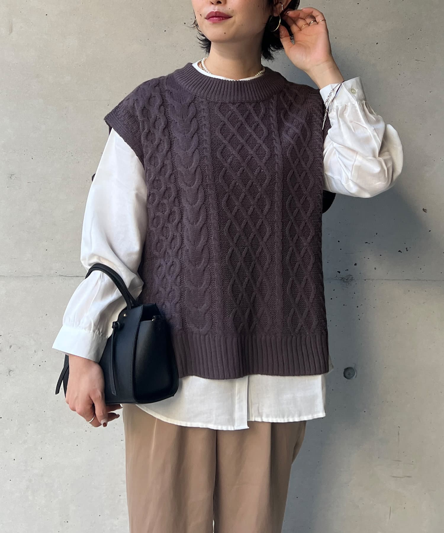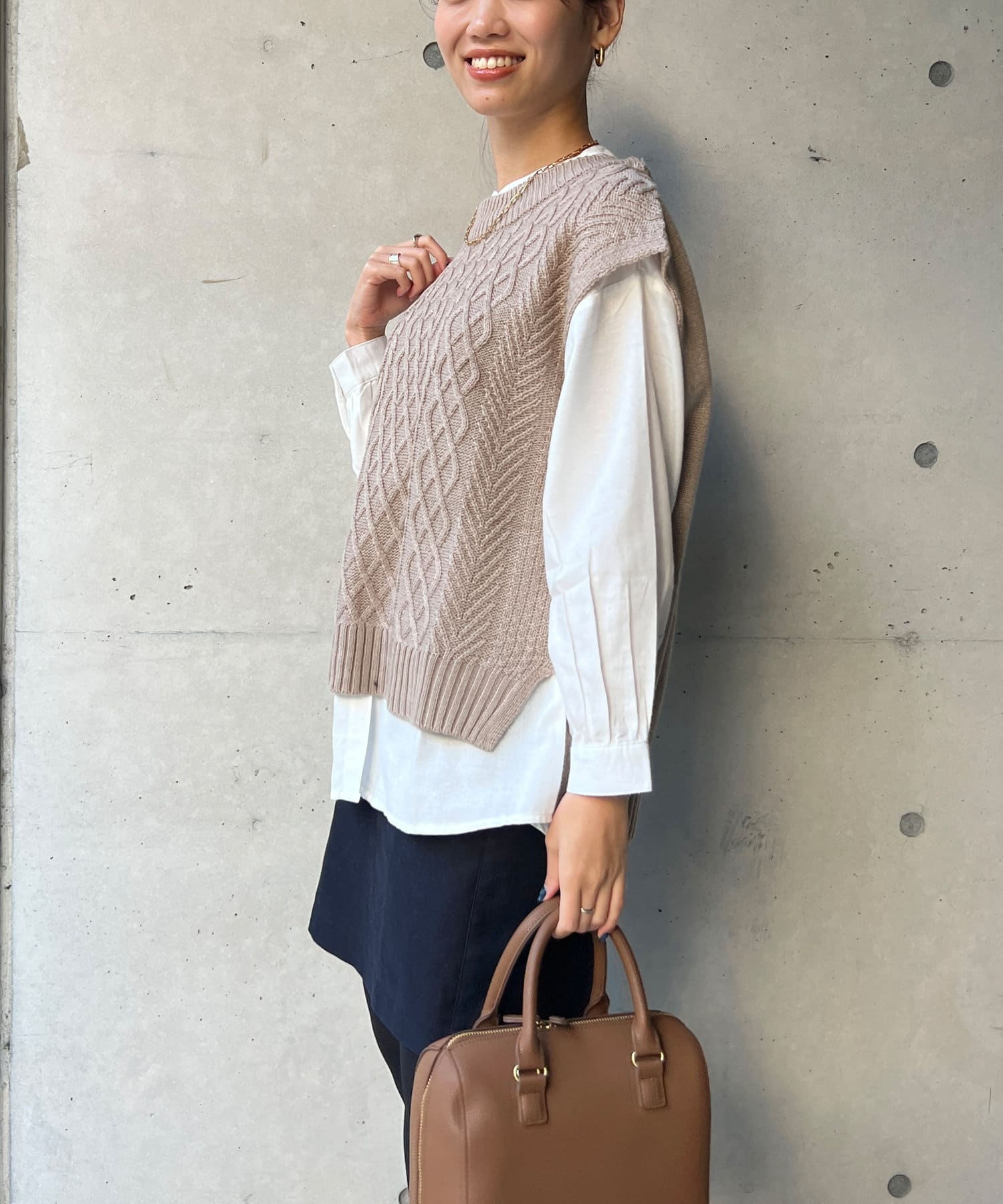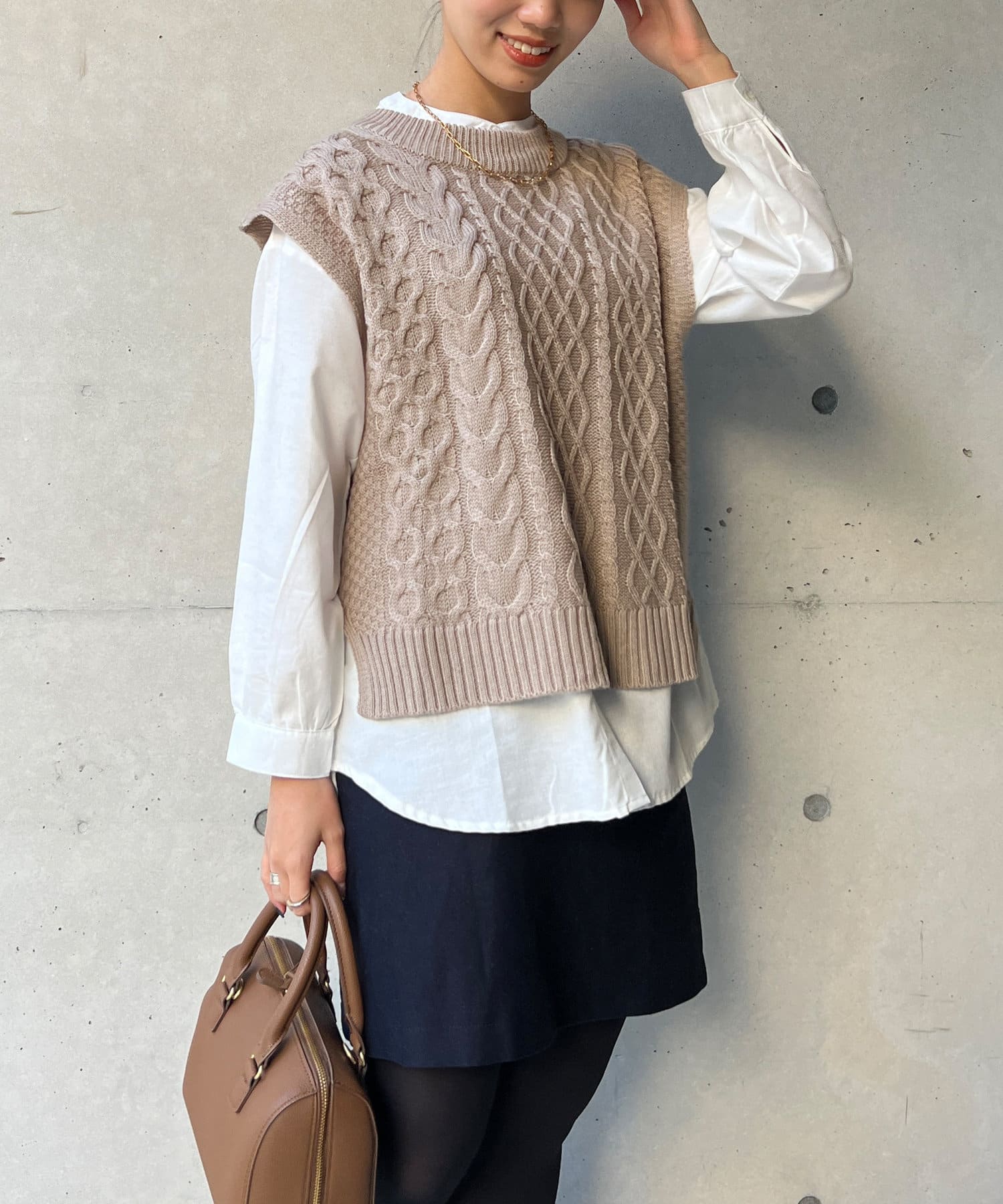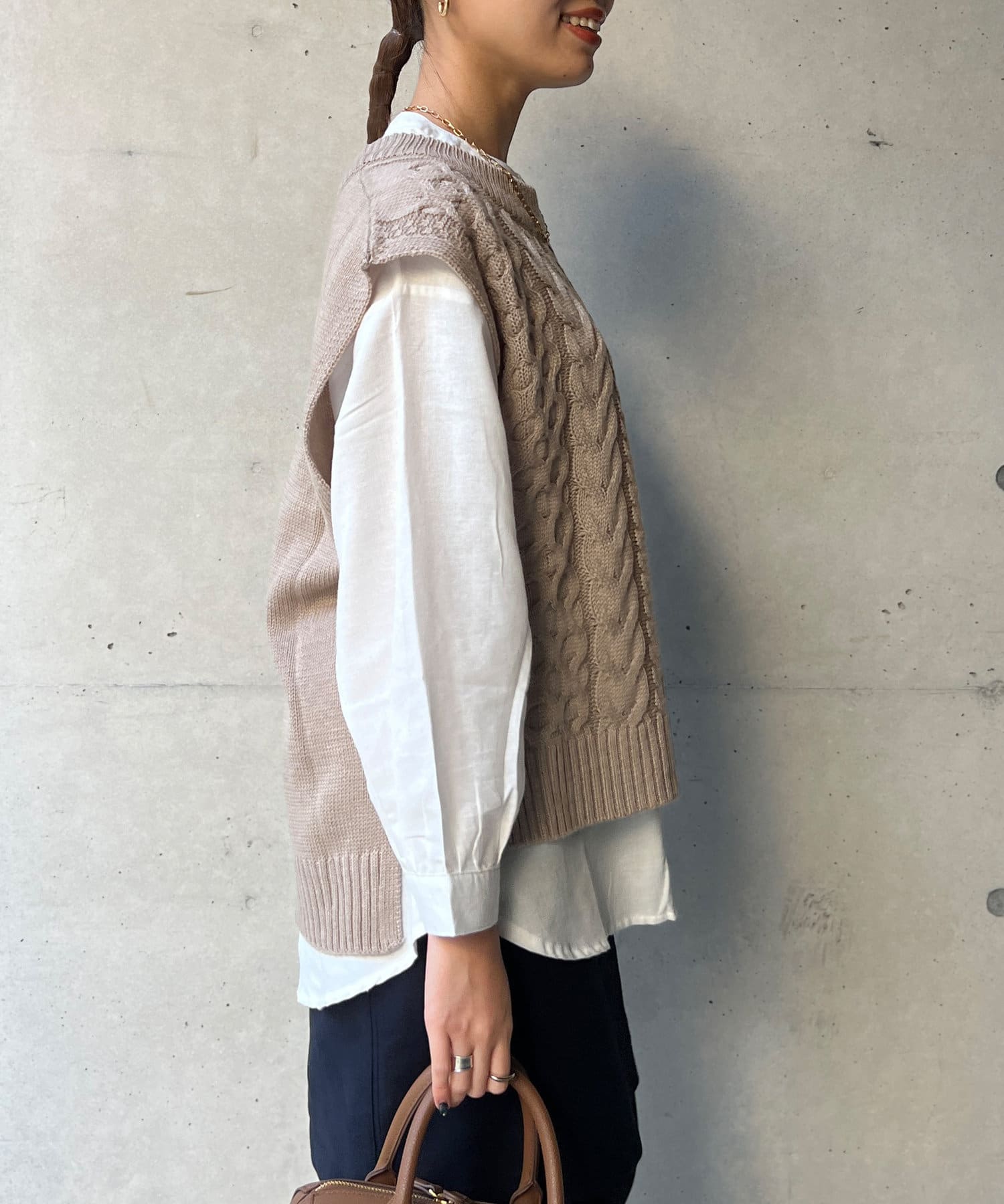 ケーブルニットベストとバンドカラーシャツのセットアイテム。