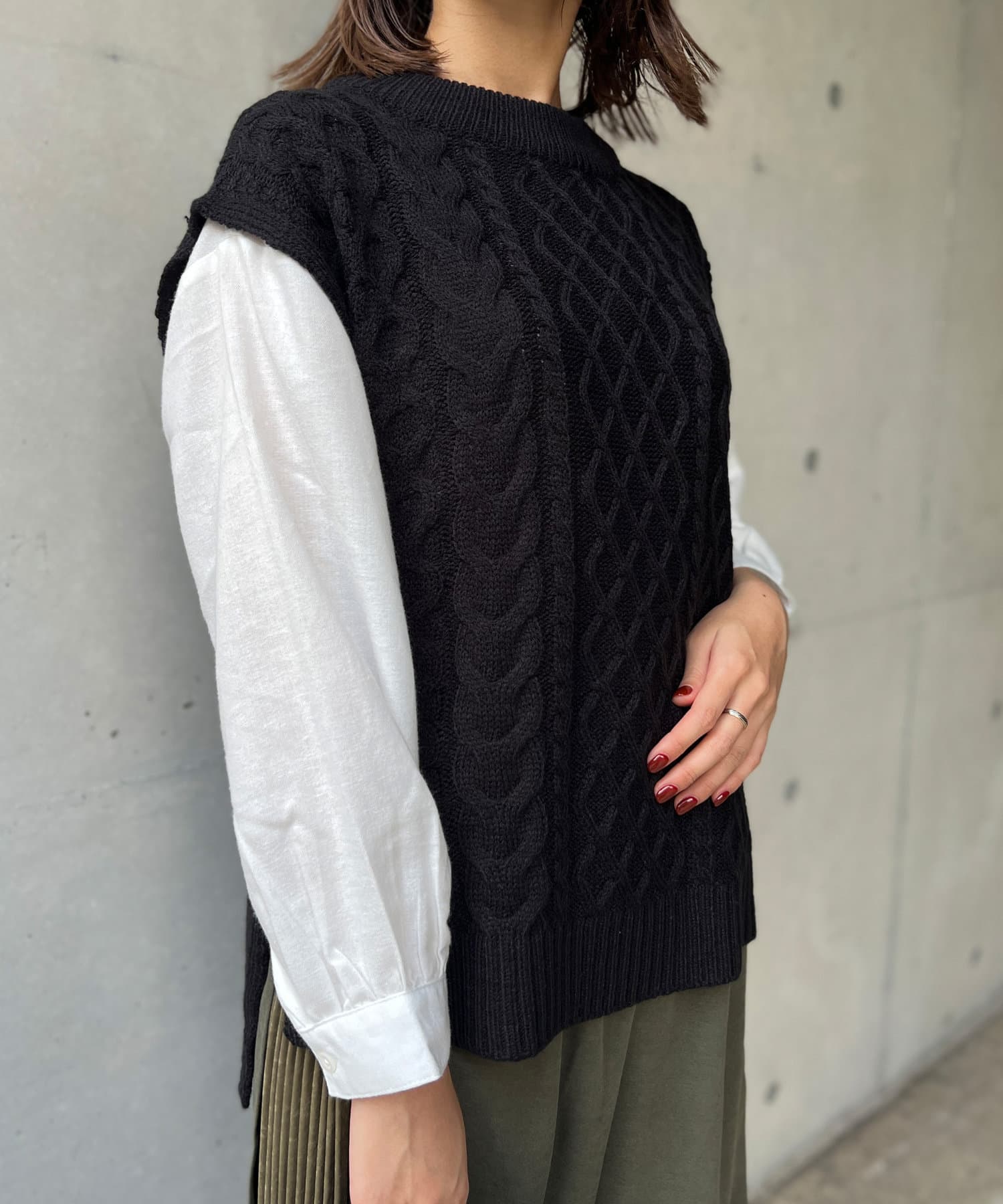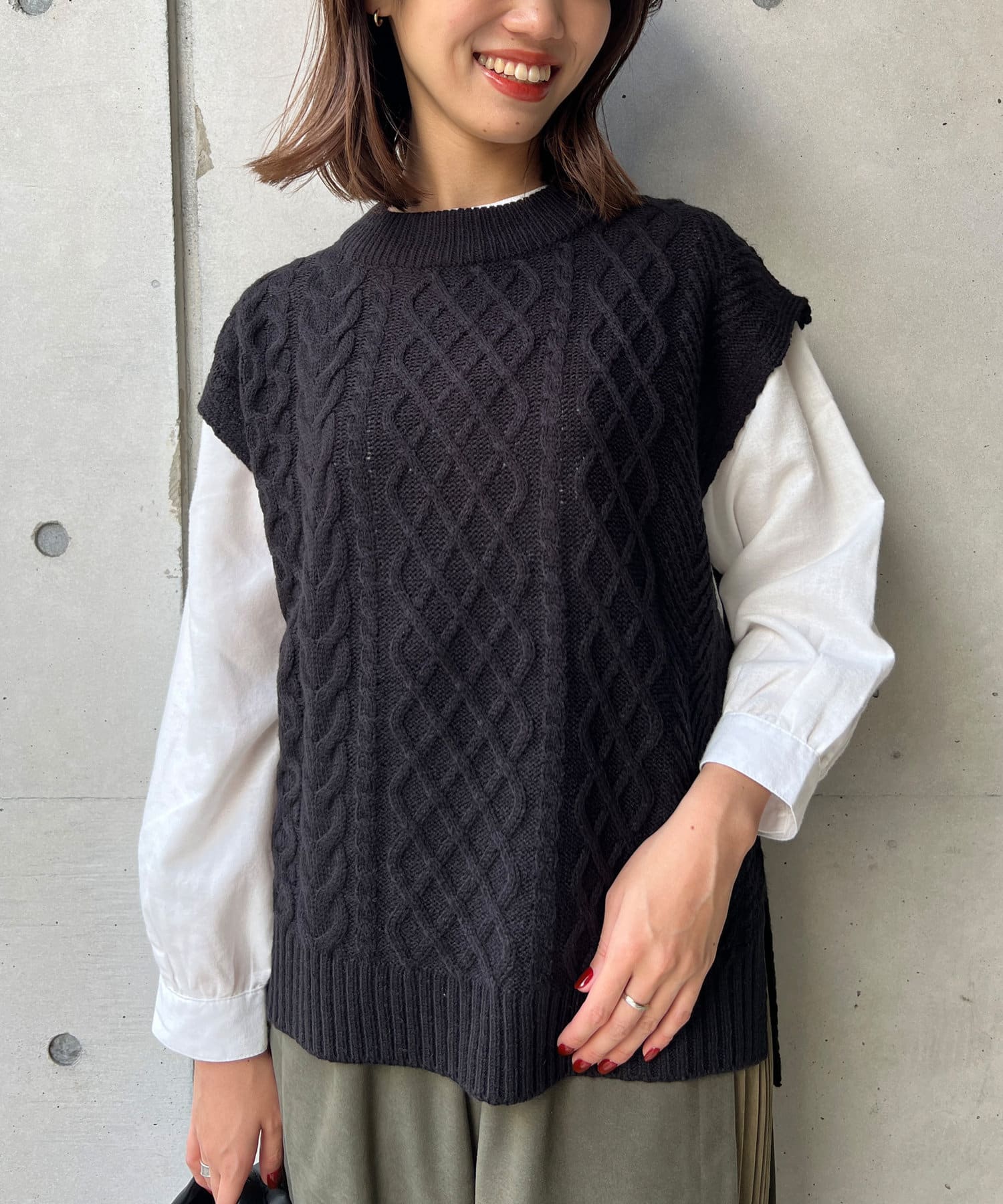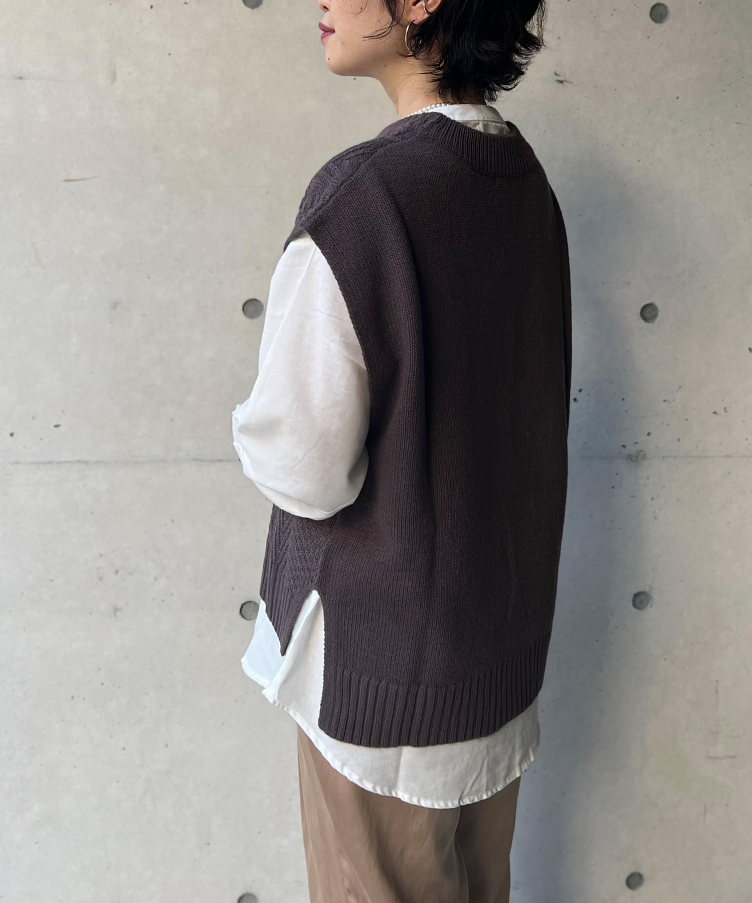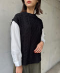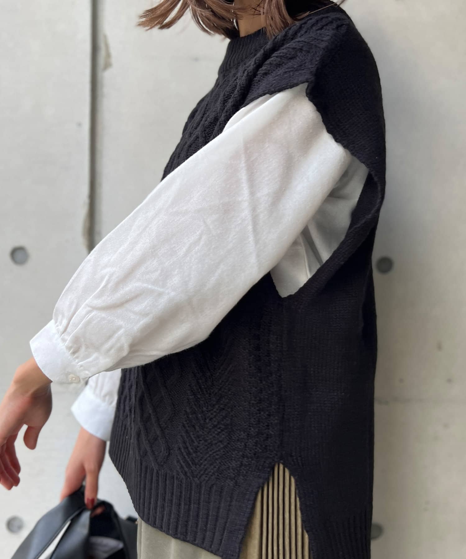ケーブルニットベストとバンドカラーシャツのセットアイテム。